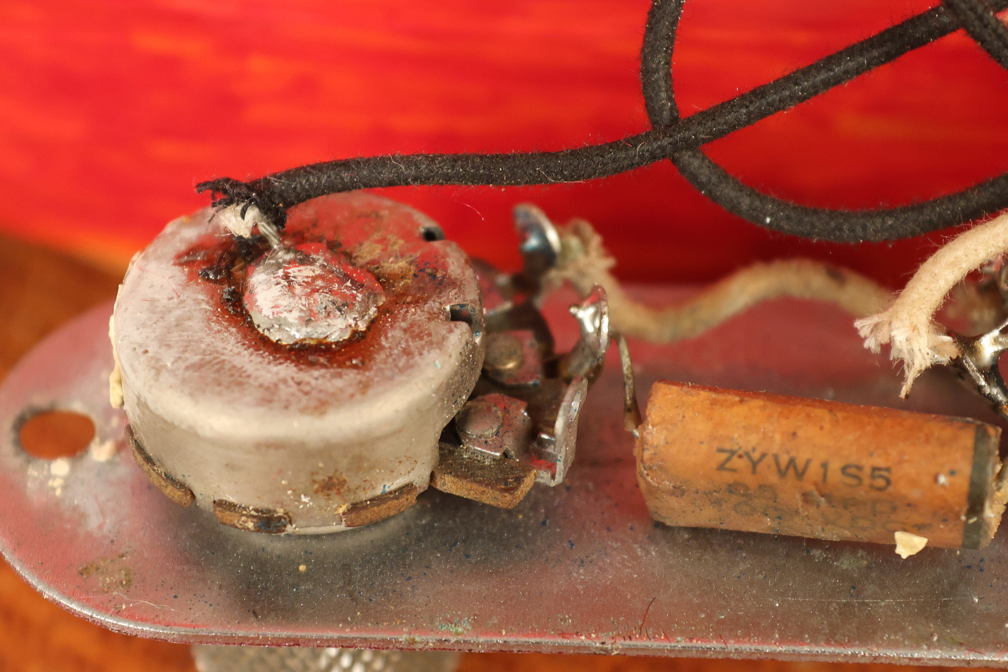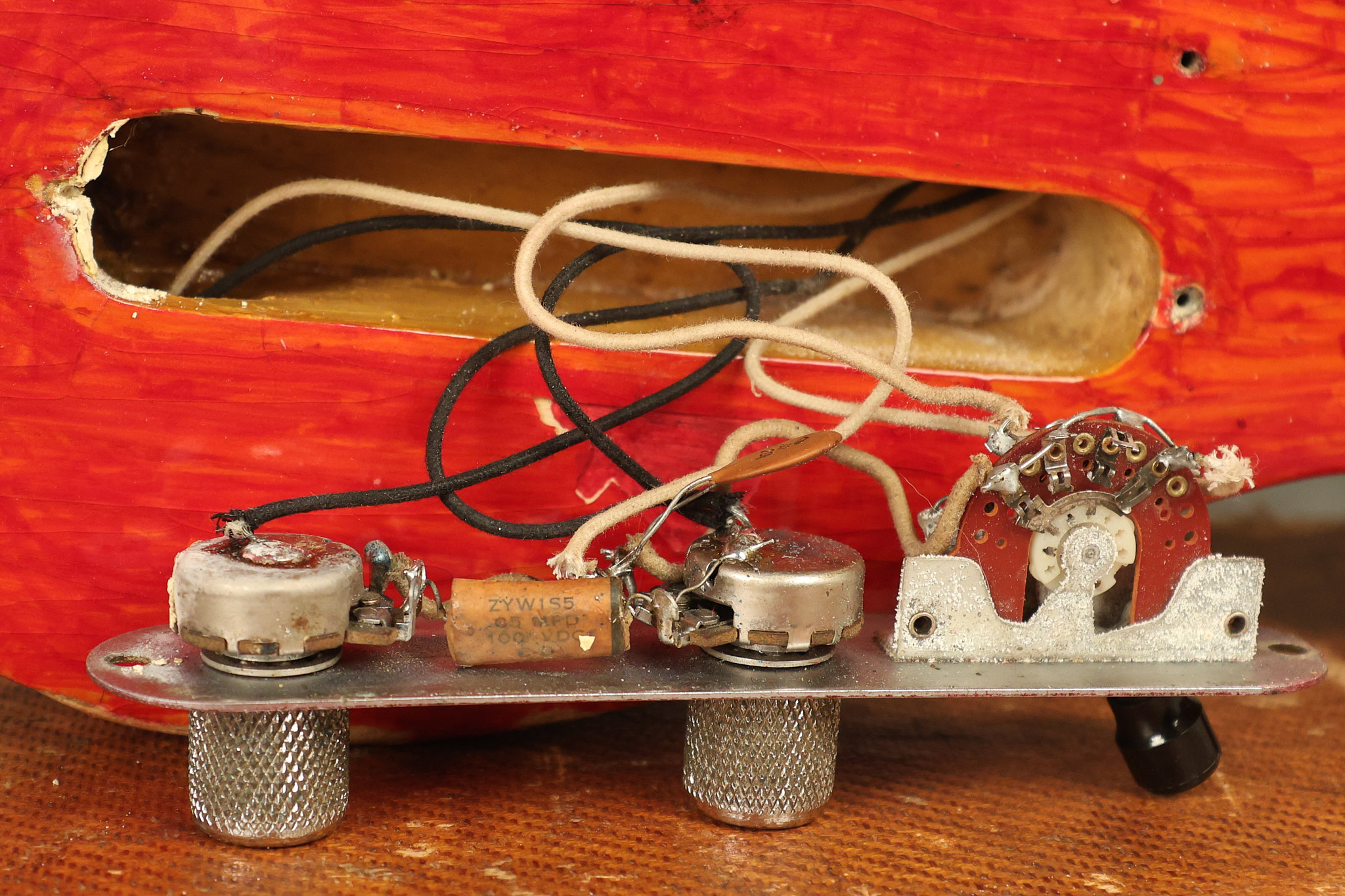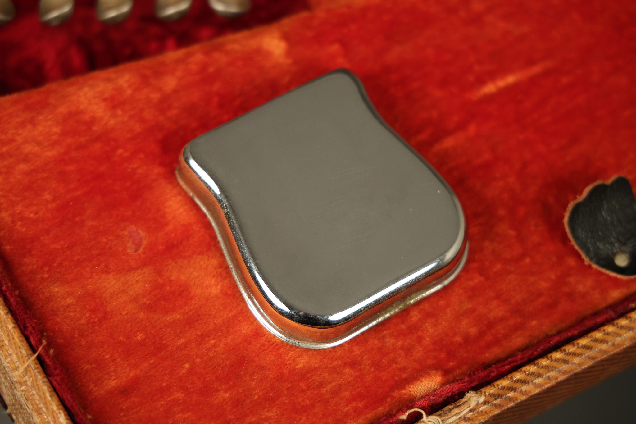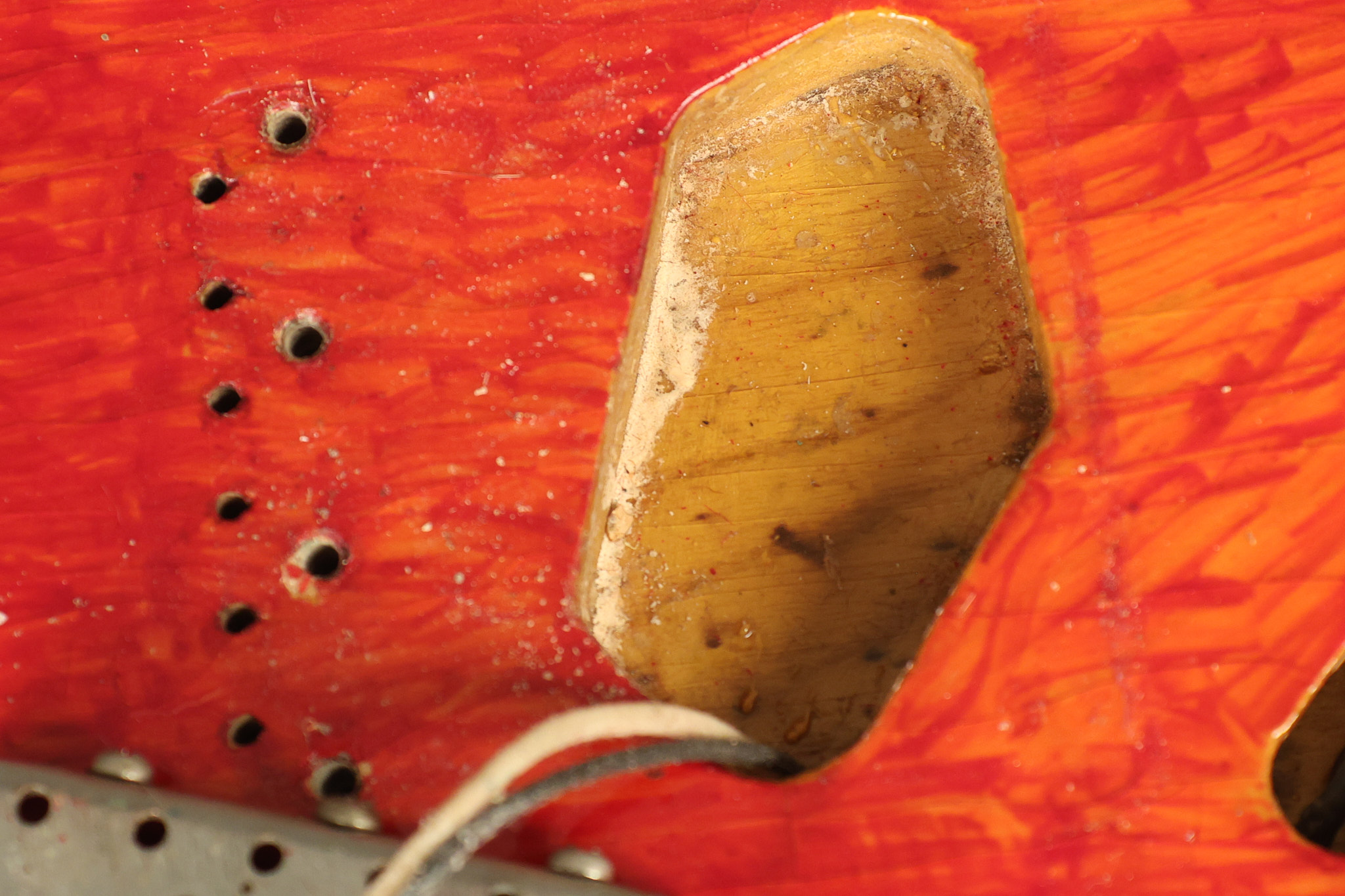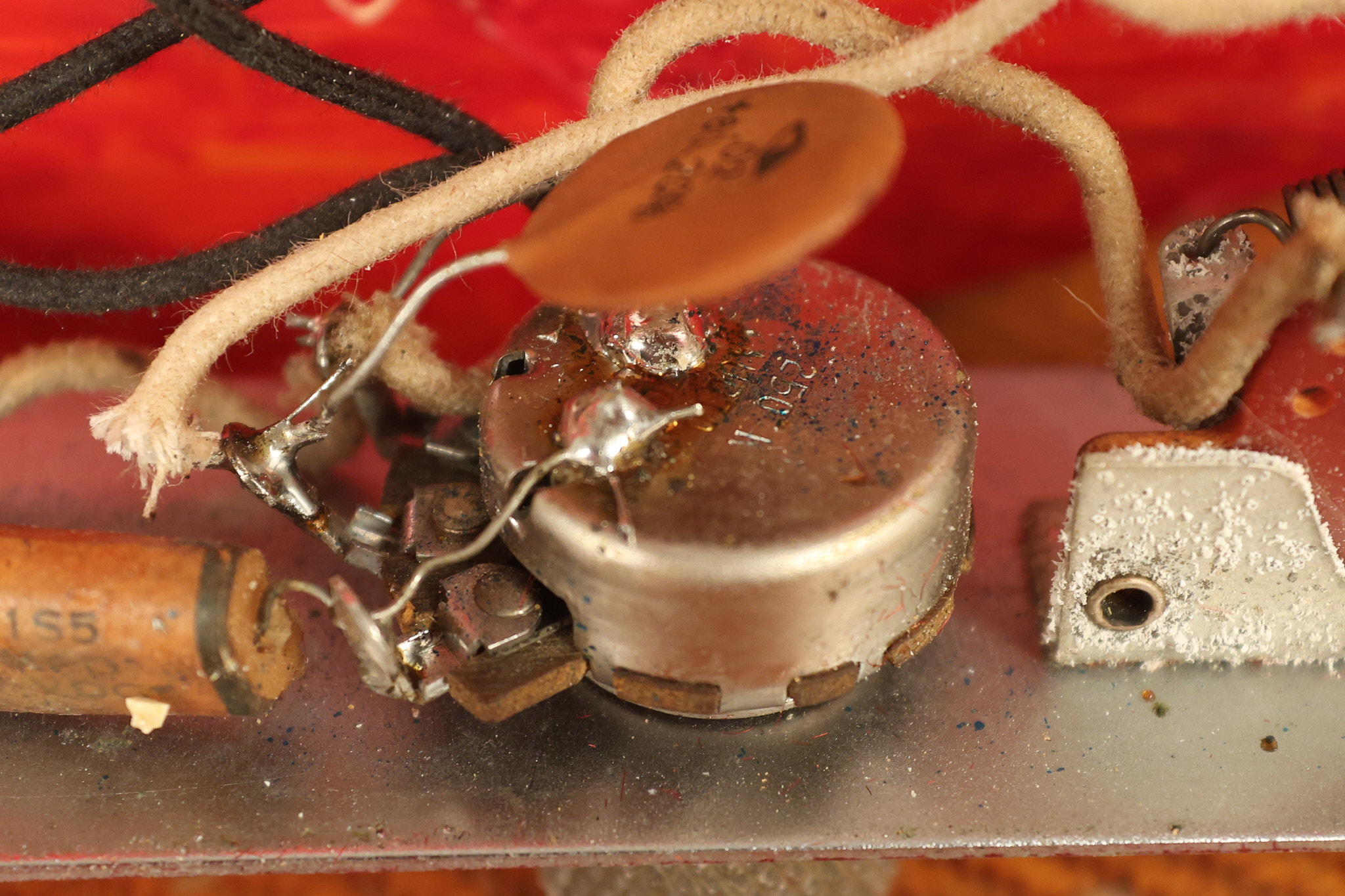 1957 Fender Telecaster with a refinished neck and a poorly refinished body. It has a great playing neck with good frets as it has been refretted. Changed parts include the tuning keys, switch, one capacitor (one is missing), the nut and some of the screws. The original pickugard has been oversprayed and has a crack through one corner. The neck position pickup has some traces of blue on the underside and on the original wires which have been extended. The bridge position pickup has been rewound. All electronics work and sound great. The tone pot sounds a little dirty when it's turned all the way down. The lower screw for the control cavity does not have enough wood on the edge of the cavity to firmly grab, so it is rather loose. There are lots of nicks + dings, finish cracks and other cosmetic wear. The guitar itself remains structurally sound. The weight is 7 lbs. 3.4 oz. The original tweed hardshell case is included, but it is in poor condition with patched areas, one broken latch and the side pocket and neck rest was replaced with one from a later 1960's Fender case.