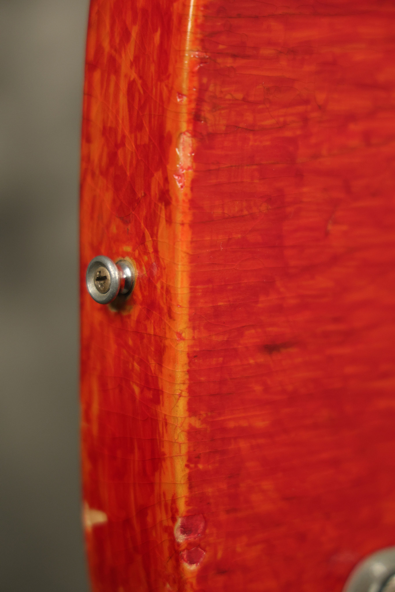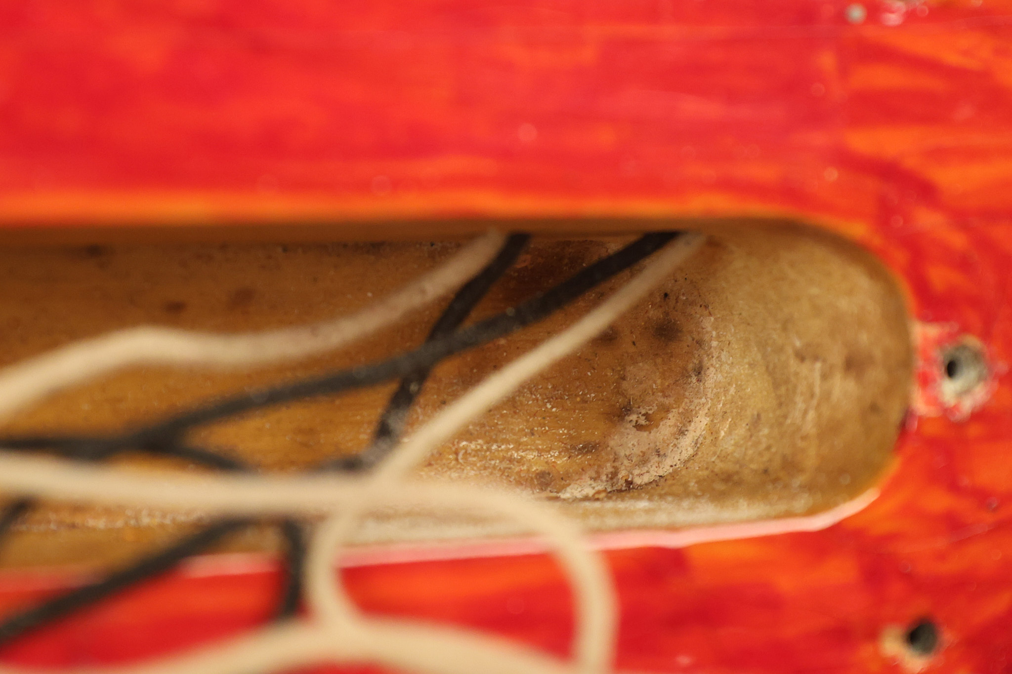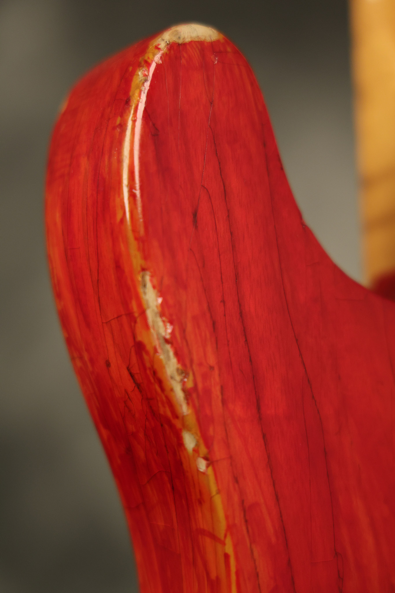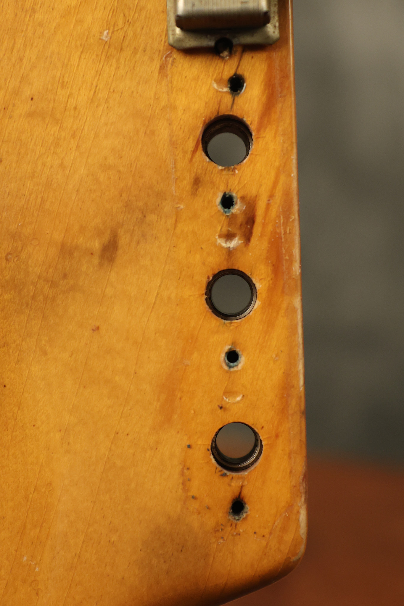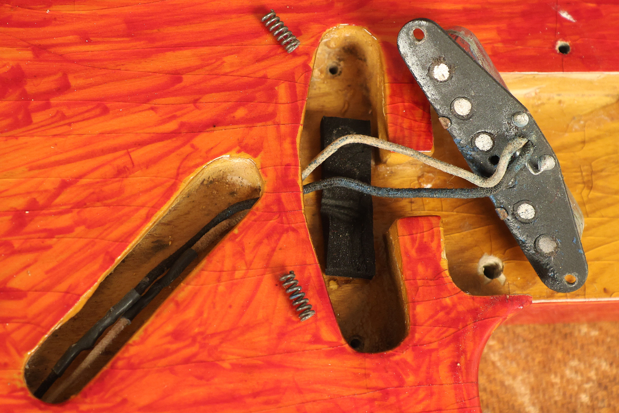 1957 Fender Telecaster with a refinished neck and a poorly refinished body. It has a great playing neck with good frets as it has been refretted. Changed parts include the tuning keys, switch, one capacitor (one is missing), the nut and some of the screws. The original pickugard has been oversprayed and has a crack through one corner. The neck position pickup has some traces of blue on the underside and on the original wires which have been extended. The bridge position pickup has been rewound. All electronics work and sound great. The tone pot sounds a little dirty when it's turned all the way down. The lower screw for the control cavity does not have enough wood on the edge of the cavity to firmly grab, so it is rather loose. There are lots of nicks + dings, finish cracks and other cosmetic wear. The guitar itself remains structurally sound. The weight is 7 lbs. 3.4 oz. The original tweed hardshell case is included, but it is in poor condition with patched areas, one broken latch and the side pocket and neck rest was replaced with one from a later 1960's Fender case.