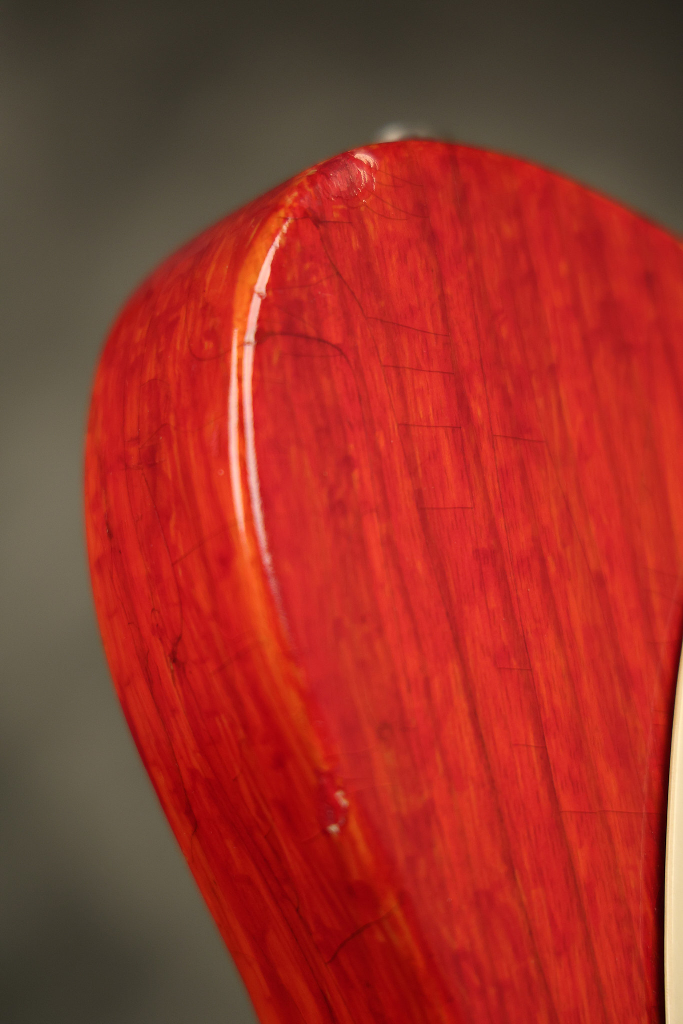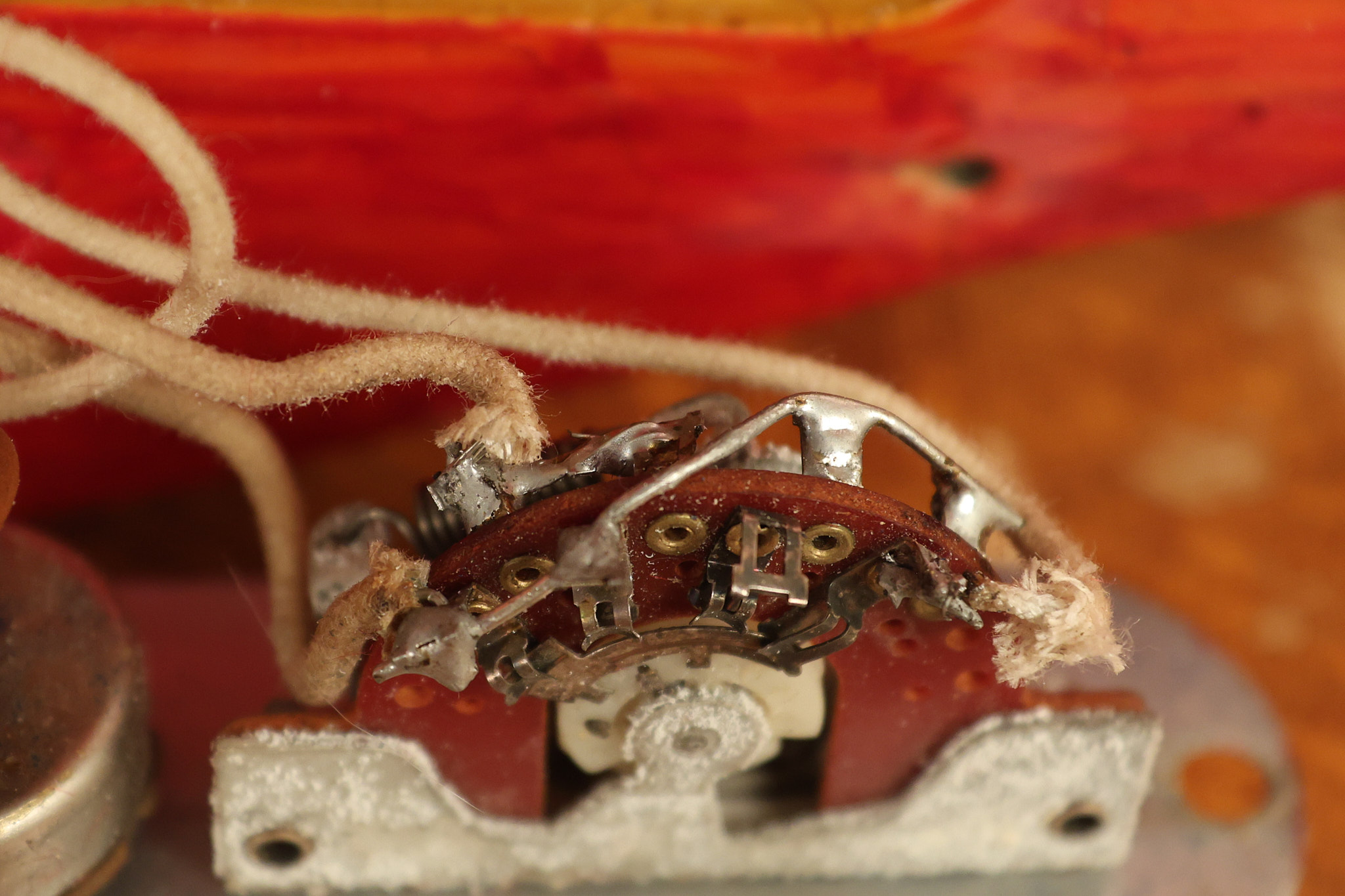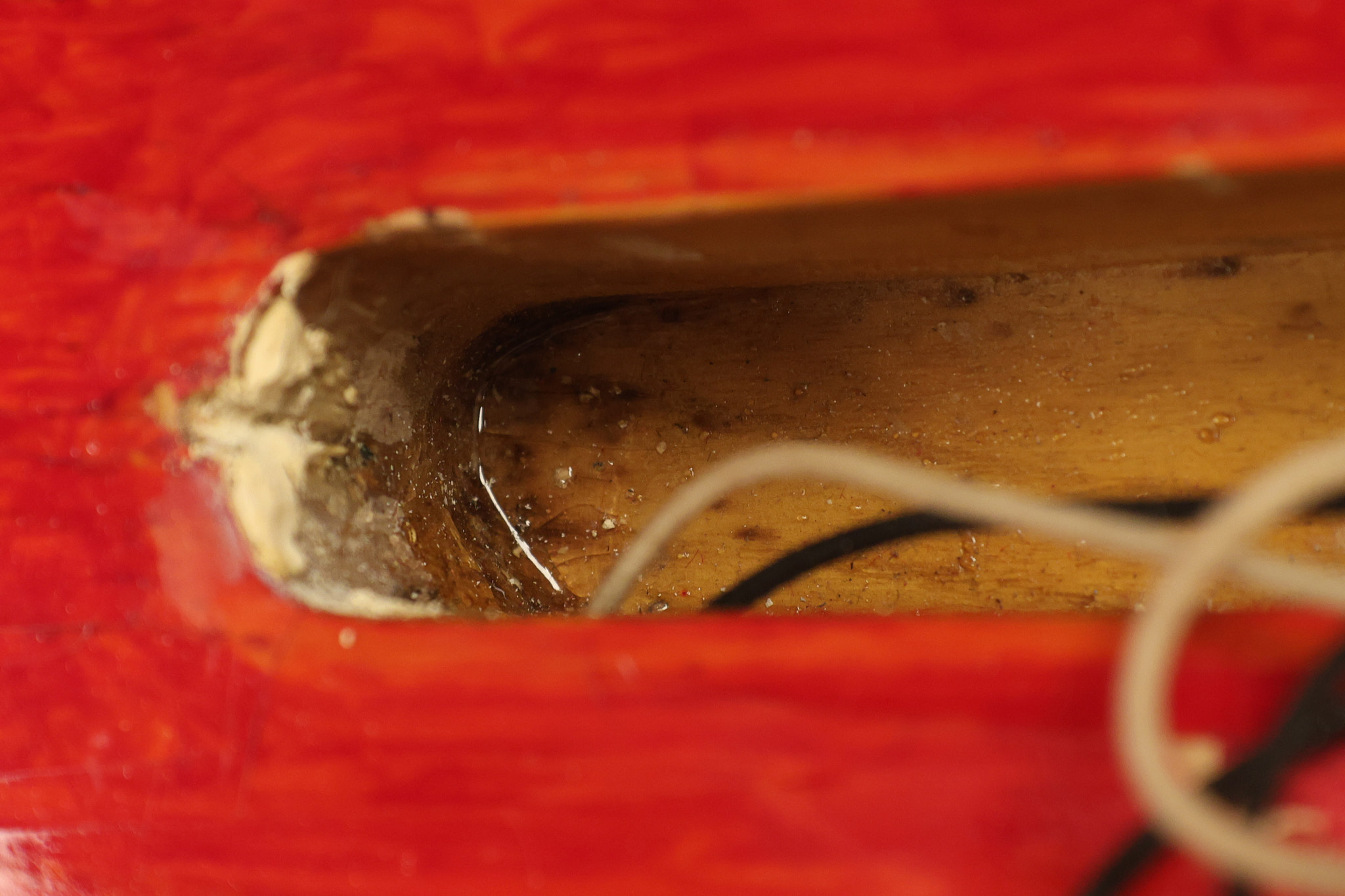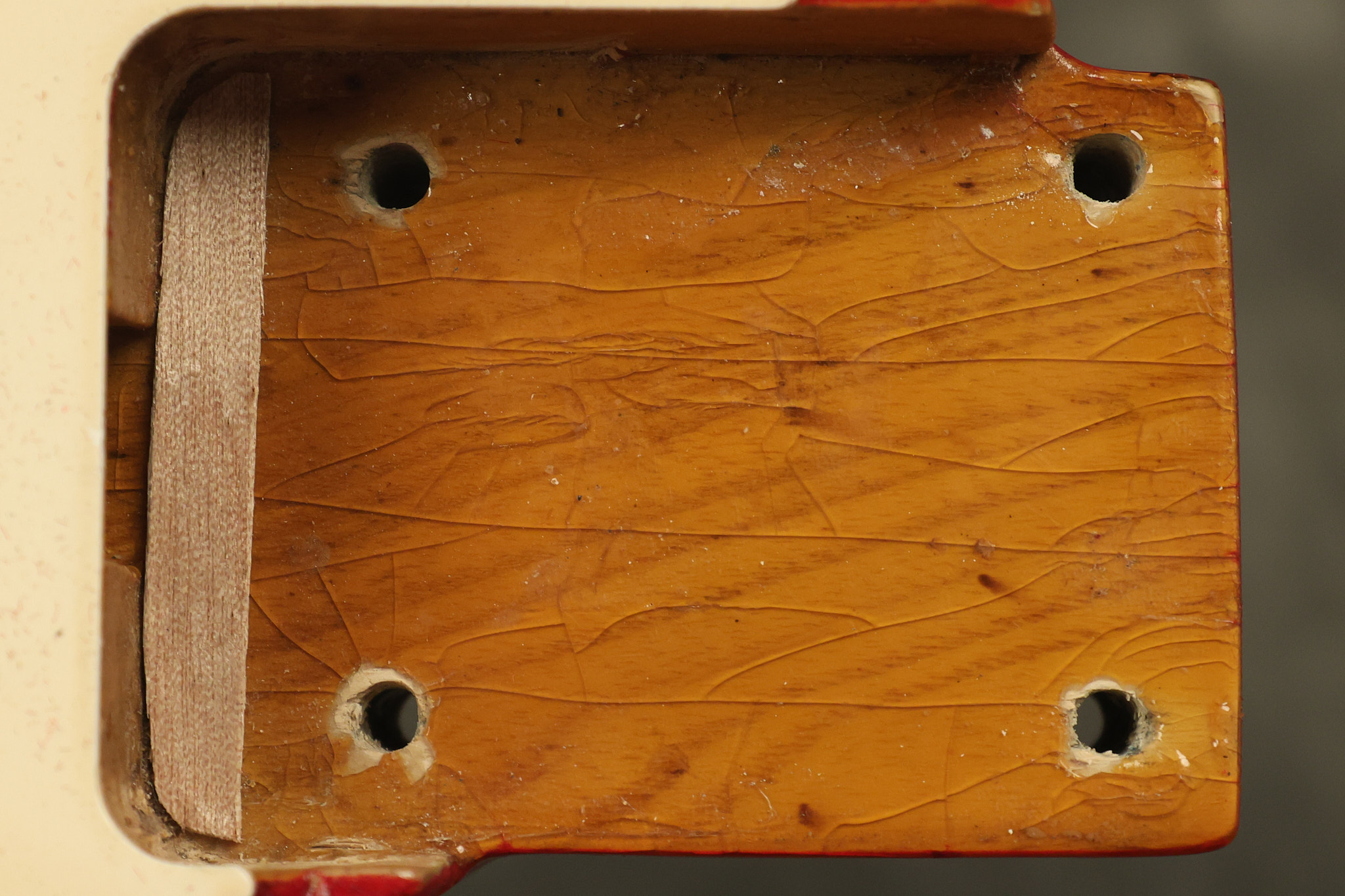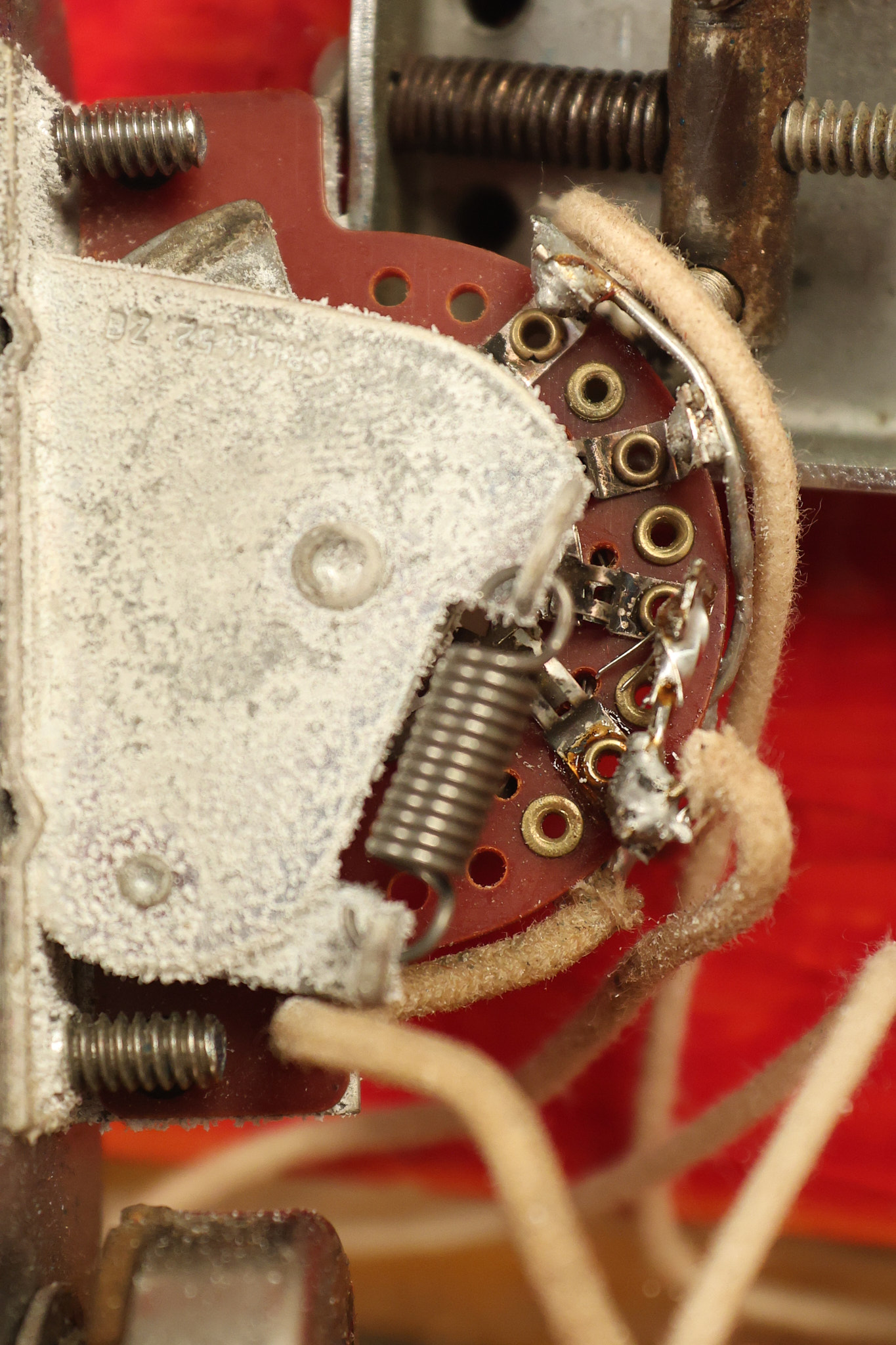 1957 Fender Telecaster with a refinished neck and a poorly refinished body. It has a great playing neck with good frets as it has been refretted. Changed parts include the tuning keys, switch, one capacitor (one is missing), the nut and some of the screws. The original pickugard has been oversprayed and has a crack through one corner. The neck position pickup has some traces of blue on the underside and on the original wires which have been extended. The bridge position pickup has been rewound. All electronics work and sound great. The tone pot sounds a little dirty when it's turned all the way down. The lower screw for the control cavity does not have enough wood on the edge of the cavity to firmly grab, so it is rather loose. There are lots of nicks + dings, finish cracks and other cosmetic wear. The guitar itself remains structurally sound. The weight is 7 lbs. 3.4 oz. The original tweed hardshell case is included, but it is in poor condition with patched areas, one broken latch and the side pocket and neck rest was replaced with one from a later 1960's Fender case.