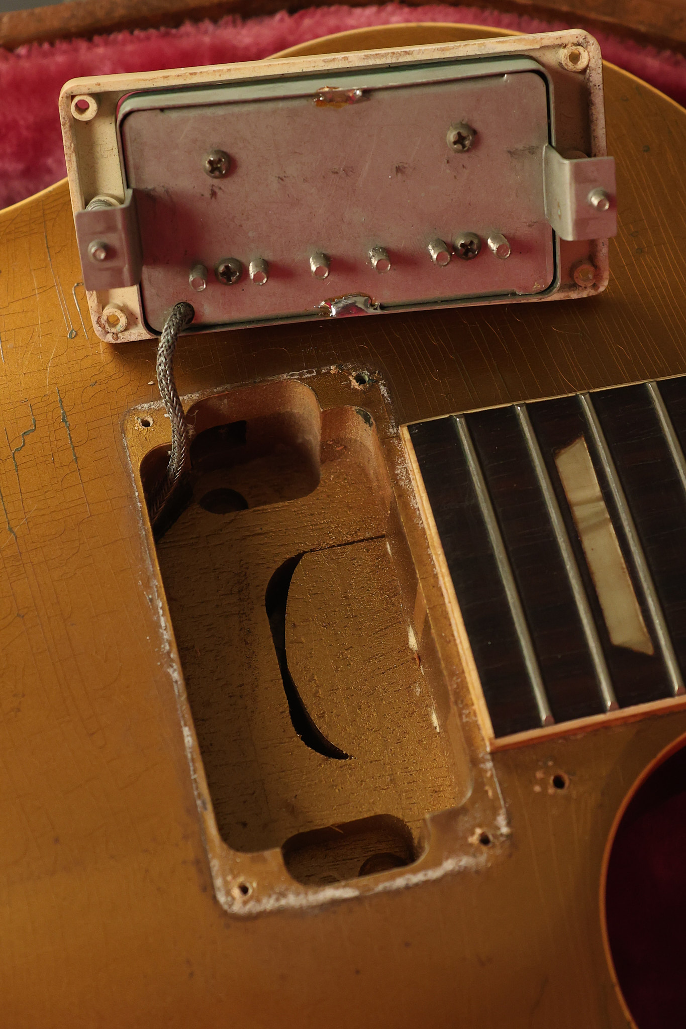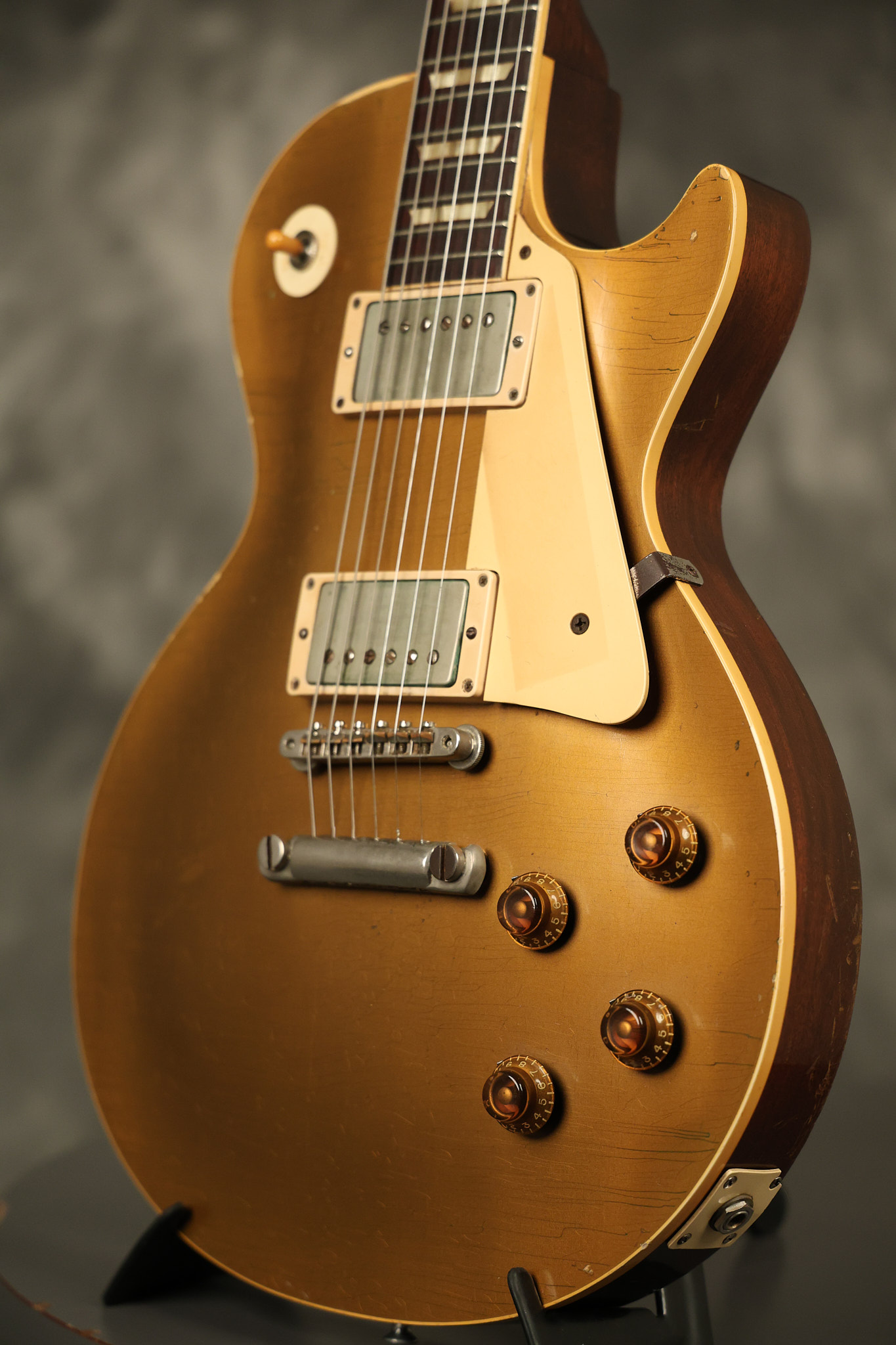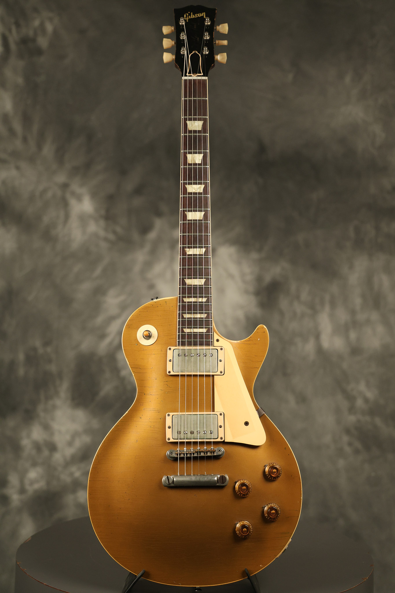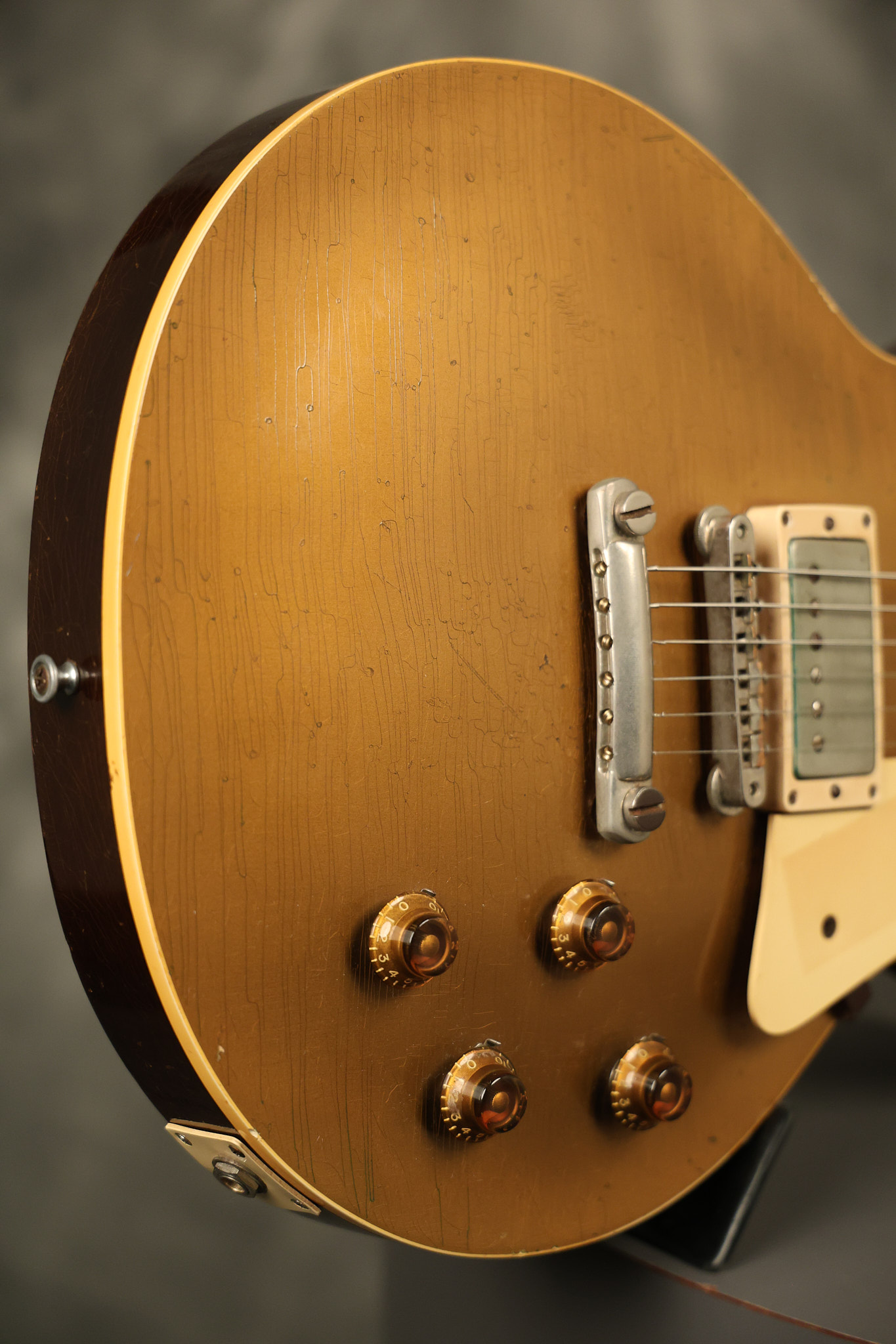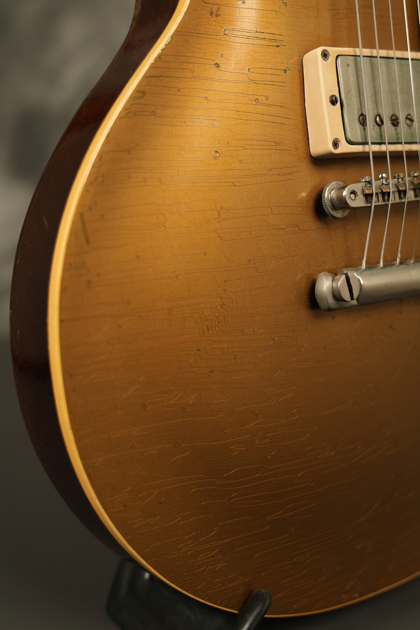 1957 Gibson Les Paul Goldtop in its original Gold top and dark back finish. It has a good playing neck with good frets. It's all original with the exception of one of  the bridge saddles and its screw (the A string saddle). It is also 100% complete along with its original hardshell case. This Les Paul looks great with lots of nicks + dings, finish checking, belt buckle wear, cracked plastic jack plate and other cosmetic wear. The guitar itself remains structurally sound with no cracks, breaks or repairs. As for the electronics, a repair was made on one coil of the bridge position pickup. It was not rewound, but had a connection break in the coil near the surface of the coil winding which has been reattached. All electronics work and sound great with its original set of PAF pickups. The weight is 8 lbs. 12 oz.
