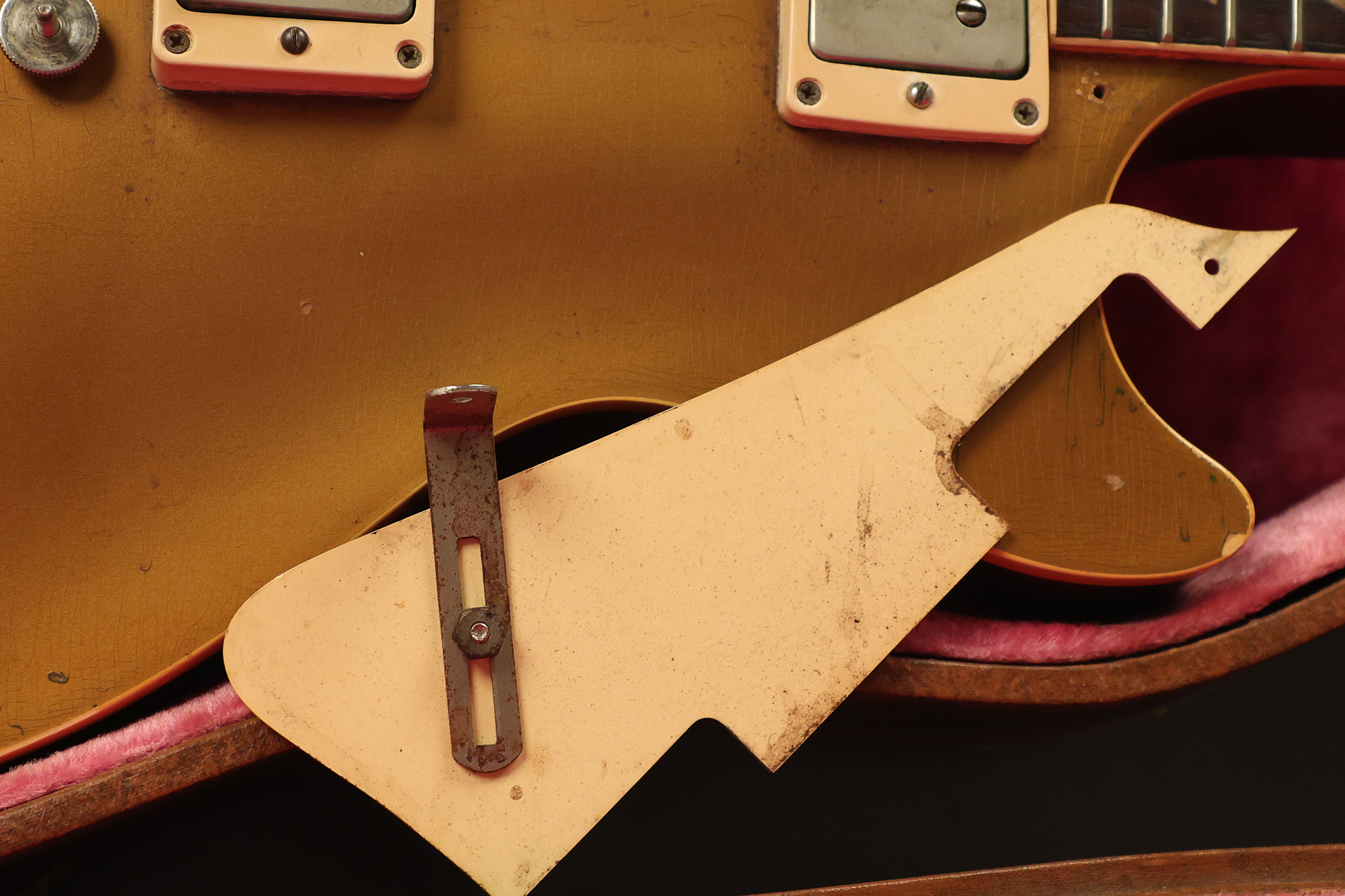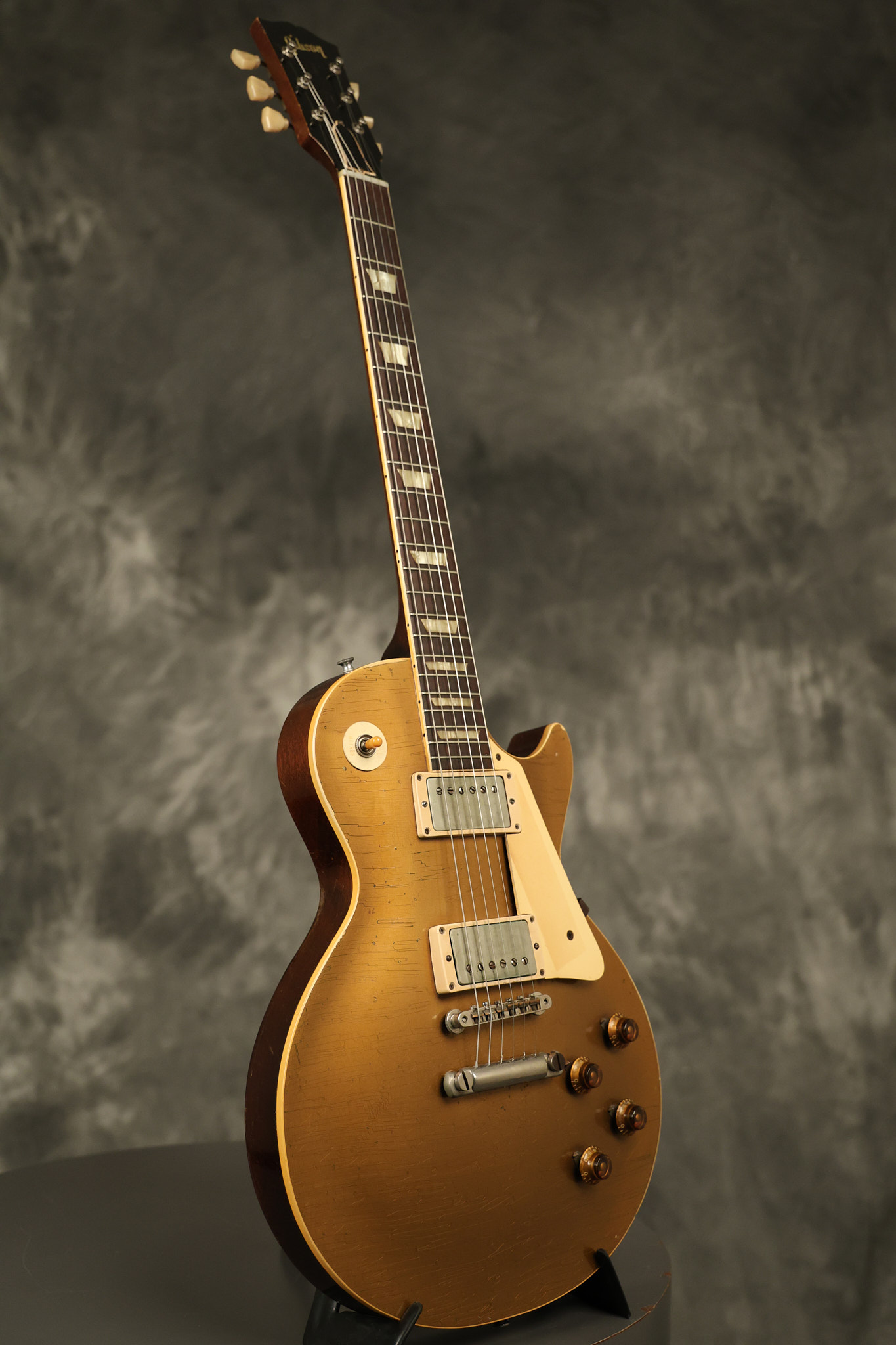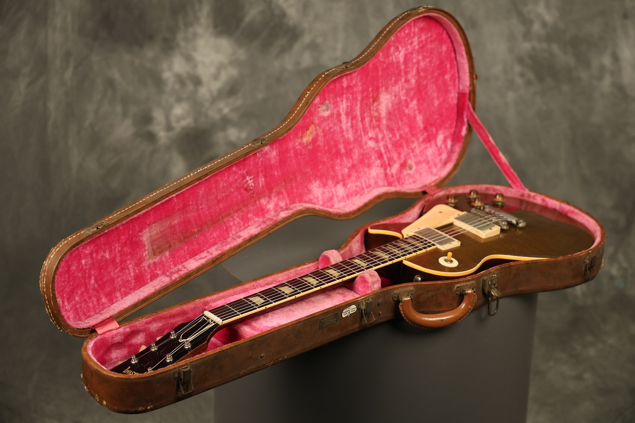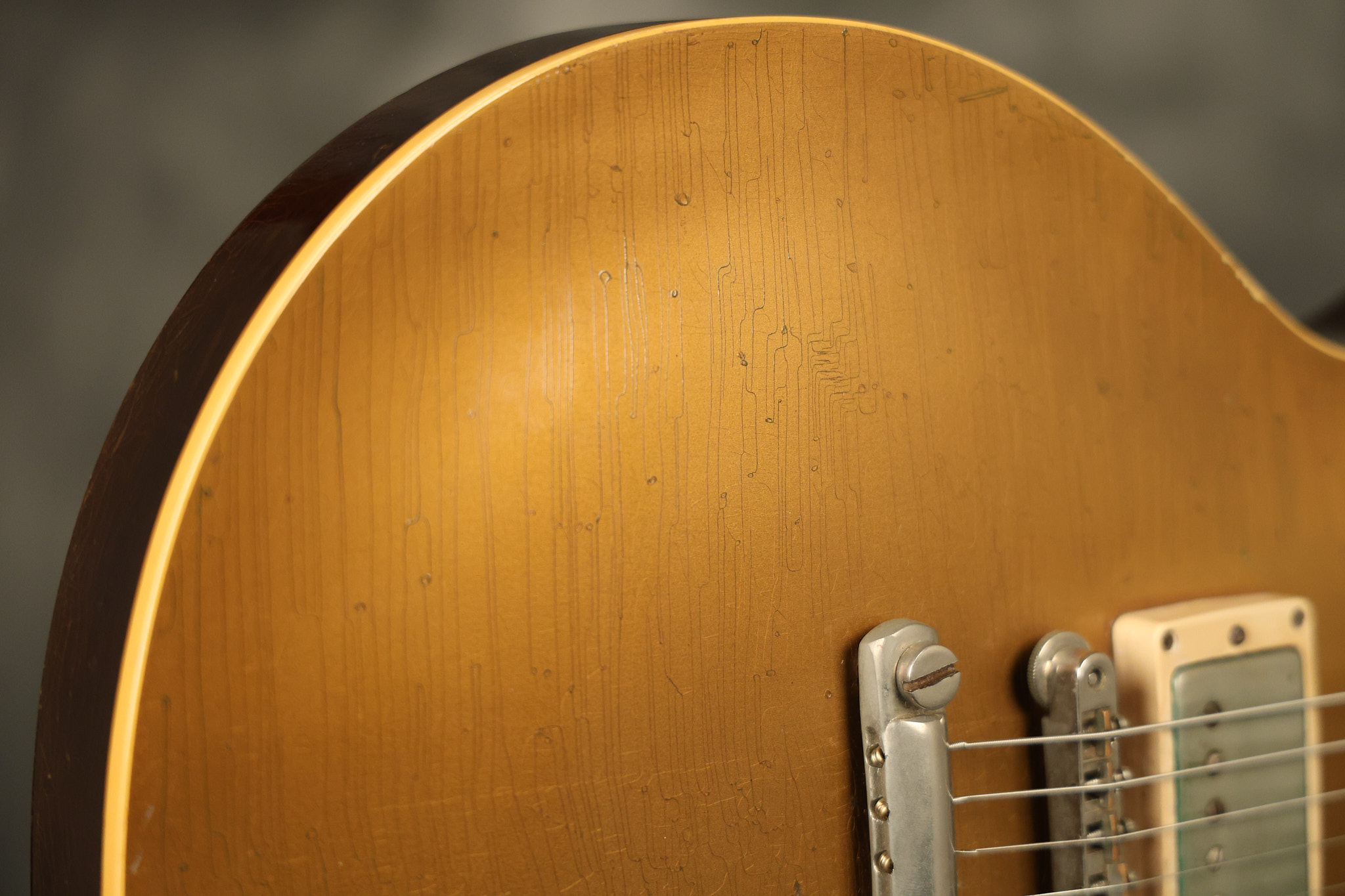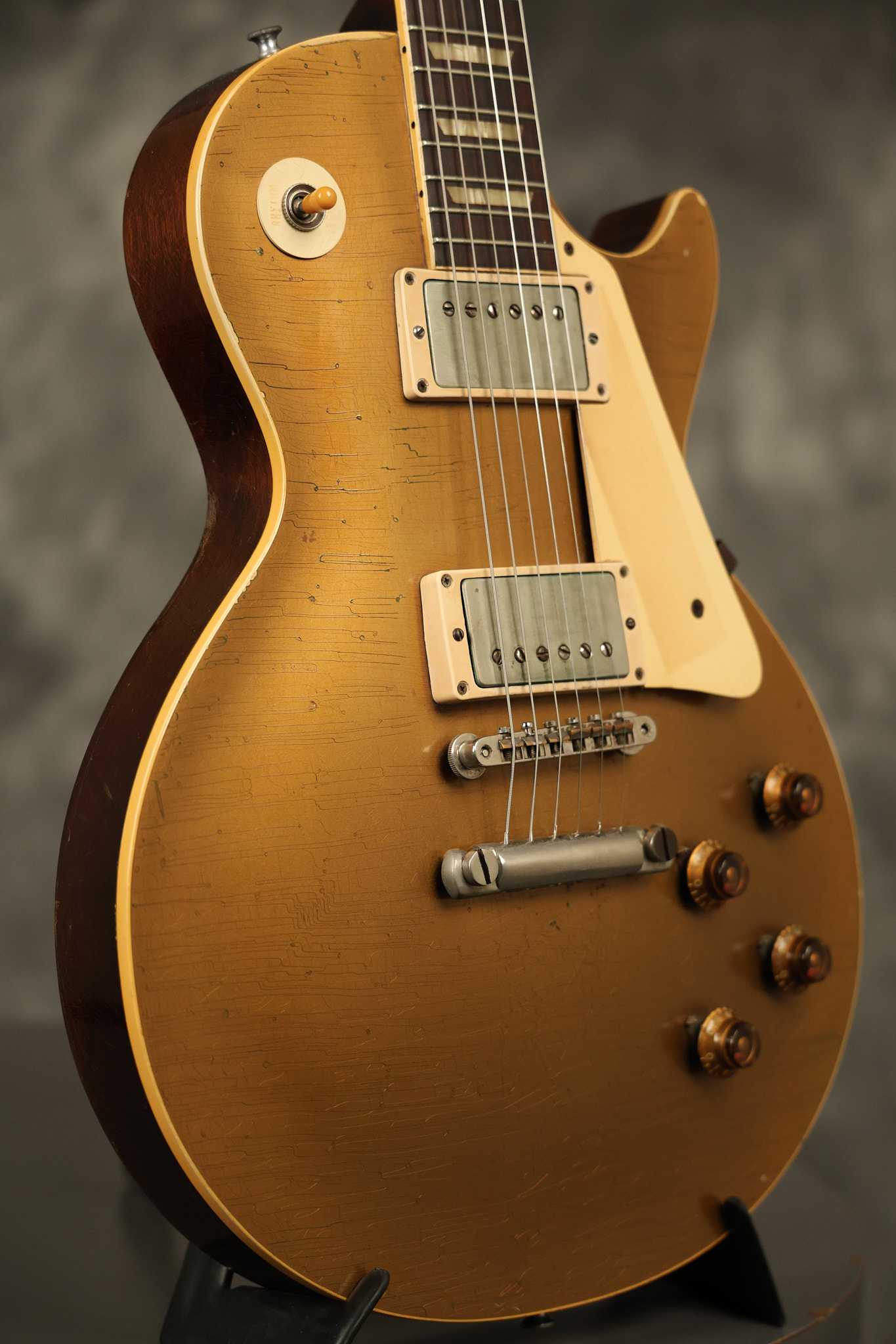 1957 Gibson Les Paul Goldtop in its original Gold top and dark back finish. It has a good playing neck with good frets. It's all original with the exception of one of  the bridge saddles and its screw (the A string saddle). It is also 100% complete along with its original hardshell case. This Les Paul looks great with lots of nicks + dings, finish checking, belt buckle wear, cracked plastic jack plate and other cosmetic wear. The guitar itself remains structurally sound with no cracks, breaks or repairs. As for the electronics, a repair was made on one coil of the bridge position pickup. It was not rewound, but had a connection break in the coil near the surface of the coil winding which has been reattached. All electronics work and sound great with its original set of PAF pickups. The weight is 8 lbs. 12 oz.