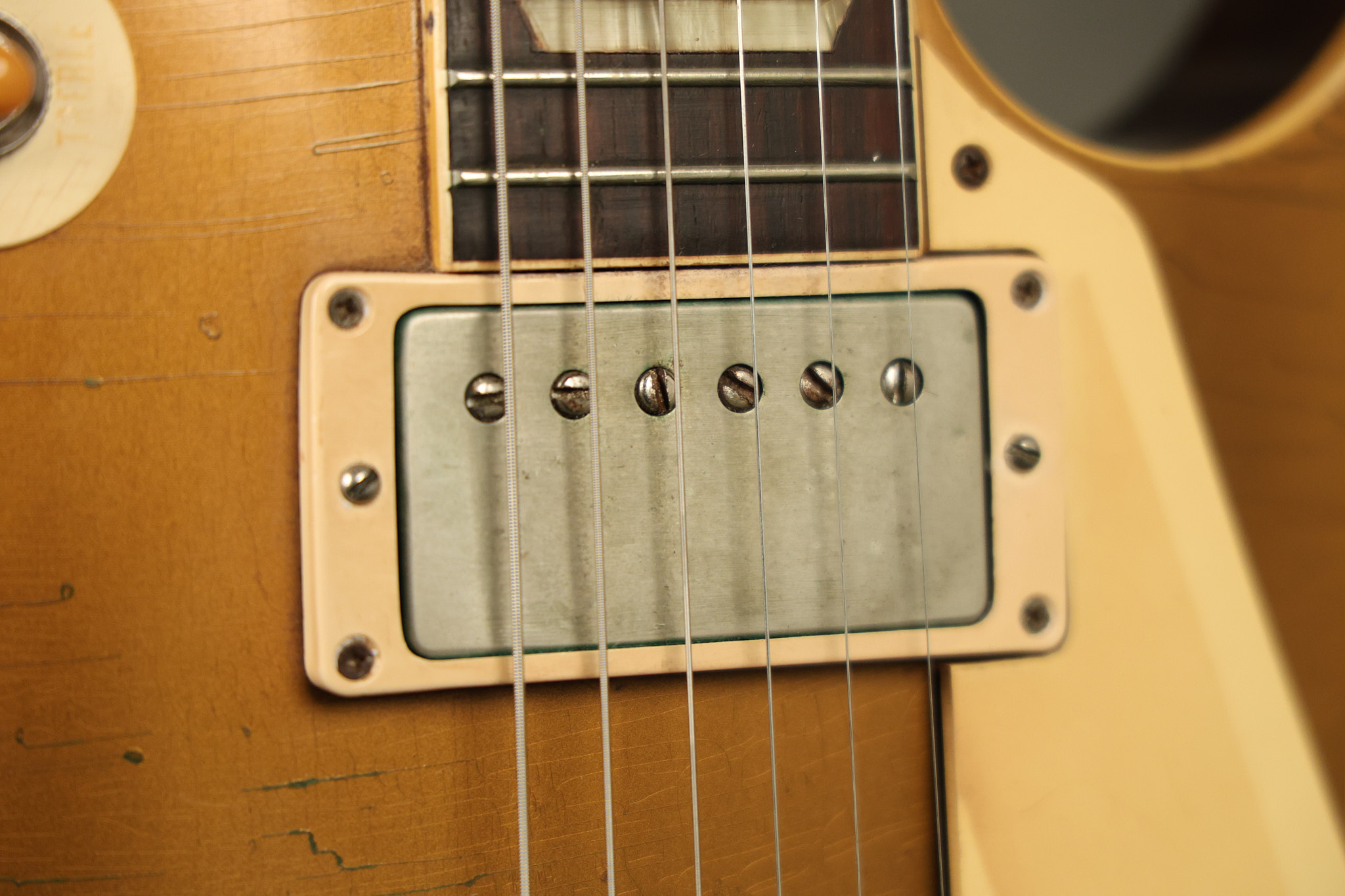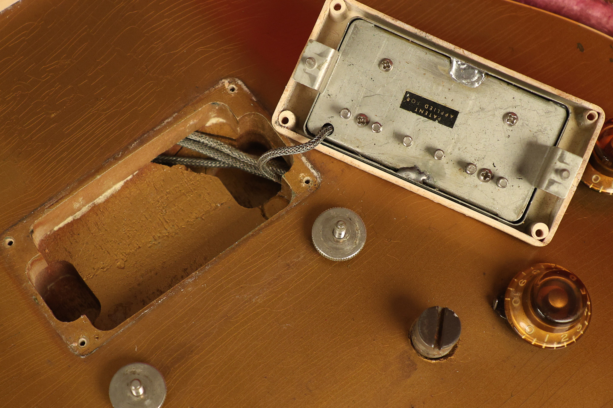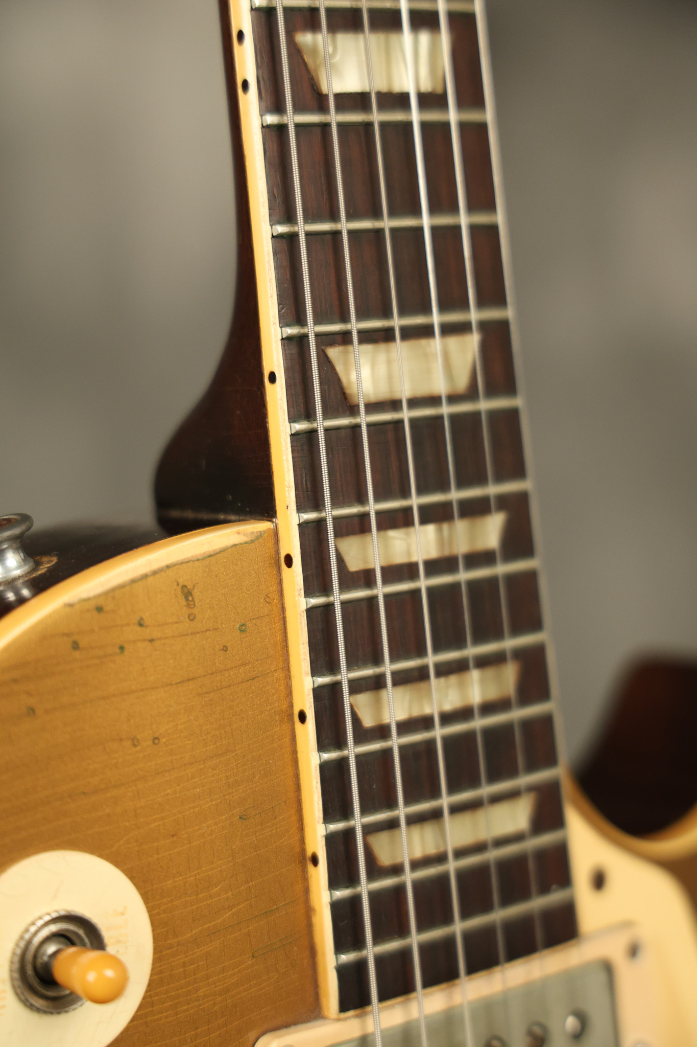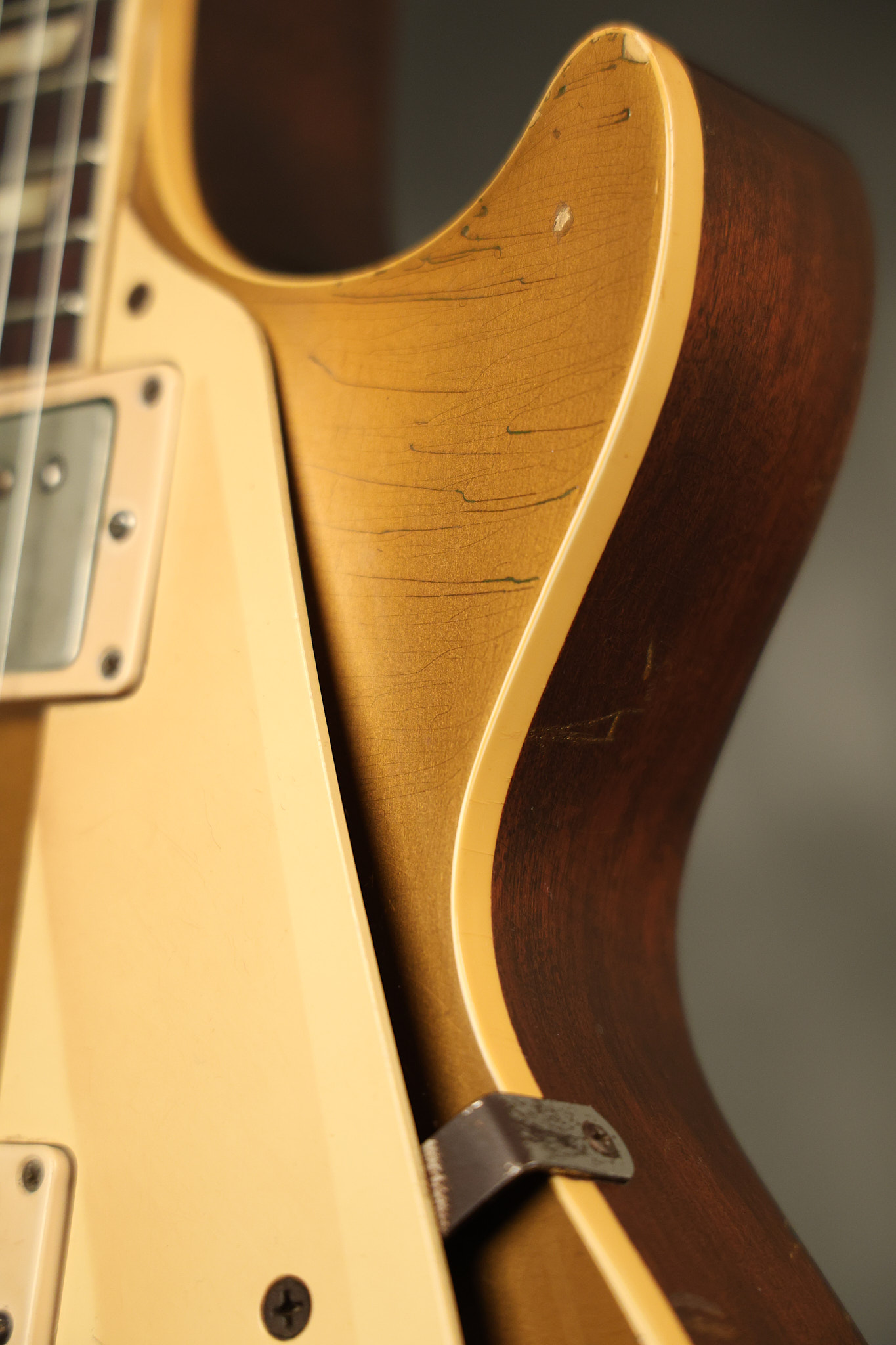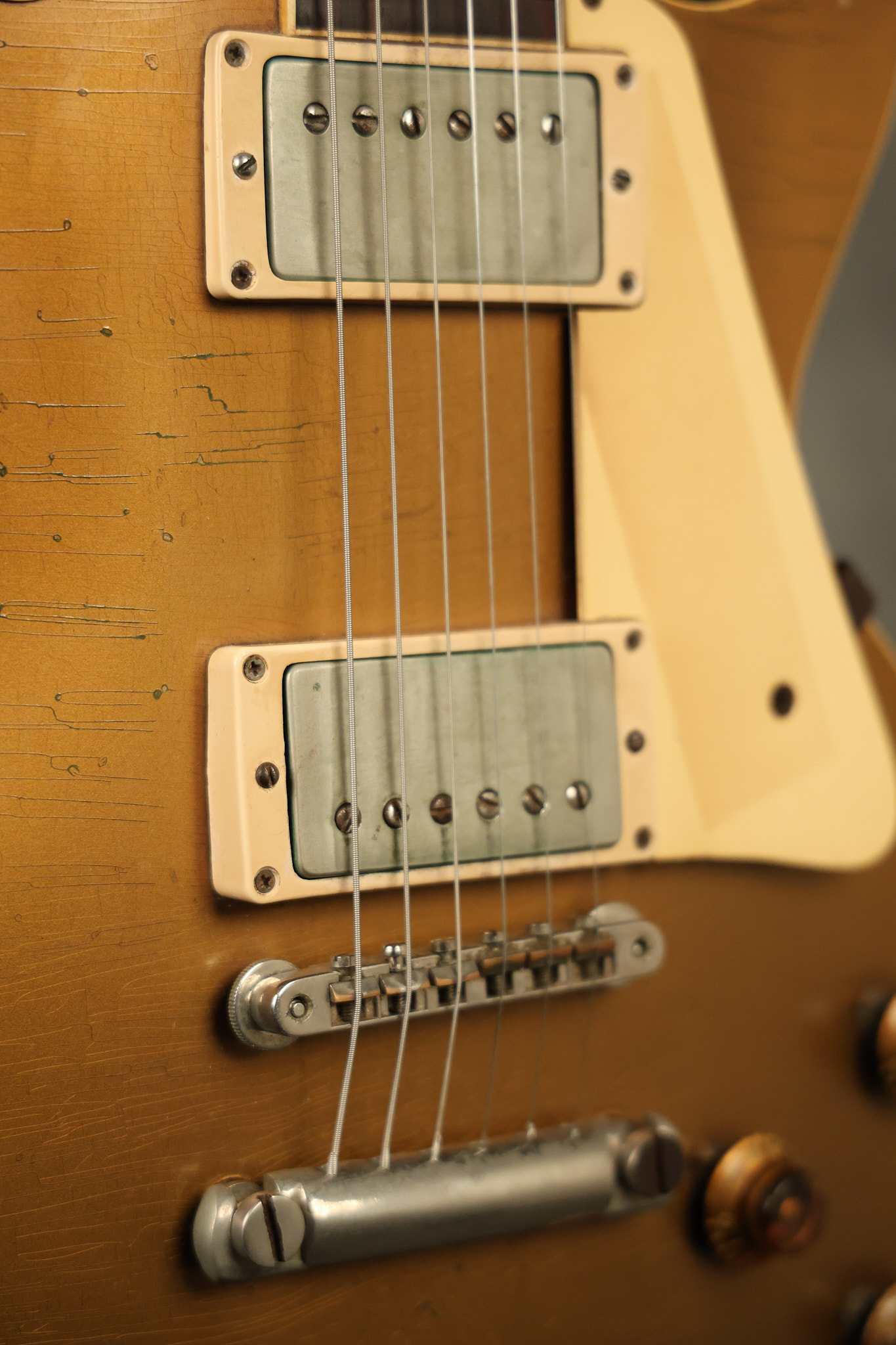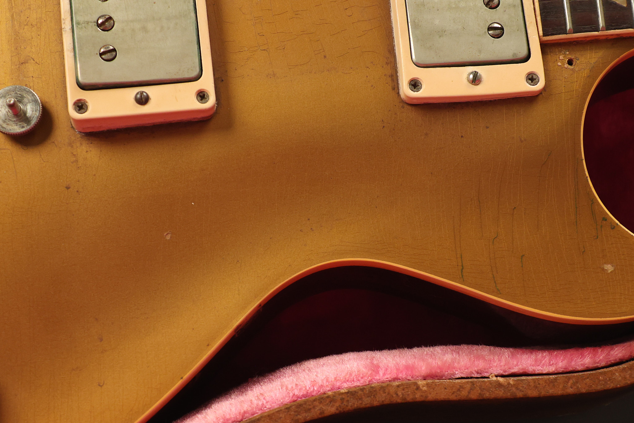 1957 Gibson Les Paul Goldtop in its original Gold top and dark back finish. It has a good playing neck with good frets. It's all original with the exception of one of  the bridge saddles and its screw (the A string saddle). It is also 100% complete along with its original hardshell case. This Les Paul looks great with lots of nicks + dings, finish checking, belt buckle wear, cracked plastic jack plate and other cosmetic wear. The guitar itself remains structurally sound with no cracks, breaks or repairs. As for the electronics, a repair was made on one coil of the bridge position pickup. It was not rewound, but had a connection break in the coil near the surface of the coil winding which has been reattached. All electronics work and sound great with its original set of PAF pickups. The weight is 8 lbs. 12 oz.