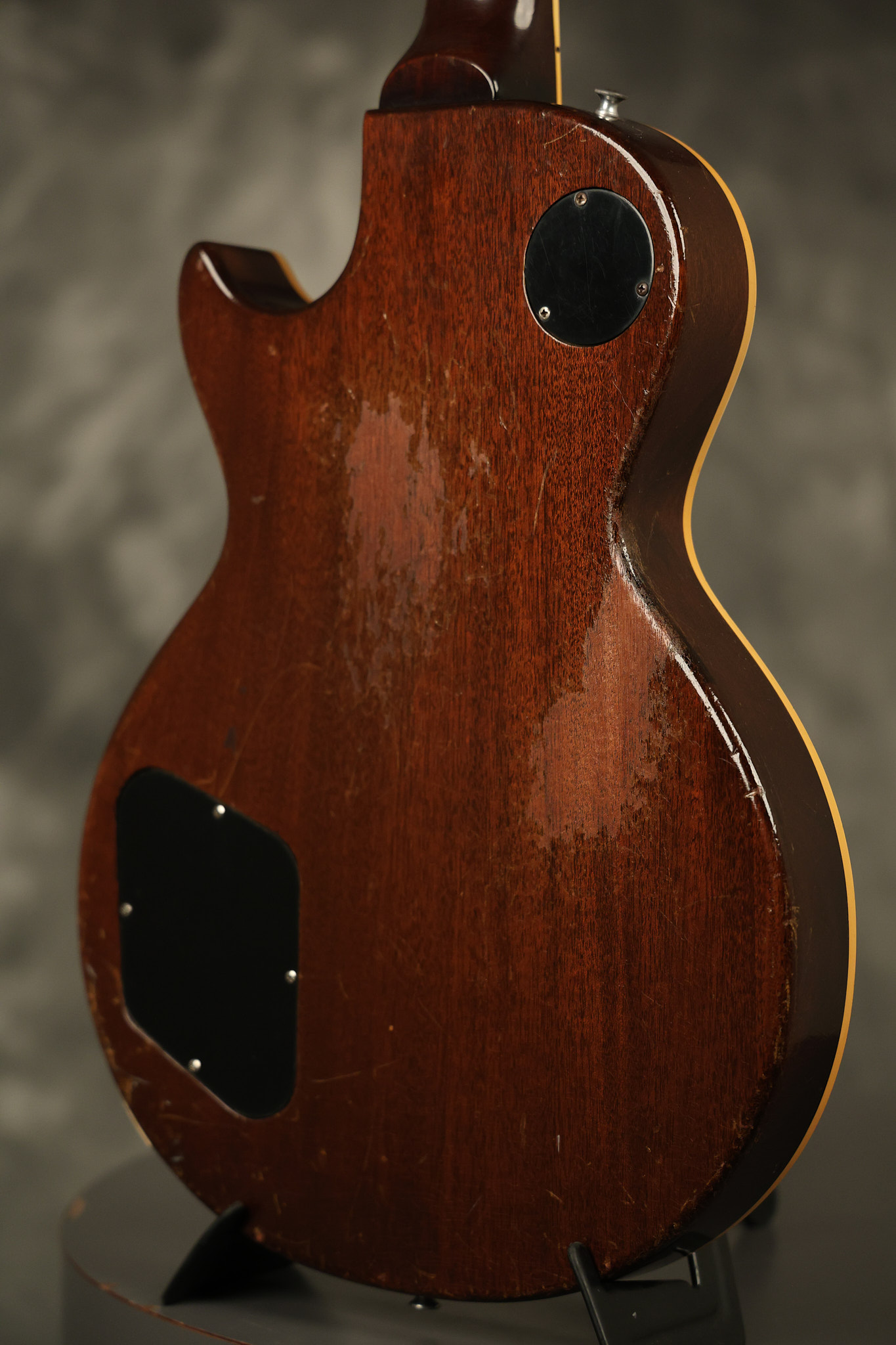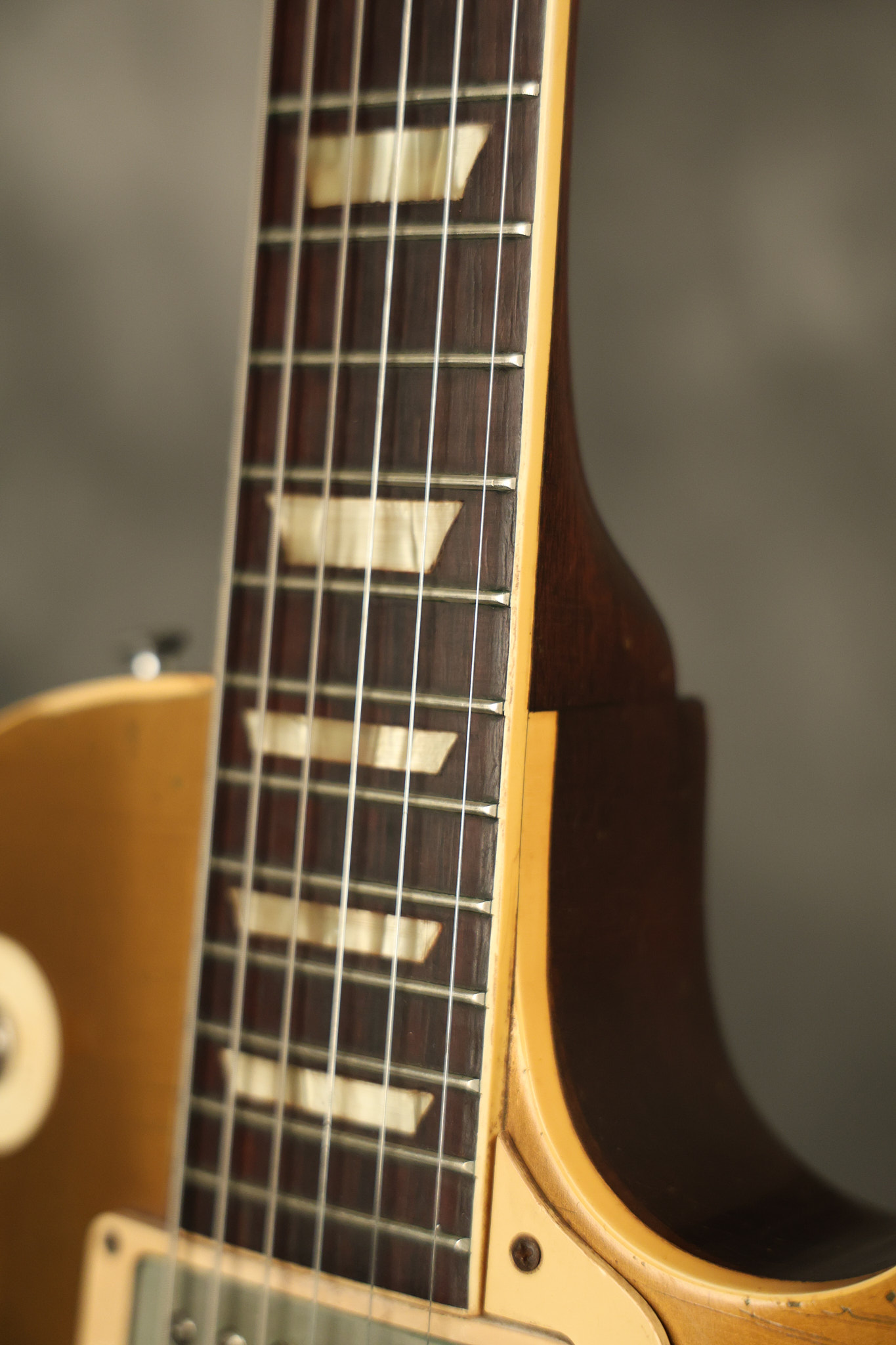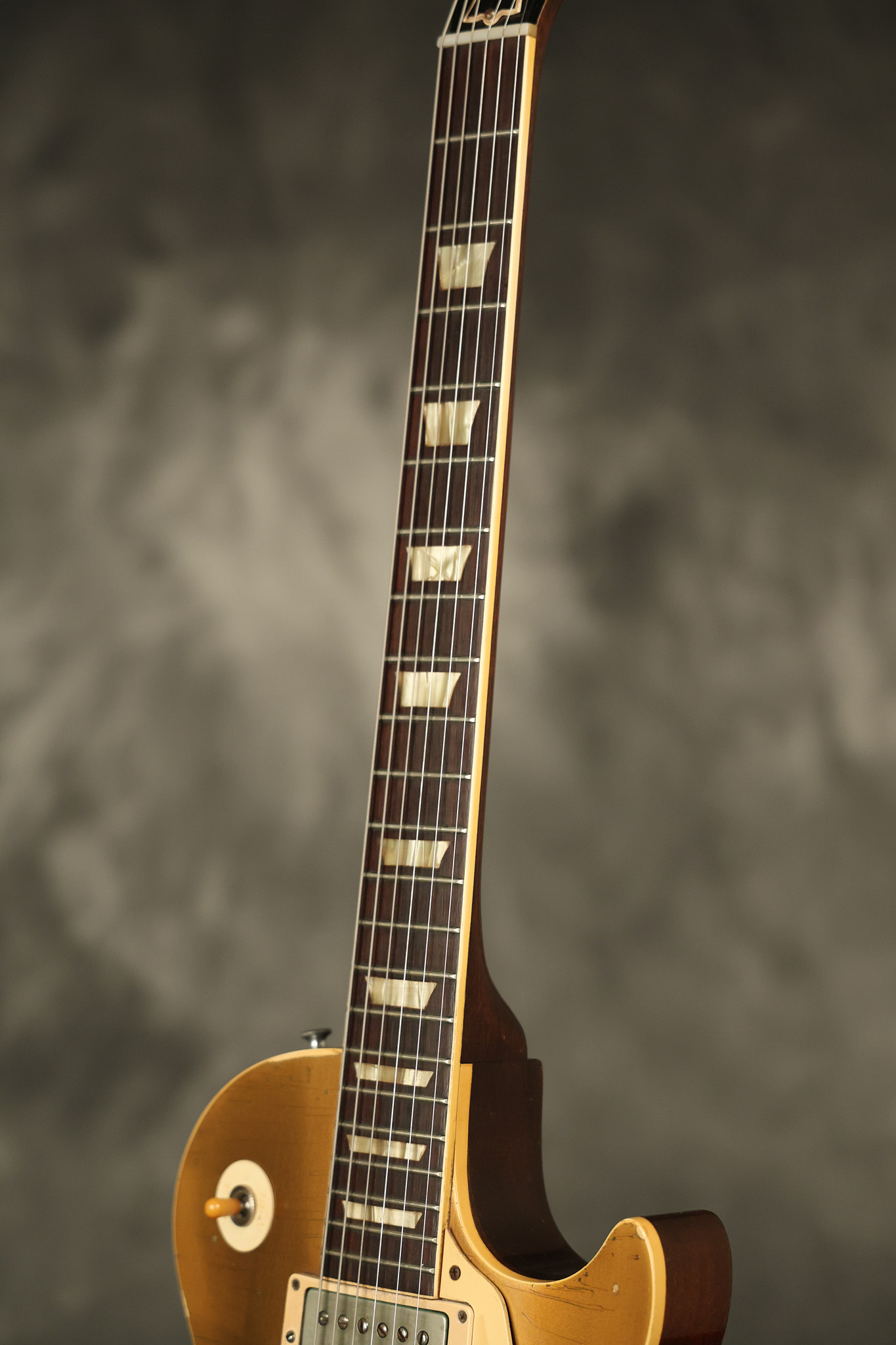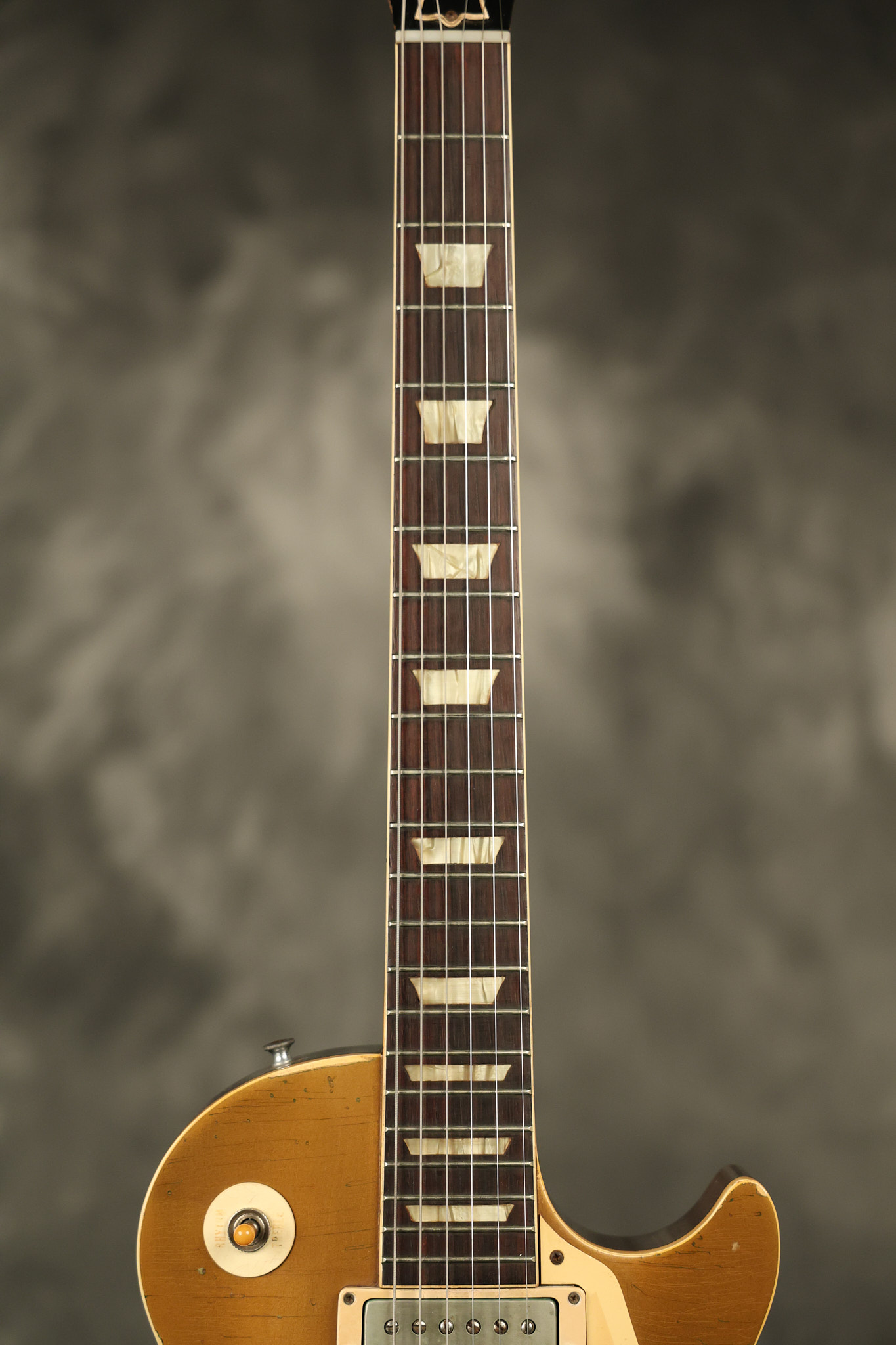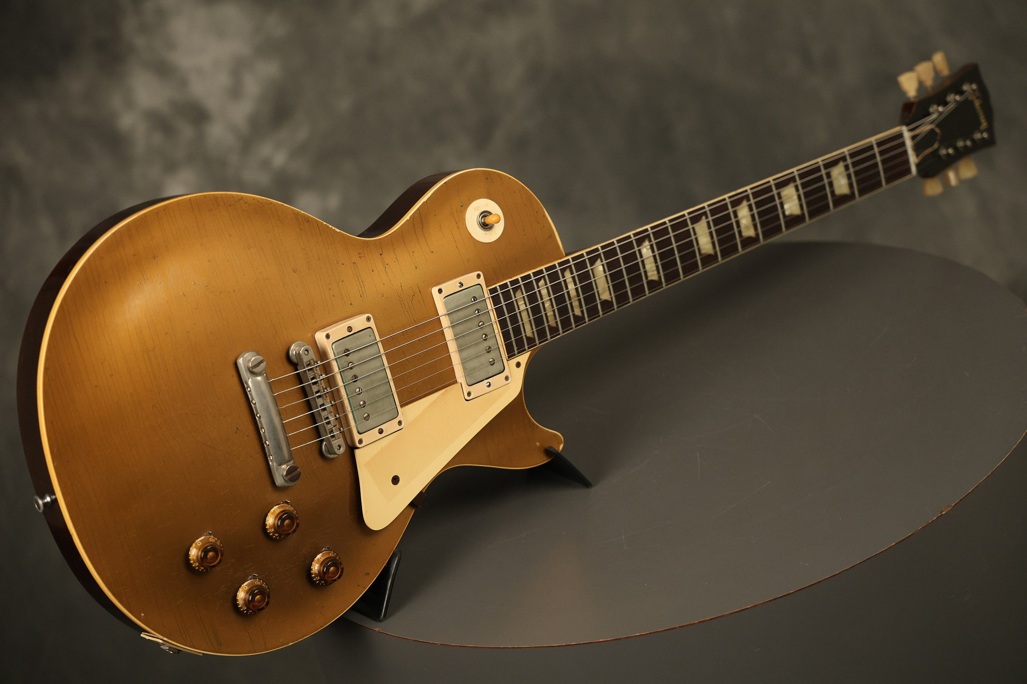 1957 Gibson Les Paul Goldtop in its original Gold top and dark back finish. It has a good playing neck with good frets. It's all original with the exception of one of  the bridge saddles and its screw (the A string saddle). It is also 100% complete along with its original hardshell case. This Les Paul looks great with lots of nicks + dings, finish checking, belt buckle wear, cracked plastic jack plate and other cosmetic wear. The guitar itself remains structurally sound with no cracks, breaks or repairs. As for the electronics, a repair was made on one coil of the bridge position pickup. It was not rewound, but had a connection break in the coil near the surface of the coil winding which has been reattached. All electronics work and sound great with its original set of PAF pickups. The weight is 8 lbs. 12 oz.
