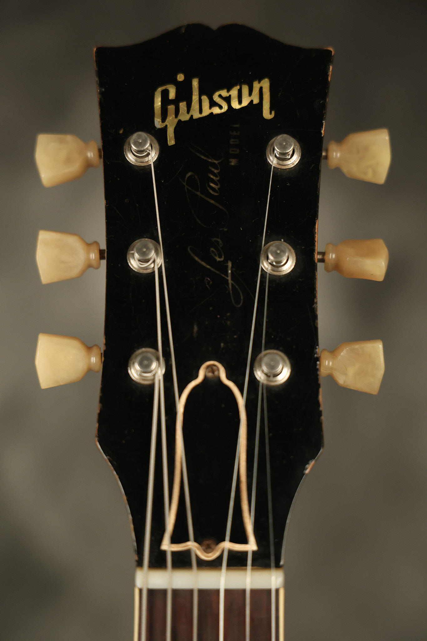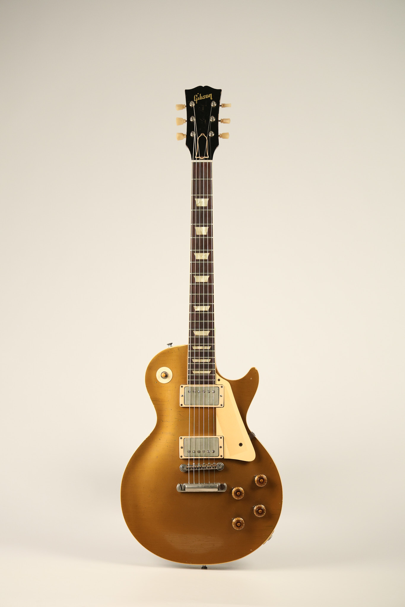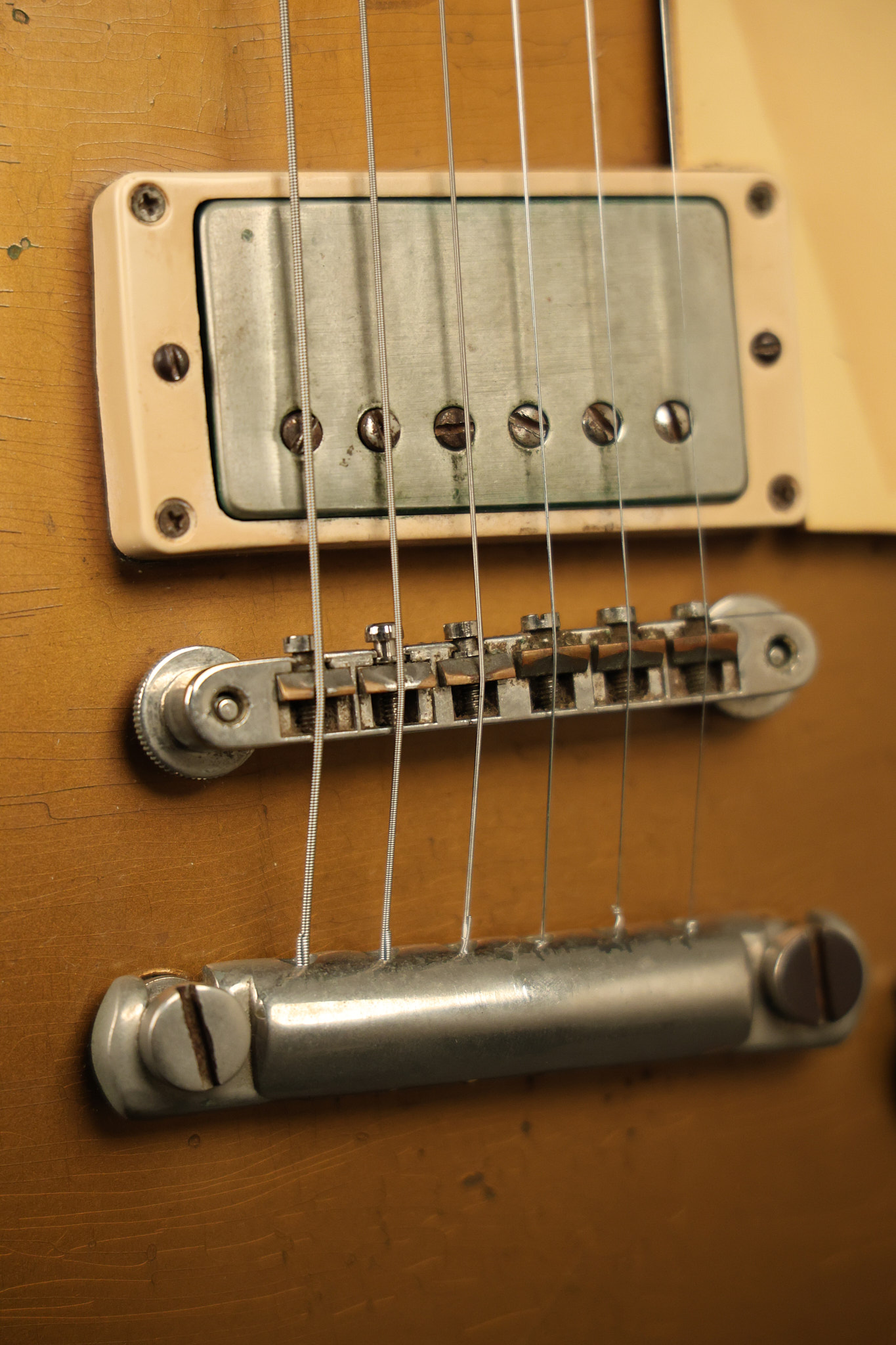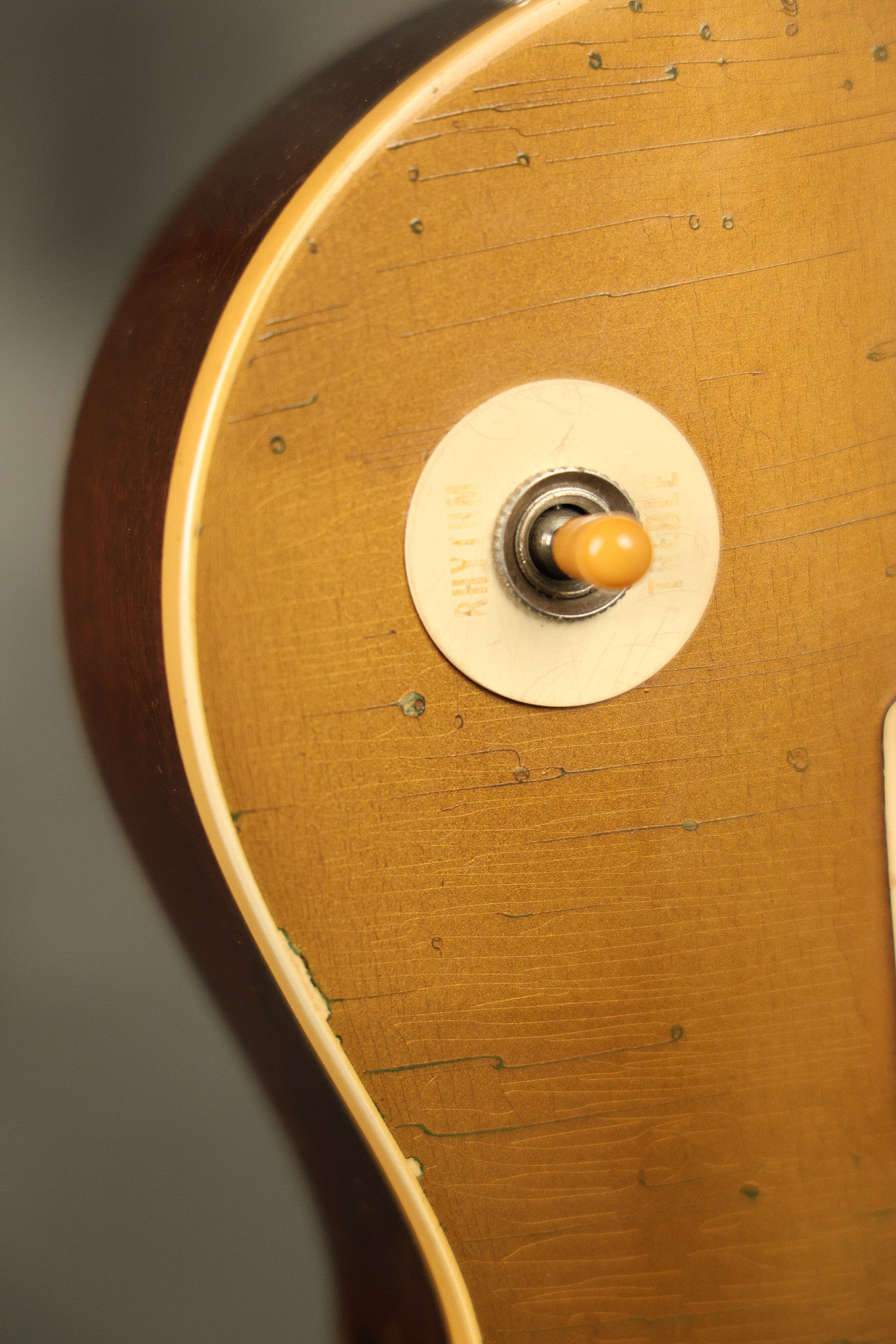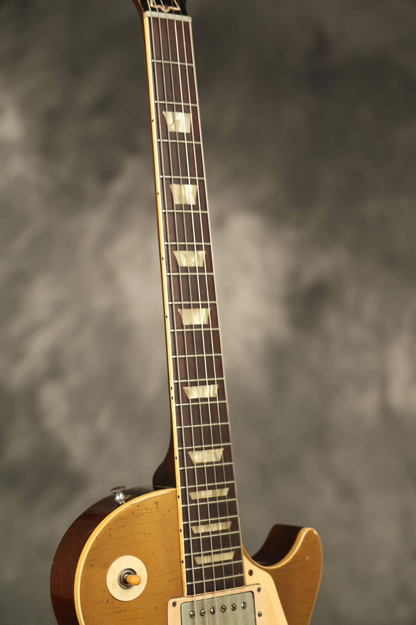 1957 Gibson Les Paul Goldtop in its original Gold top and dark back finish. It has a good playing neck with good frets. It's all original with the exception of one of  the bridge saddles and its screw (the A string saddle). It is also 100% complete along with its original hardshell case. This Les Paul looks great with lots of nicks + dings, finish checking, belt buckle wear, cracked plastic jack plate and other cosmetic wear. The guitar itself remains structurally sound with no cracks, breaks or repairs. As for the electronics, a repair was made on one coil of the bridge position pickup. It was not rewound, but had a connection break in the coil near the surface of the coil winding which has been reattached. All electronics work and sound great with its original set of PAF pickups. The weight is 8 lbs. 12 oz.