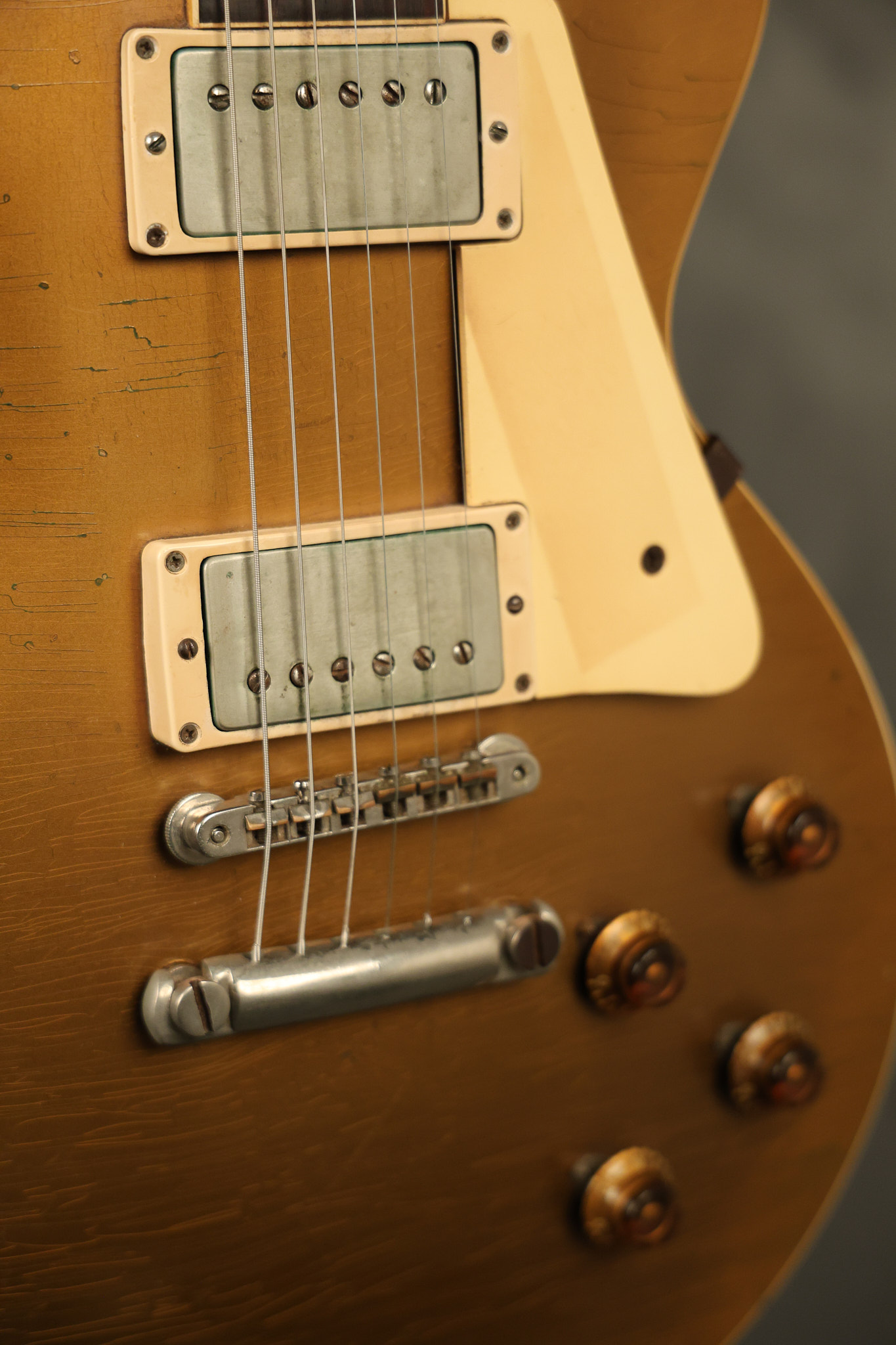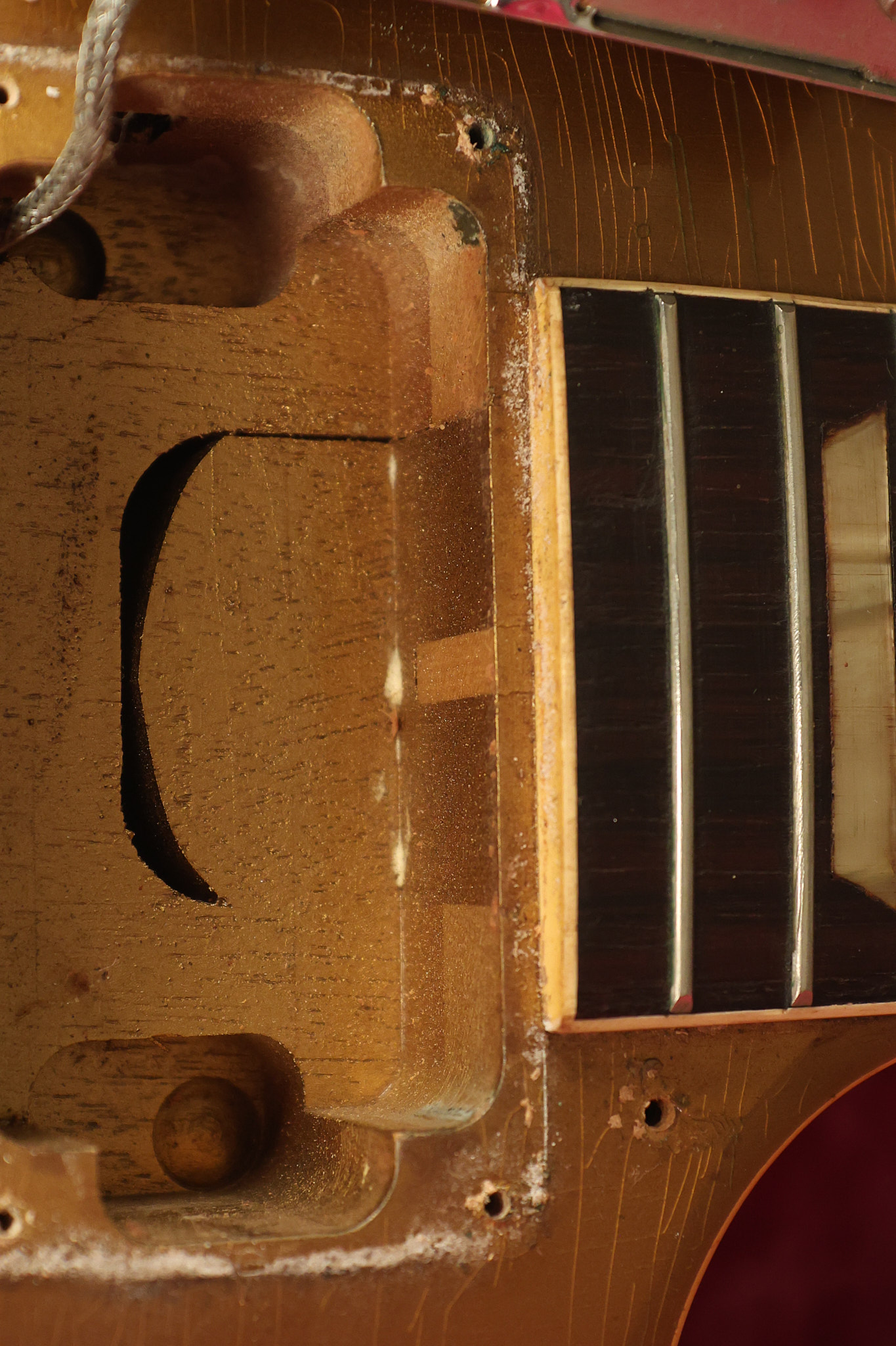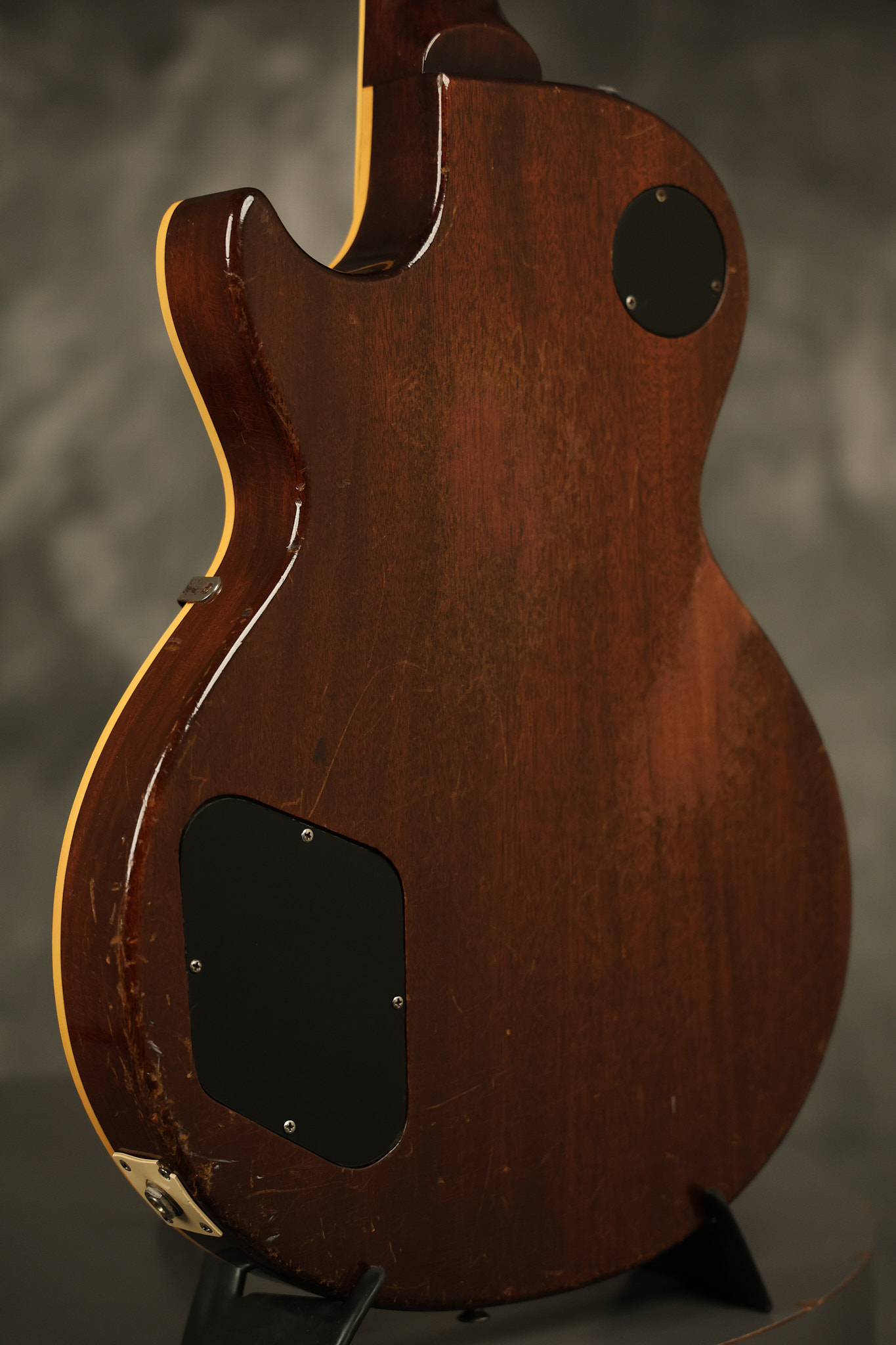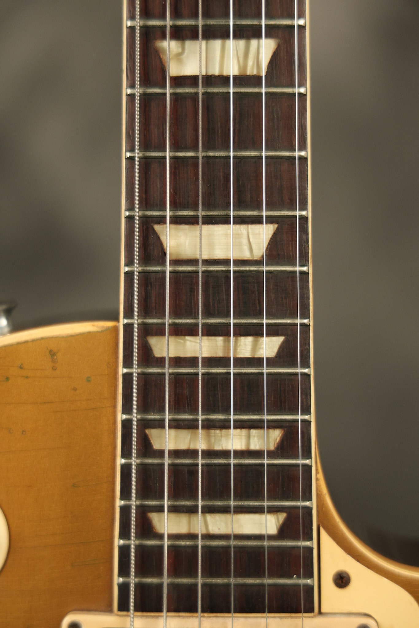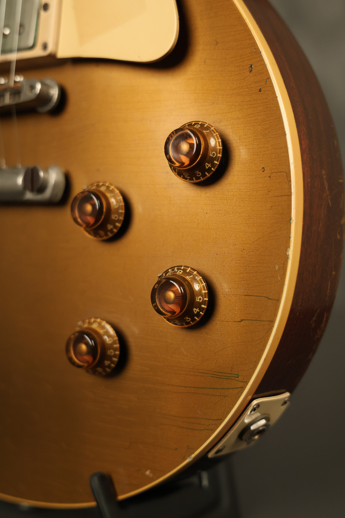 1957 Gibson Les Paul Goldtop in its original Gold top and dark back finish. It has a good playing neck with good frets. It's all original with the exception of one of  the bridge saddles and its screw (the A string saddle). It is also 100% complete along with its original hardshell case. This Les Paul looks great with lots of nicks + dings, finish checking, belt buckle wear, cracked plastic jack plate and other cosmetic wear. The guitar itself remains structurally sound with no cracks, breaks or repairs. As for the electronics, a repair was made on one coil of the bridge position pickup. It was not rewound, but had a connection break in the coil near the surface of the coil winding which has been reattached. All electronics work and sound great with its original set of PAF pickups. The weight is 8 lbs. 12 oz.