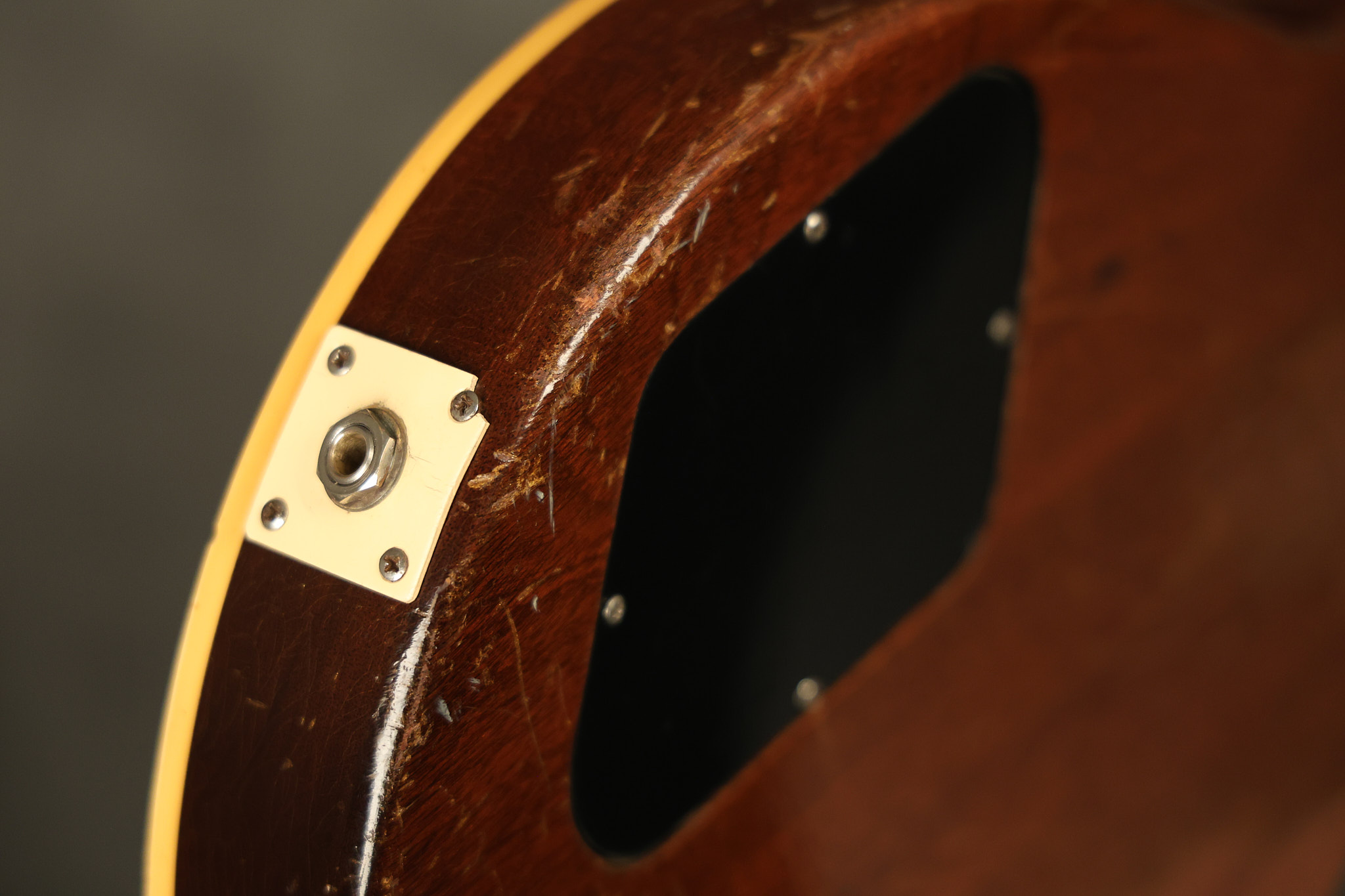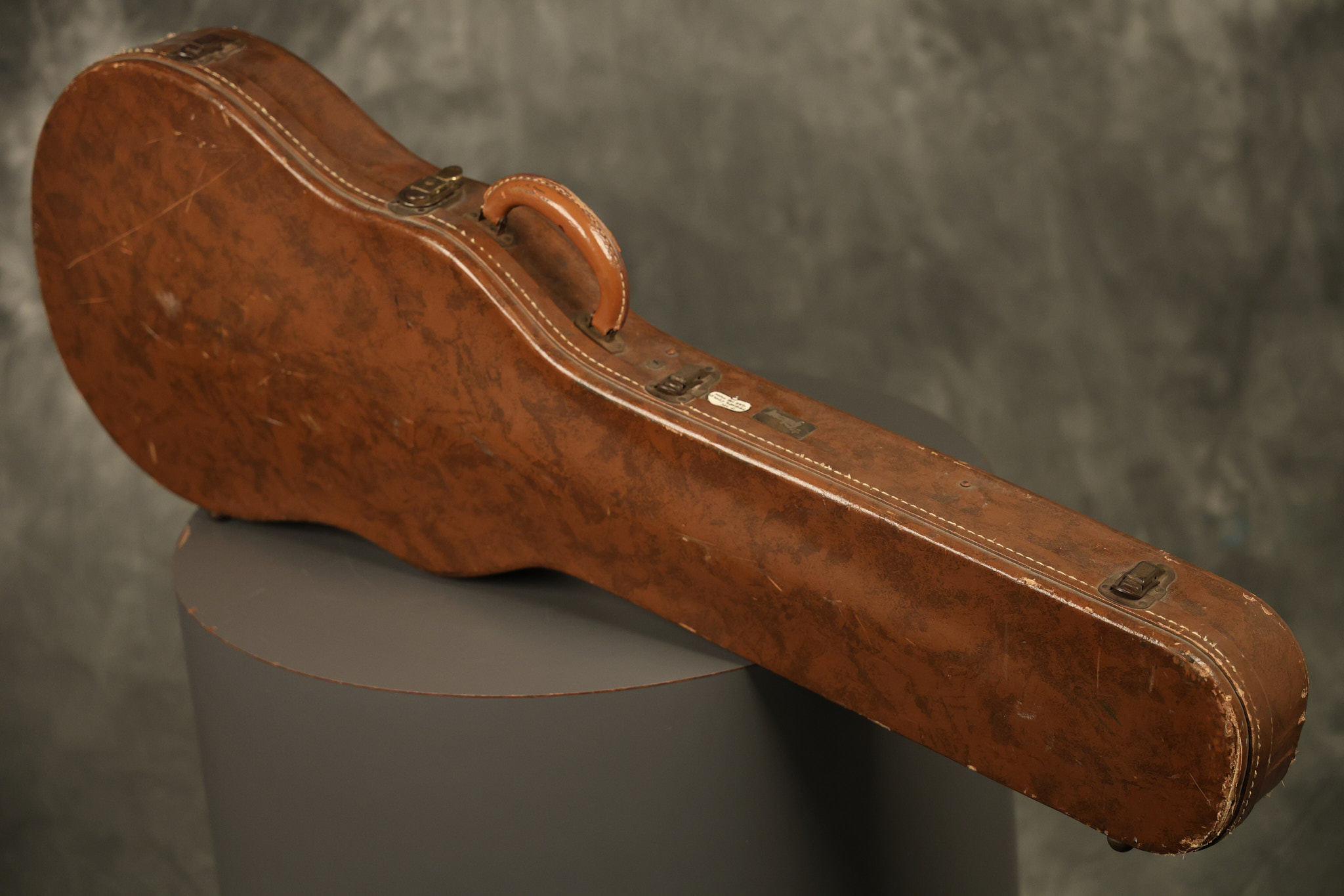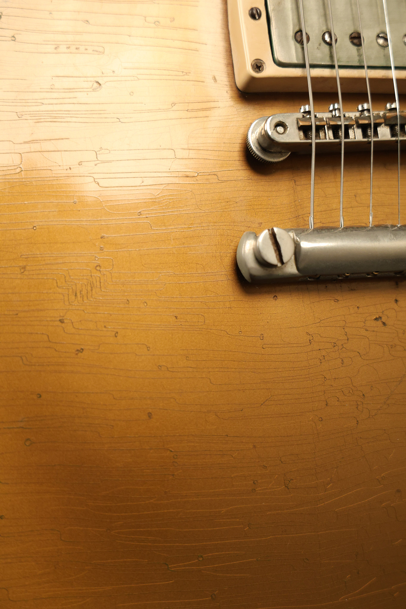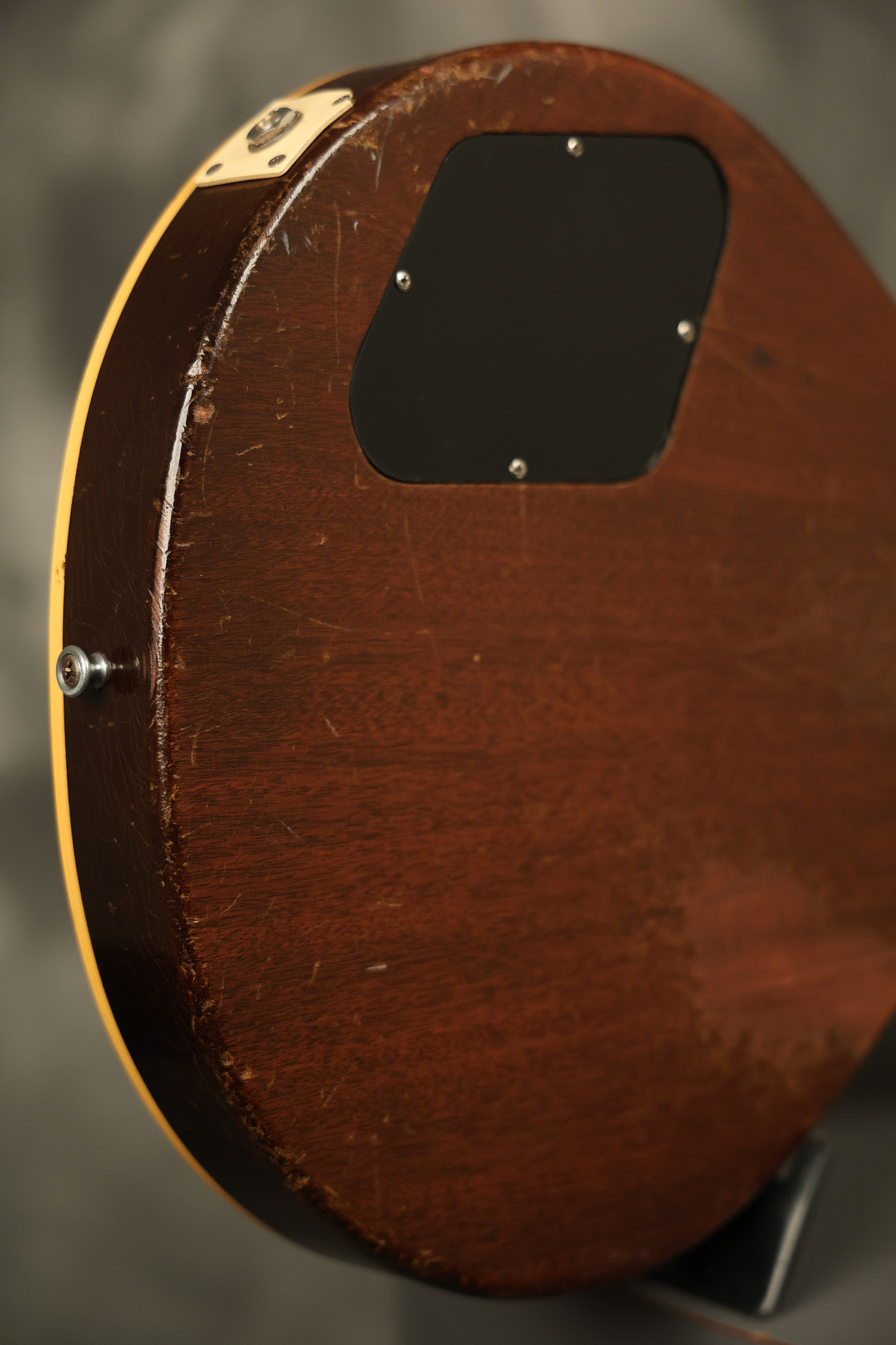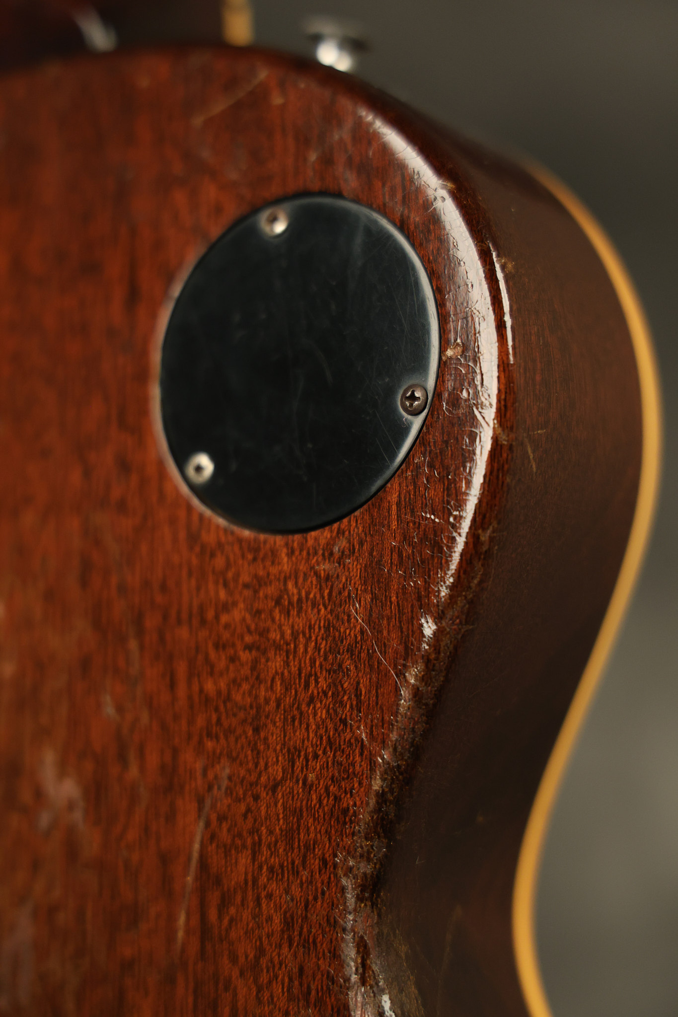 1957 Gibson Les Paul Goldtop in its original Gold top and dark back finish. It has a good playing neck with good frets. It's all original with the exception of one of  the bridge saddles and its screw (the A string saddle). It is also 100% complete along with its original hardshell case. This Les Paul looks great with lots of nicks + dings, finish checking, belt buckle wear, cracked plastic jack plate and other cosmetic wear. The guitar itself remains structurally sound with no cracks, breaks or repairs. As for the electronics, a repair was made on one coil of the bridge position pickup. It was not rewound, but had a connection break in the coil near the surface of the coil winding which has been reattached. All electronics work and sound great with its original set of PAF pickups. The weight is 8 lbs. 12 oz.