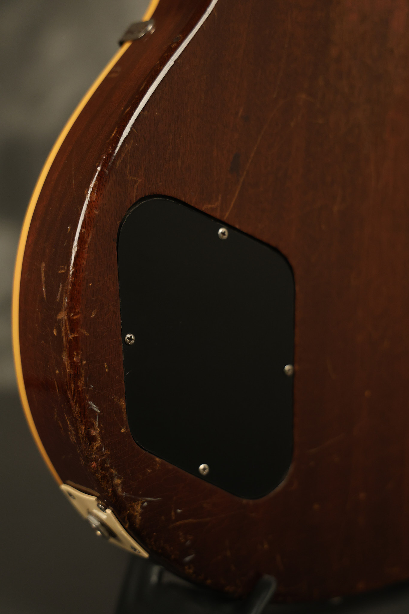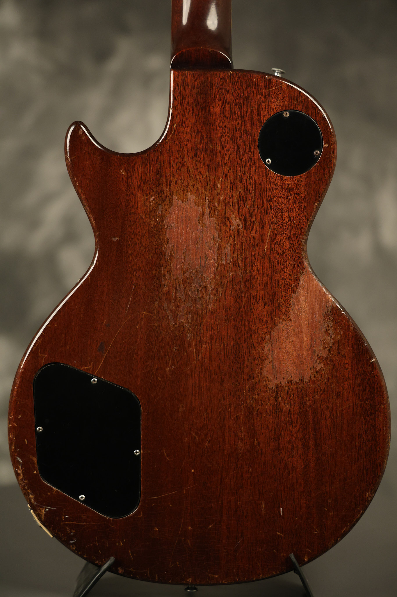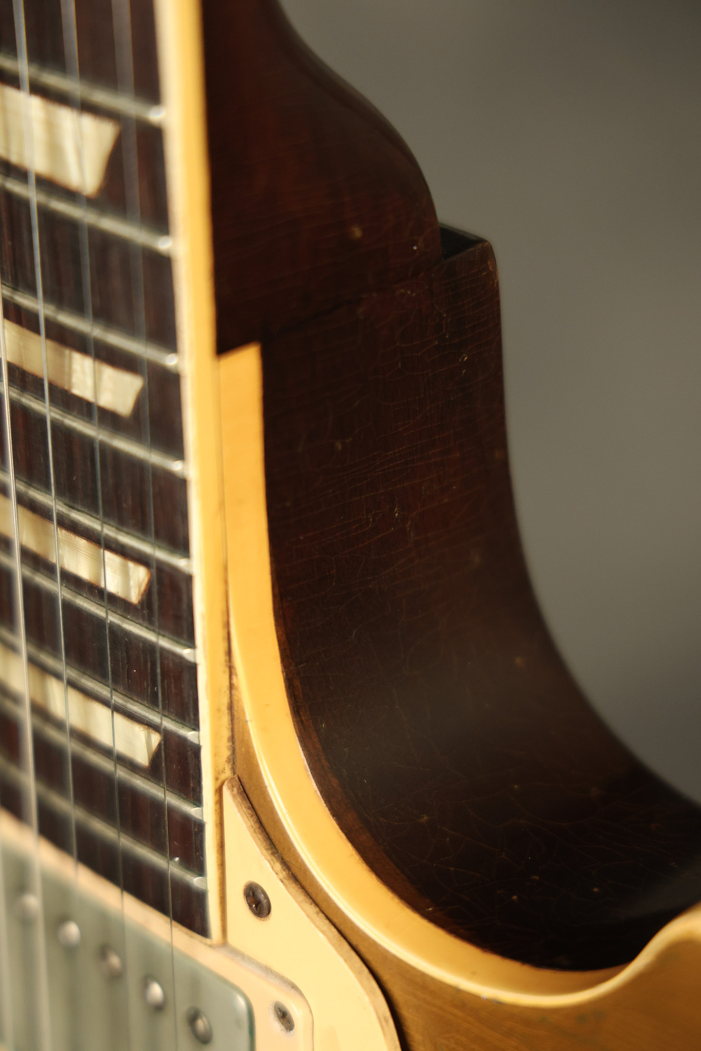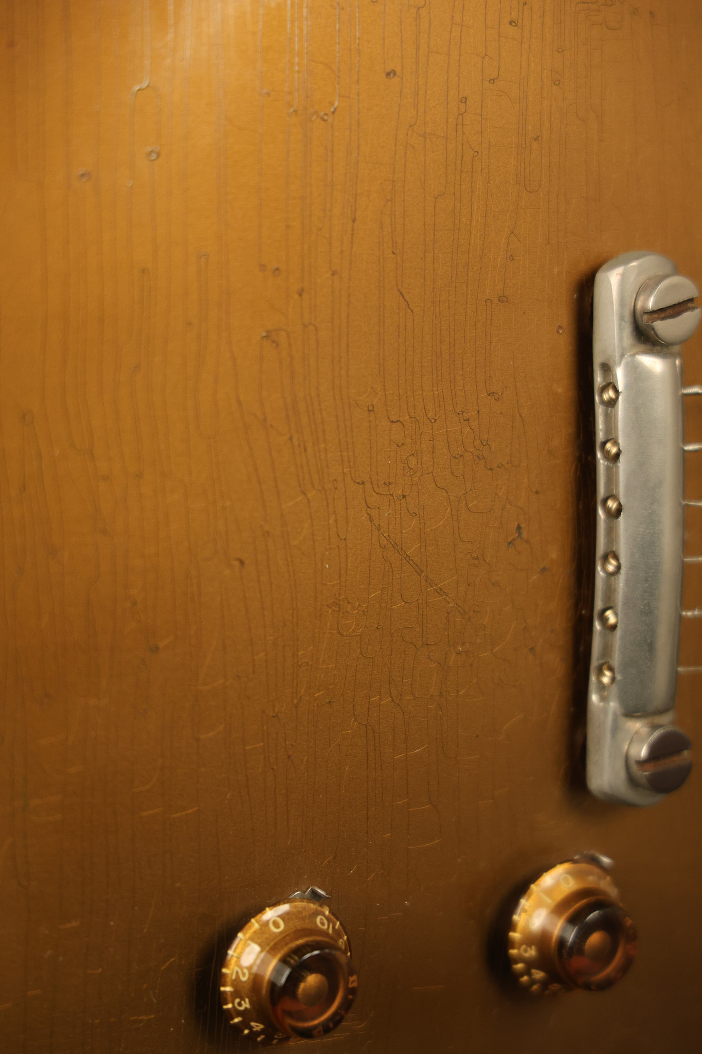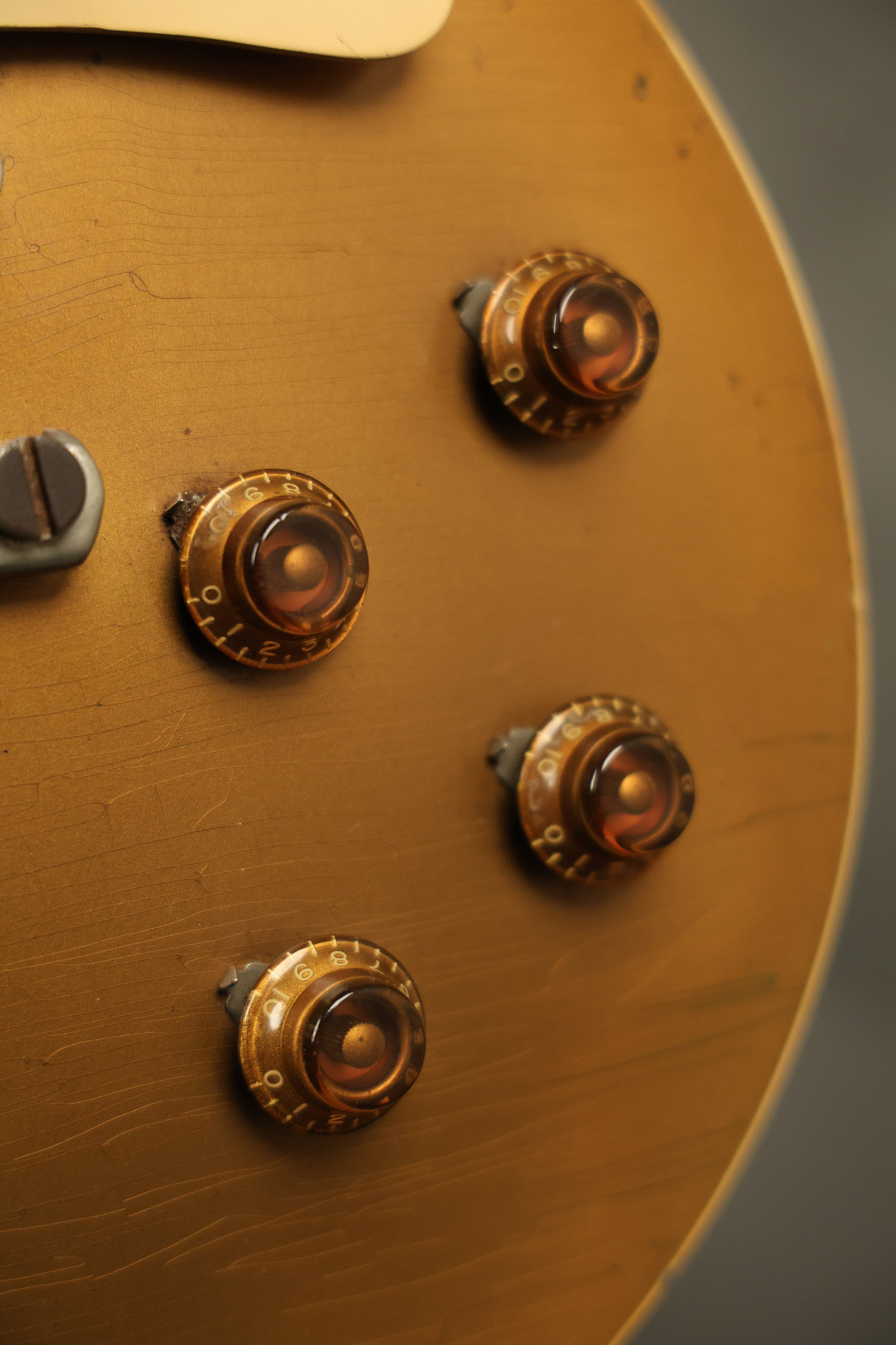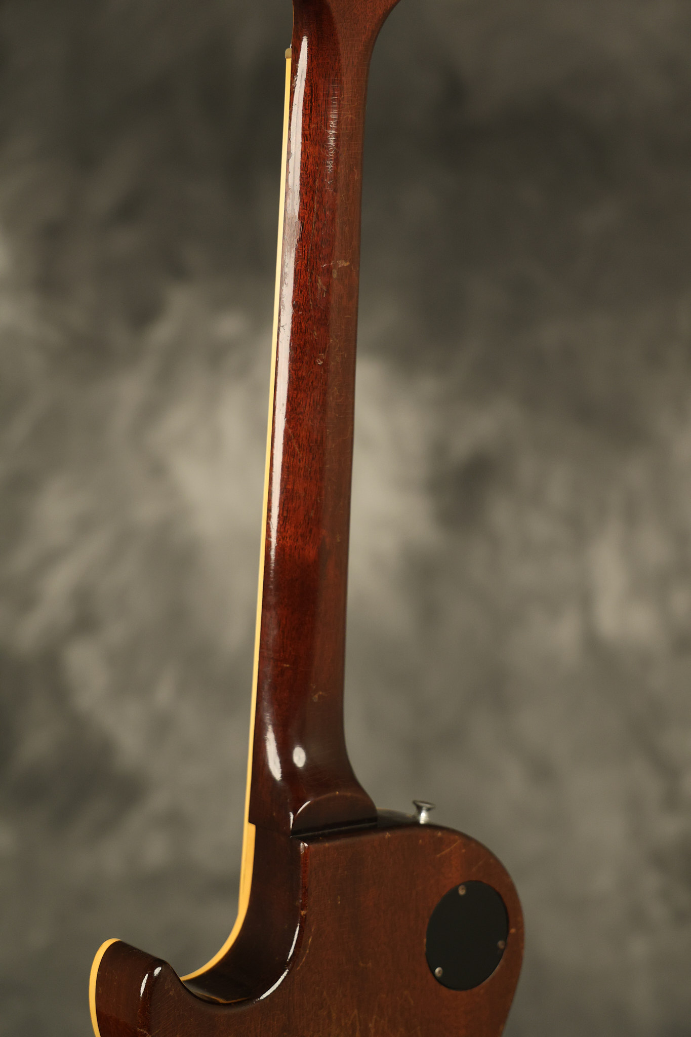 1957 Gibson Les Paul Goldtop in its original Gold top and dark back finish. It has a good playing neck with good frets. It's all original with the exception of one of  the bridge saddles and its screw (the A string saddle). It is also 100% complete along with its original hardshell case. This Les Paul looks great with lots of nicks + dings, finish checking, belt buckle wear, cracked plastic jack plate and other cosmetic wear. The guitar itself remains structurally sound with no cracks, breaks or repairs. As for the electronics, a repair was made on one coil of the bridge position pickup. It was not rewound, but had a connection break in the coil near the surface of the coil winding which has been reattached. All electronics work and sound great with its original set of PAF pickups. The weight is 8 lbs. 12 oz.