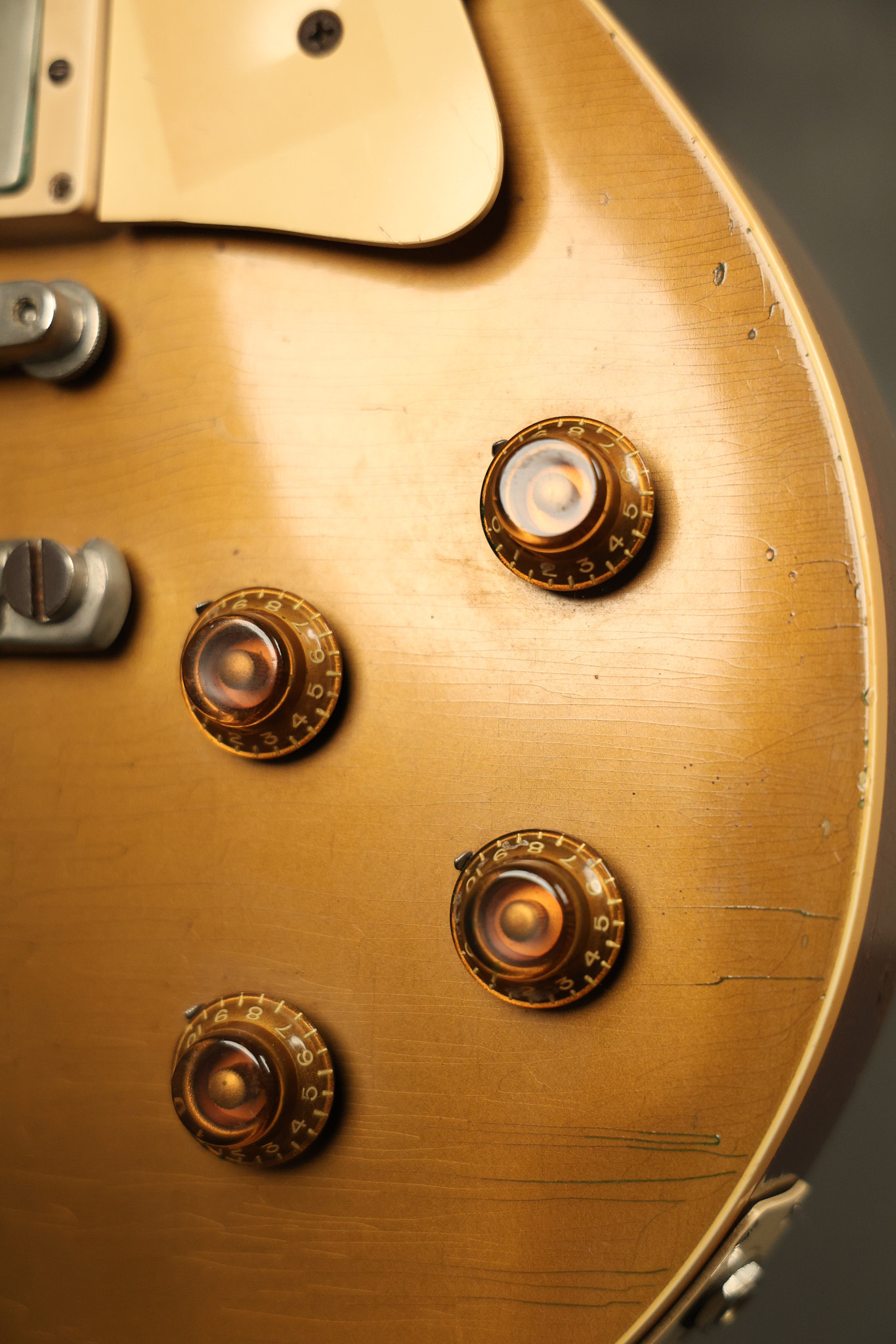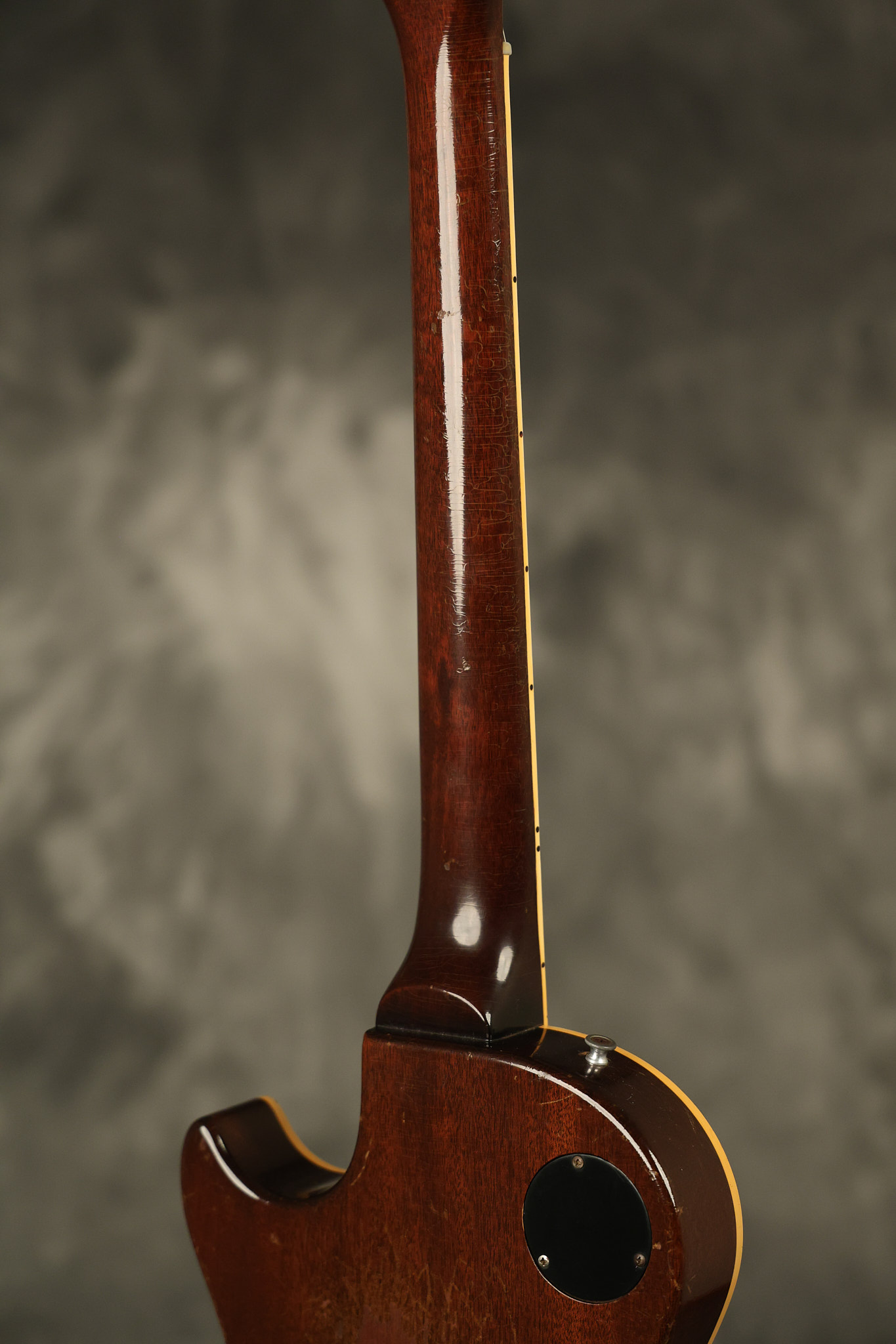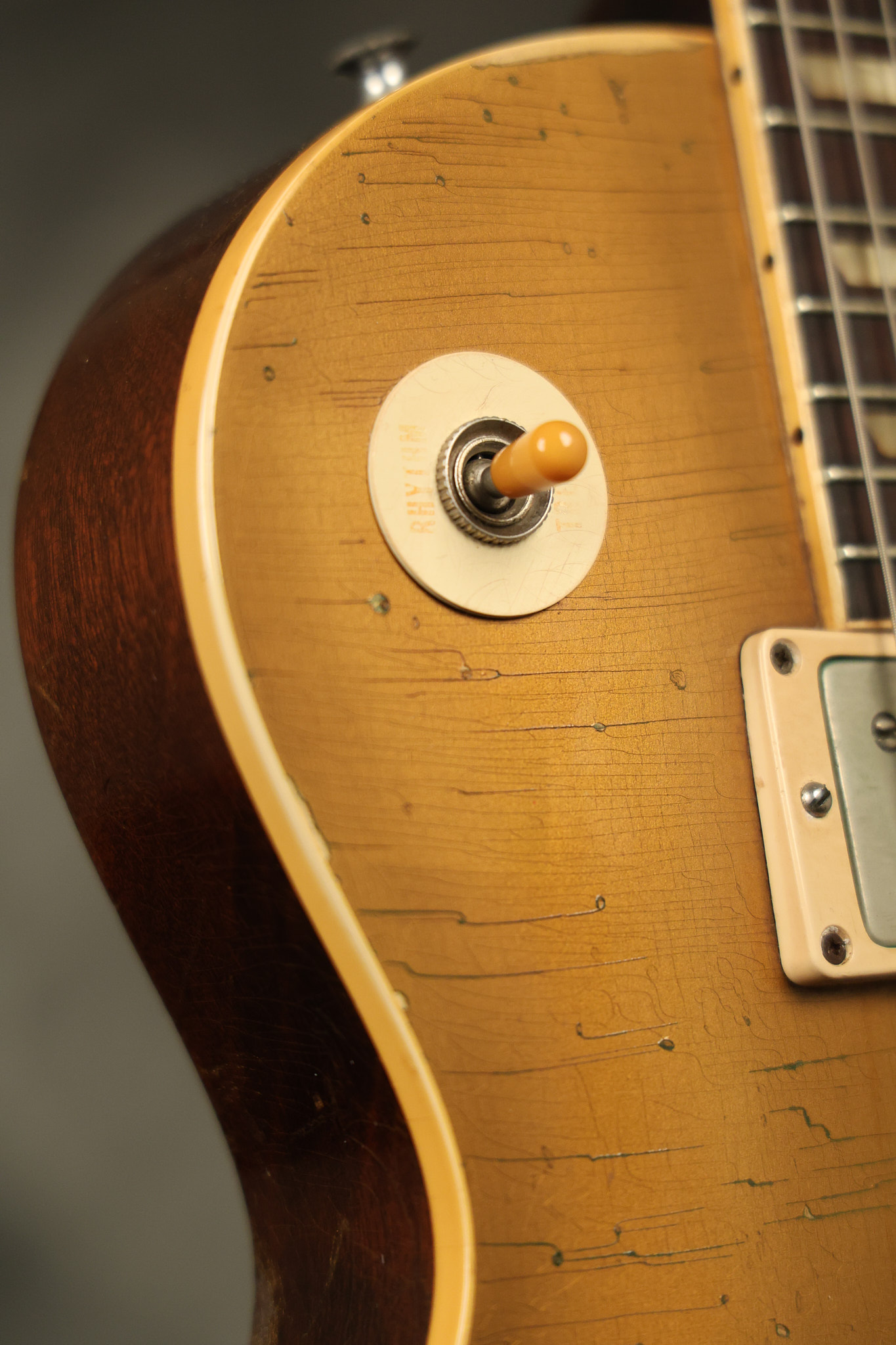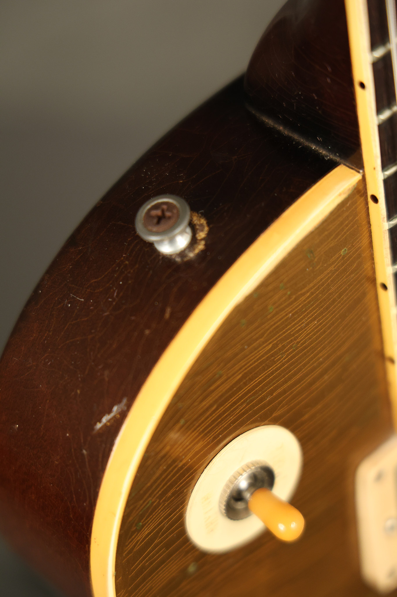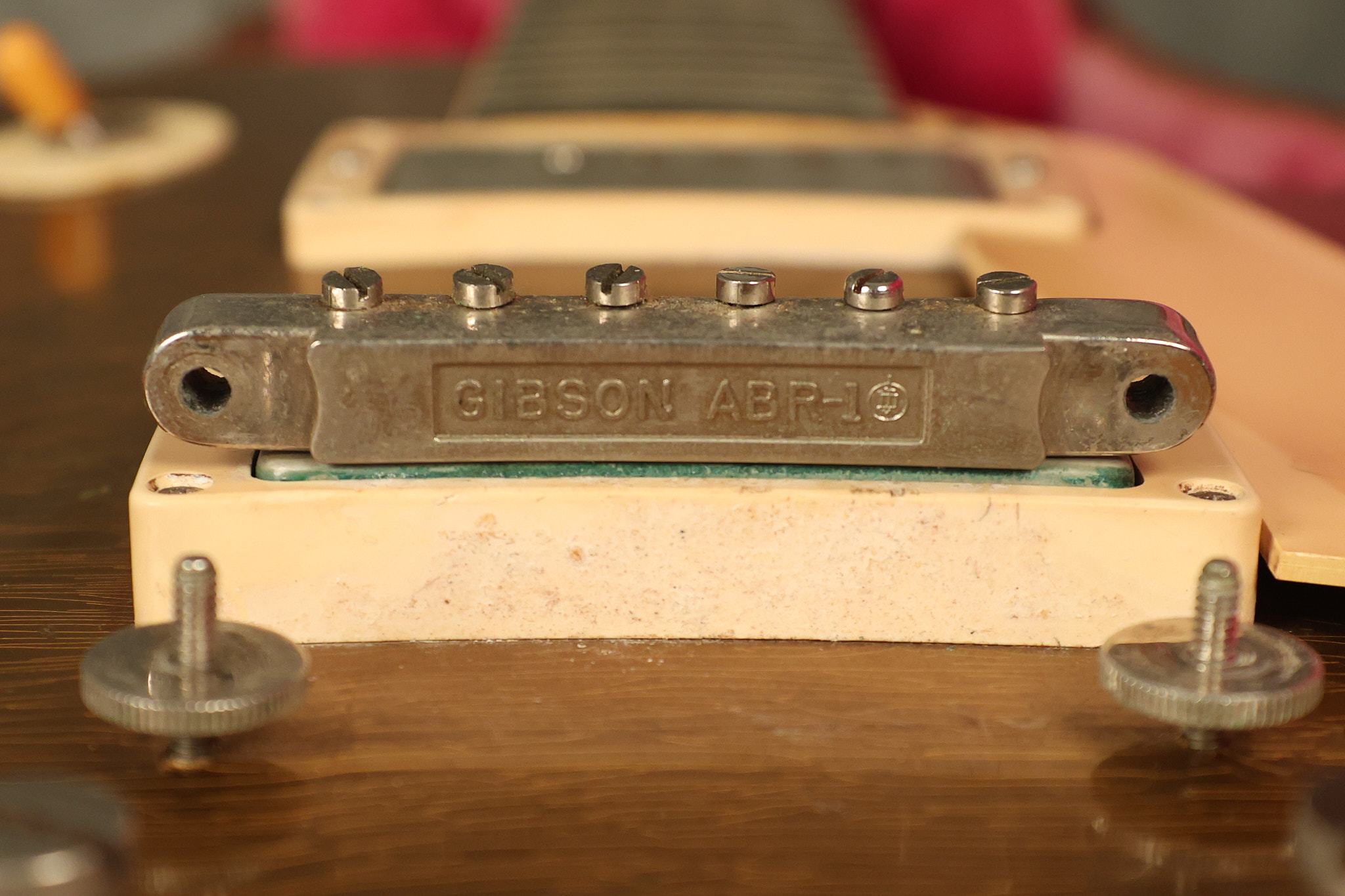 1957 Gibson Les Paul Goldtop in its original Gold top and dark back finish. It has a good playing neck with good frets. It's all original with the exception of one of  the bridge saddles and its screw (the A string saddle). It is also 100% complete along with its original hardshell case. This Les Paul looks great with lots of nicks + dings, finish checking, belt buckle wear, cracked plastic jack plate and other cosmetic wear. The guitar itself remains structurally sound with no cracks, breaks or repairs. As for the electronics, a repair was made on one coil of the bridge position pickup. It was not rewound, but had a connection break in the coil near the surface of the coil winding which has been reattached. All electronics work and sound great with its original set of PAF pickups. The weight is 8 lbs. 12 oz.