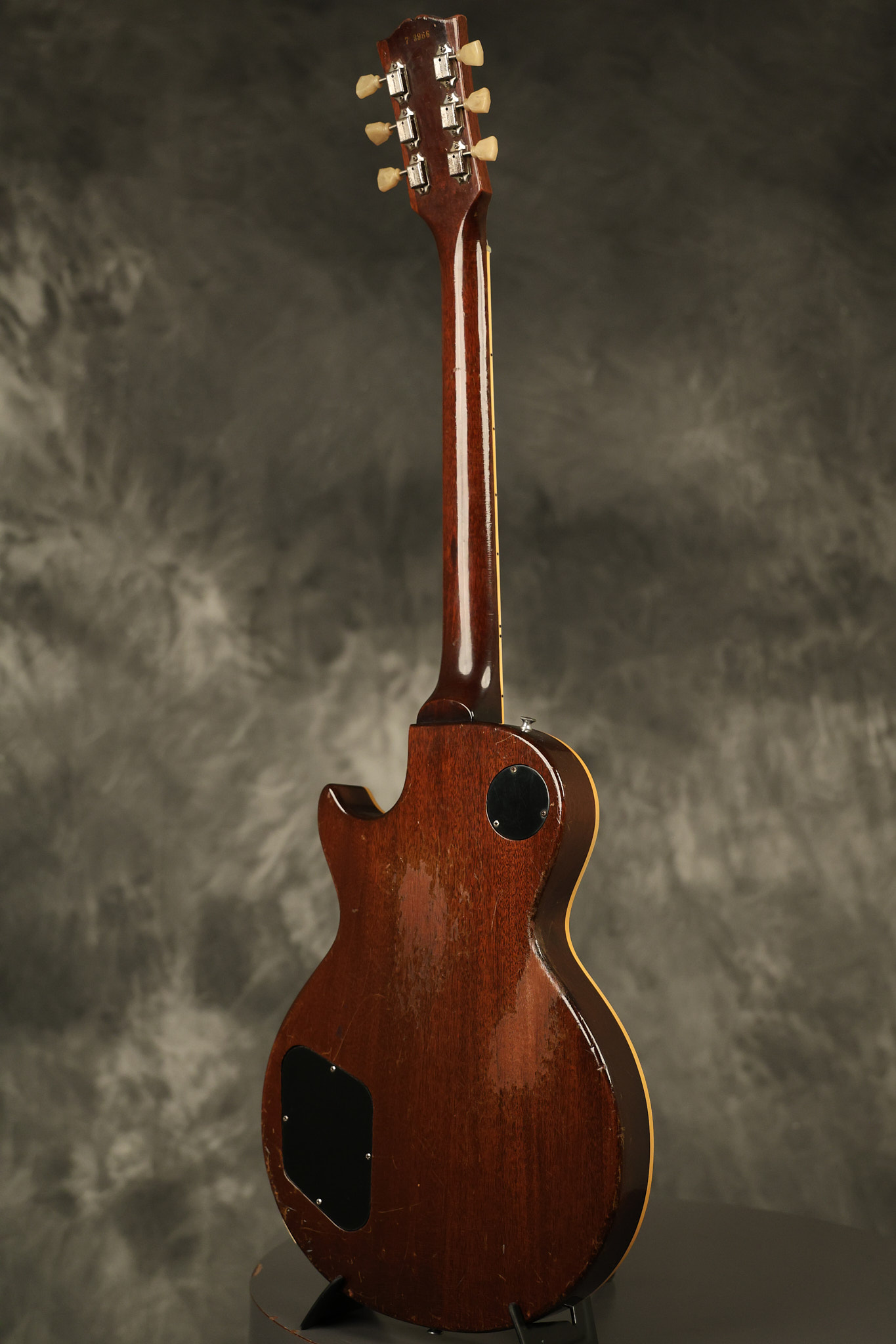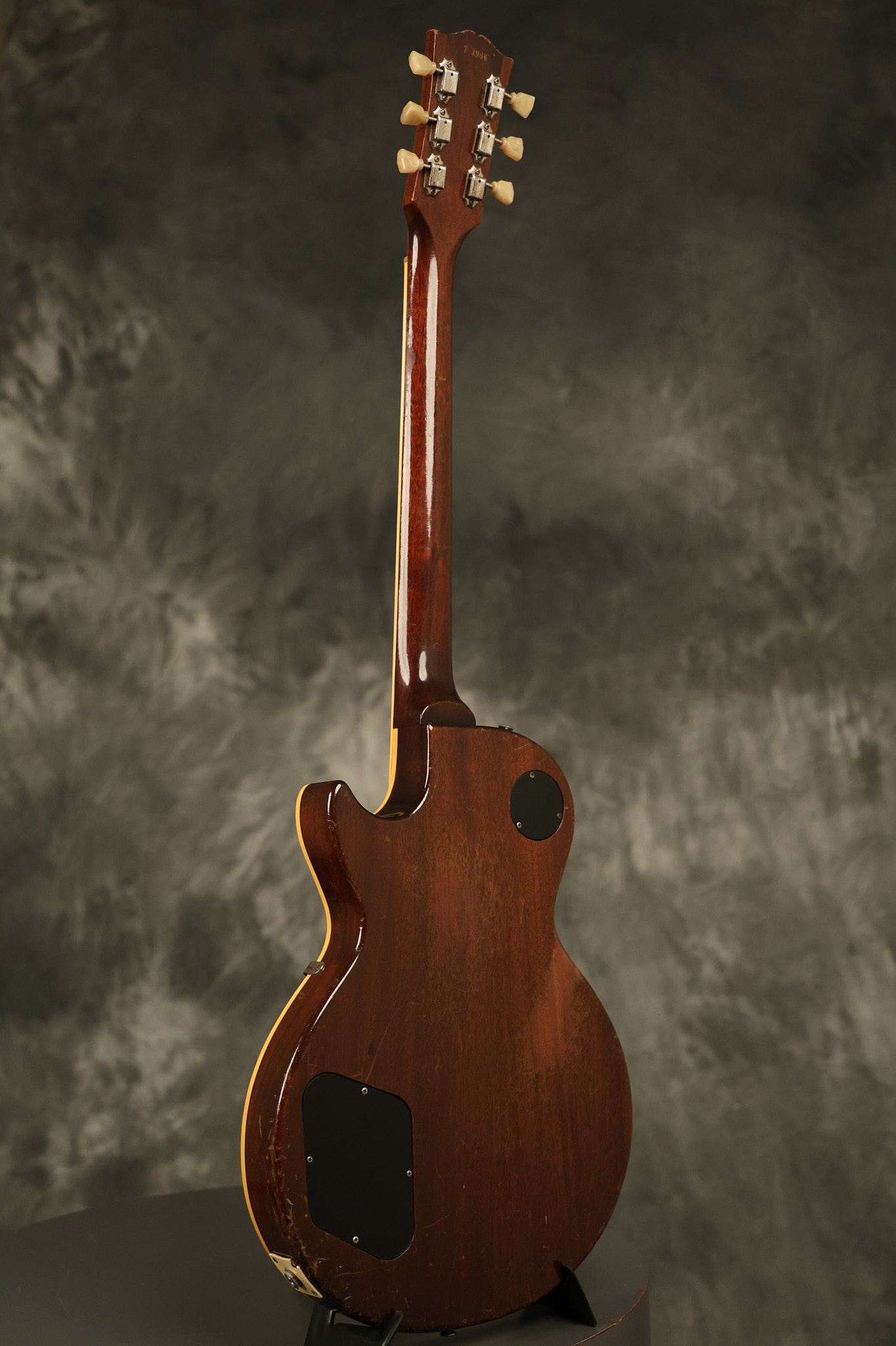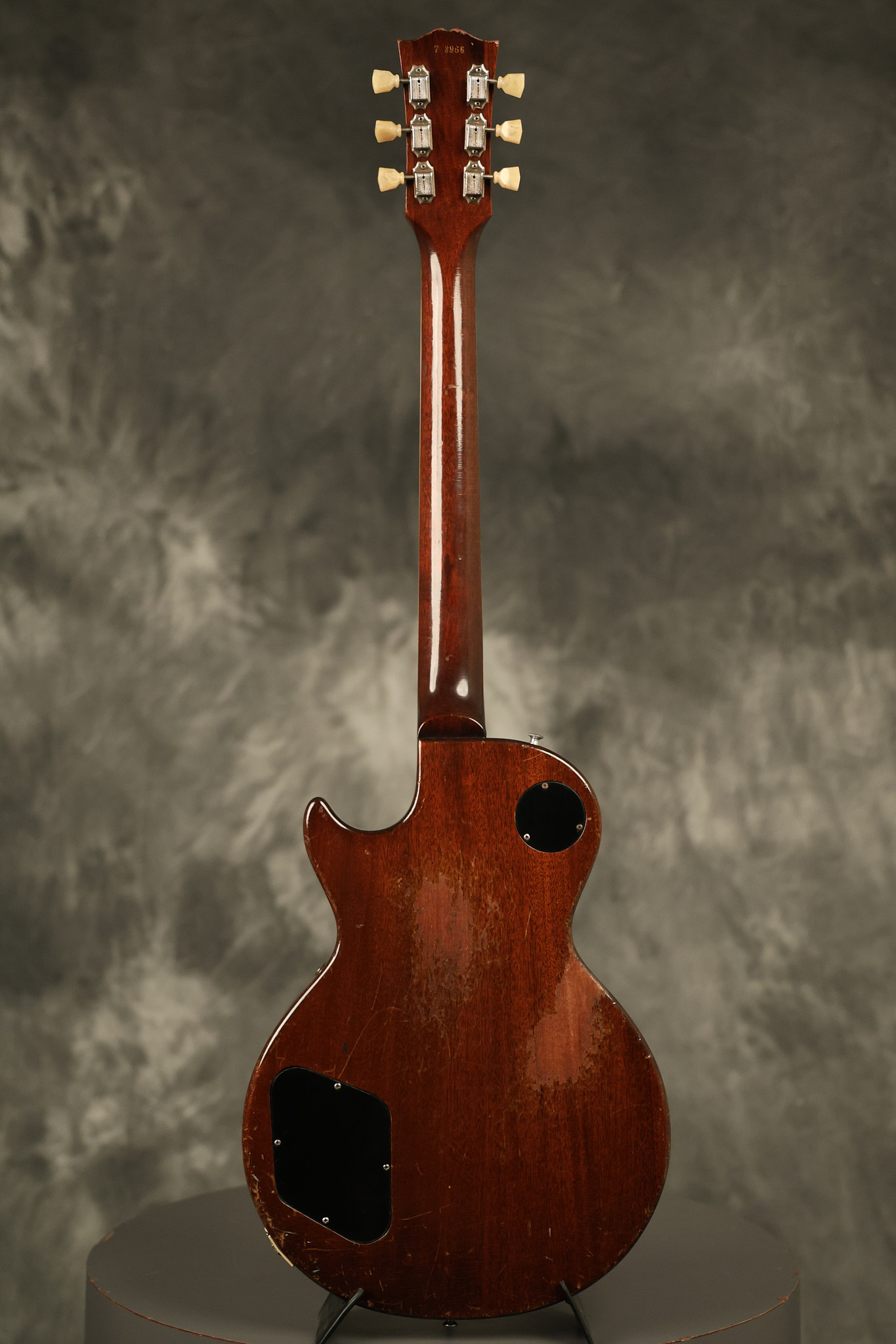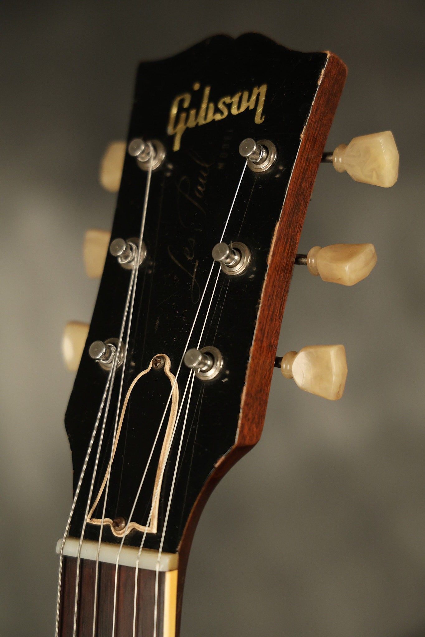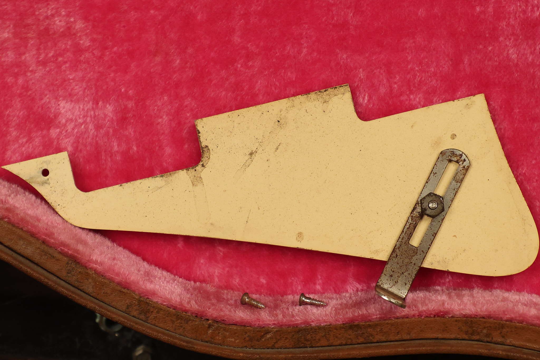 1957 Gibson Les Paul Goldtop in its original Gold top and dark back finish. It has a good playing neck with good frets. It's all original with the exception of one of  the bridge saddles and its screw (the A string saddle). It is also 100% complete along with its original hardshell case. This Les Paul looks great with lots of nicks + dings, finish checking, belt buckle wear, cracked plastic jack plate and other cosmetic wear. The guitar itself remains structurally sound with no cracks, breaks or repairs. As for the electronics, a repair was made on one coil of the bridge position pickup. It was not rewound, but had a connection break in the coil near the surface of the coil winding which has been reattached. All electronics work and sound great with its original set of PAF pickups. The weight is 8 lbs. 12 oz.