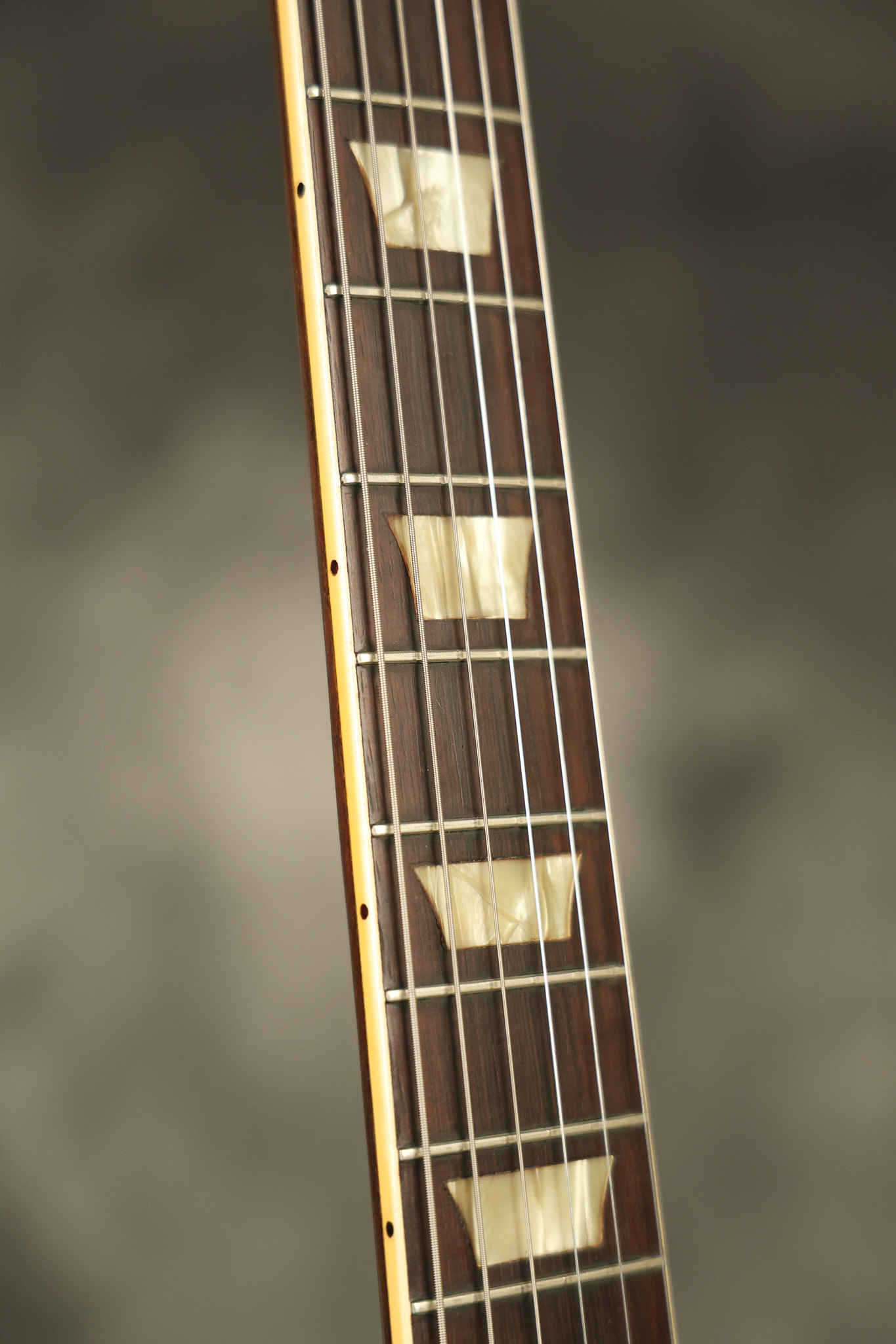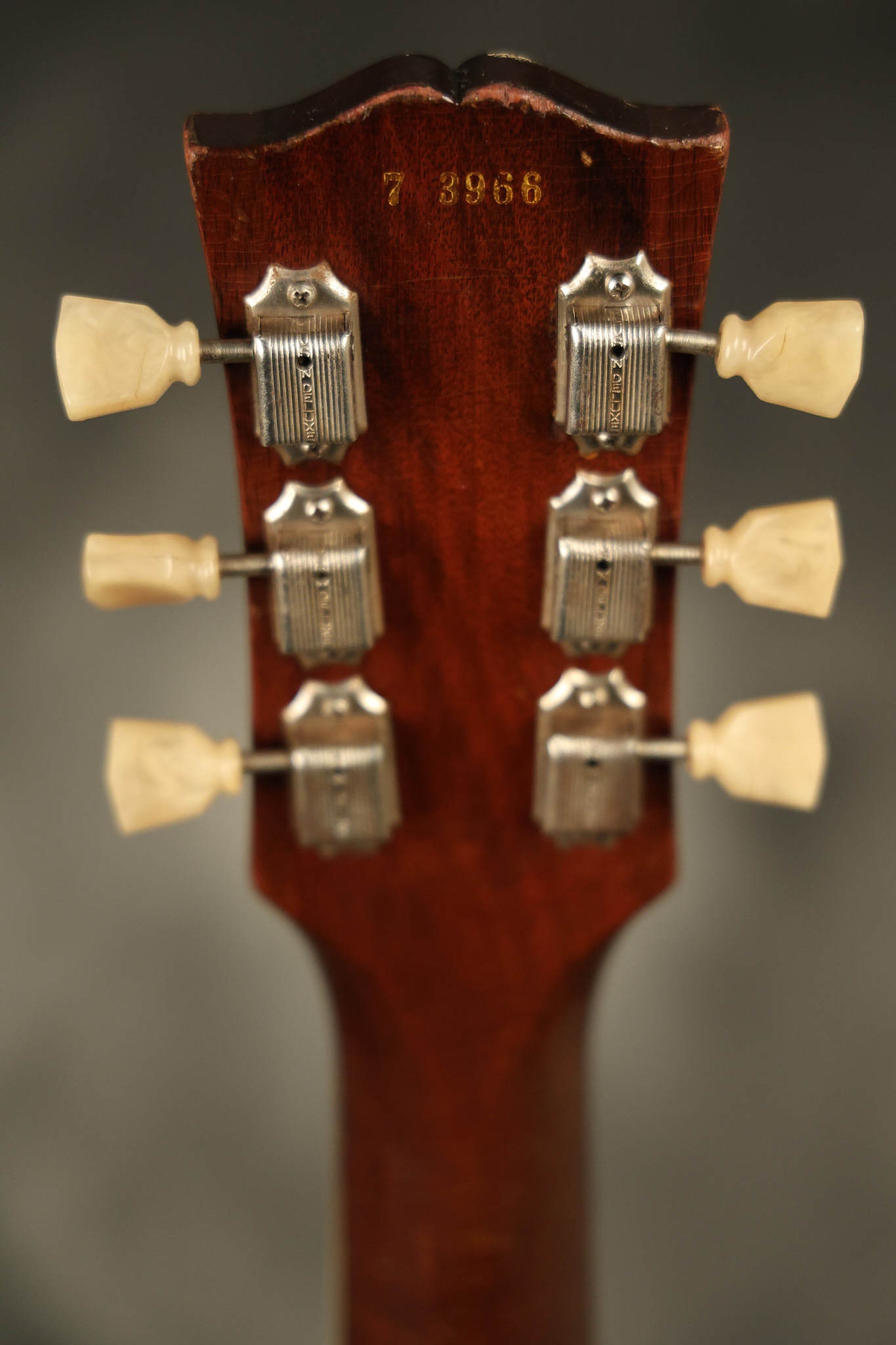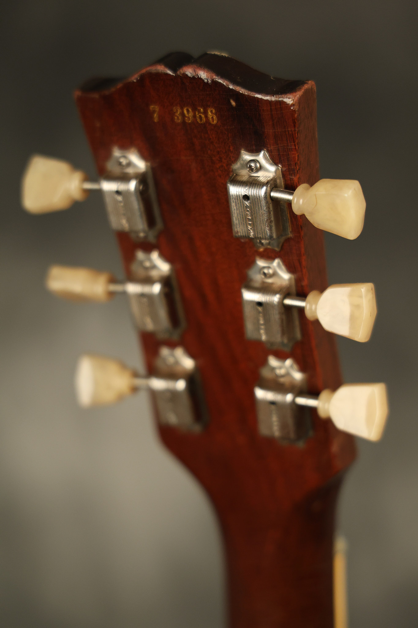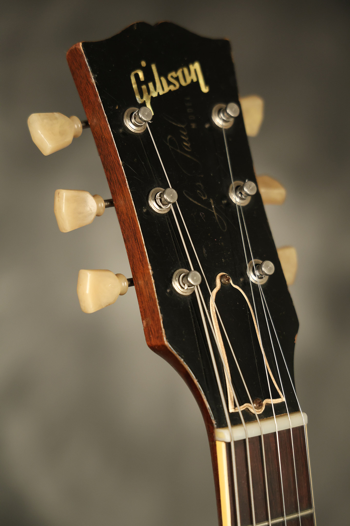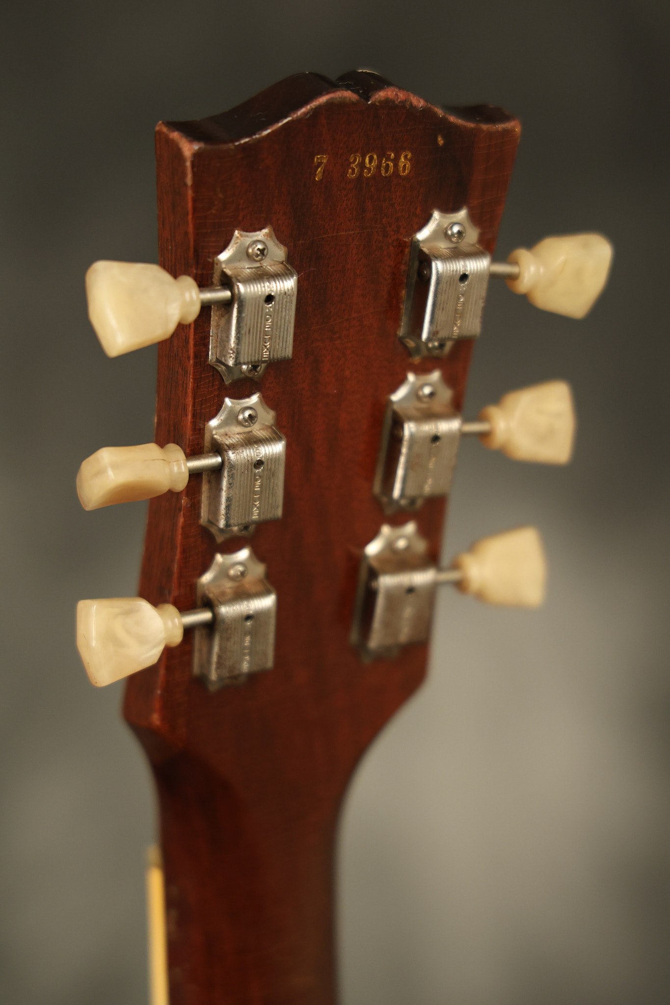 1957 Gibson Les Paul Goldtop in its original Gold top and dark back finish. It has a good playing neck with good frets. It's all original with the exception of one of  the bridge saddles and its screw (the A string saddle). It is also 100% complete along with its original hardshell case. This Les Paul looks great with lots of nicks + dings, finish checking, belt buckle wear, cracked plastic jack plate and other cosmetic wear. The guitar itself remains structurally sound with no cracks, breaks or repairs. As for the electronics, a repair was made on one coil of the bridge position pickup. It was not rewound, but had a connection break in the coil near the surface of the coil winding which has been reattached. All electronics work and sound great with its original set of PAF pickups. The weight is 8 lbs. 12 oz.