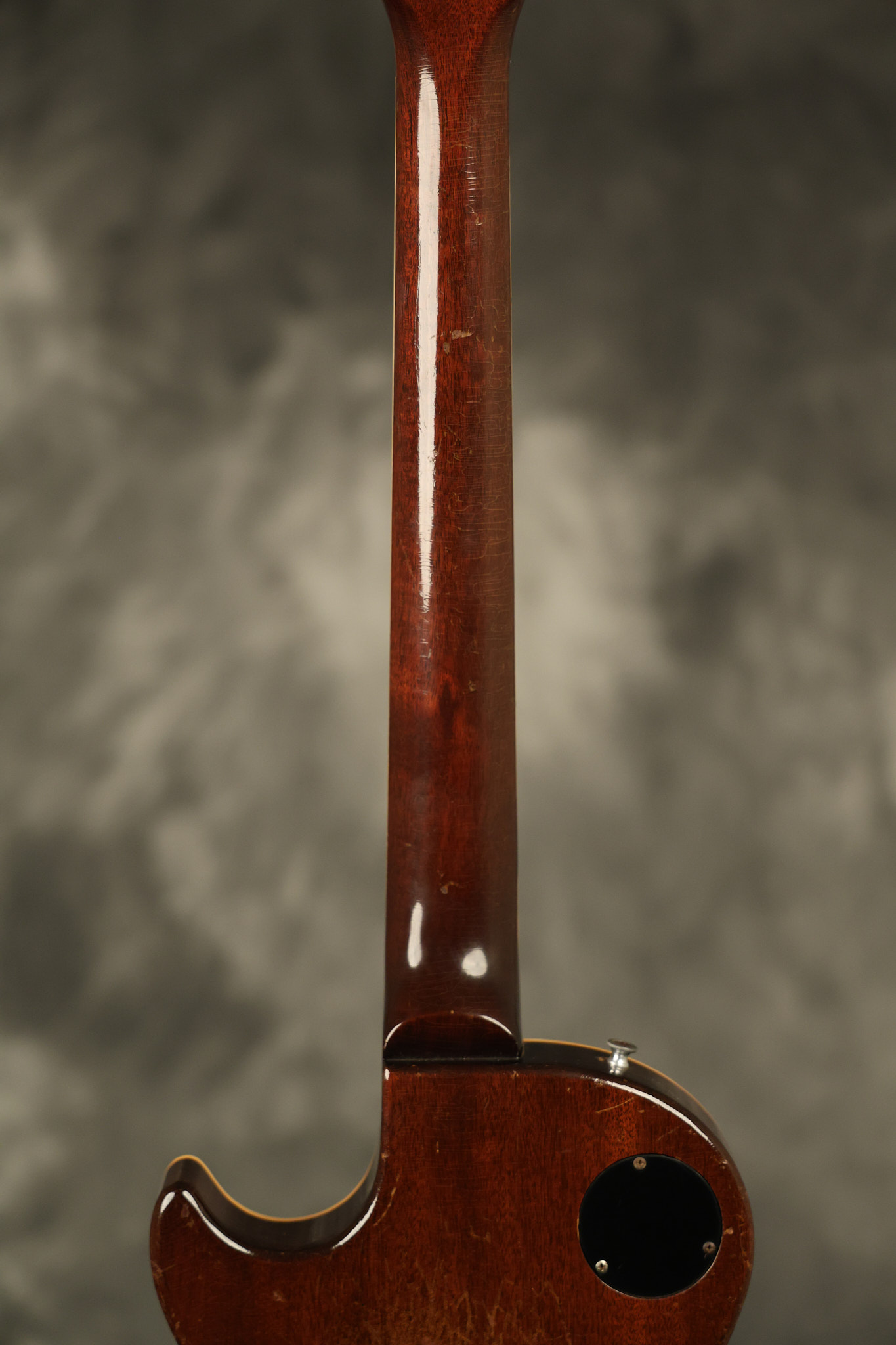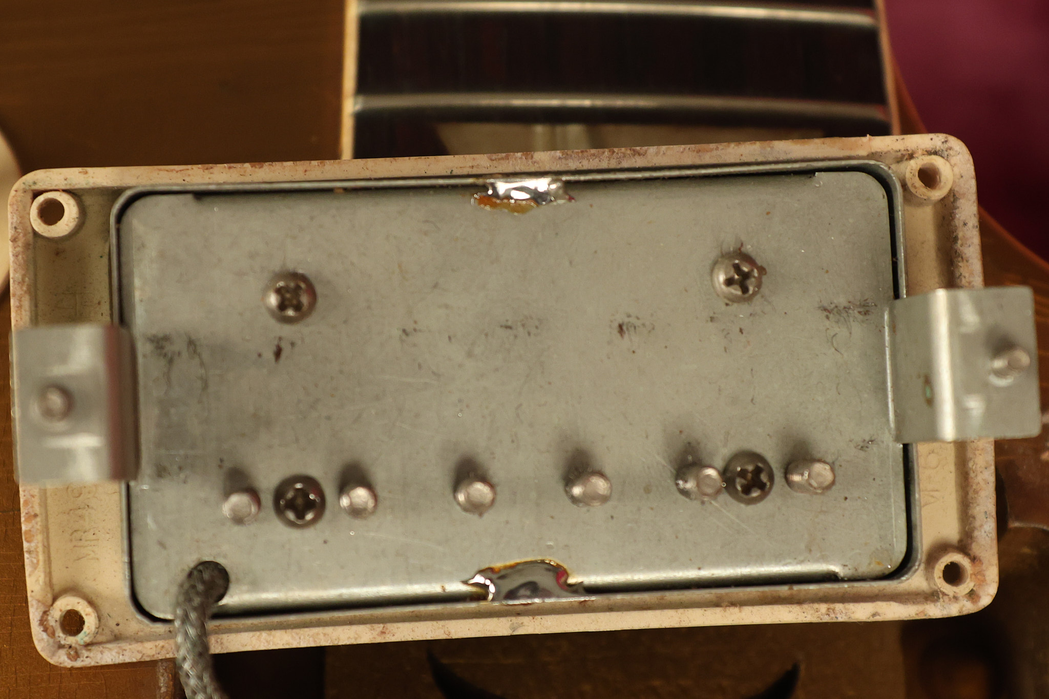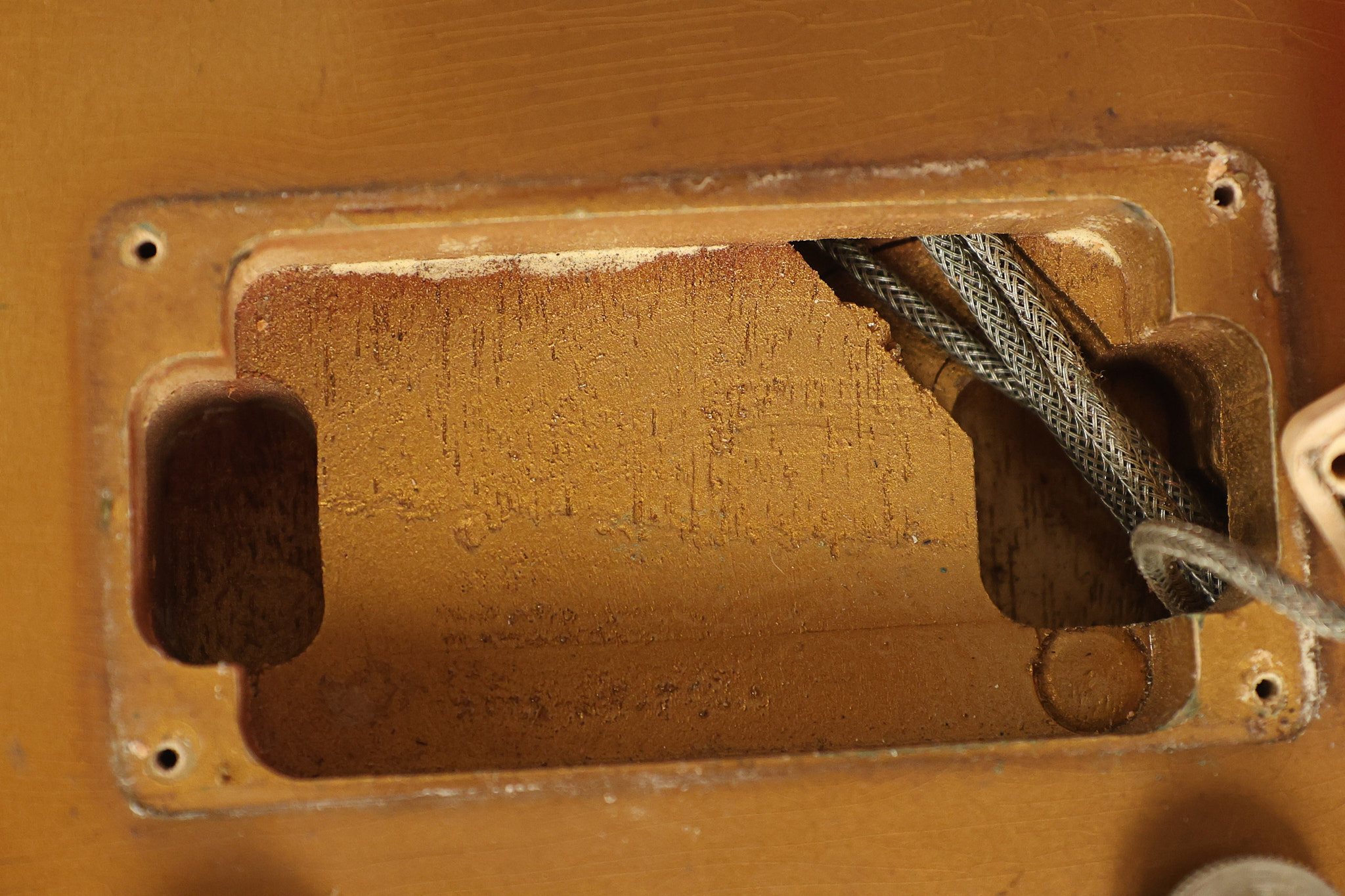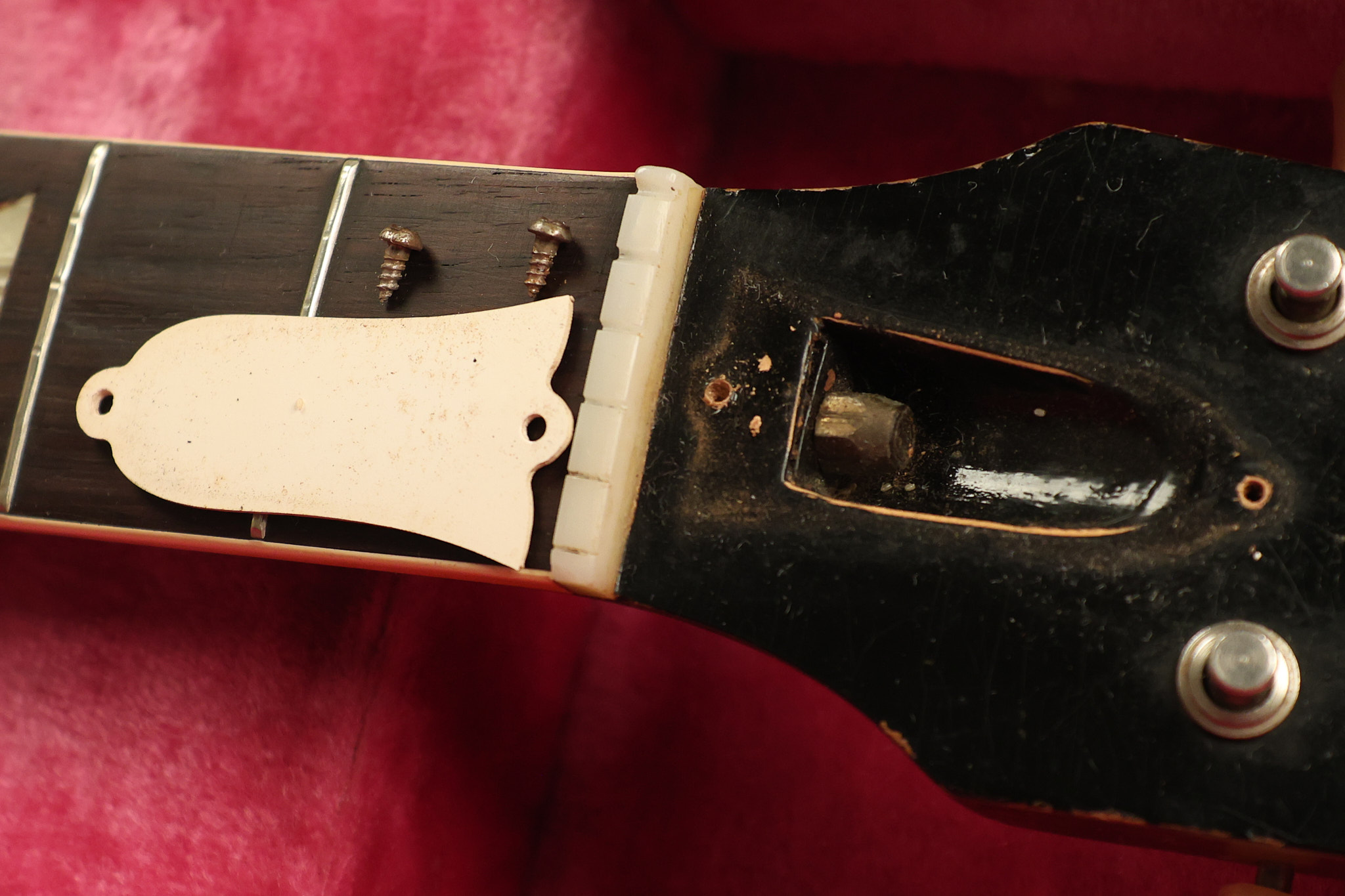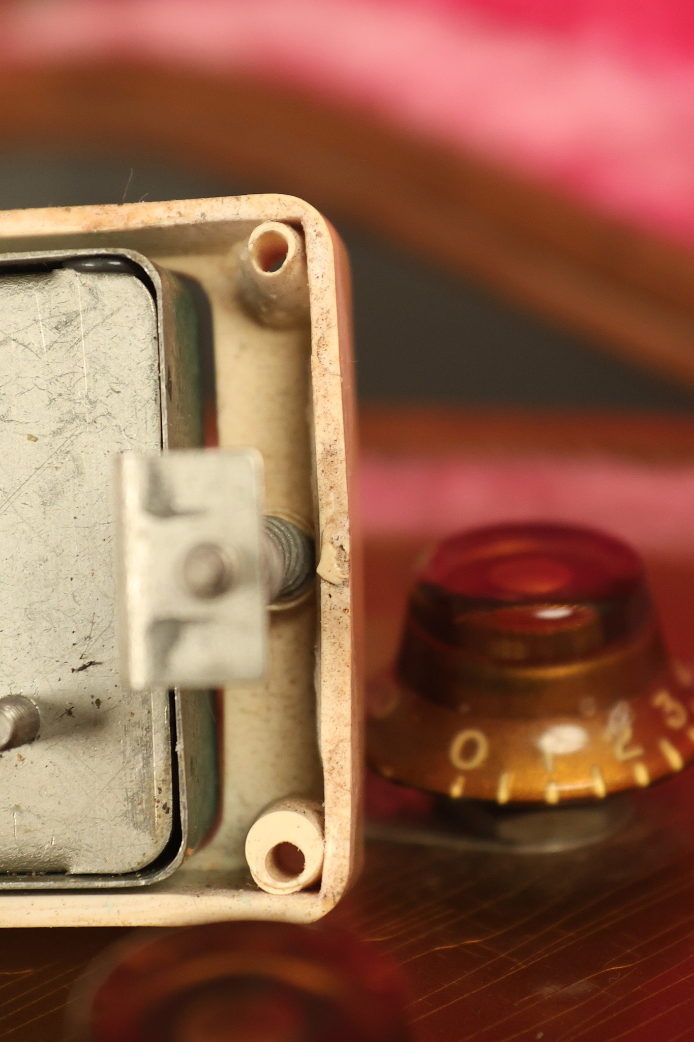 1957 Gibson Les Paul Goldtop in its original Gold top and dark back finish. It has a good playing neck with good frets. It's all original with the exception of one of  the bridge saddles and its screw (the A string saddle). It is also 100% complete along with its original hardshell case. This Les Paul looks great with lots of nicks + dings, finish checking, belt buckle wear, cracked plastic jack plate and other cosmetic wear. The guitar itself remains structurally sound with no cracks, breaks or repairs. As for the electronics, a repair was made on one coil of the bridge position pickup. It was not rewound, but had a connection break in the coil near the surface of the coil winding which has been reattached. All electronics work and sound great with its original set of PAF pickups. The weight is 8 lbs. 12 oz.