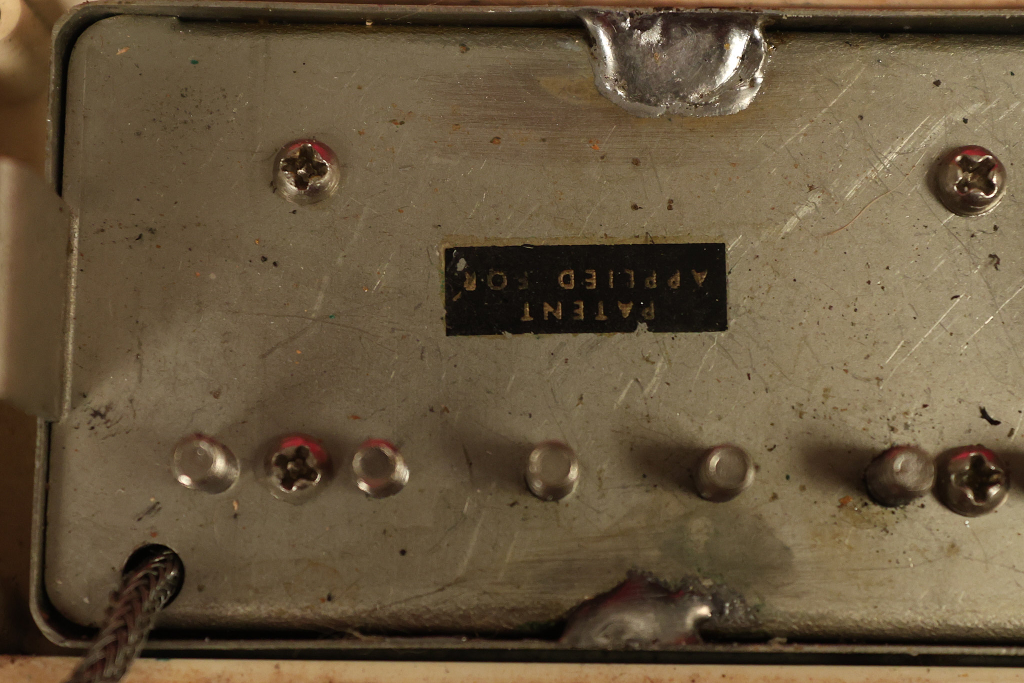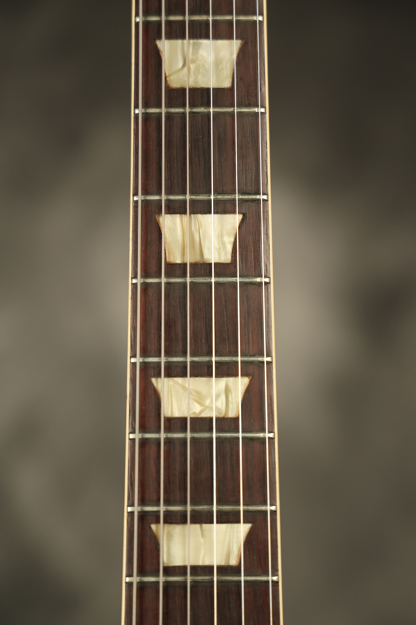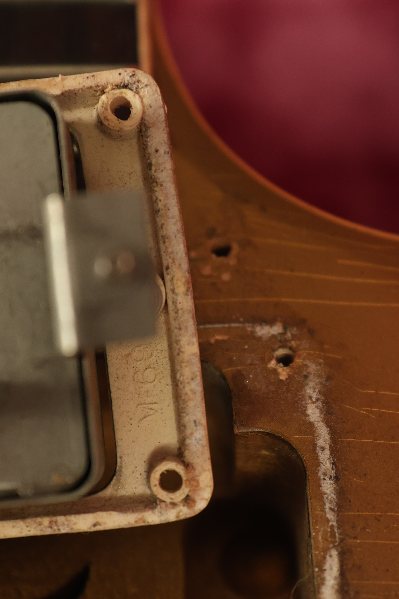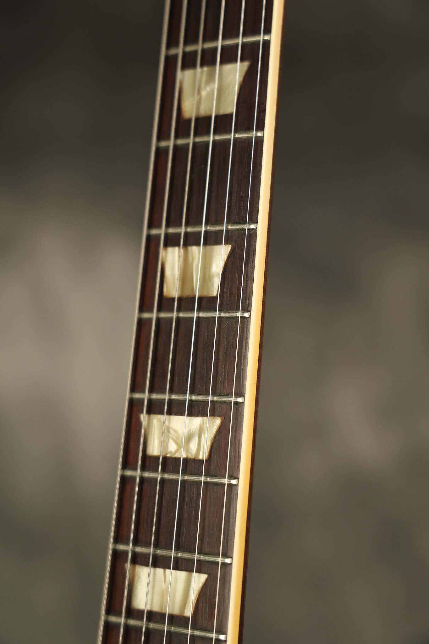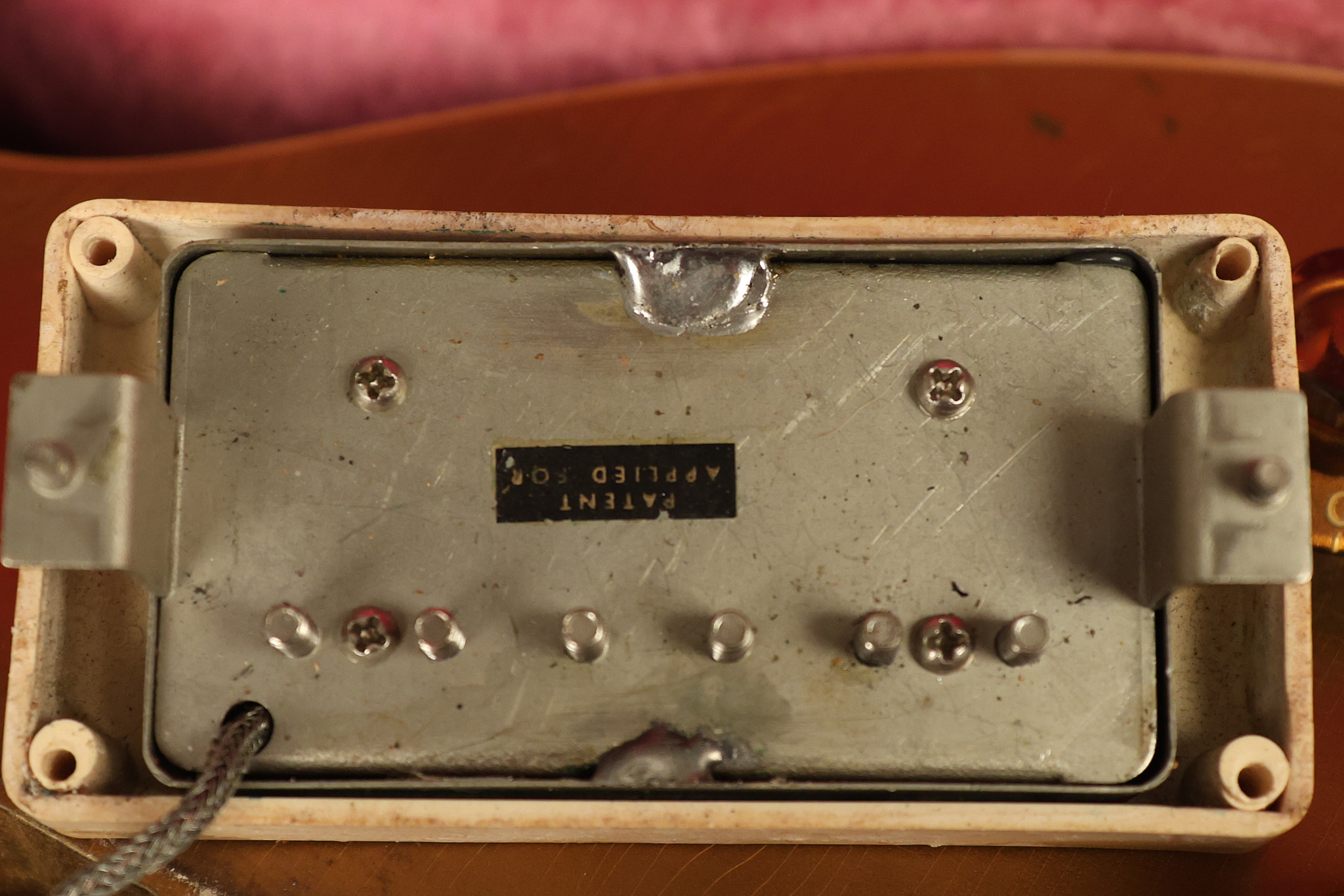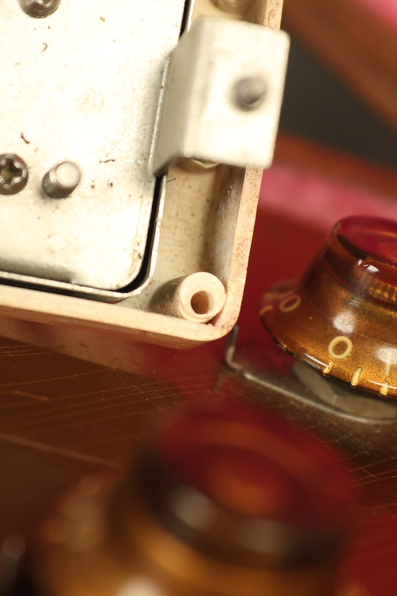 1957 Gibson Les Paul Goldtop in its original Gold top and dark back finish. It has a good playing neck with good frets. It's all original with the exception of one of  the bridge saddles and its screw (the A string saddle). It is also 100% complete along with its original hardshell case. This Les Paul looks great with lots of nicks + dings, finish checking, belt buckle wear, cracked plastic jack plate and other cosmetic wear. The guitar itself remains structurally sound with no cracks, breaks or repairs. As for the electronics, a repair was made on one coil of the bridge position pickup. It was not rewound, but had a connection break in the coil near the surface of the coil winding which has been reattached. All electronics work and sound great with its original set of PAF pickups. The weight is 8 lbs. 12 oz.