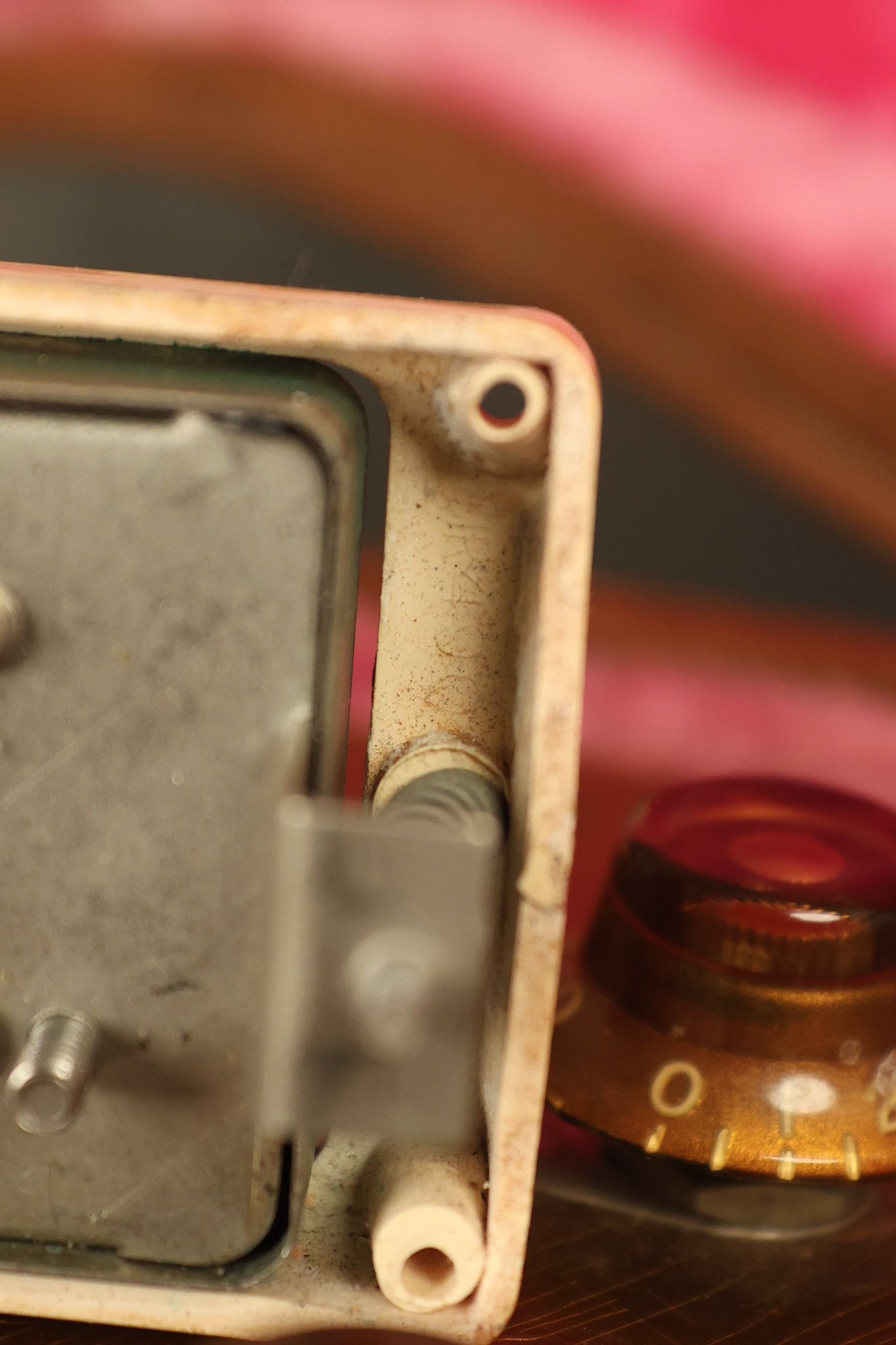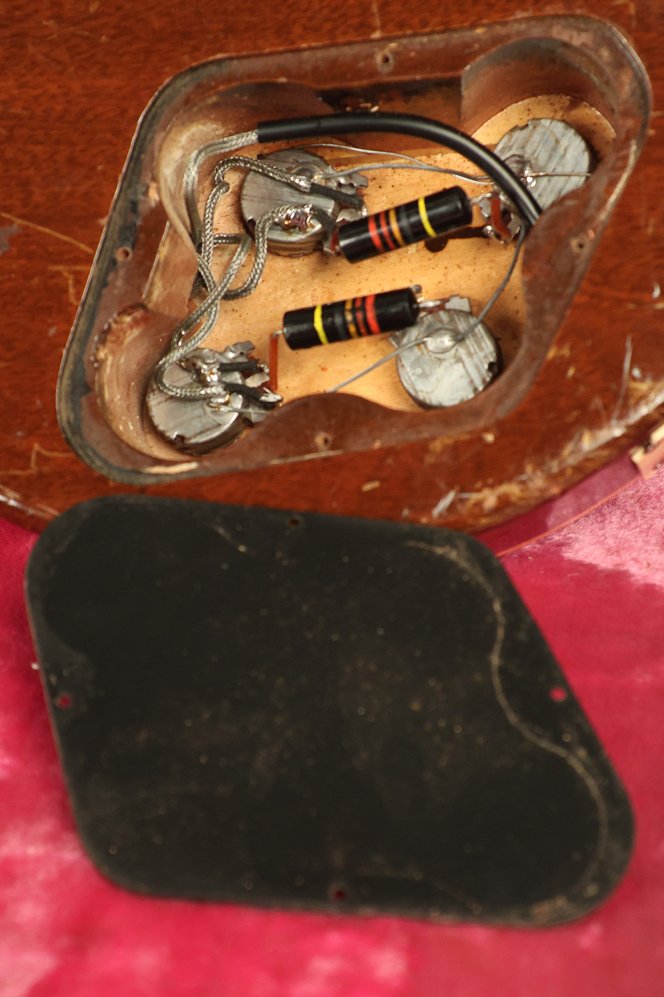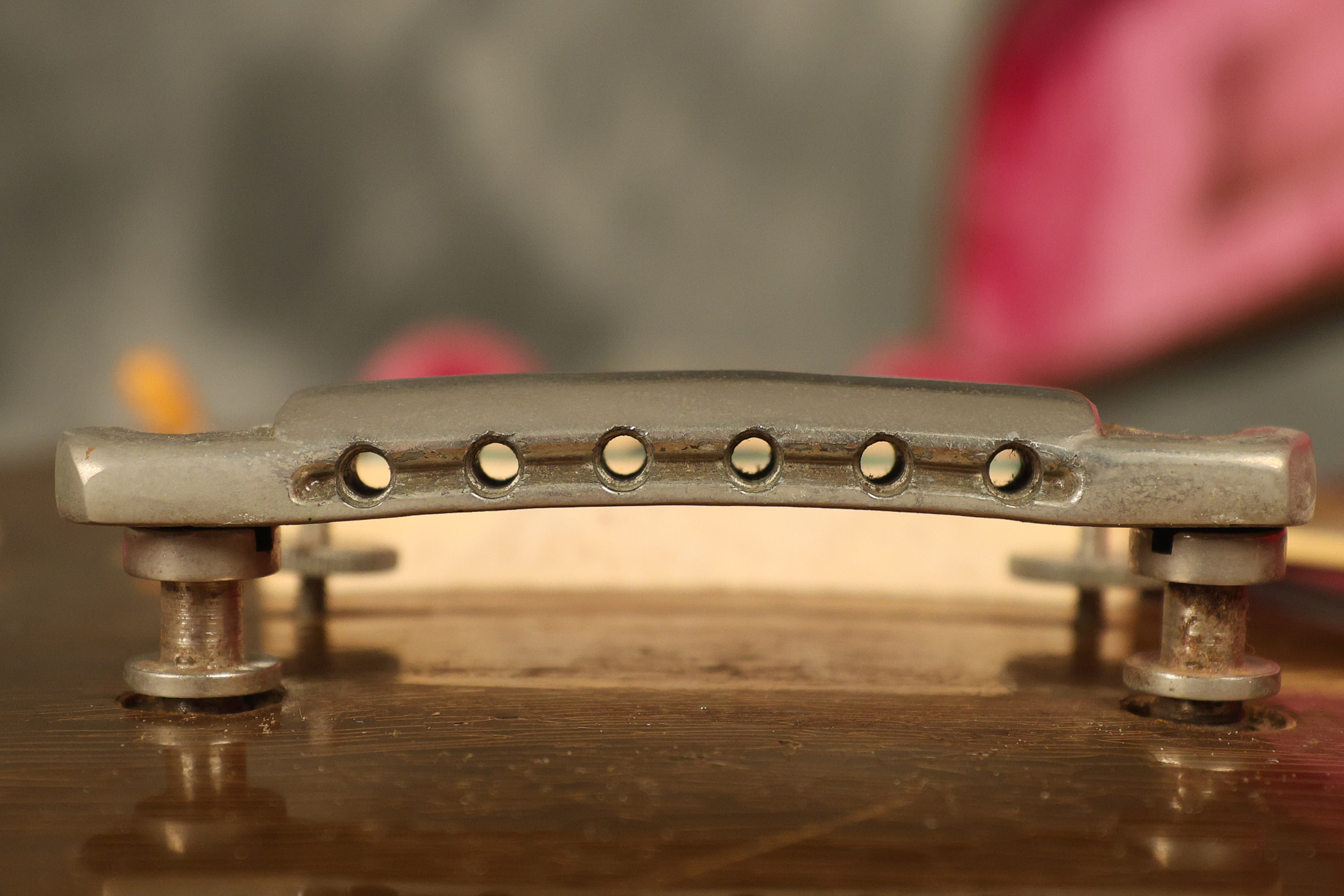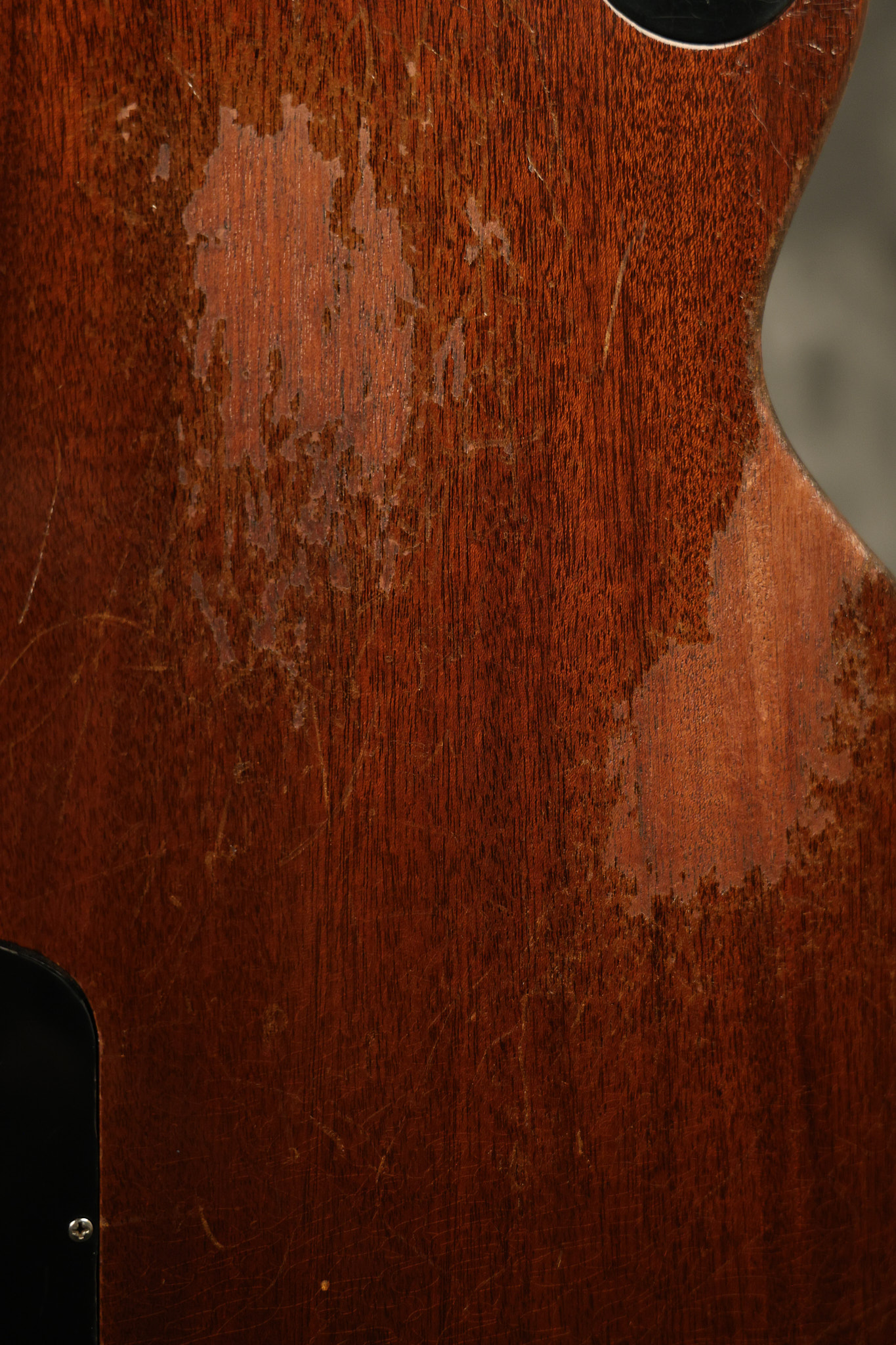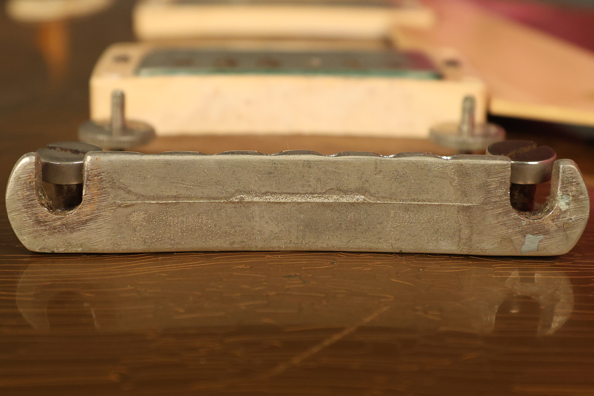 1957 Gibson Les Paul Goldtop in its original Gold top and dark back finish. It has a good playing neck with good frets. It's all original with the exception of one of  the bridge saddles and its screw (the A string saddle). It is also 100% complete along with its original hardshell case. This Les Paul looks great with lots of nicks + dings, finish checking, belt buckle wear, cracked plastic jack plate and other cosmetic wear. The guitar itself remains structurally sound with no cracks, breaks or repairs. As for the electronics, a repair was made on one coil of the bridge position pickup. It was not rewound, but had a connection break in the coil near the surface of the coil winding which has been reattached. All electronics work and sound great with its original set of PAF pickups. The weight is 8 lbs. 12 oz.