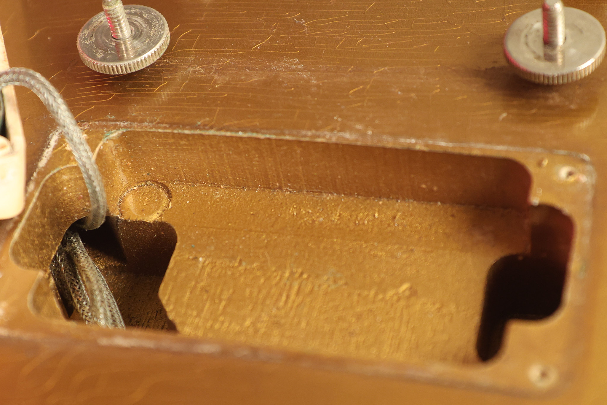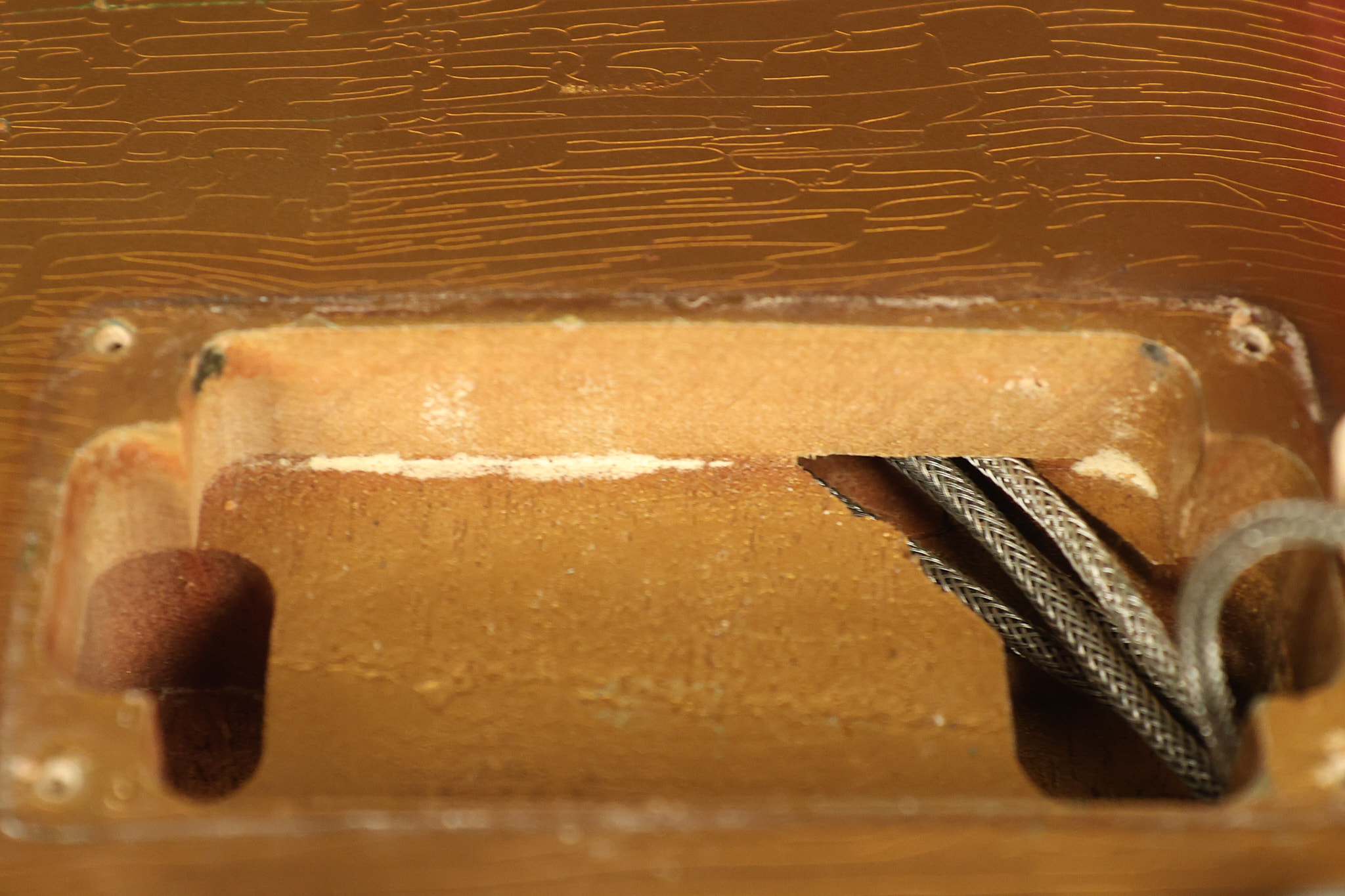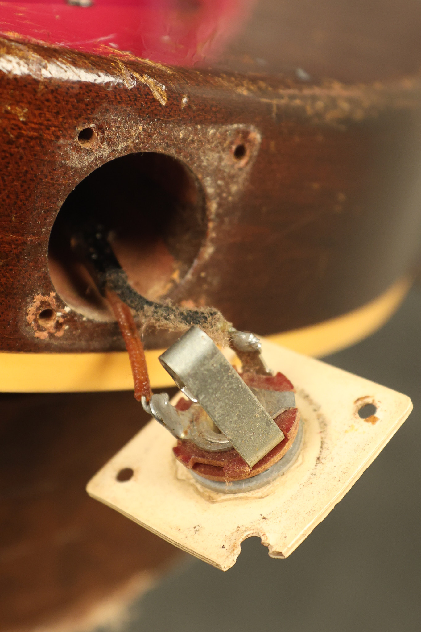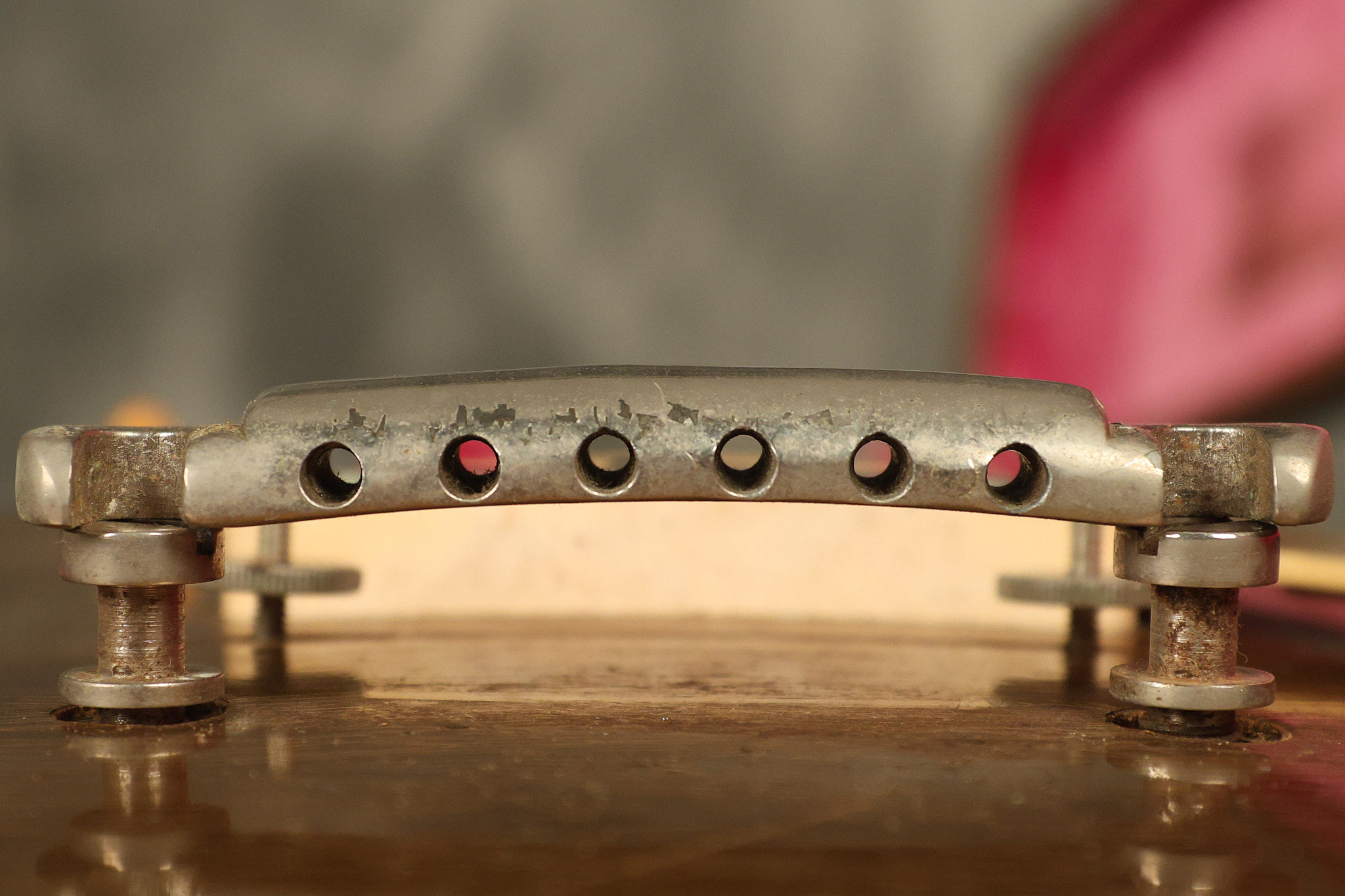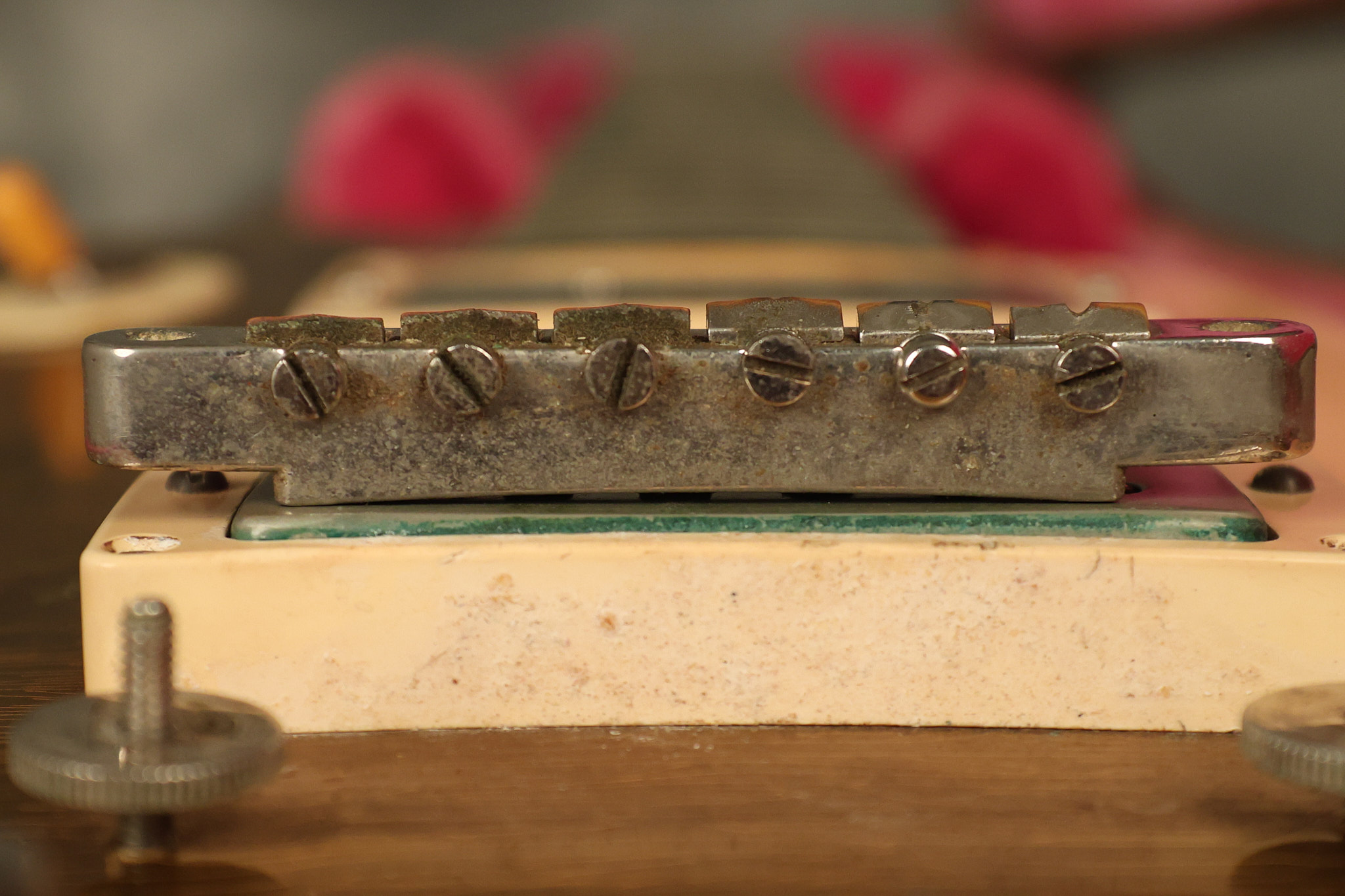 1957 Gibson Les Paul Goldtop in its original Gold top and dark back finish. It has a good playing neck with good frets. It's all original with the exception of one of  the bridge saddles and its screw (the A string saddle). It is also 100% complete along with its original hardshell case. This Les Paul looks great with lots of nicks + dings, finish checking, belt buckle wear, cracked plastic jack plate and other cosmetic wear. The guitar itself remains structurally sound with no cracks, breaks or repairs. As for the electronics, a repair was made on one coil of the bridge position pickup. It was not rewound, but had a connection break in the coil near the surface of the coil winding which has been reattached. All electronics work and sound great with its original set of PAF pickups. The weight is 8 lbs. 12 oz.