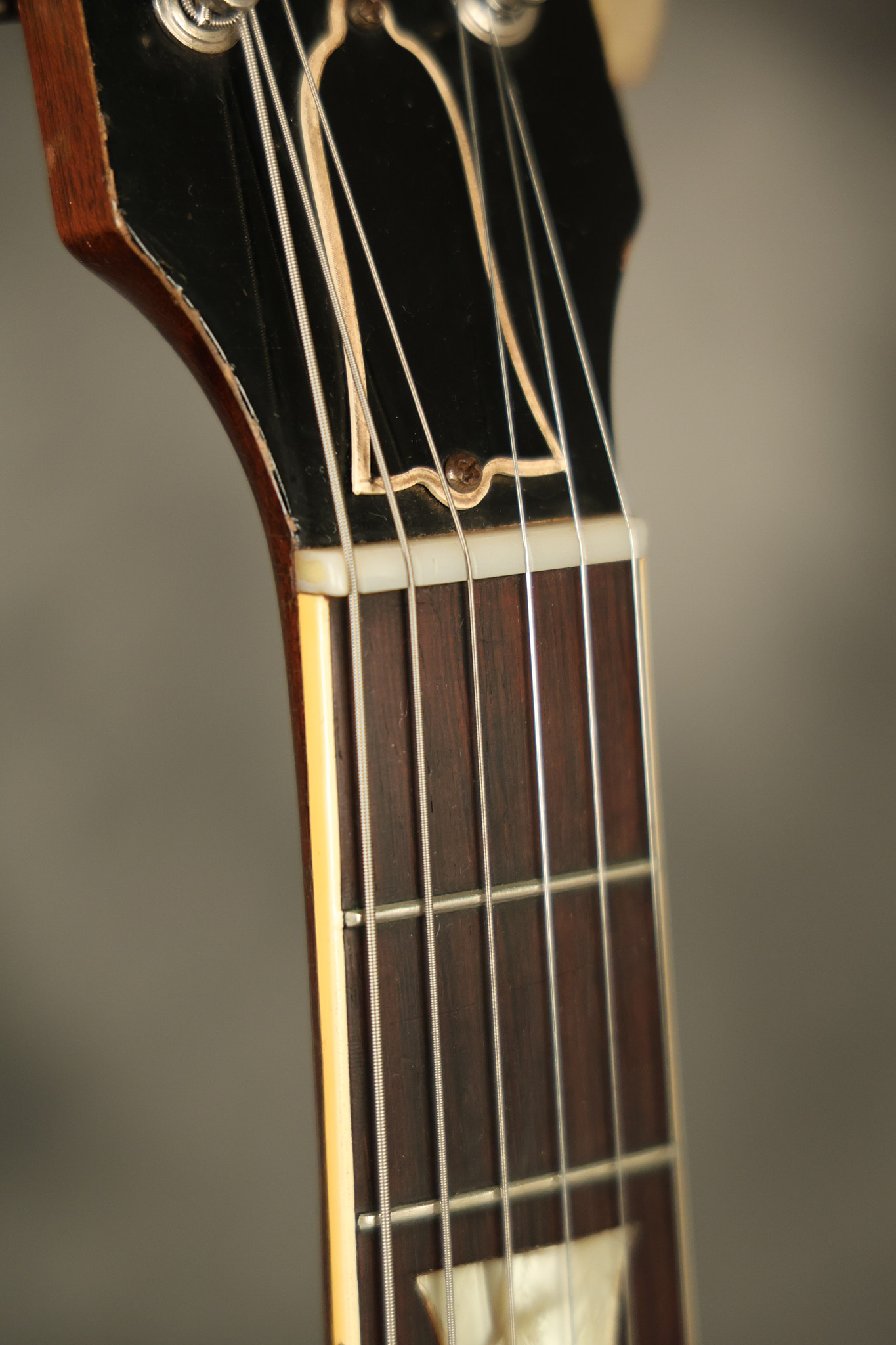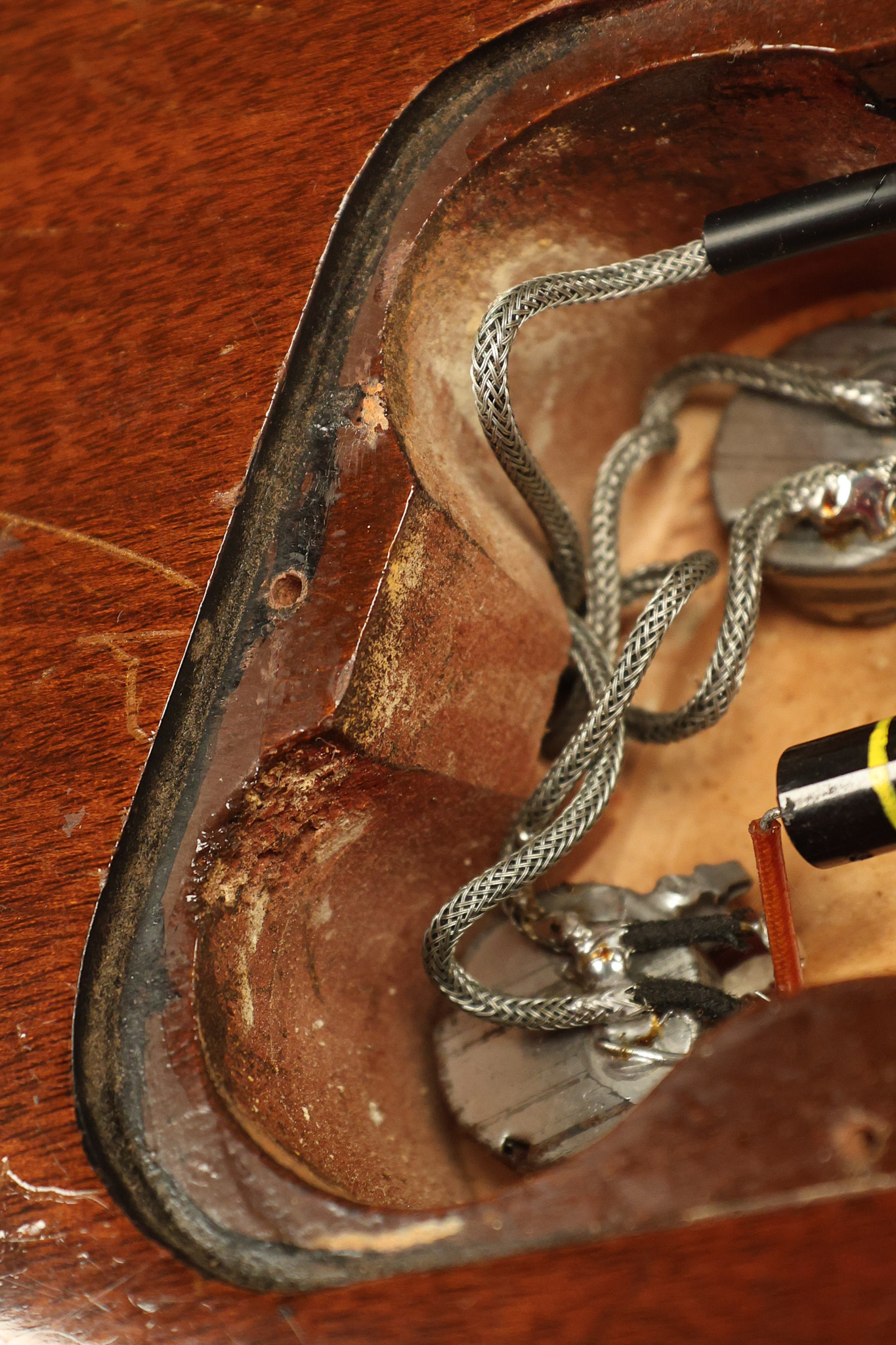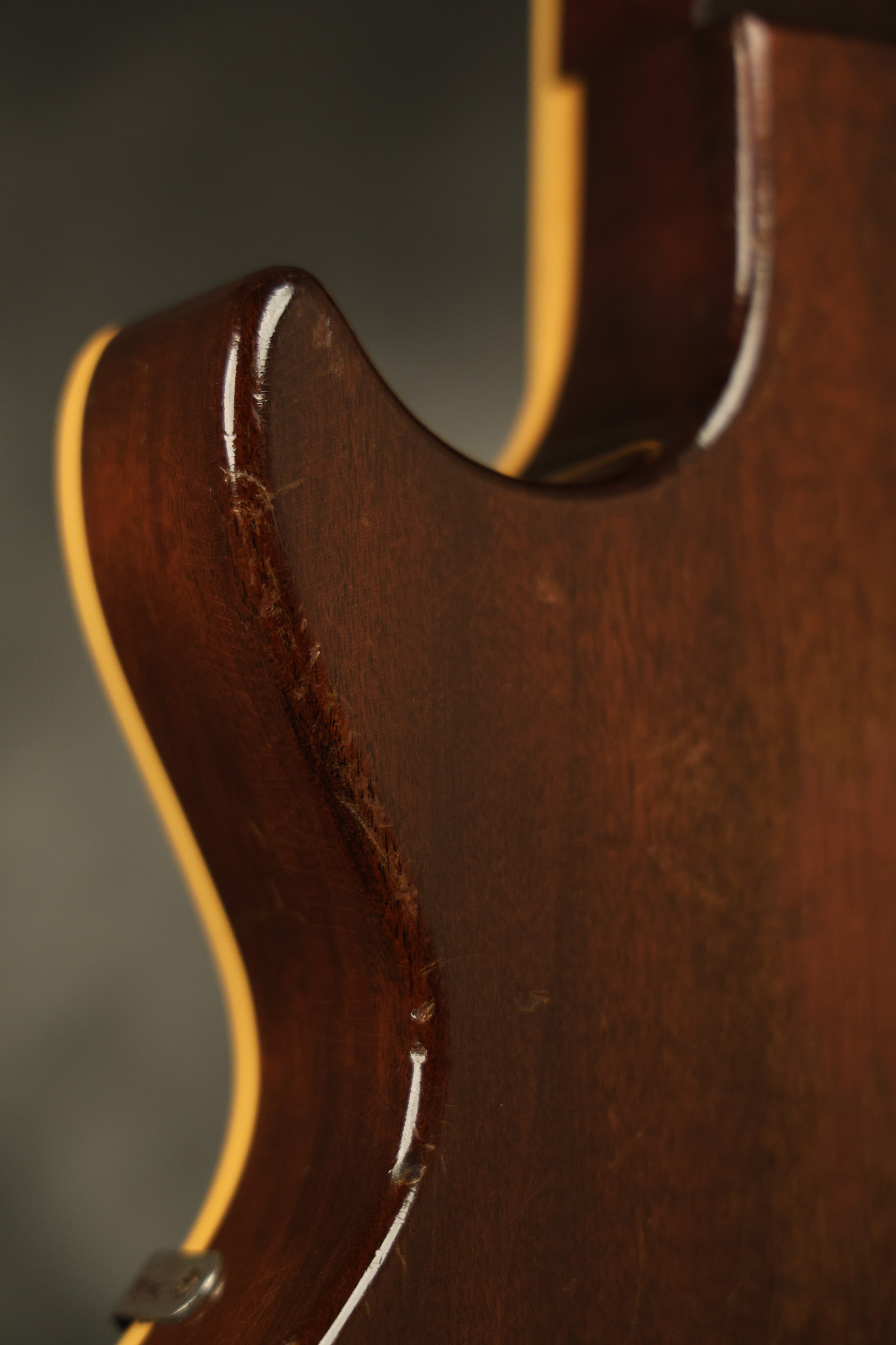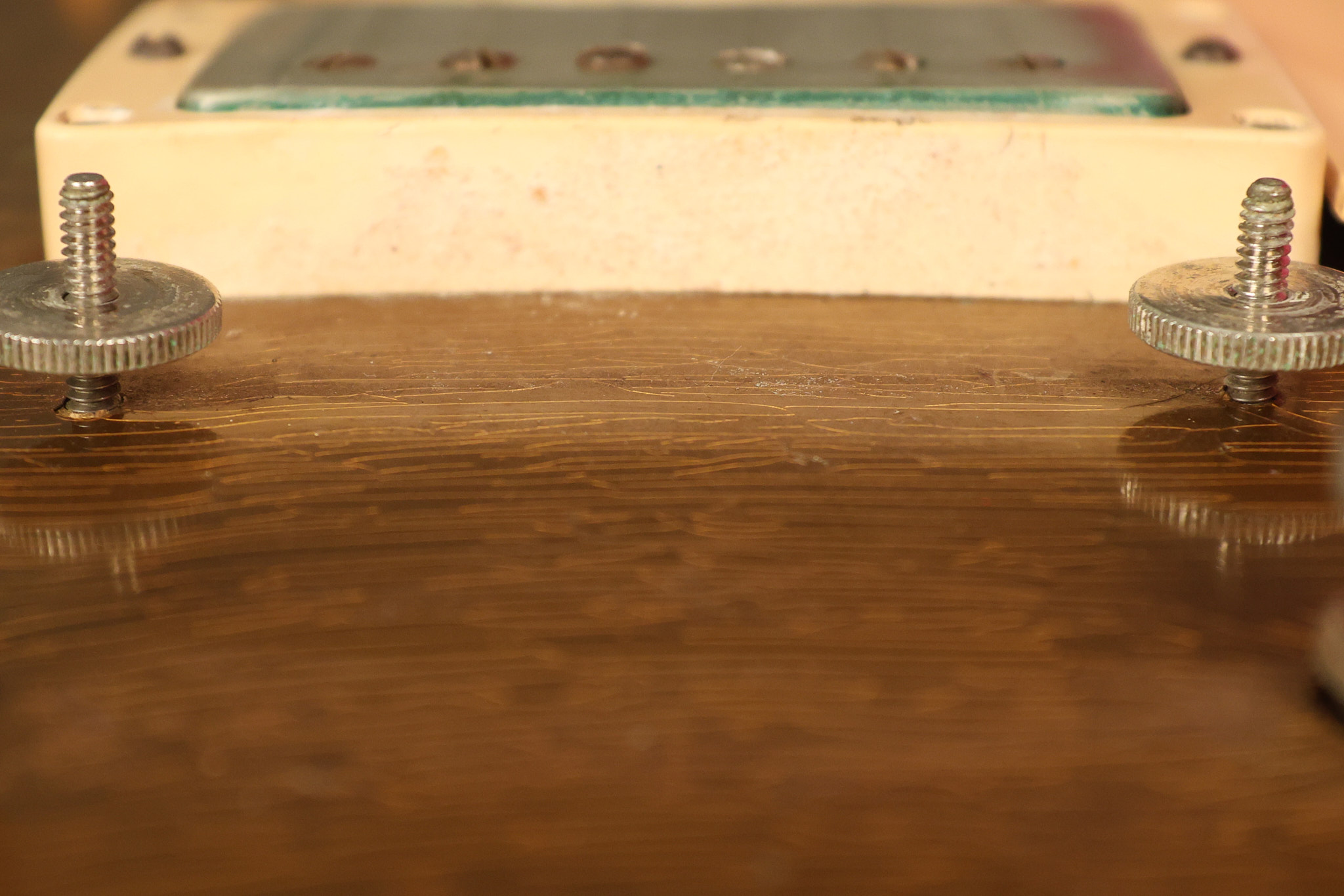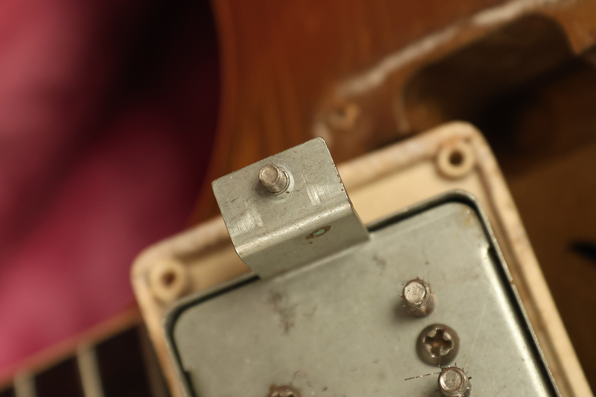 1957 Gibson Les Paul Goldtop in its original Gold top and dark back finish. It has a good playing neck with good frets. It's all original with the exception of one of  the bridge saddles and its screw (the A string saddle). It is also 100% complete along with its original hardshell case. This Les Paul looks great with lots of nicks + dings, finish checking, belt buckle wear, cracked plastic jack plate and other cosmetic wear. The guitar itself remains structurally sound with no cracks, breaks or repairs. As for the electronics, a repair was made on one coil of the bridge position pickup. It was not rewound, but had a connection break in the coil near the surface of the coil winding which has been reattached. All electronics work and sound great with its original set of PAF pickups. The weight is 8 lbs. 12 oz.