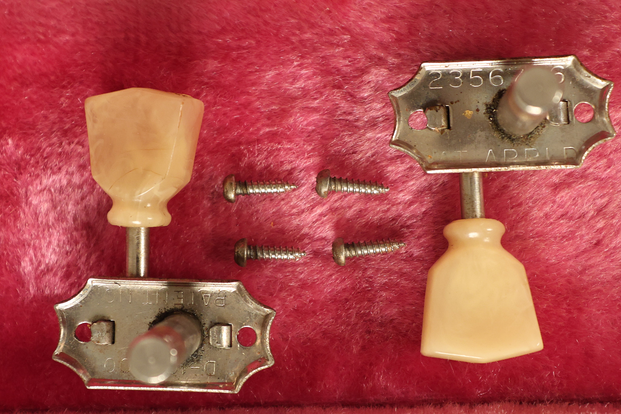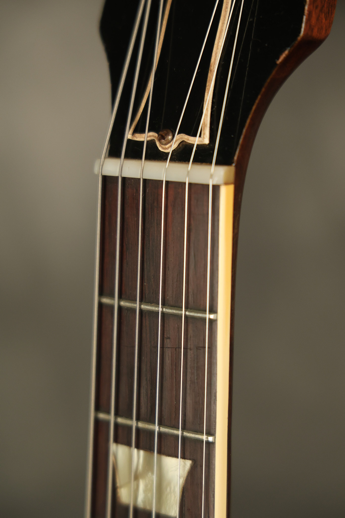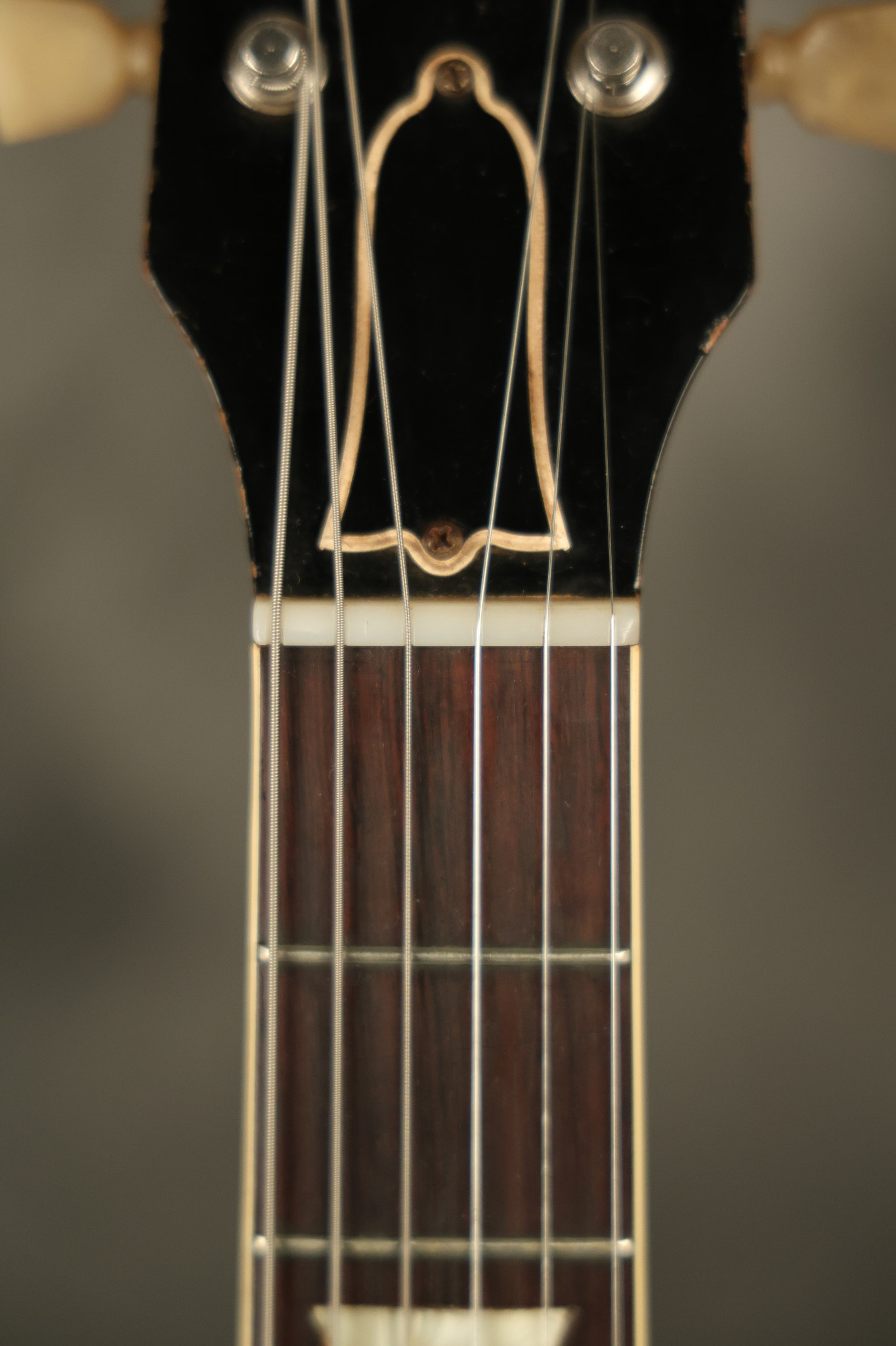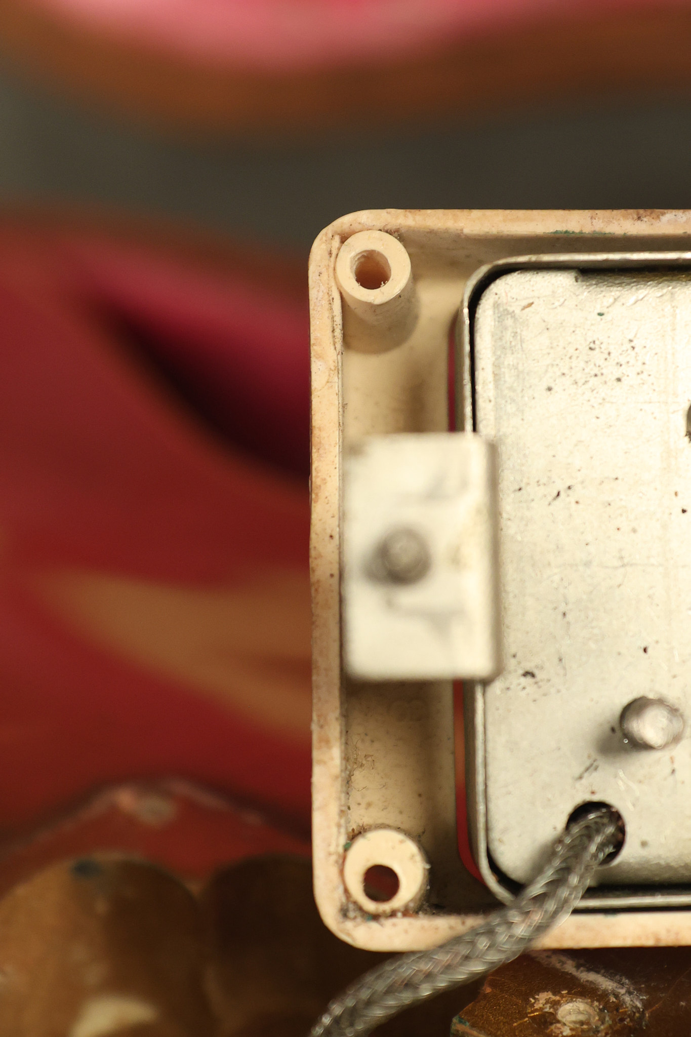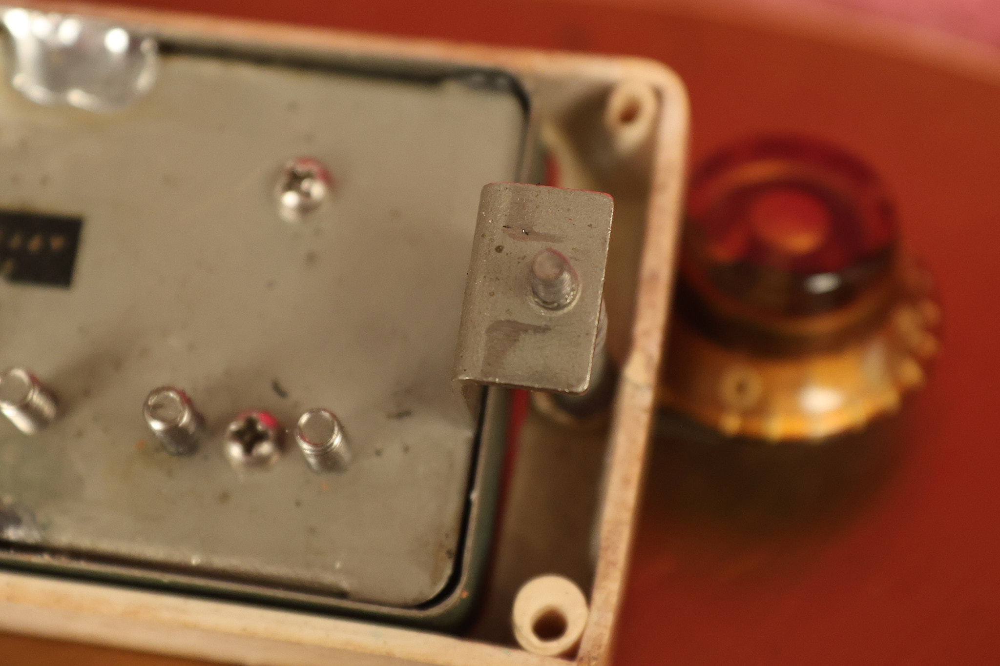 1957 Gibson Les Paul Goldtop in its original Gold top and dark back finish. It has a good playing neck with good frets. It's all original with the exception of one of  the bridge saddles and its screw (the A string saddle). It is also 100% complete along with its original hardshell case. This Les Paul looks great with lots of nicks + dings, finish checking, belt buckle wear, cracked plastic jack plate and other cosmetic wear. The guitar itself remains structurally sound with no cracks, breaks or repairs. As for the electronics, a repair was made on one coil of the bridge position pickup. It was not rewound, but had a connection break in the coil near the surface of the coil winding which has been reattached. All electronics work and sound great with its original set of PAF pickups. The weight is 8 lbs. 12 oz.