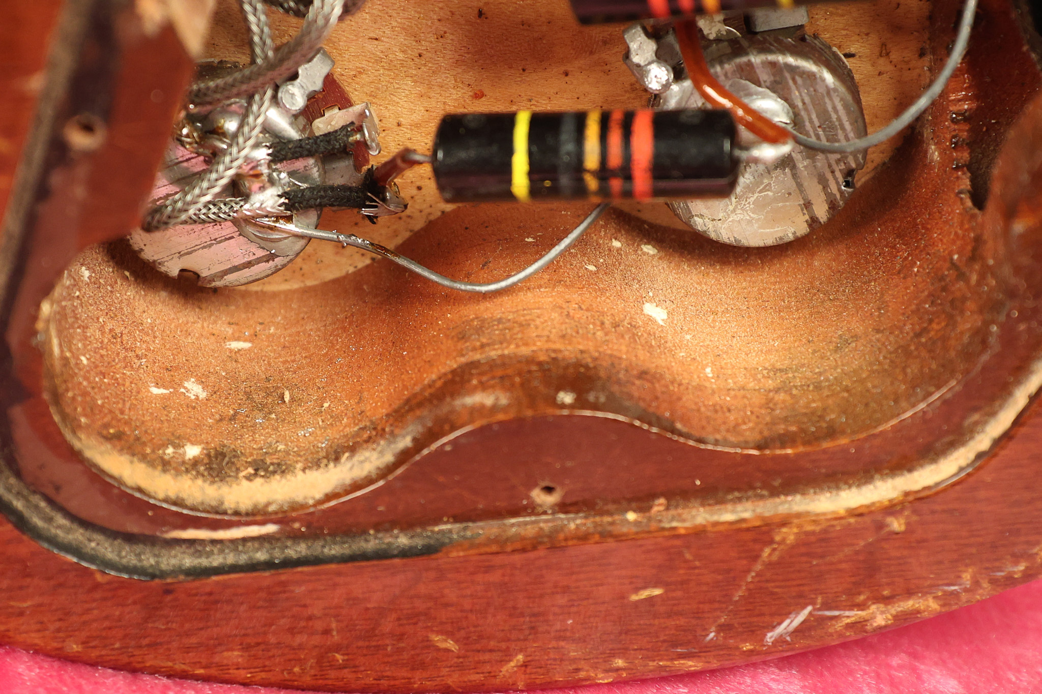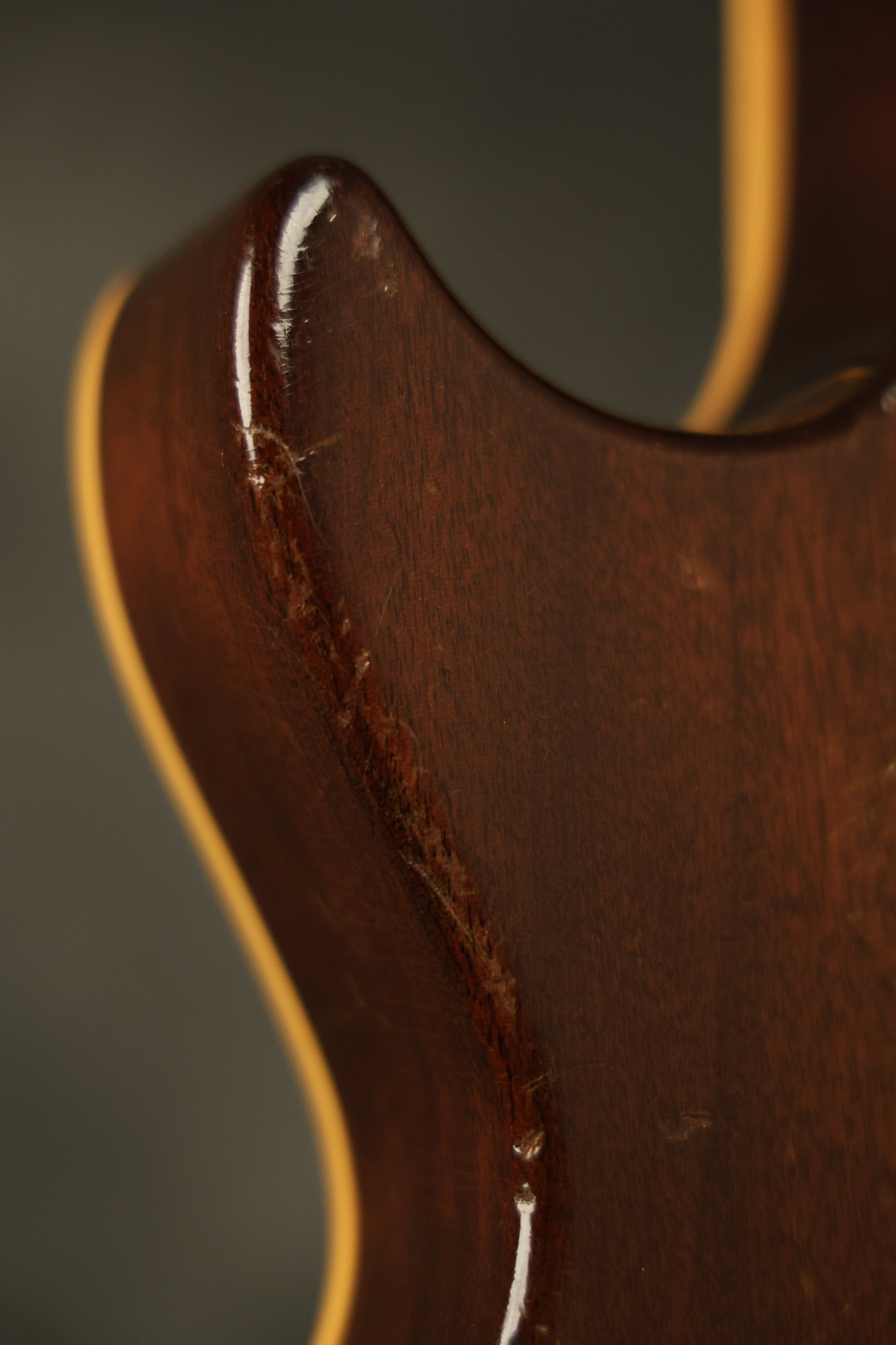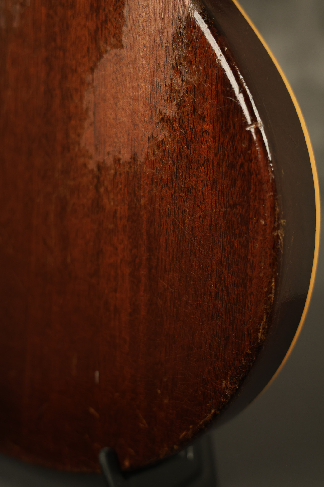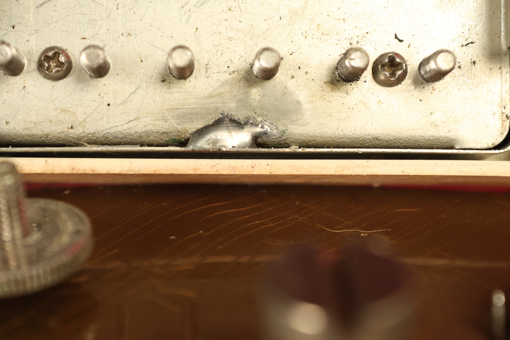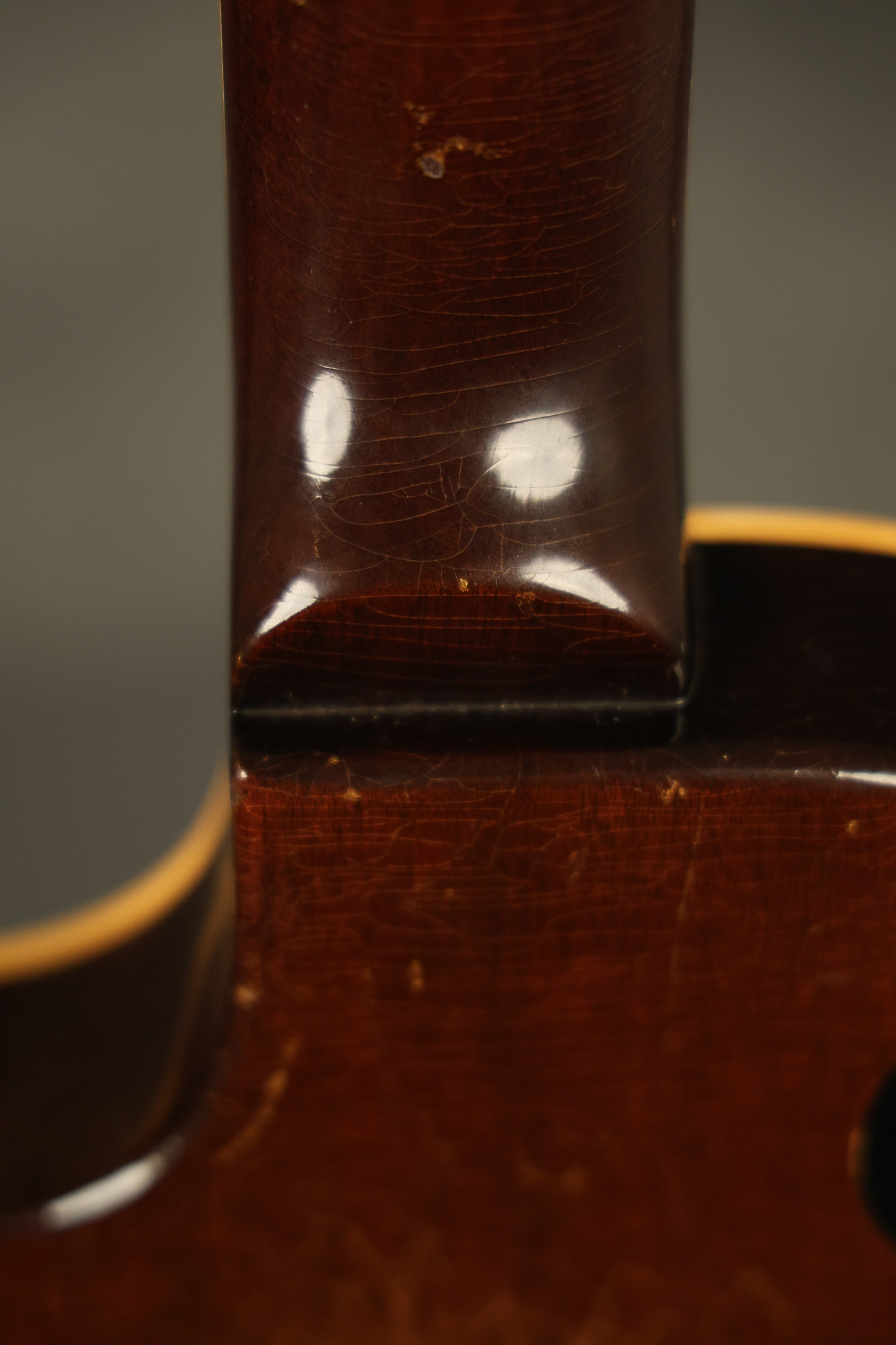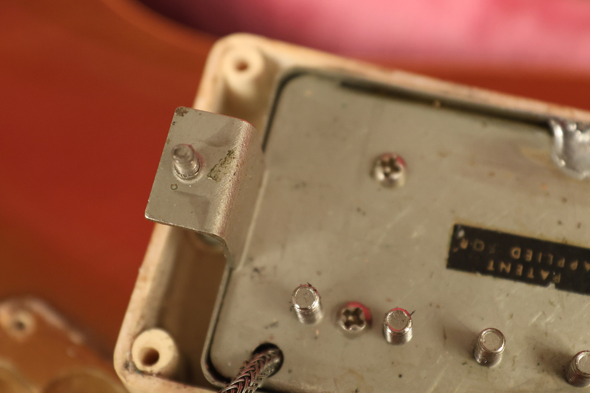 1957 Gibson Les Paul Goldtop in its original Gold top and dark back finish. It has a good playing neck with good frets. It's all original with the exception of one of  the bridge saddles and its screw (the A string saddle). It is also 100% complete along with its original hardshell case. This Les Paul looks great with lots of nicks + dings, finish checking, belt buckle wear, cracked plastic jack plate and other cosmetic wear. The guitar itself remains structurally sound with no cracks, breaks or repairs. As for the electronics, a repair was made on one coil of the bridge position pickup. It was not rewound, but had a connection break in the coil near the surface of the coil winding which has been reattached. All electronics work and sound great with its original set of PAF pickups. The weight is 8 lbs. 12 oz.
