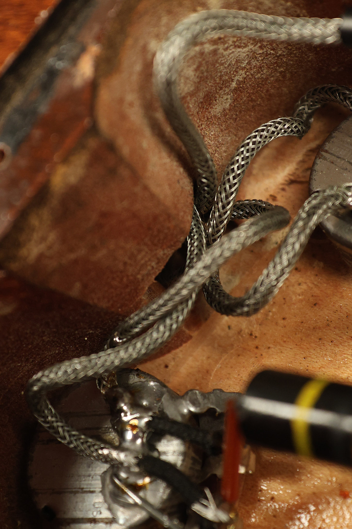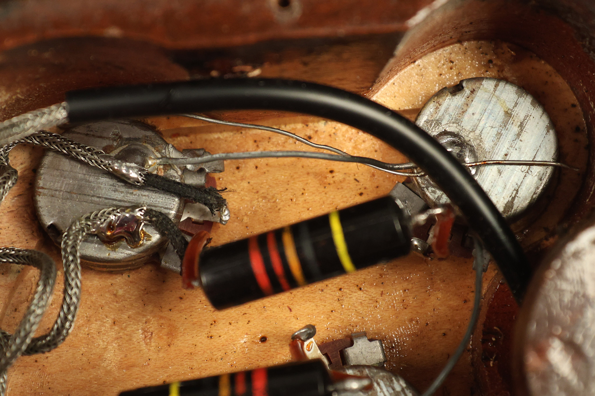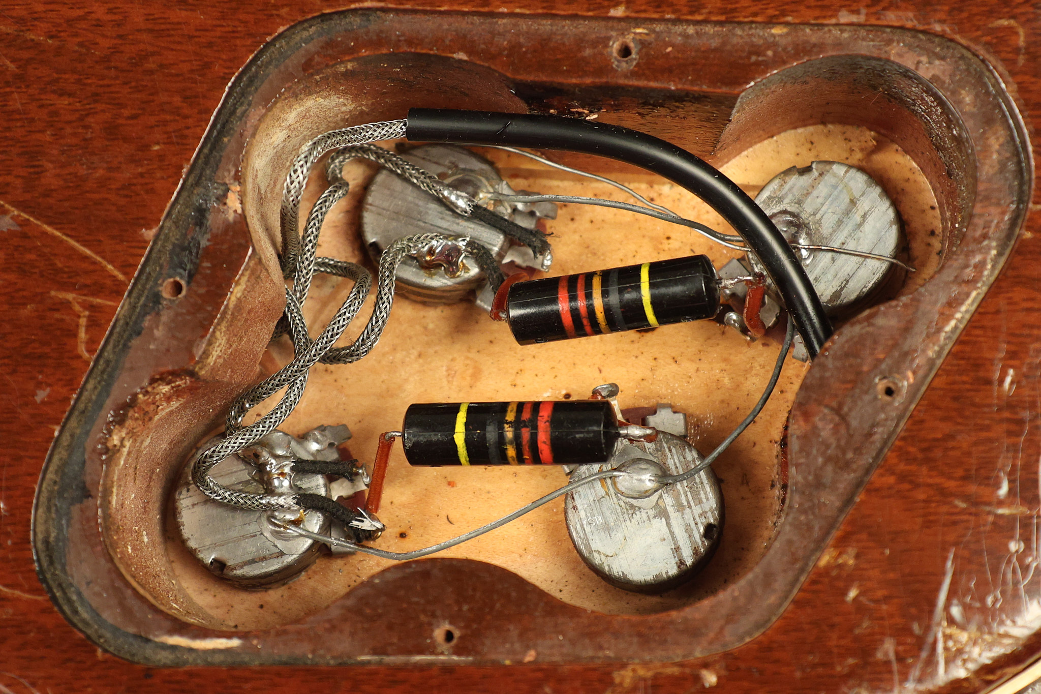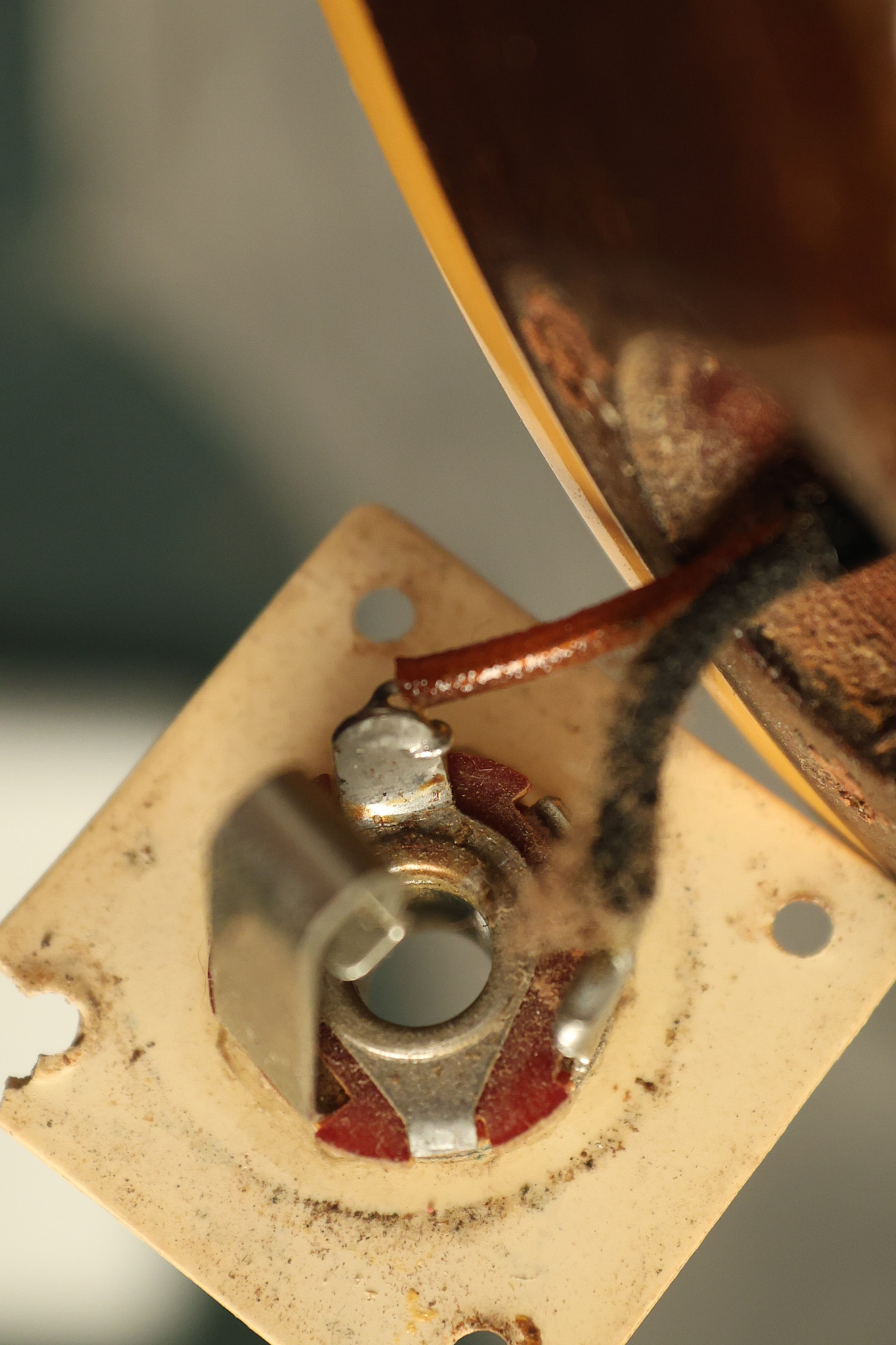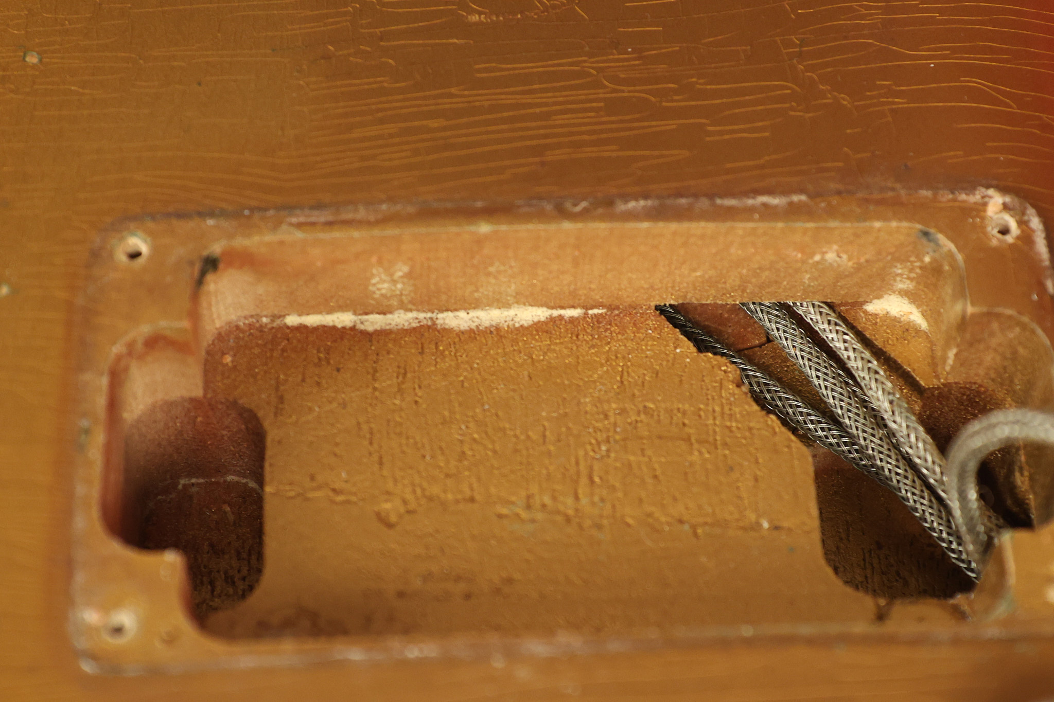 1957 Gibson Les Paul Goldtop in its original Gold top and dark back finish. It has a good playing neck with good frets. It's all original with the exception of one of  the bridge saddles and its screw (the A string saddle). It is also 100% complete along with its original hardshell case. This Les Paul looks great with lots of nicks + dings, finish checking, belt buckle wear, cracked plastic jack plate and other cosmetic wear. The guitar itself remains structurally sound with no cracks, breaks or repairs. As for the electronics, a repair was made on one coil of the bridge position pickup. It was not rewound, but had a connection break in the coil near the surface of the coil winding which has been reattached. All electronics work and sound great with its original set of PAF pickups. The weight is 8 lbs. 12 oz.