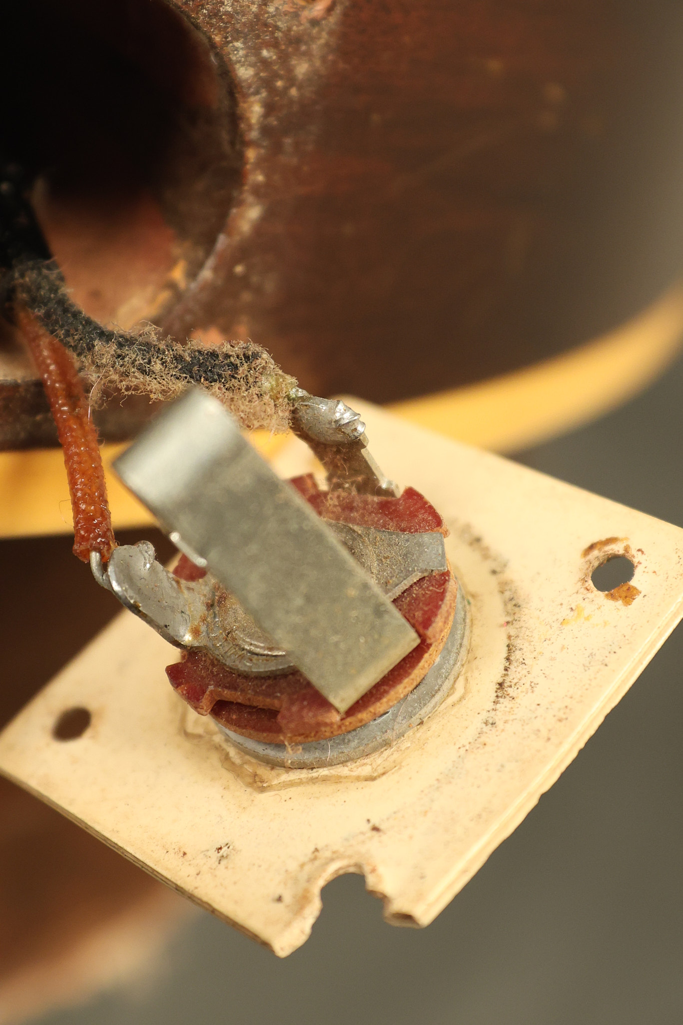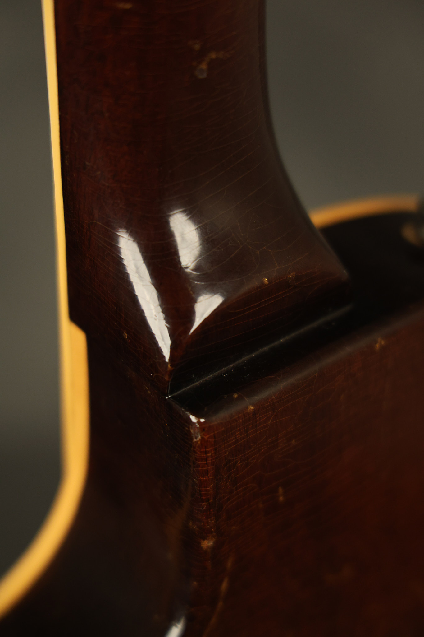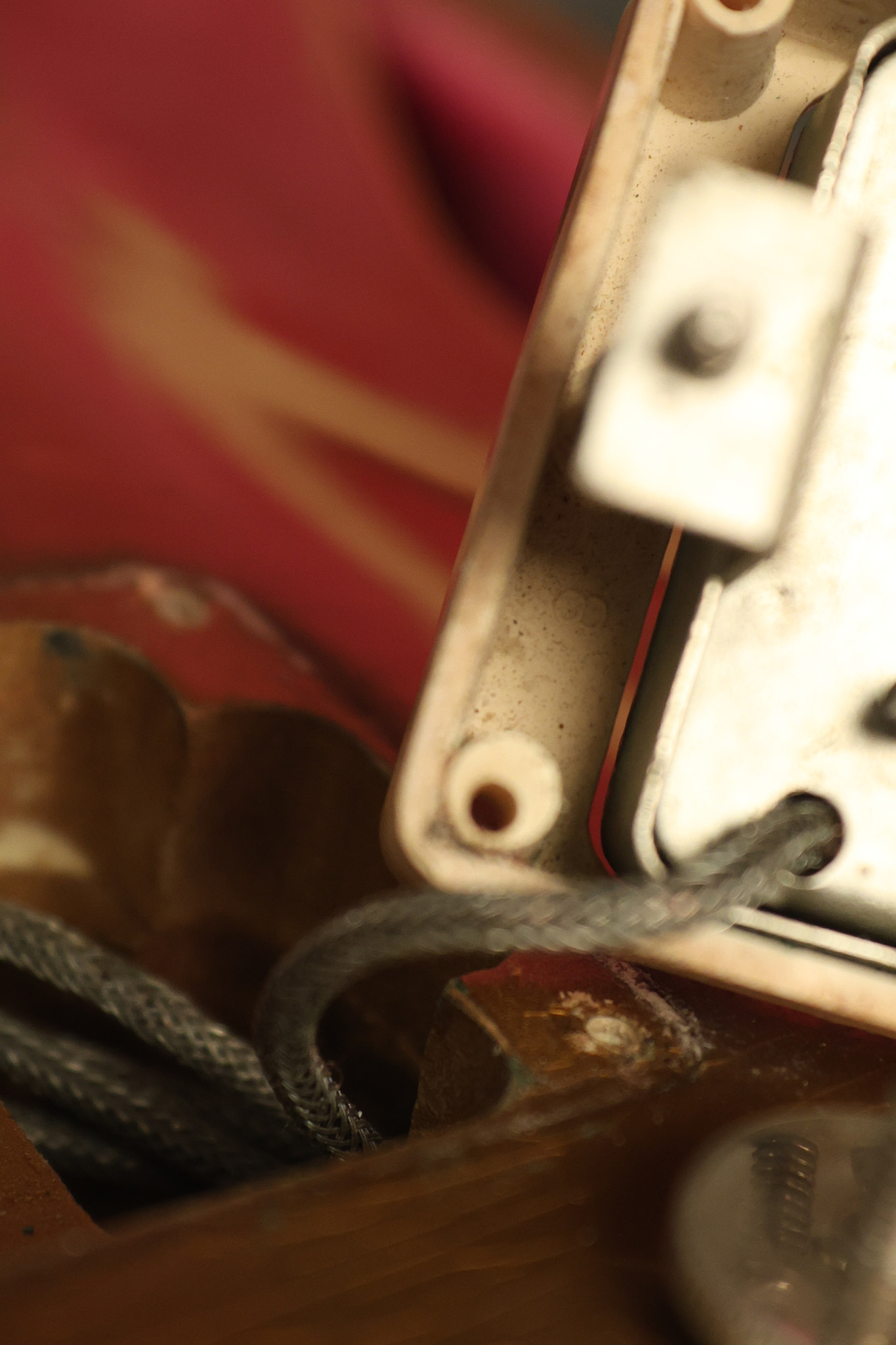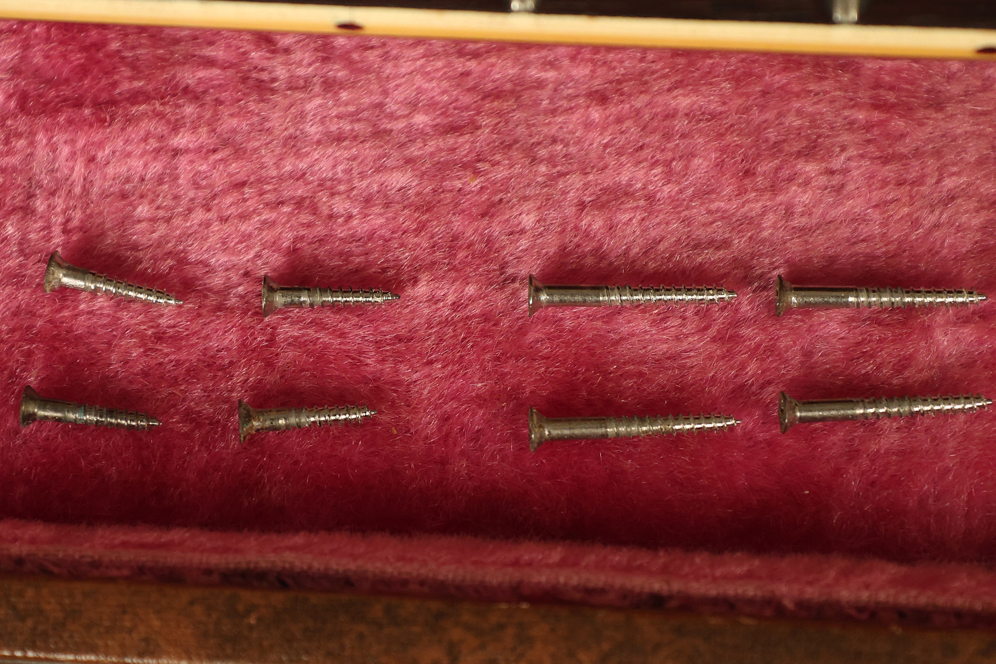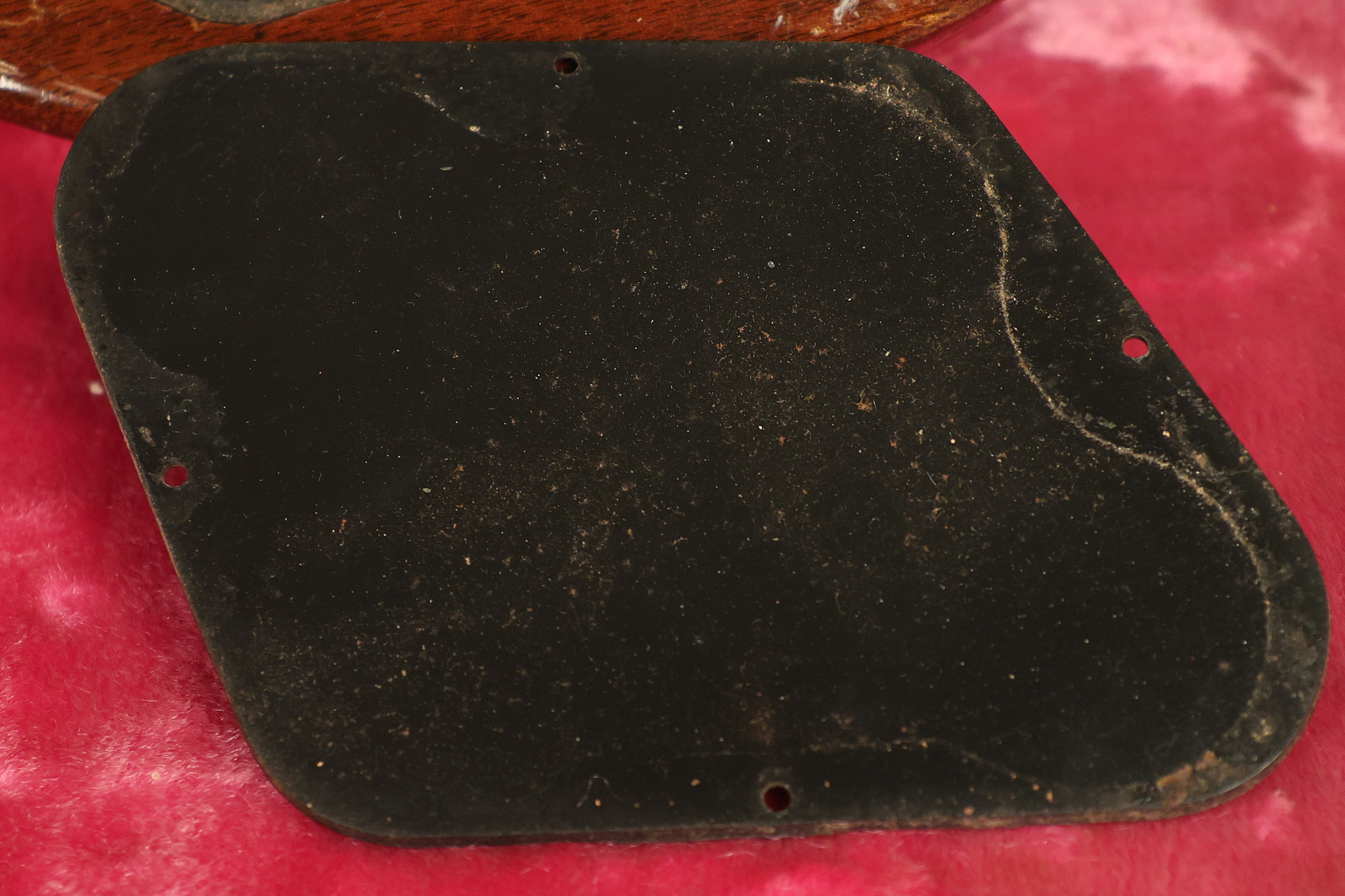 1957 Gibson Les Paul Goldtop in its original Gold top and dark back finish. It has a good playing neck with good frets. It's all original with the exception of one of  the bridge saddles and its screw (the A string saddle). It is also 100% complete along with its original hardshell case. This Les Paul looks great with lots of nicks + dings, finish checking, belt buckle wear, cracked plastic jack plate and other cosmetic wear. The guitar itself remains structurally sound with no cracks, breaks or repairs. As for the electronics, a repair was made on one coil of the bridge position pickup. It was not rewound, but had a connection break in the coil near the surface of the coil winding which has been reattached. All electronics work and sound great with its original set of PAF pickups. The weight is 8 lbs. 12 oz.