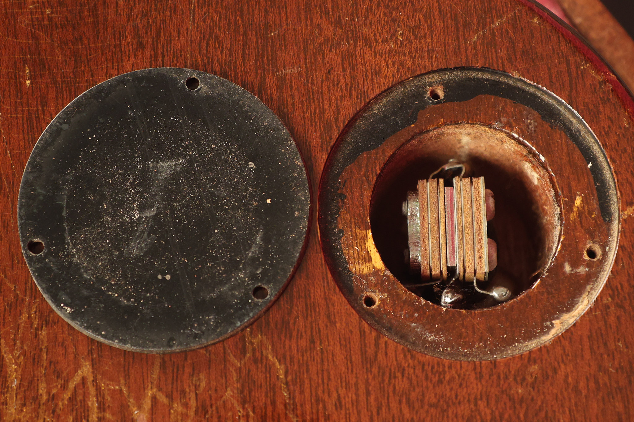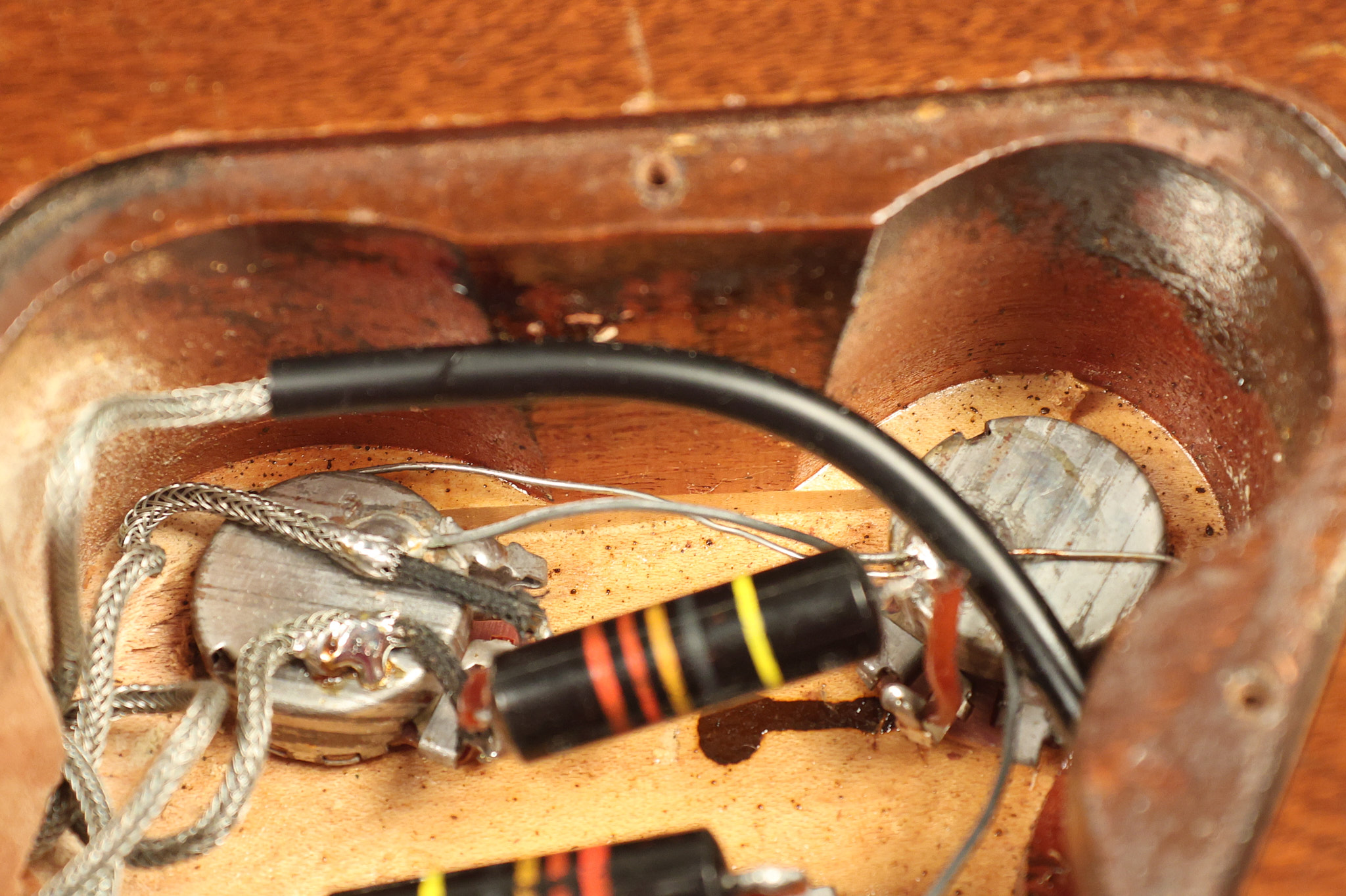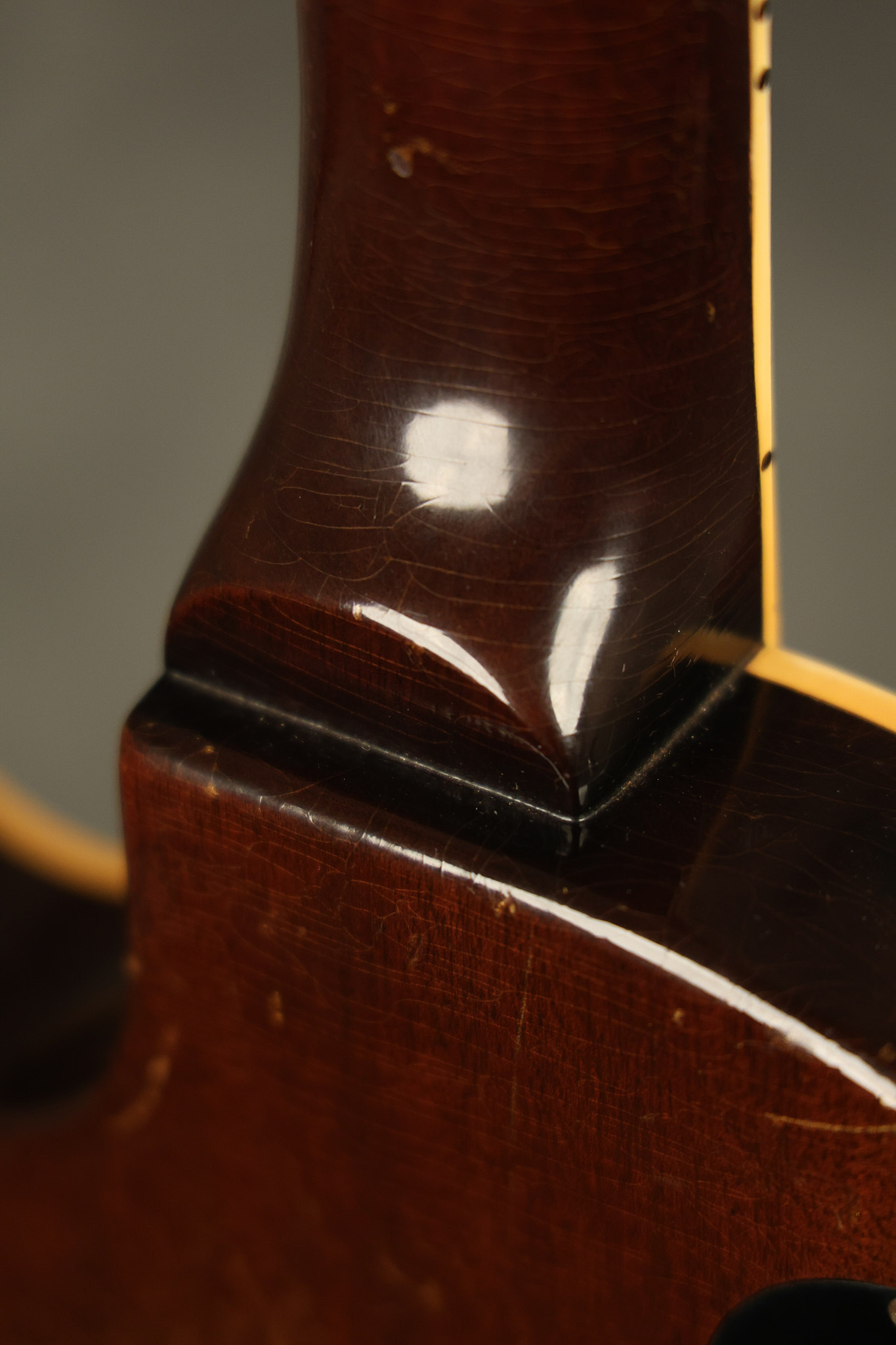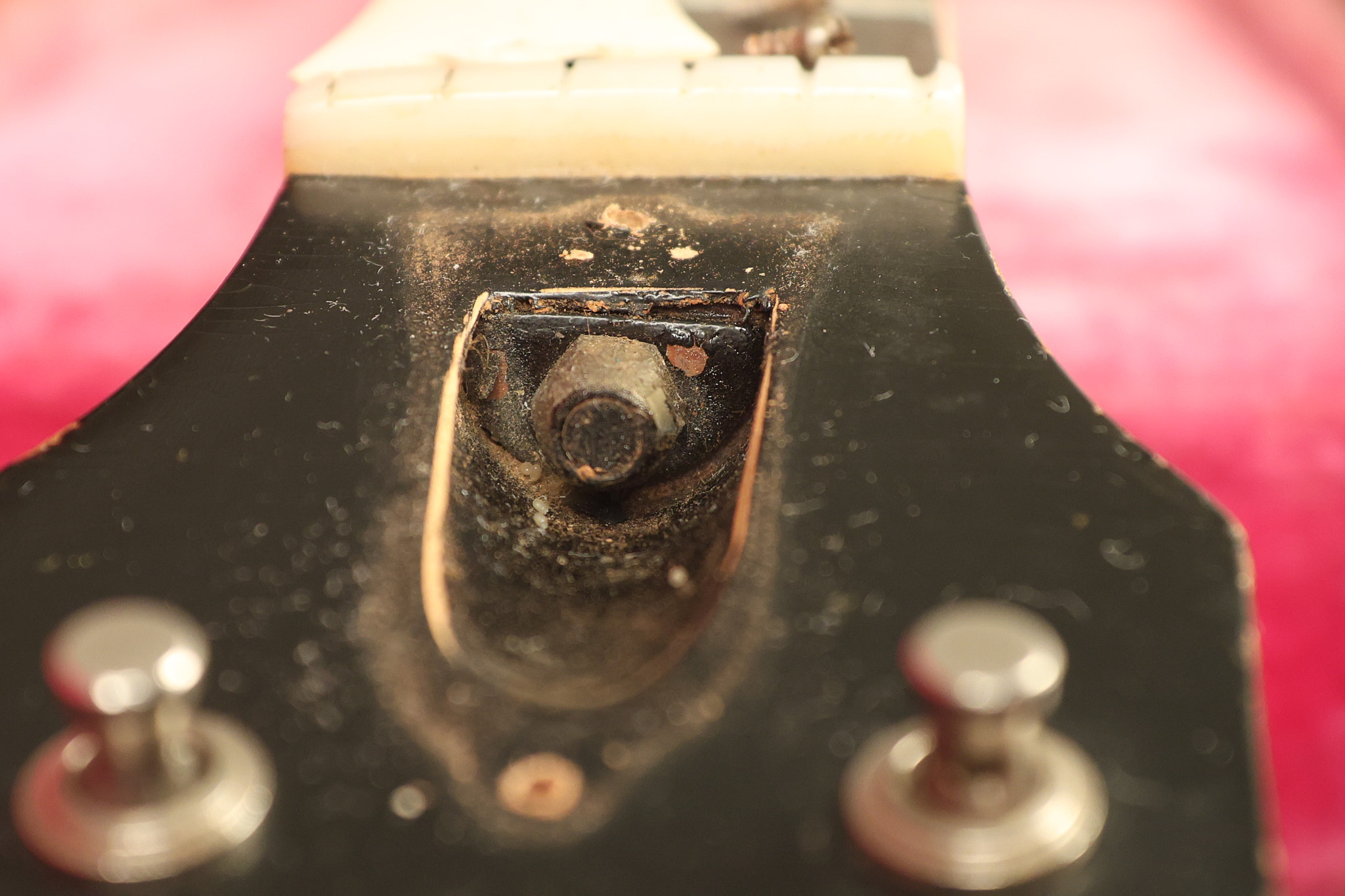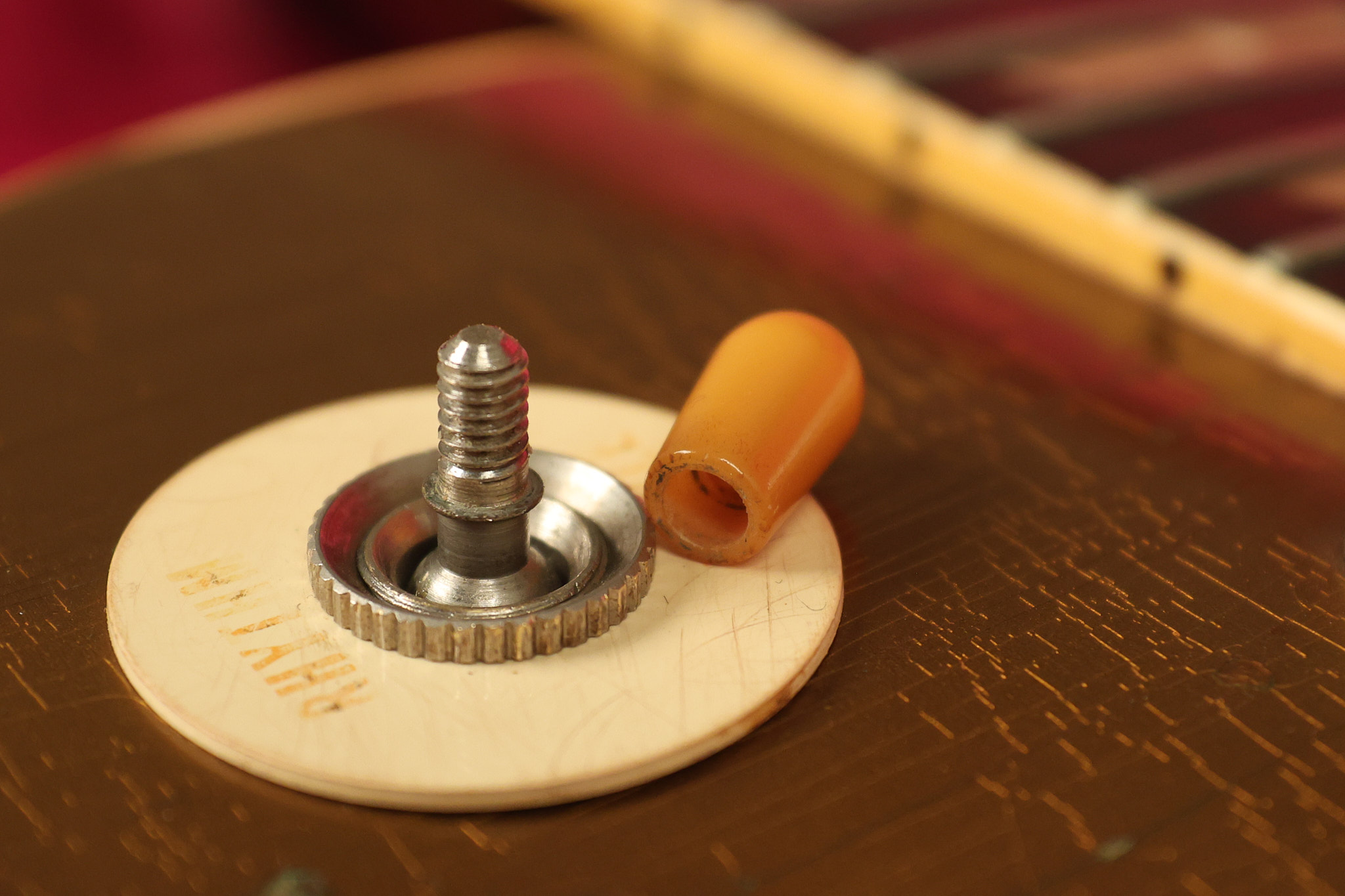 1957 Gibson Les Paul Goldtop in its original Gold top and dark back finish. It has a good playing neck with good frets. It's all original with the exception of one of  the bridge saddles and its screw (the A string saddle). It is also 100% complete along with its original hardshell case. This Les Paul looks great with lots of nicks + dings, finish checking, belt buckle wear, cracked plastic jack plate and other cosmetic wear. The guitar itself remains structurally sound with no cracks, breaks or repairs. As for the electronics, a repair was made on one coil of the bridge position pickup. It was not rewound, but had a connection break in the coil near the surface of the coil winding which has been reattached. All electronics work and sound great with its original set of PAF pickups. The weight is 8 lbs. 12 oz.