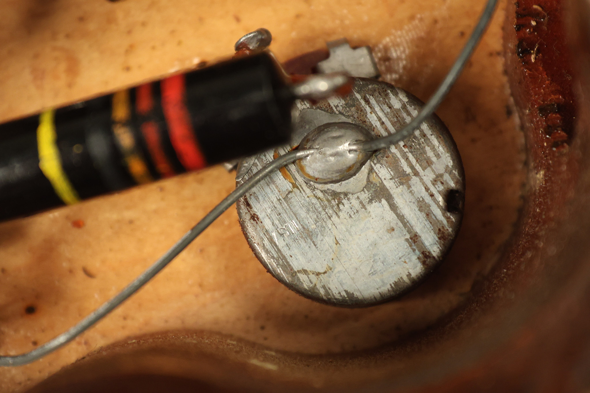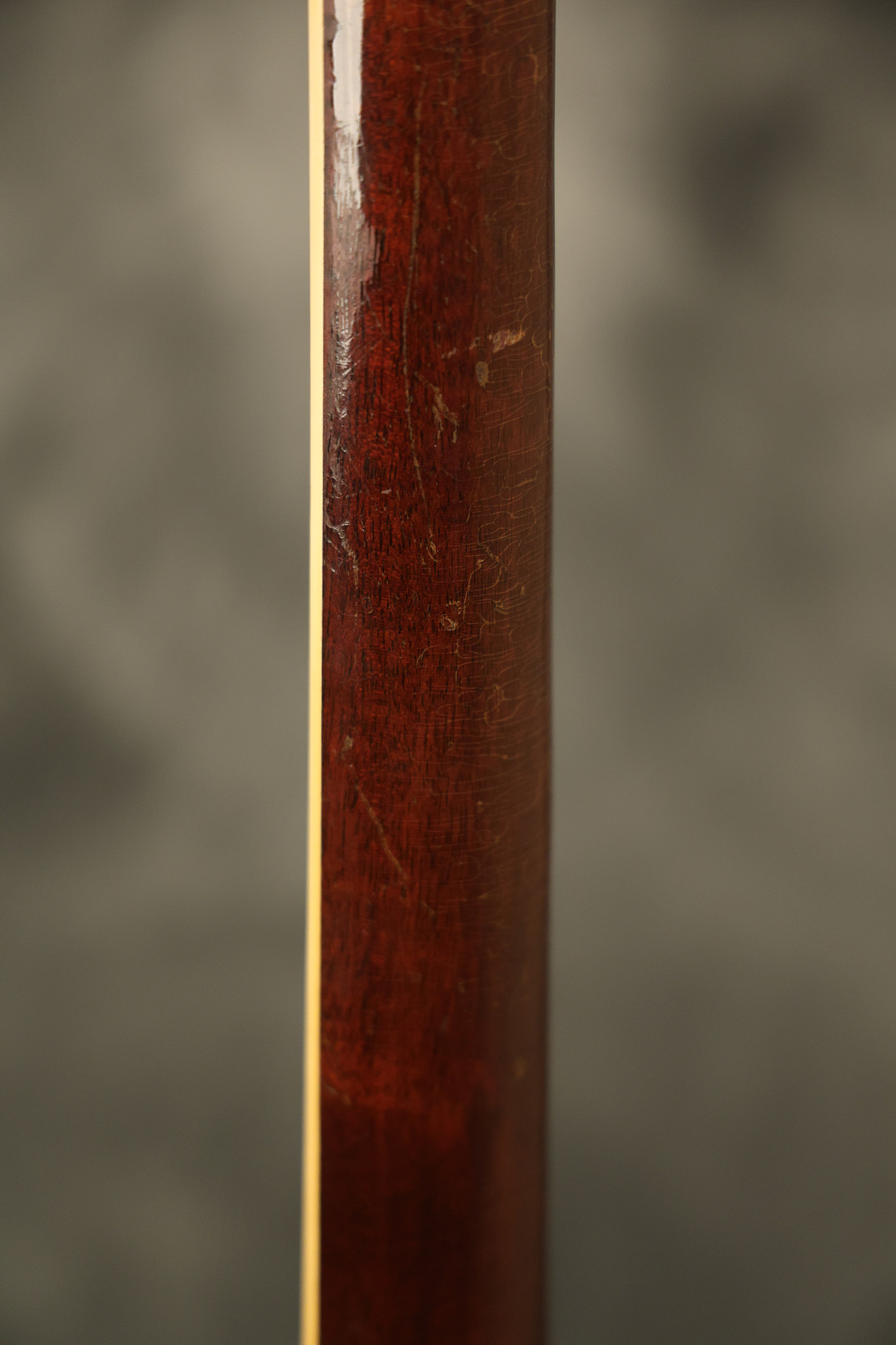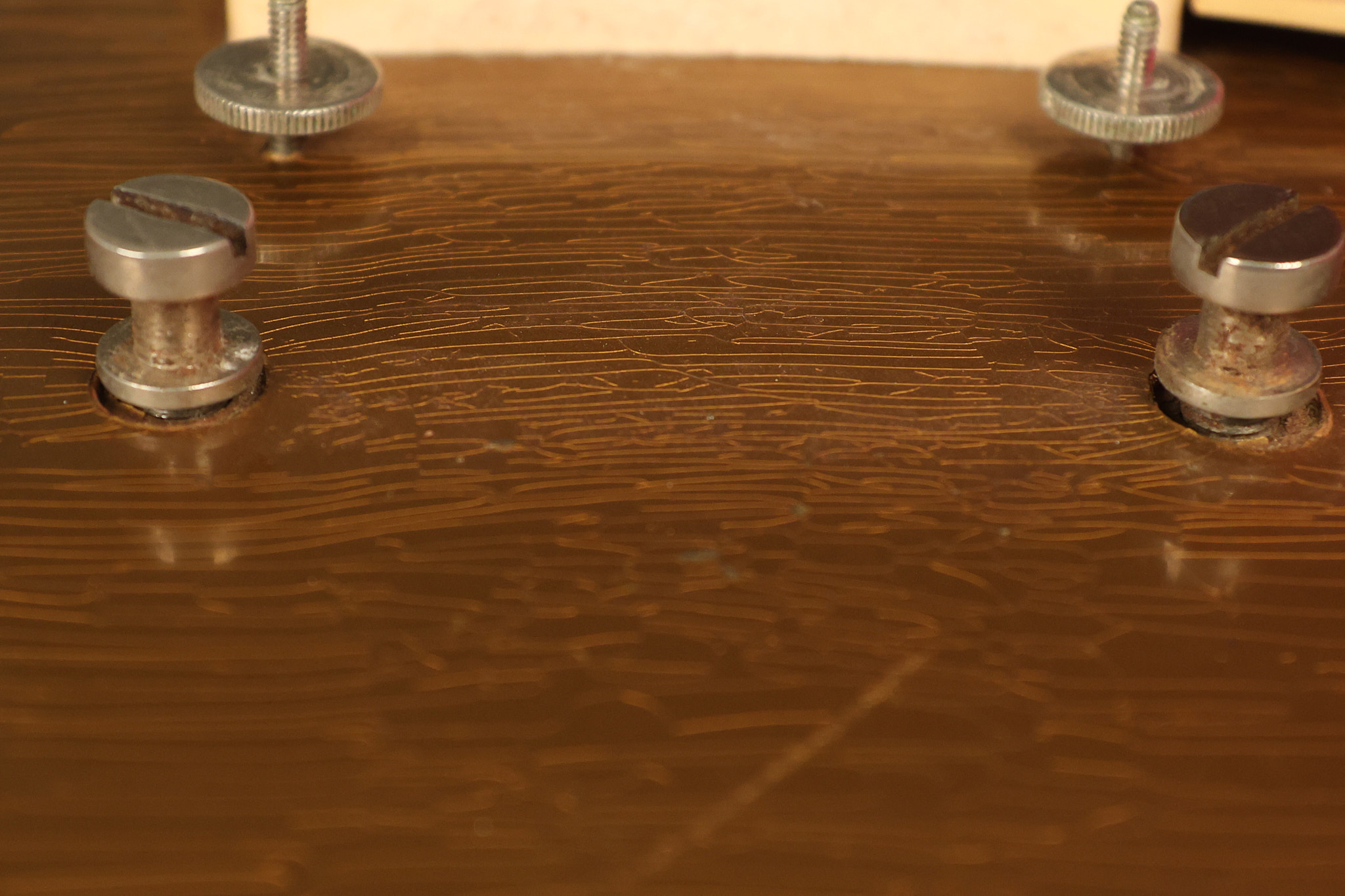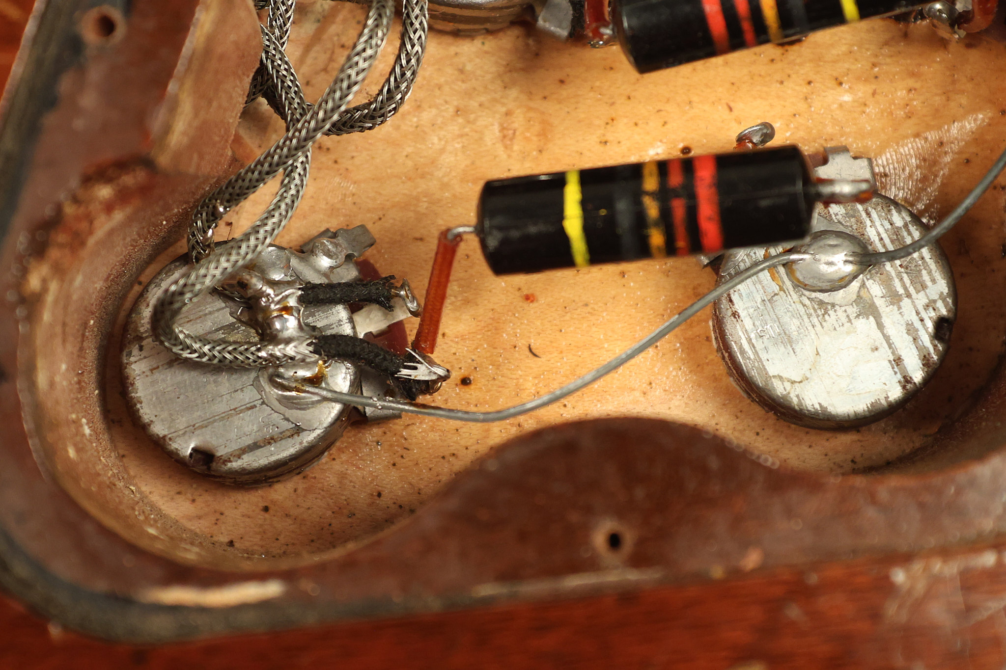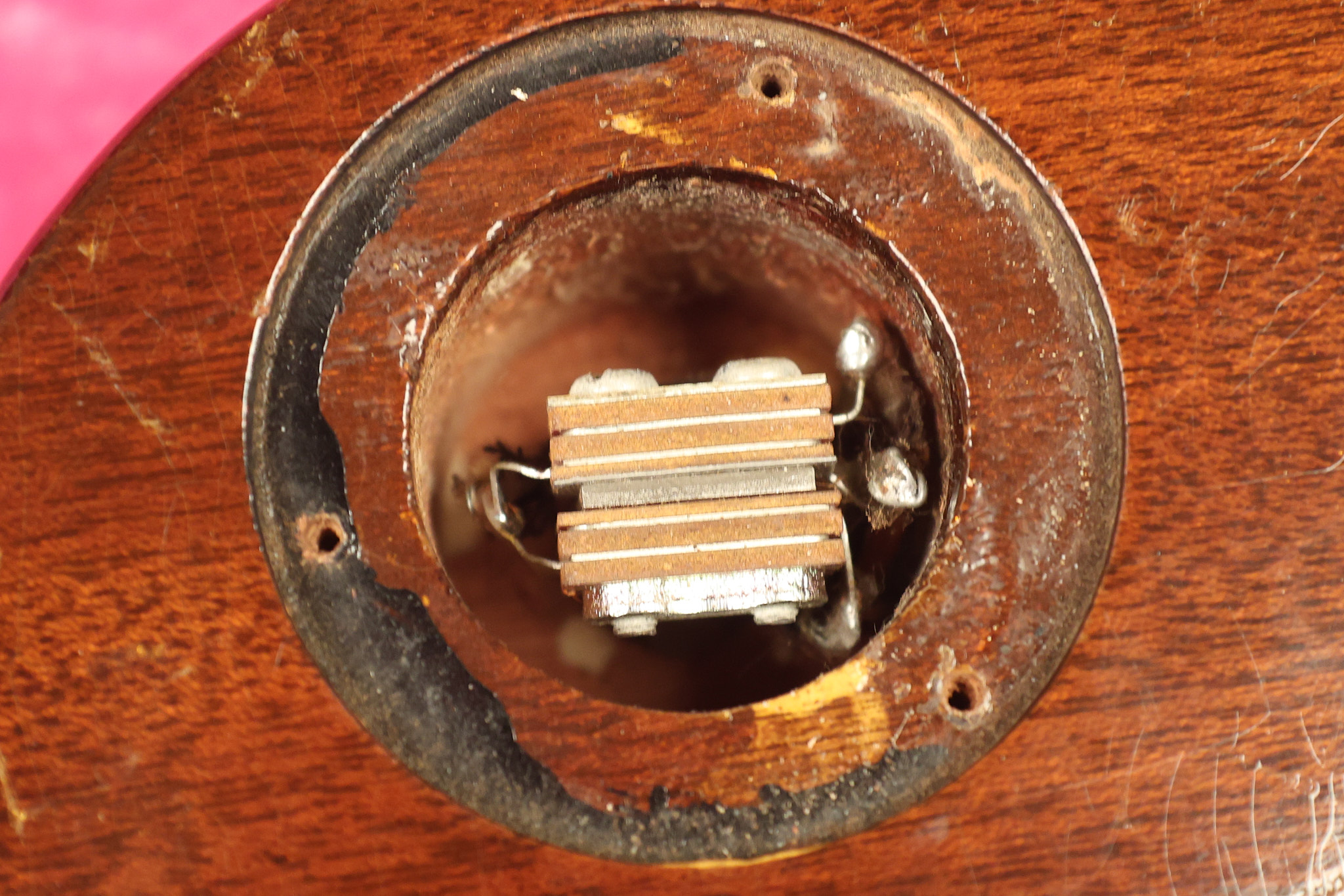 1957 Gibson Les Paul Goldtop in its original Gold top and dark back finish. It has a good playing neck with good frets. It's all original with the exception of one of  the bridge saddles and its screw (the A string saddle). It is also 100% complete along with its original hardshell case. This Les Paul looks great with lots of nicks + dings, finish checking, belt buckle wear, cracked plastic jack plate and other cosmetic wear. The guitar itself remains structurally sound with no cracks, breaks or repairs. As for the electronics, a repair was made on one coil of the bridge position pickup. It was not rewound, but had a connection break in the coil near the surface of the coil winding which has been reattached. All electronics work and sound great with its original set of PAF pickups. The weight is 8 lbs. 12 oz.