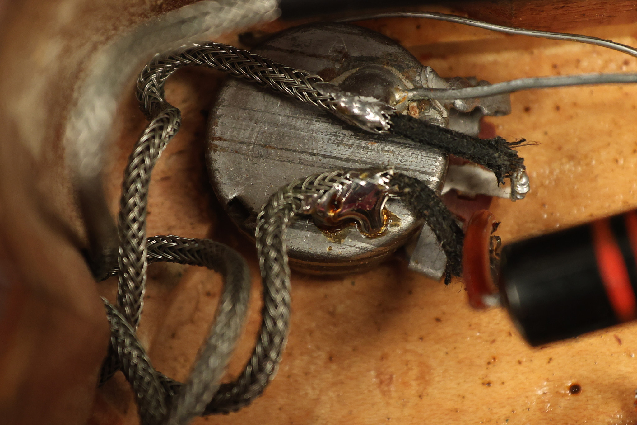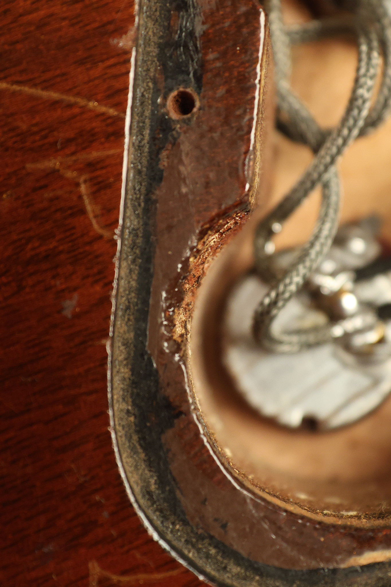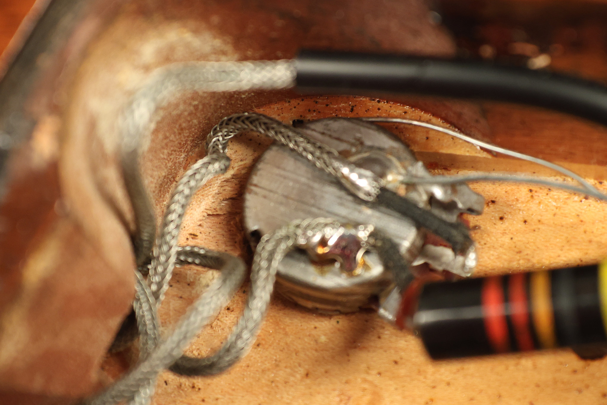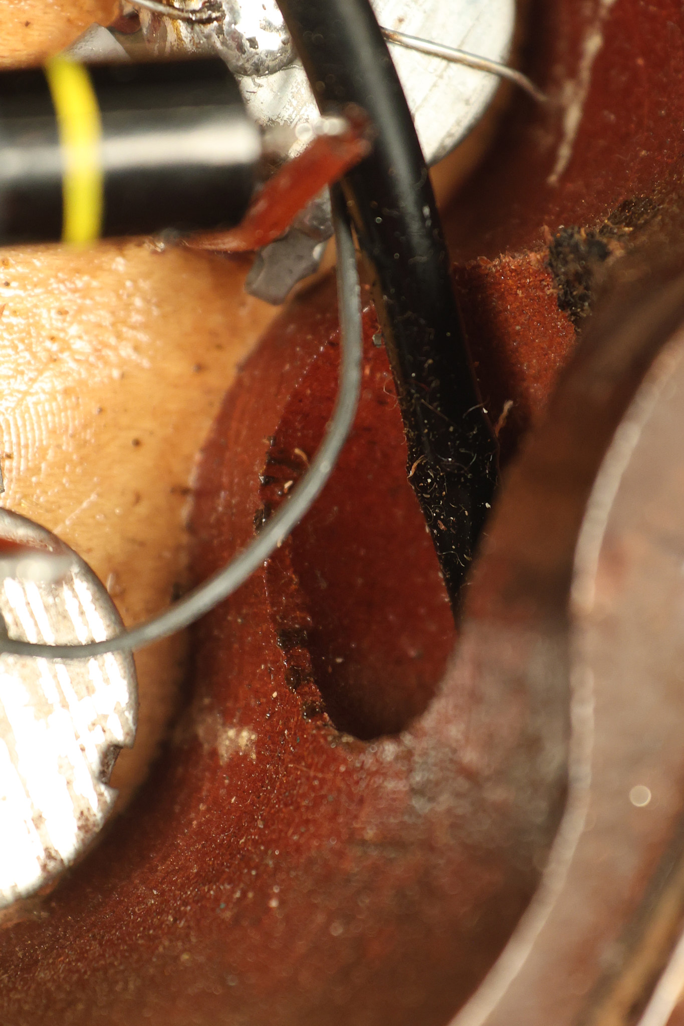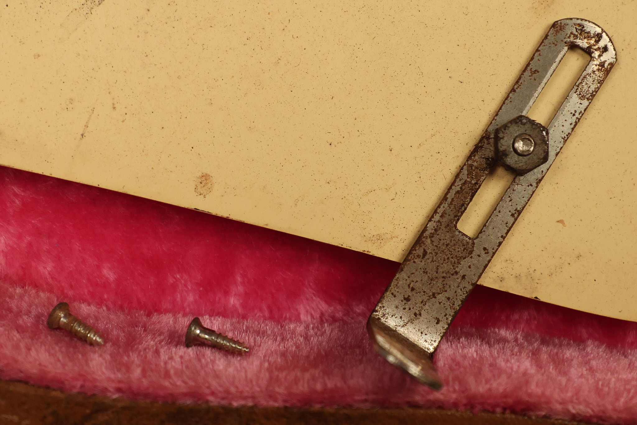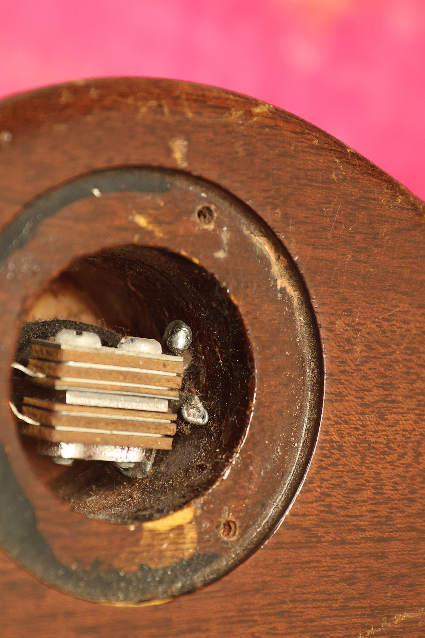 1957 Gibson Les Paul Goldtop in its original Gold top and dark back finish. It has a good playing neck with good frets. It's all original with the exception of one of  the bridge saddles and its screw (the A string saddle). It is also 100% complete along with its original hardshell case. This Les Paul looks great with lots of nicks + dings, finish checking, belt buckle wear, cracked plastic jack plate and other cosmetic wear. The guitar itself remains structurally sound with no cracks, breaks or repairs. As for the electronics, a repair was made on one coil of the bridge position pickup. It was not rewound, but had a connection break in the coil near the surface of the coil winding which has been reattached. All electronics work and sound great with its original set of PAF pickups. The weight is 8 lbs. 12 oz.