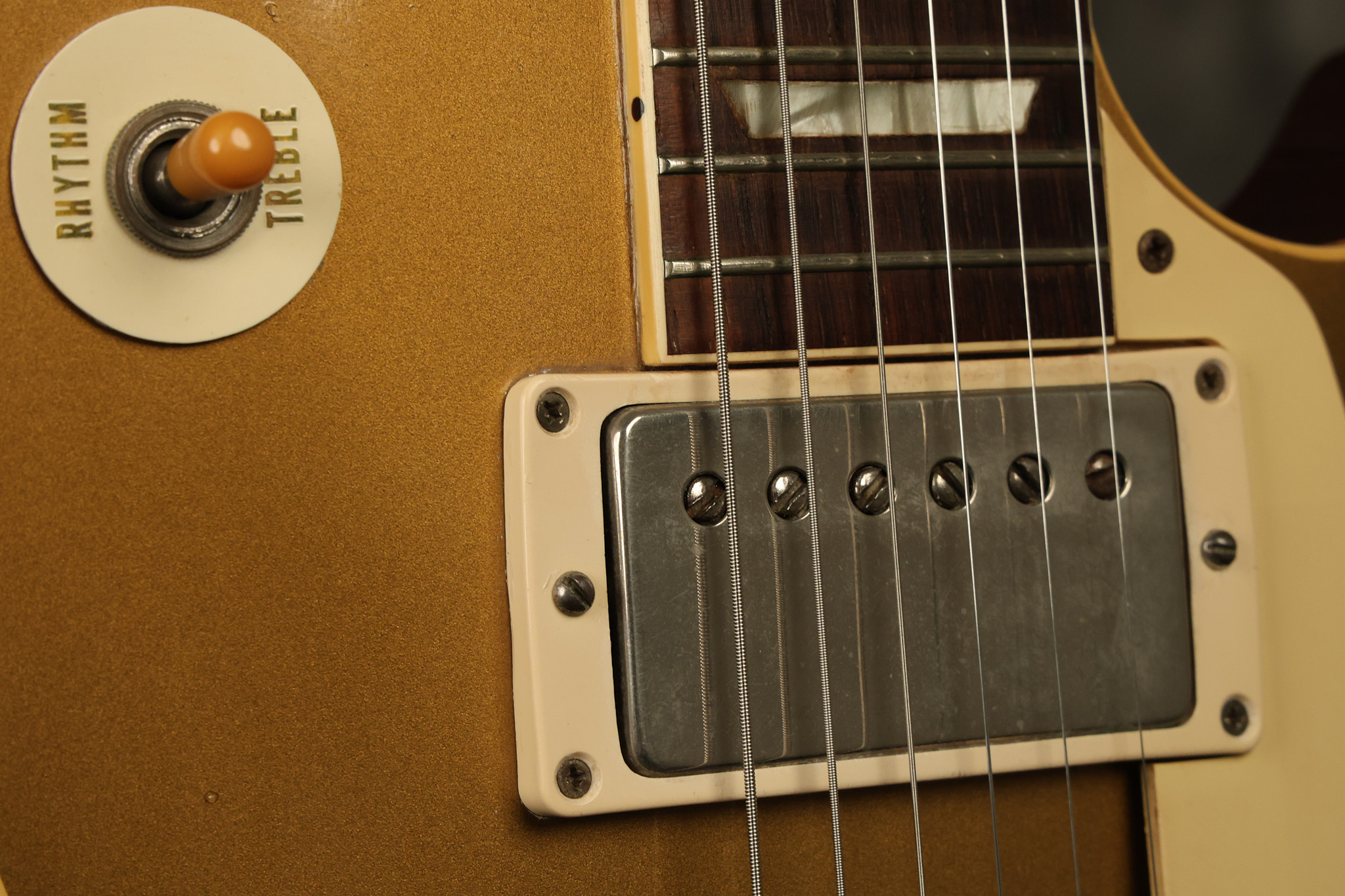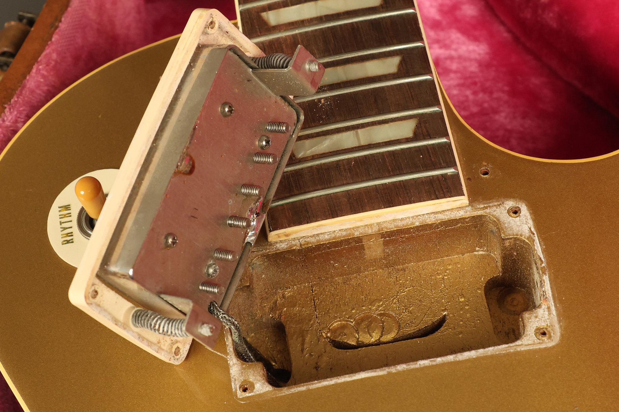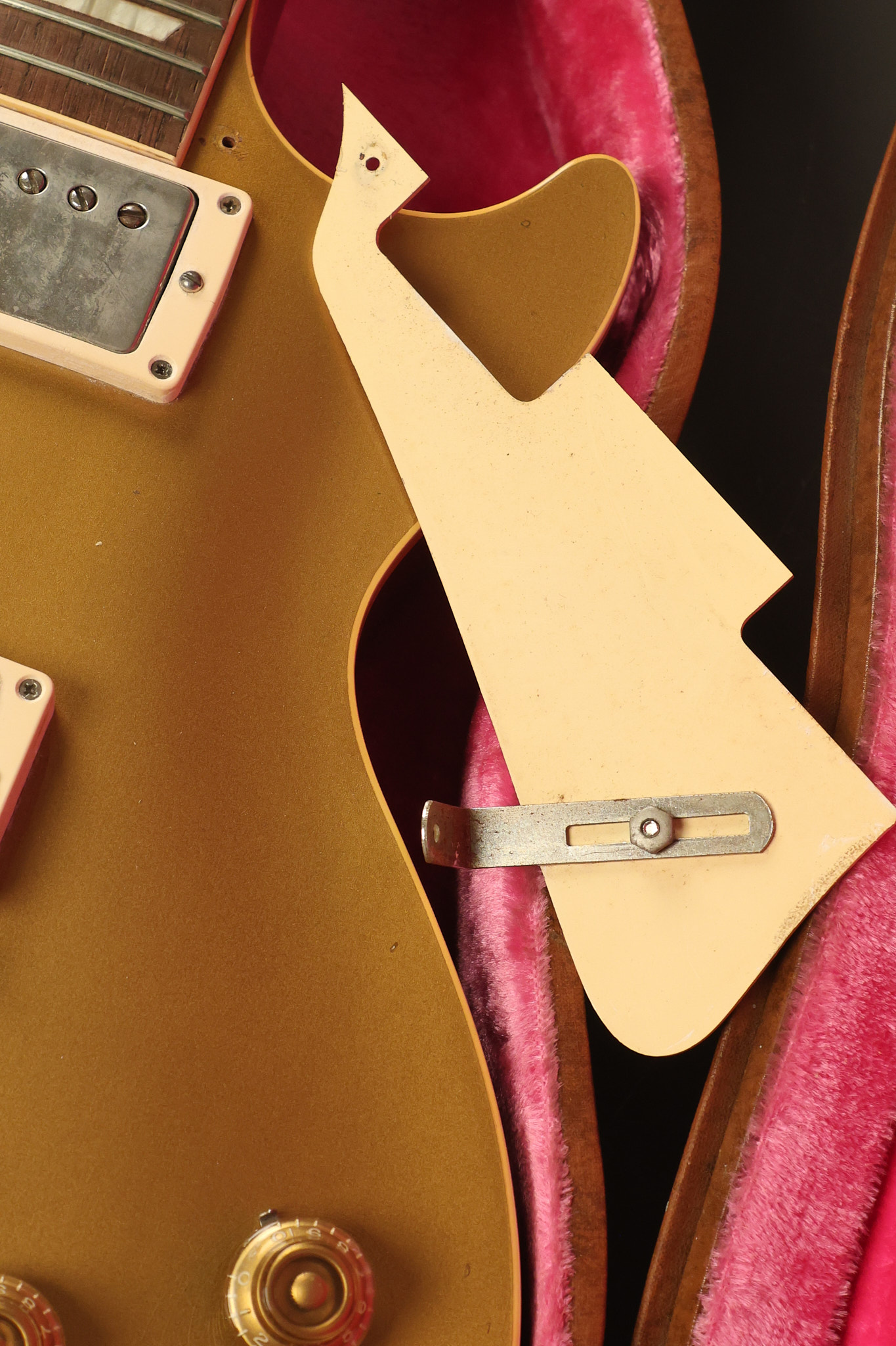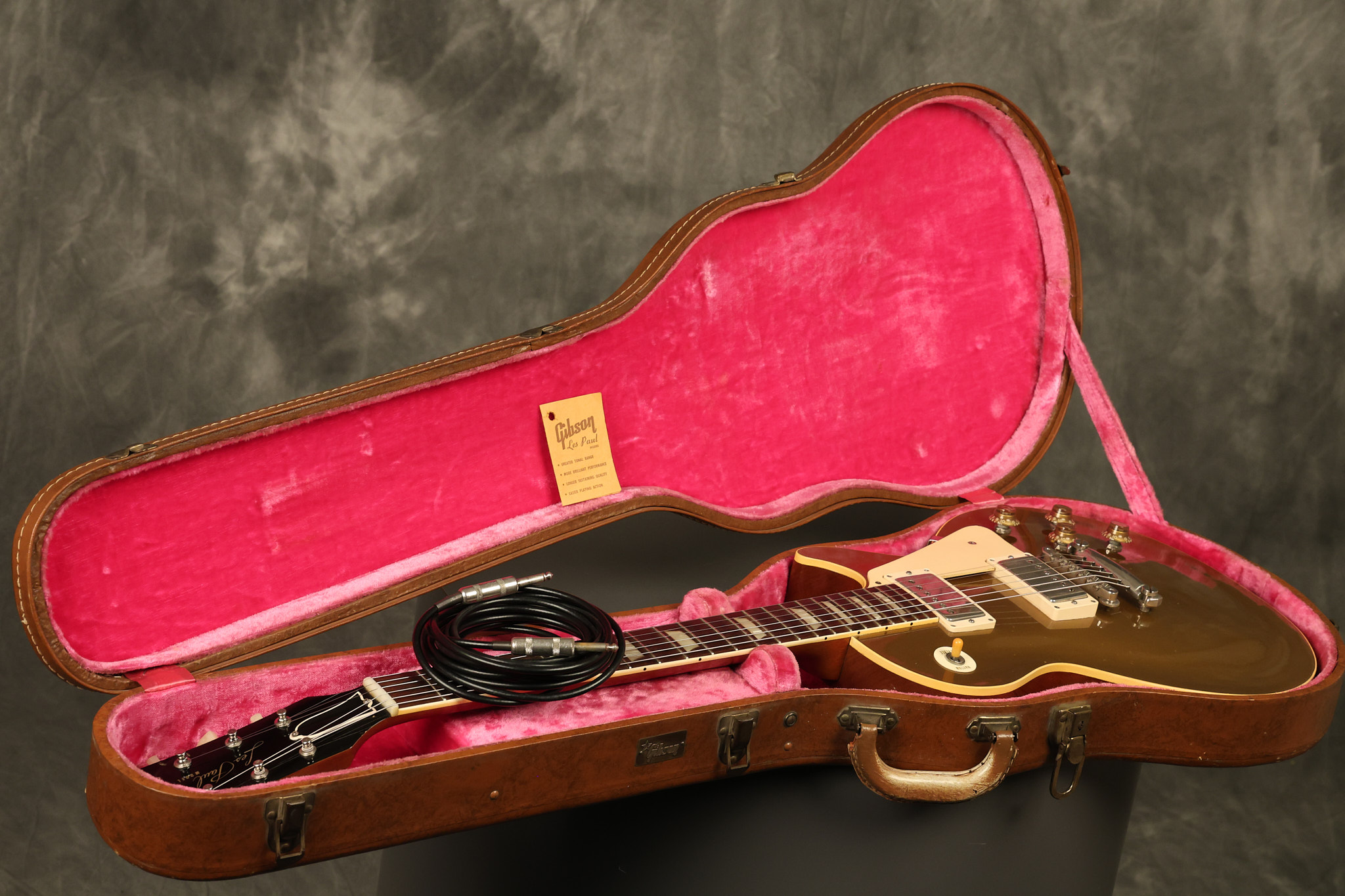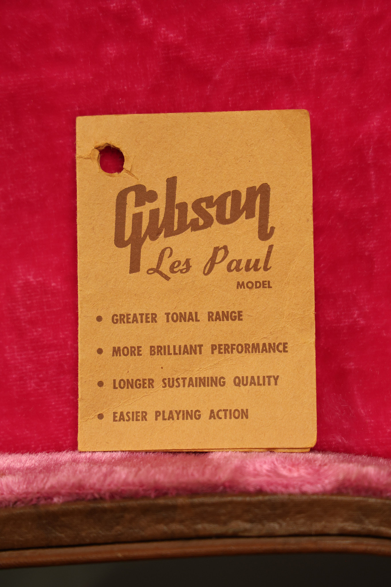 1957 Gibson Les Paul Goldtop with a rare carved top one-piece solid mahogany body in its original Goldtop finish. It has a great playing neck with great frets. It's all original and 100% complete along with its original hardshell case and Les Paul HANG TAG. It's in EXCELLENT condition with minor nicks + dings, very light belt buckle wear on the back of the body, a few minor finish cracks and other minor cosmetic wear including some nicks + dings around the top edges of the headstock that have been touched-up. The guitar itself remains structurally sound with no cracks, breaks or repairs. All electronics work and sound great with its original set of early PAF pickups. The cover for the neck position pickup is removable as the inside edge is not attached to the solder. All solder in the control cavities remain original and untampered with.