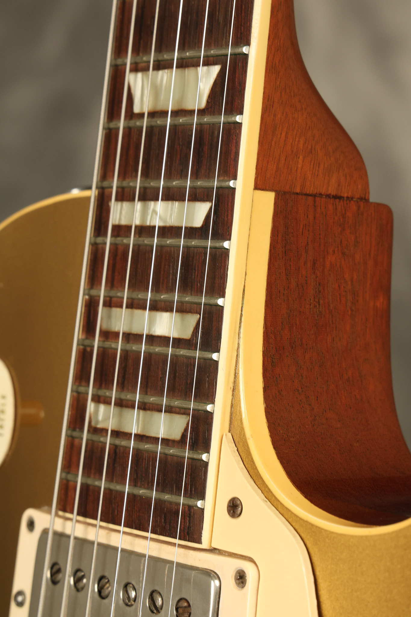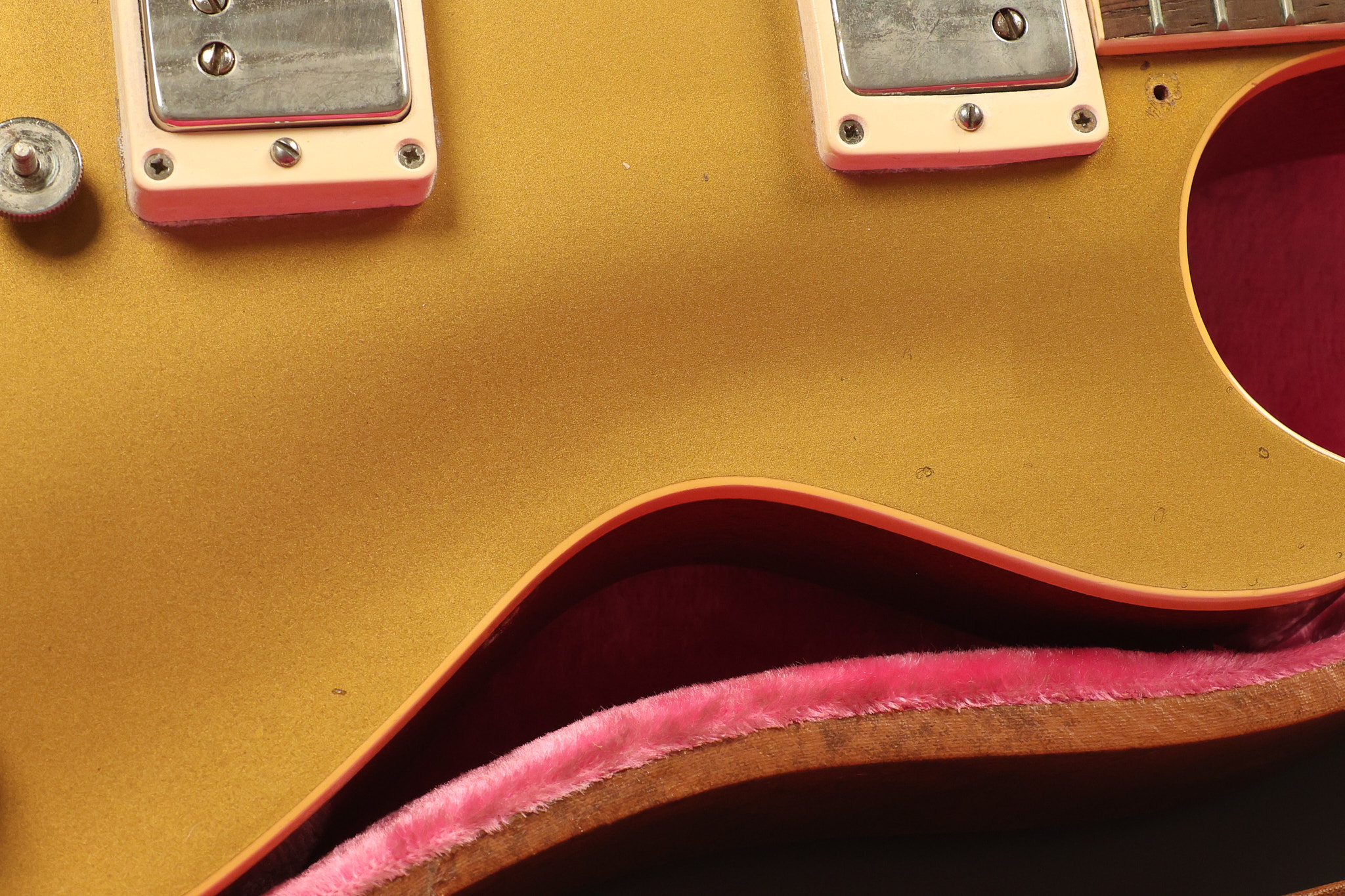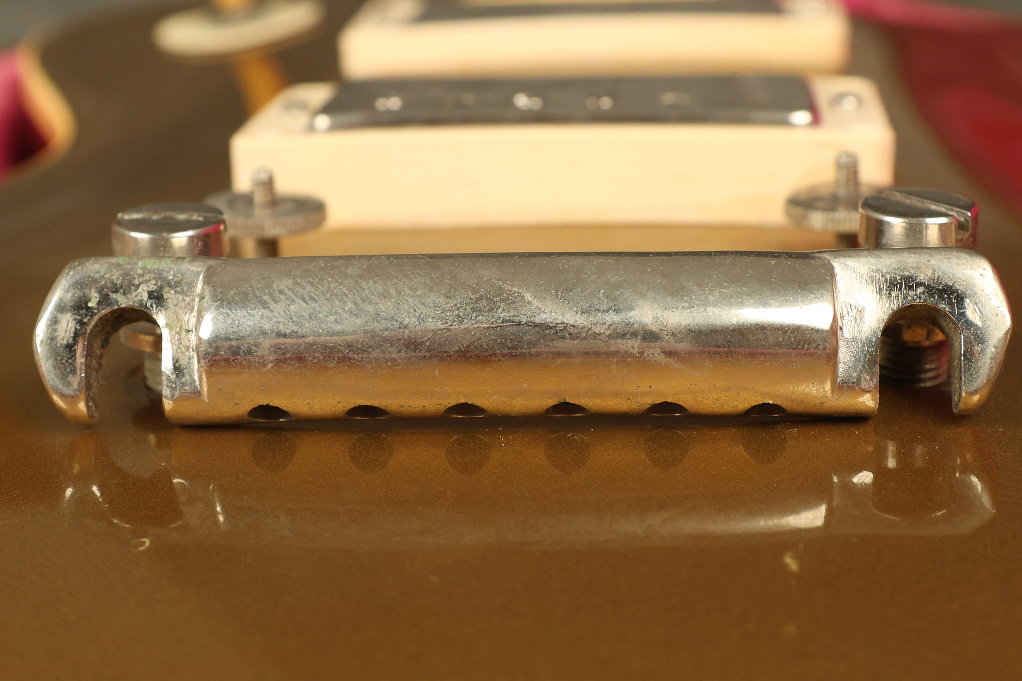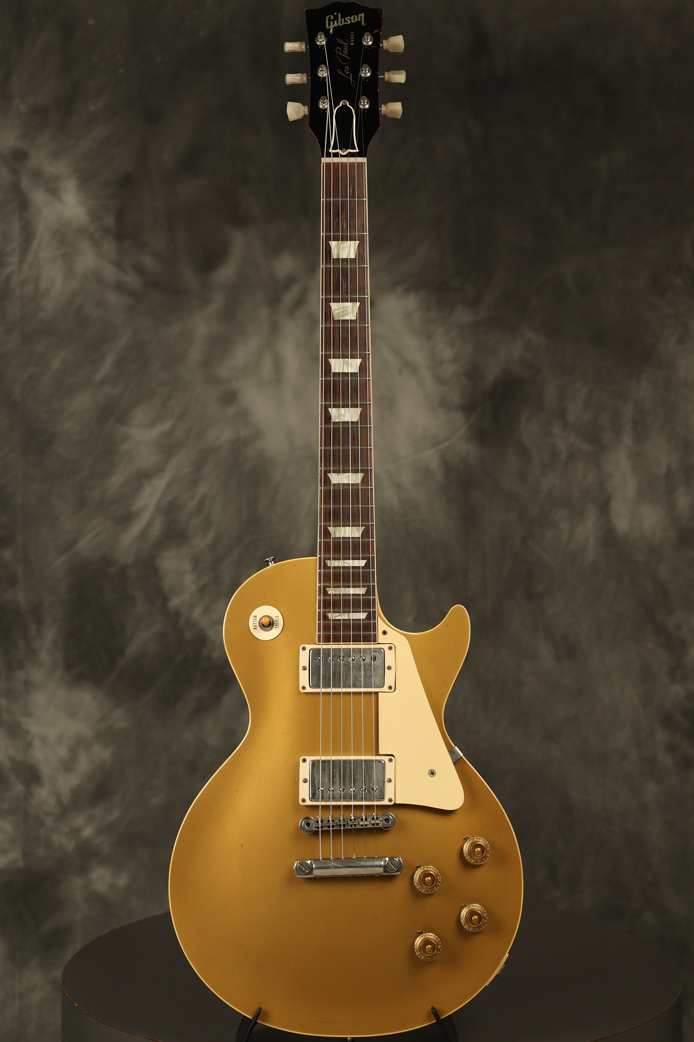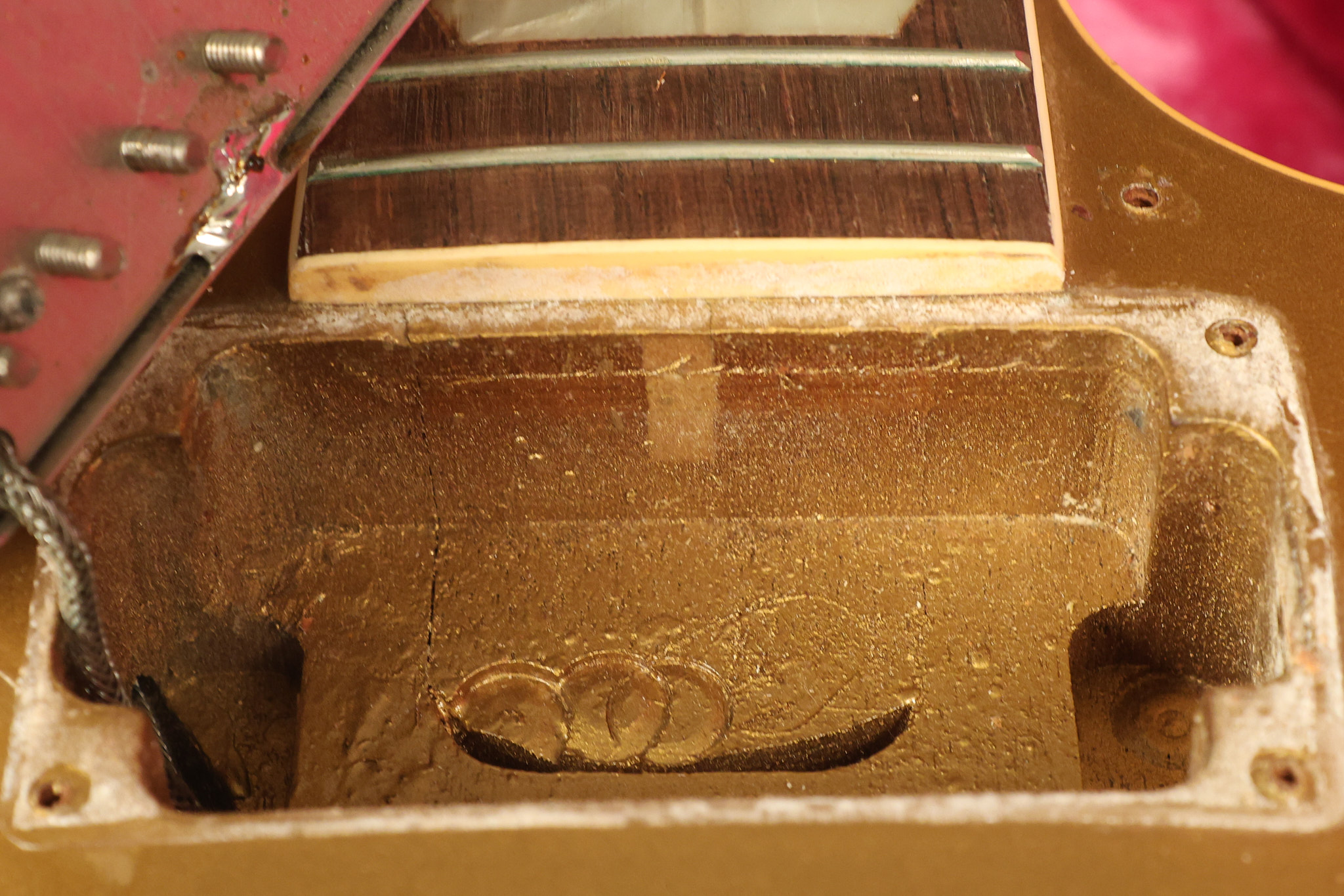 1957 Gibson Les Paul Goldtop with a rare carved top one-piece solid mahogany body in its original Goldtop finish. It has a great playing neck with great frets. It's all original and 100% complete along with its original hardshell case and Les Paul HANG TAG. It's in EXCELLENT condition with minor nicks + dings, very light belt buckle wear on the back of the body, a few minor finish cracks and other minor cosmetic wear including some nicks + dings around the top edges of the headstock that have been touched-up. The guitar itself remains structurally sound with no cracks, breaks or repairs. All electronics work and sound great with its original set of early PAF pickups. The cover for the neck position pickup is removable as the inside edge is not attached to the solder. All solder in the control cavities remain original and untampered with.