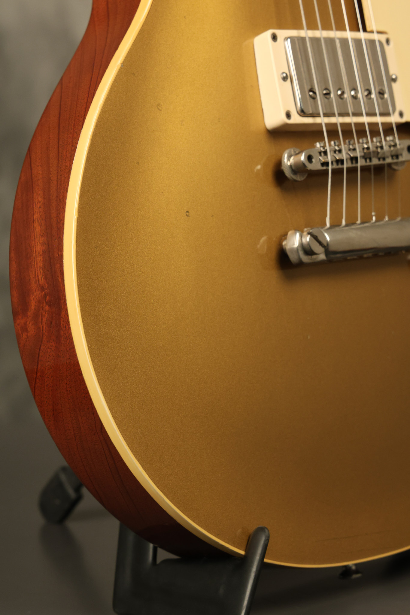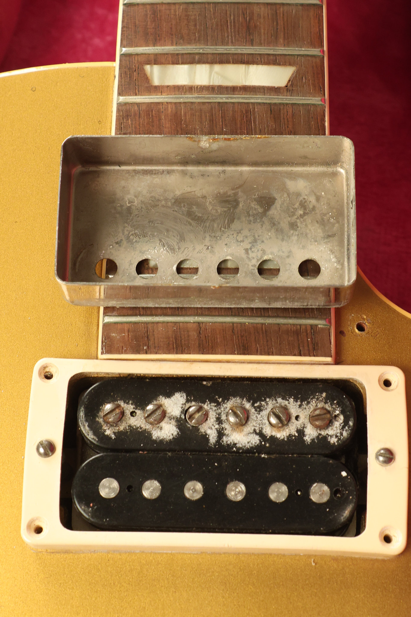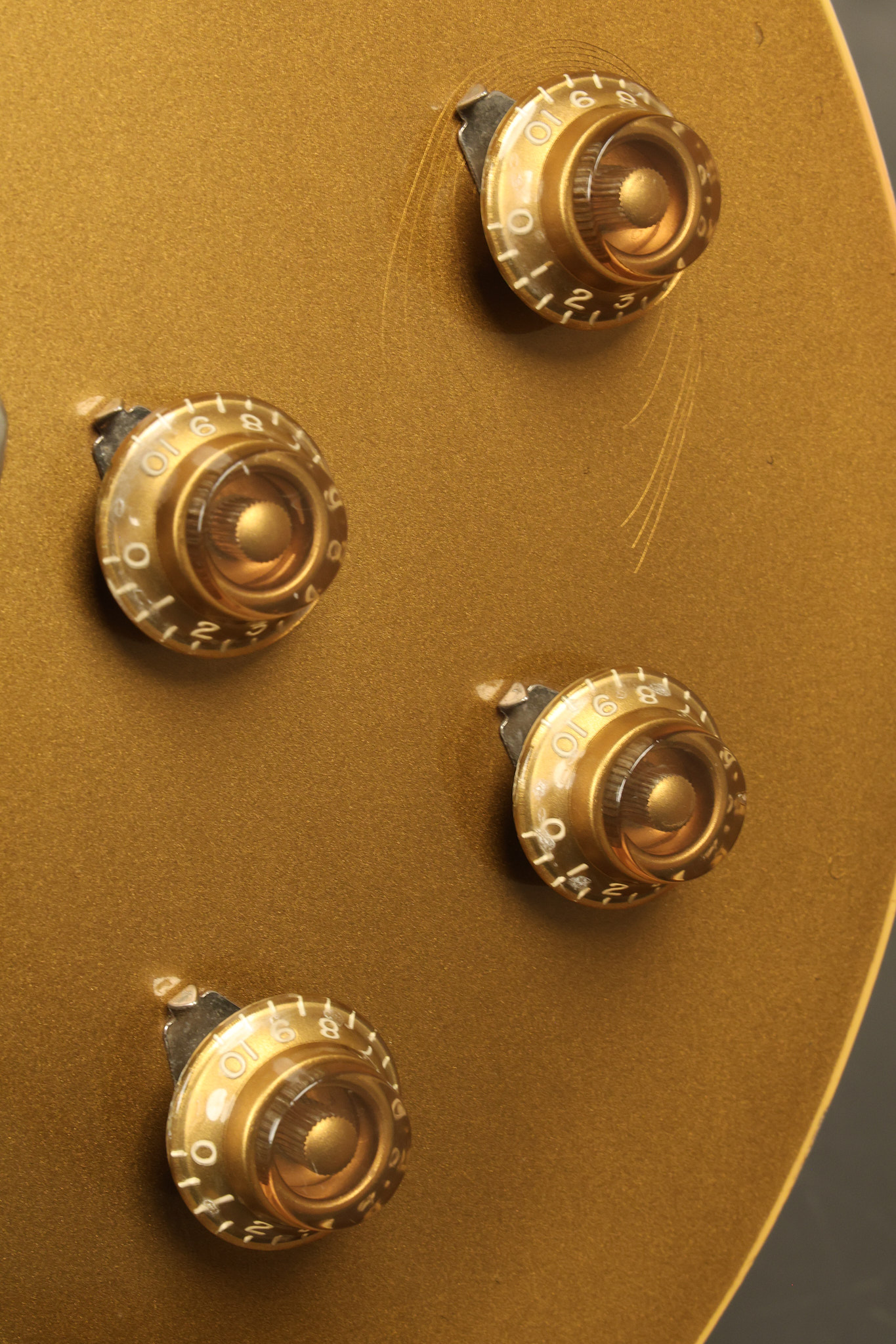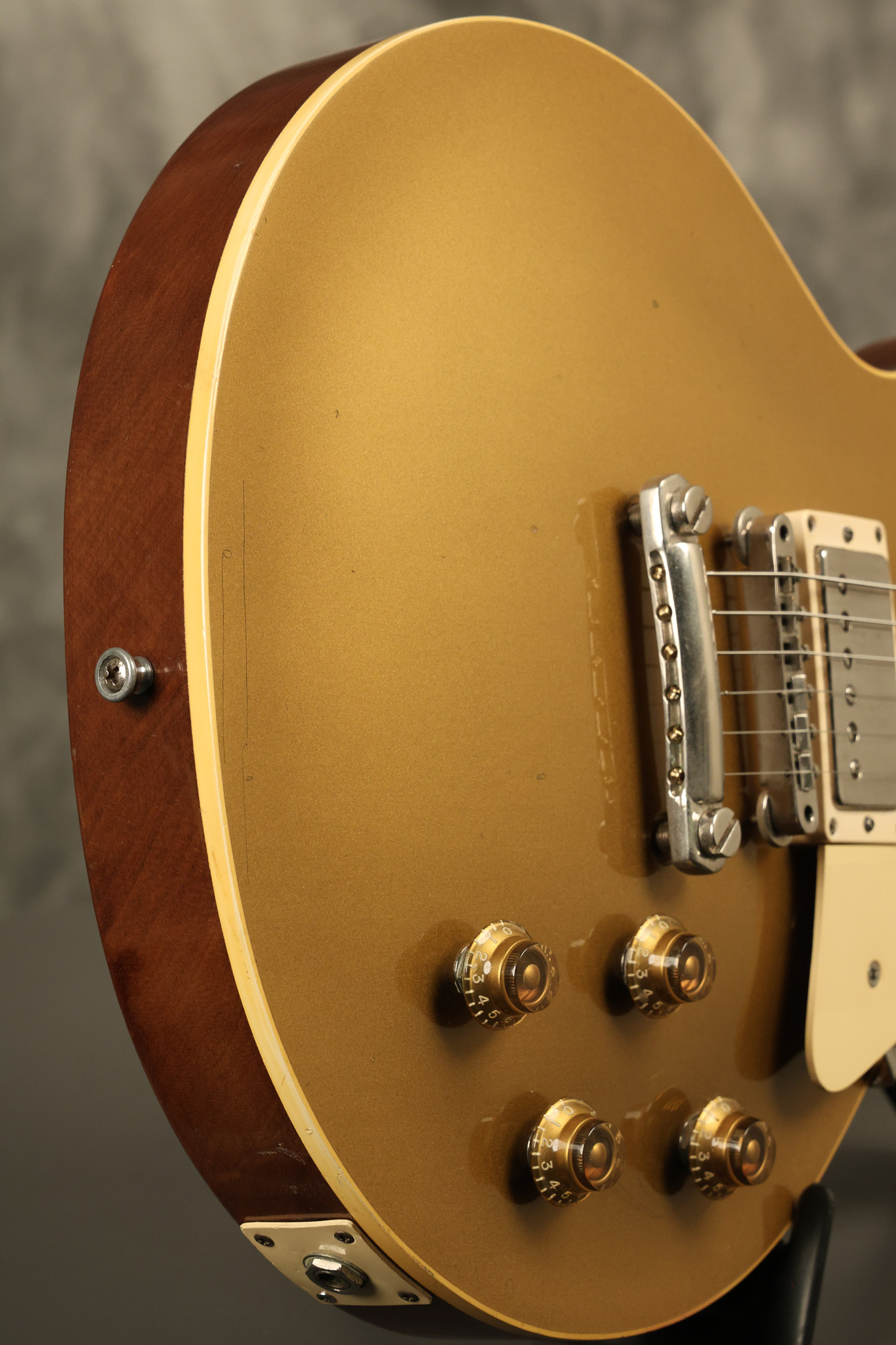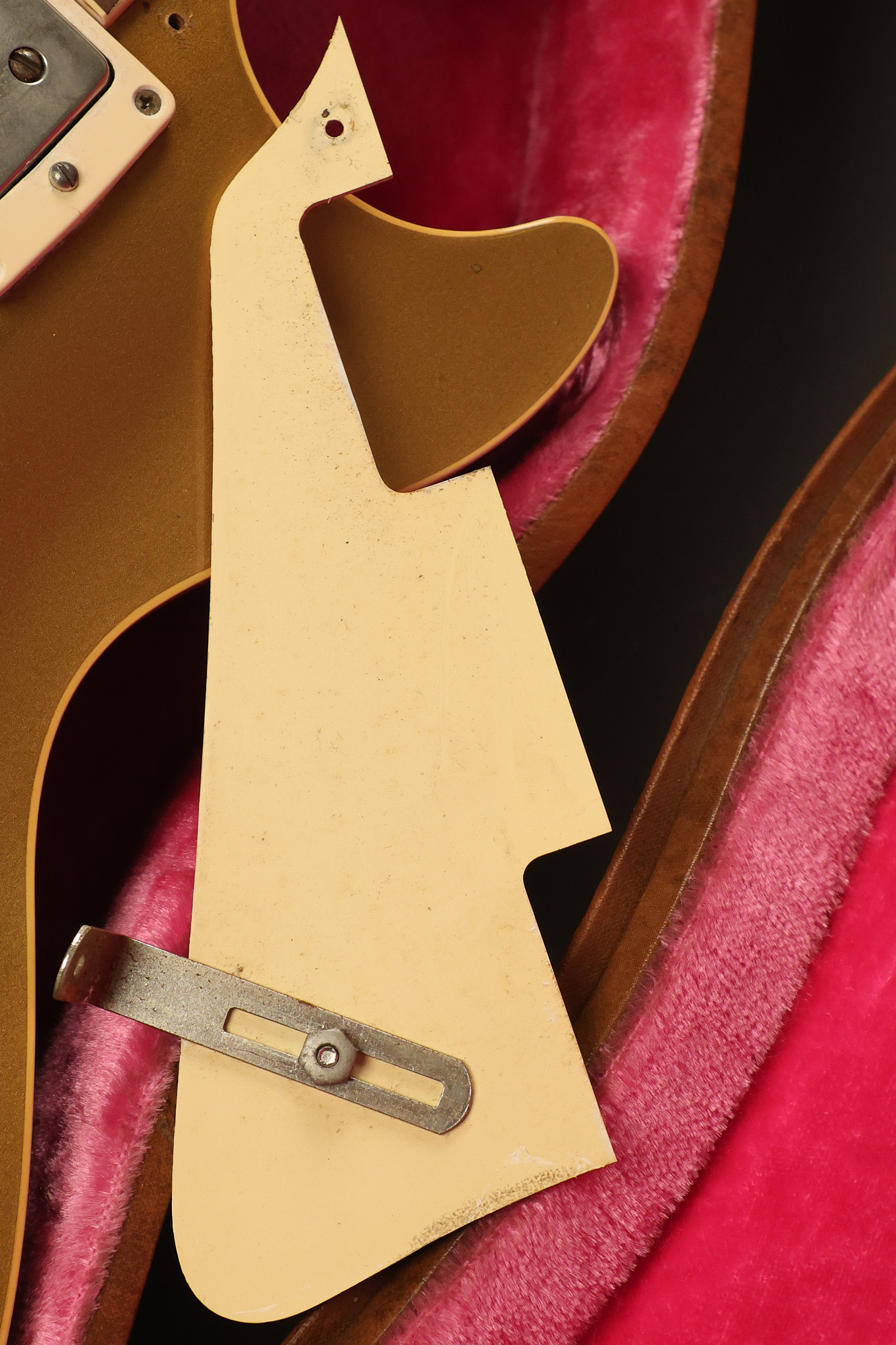 1957 Gibson Les Paul Goldtop with a rare carved top one-piece solid mahogany body in its original Goldtop finish. It has a great playing neck with great frets. It's all original and 100% complete along with its original hardshell case and Les Paul HANG TAG. It's in EXCELLENT condition with minor nicks + dings, very light belt buckle wear on the back of the body, a few minor finish cracks and other minor cosmetic wear including some nicks + dings around the top edges of the headstock that have been touched-up. The guitar itself remains structurally sound with no cracks, breaks or repairs. All electronics work and sound great with its original set of early PAF pickups. The cover for the neck position pickup is removable as the inside edge is not attached to the solder. All solder in the control cavities remain original and untampered with.