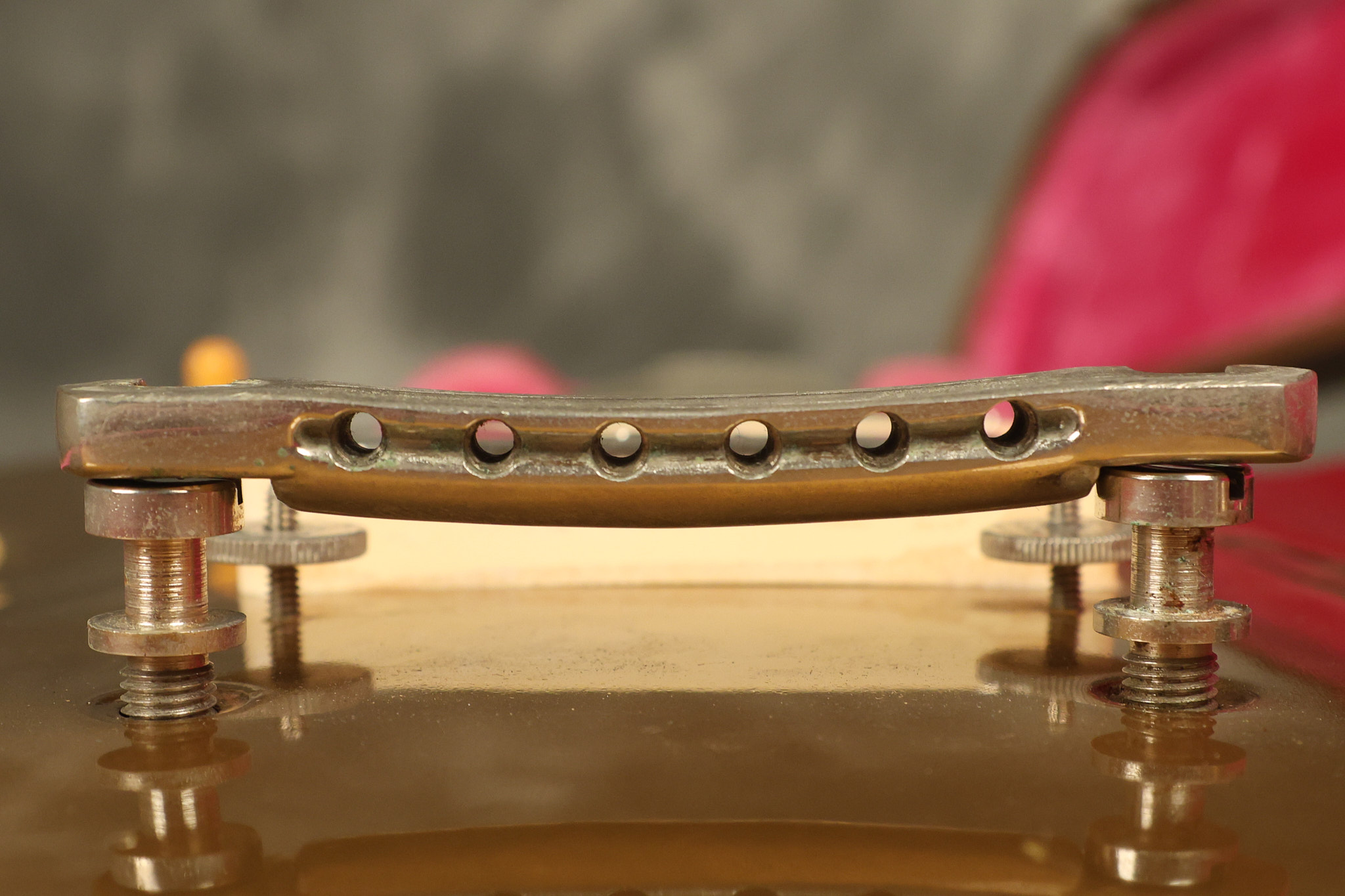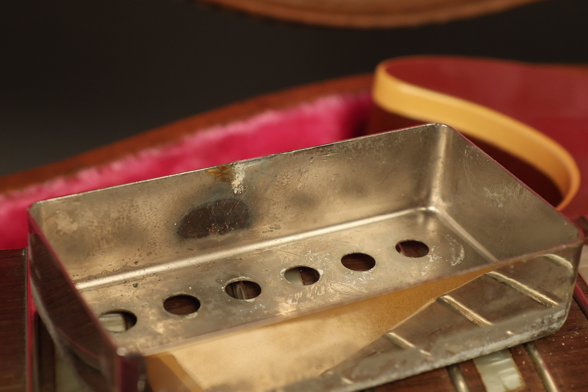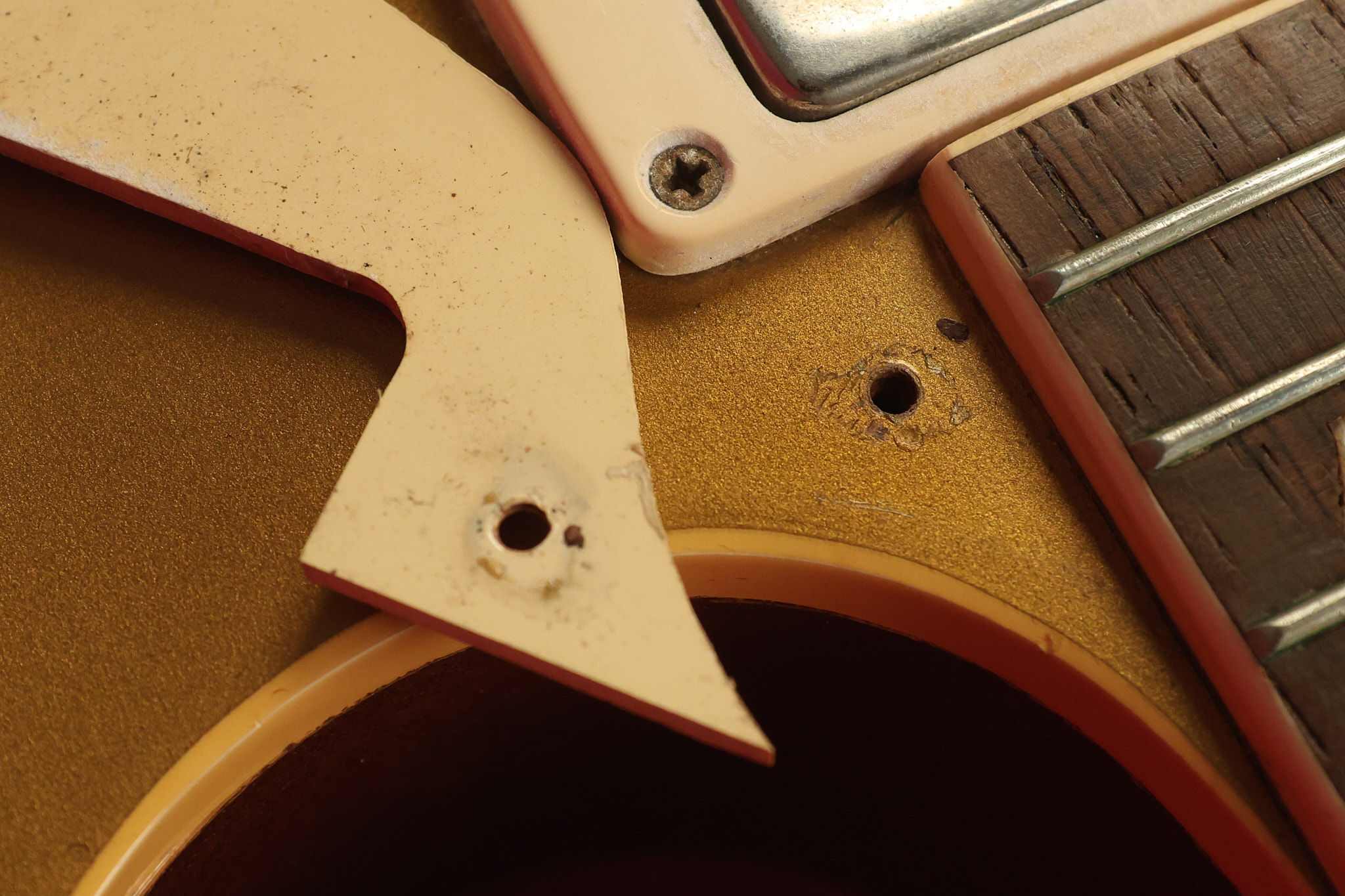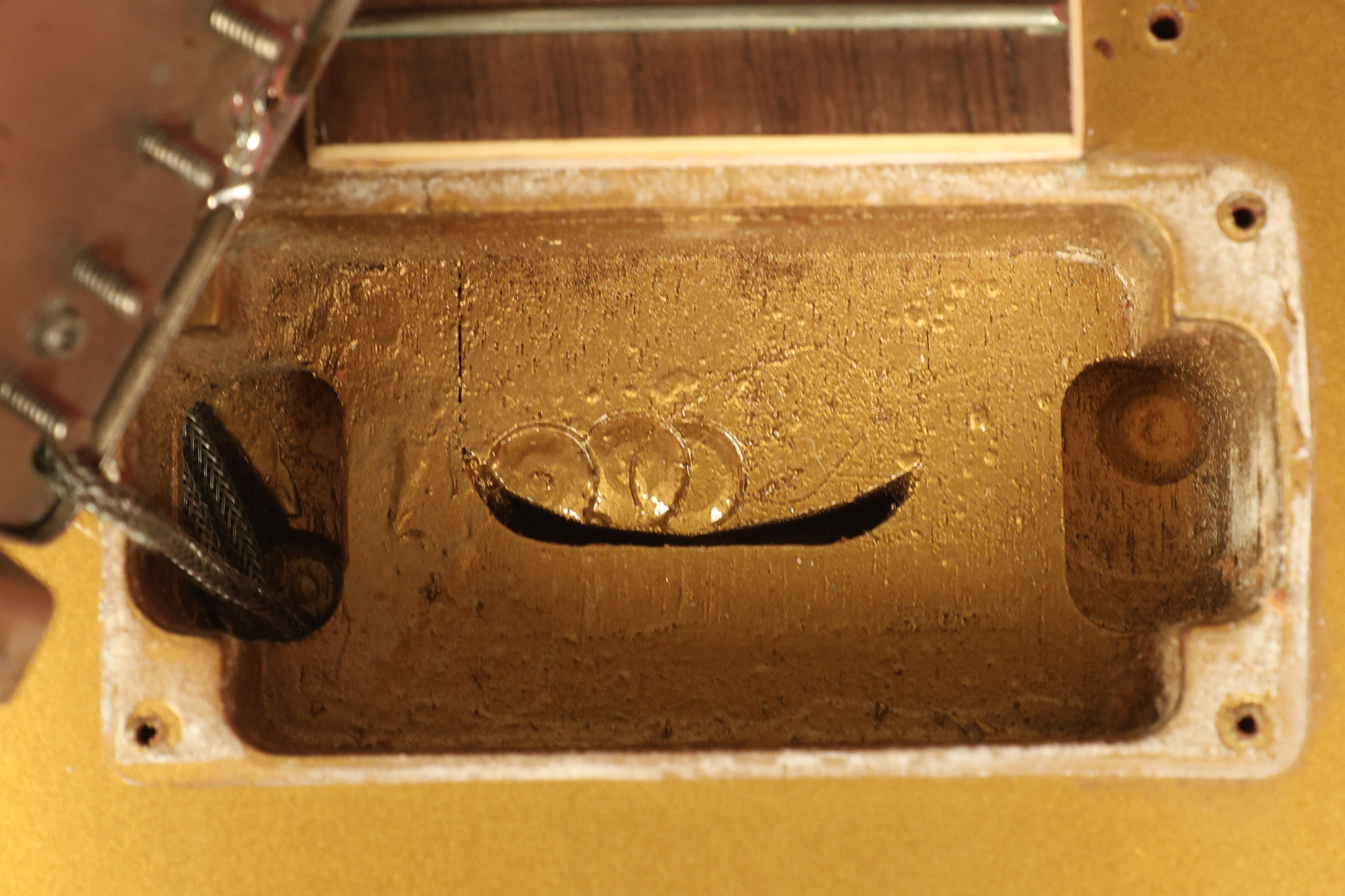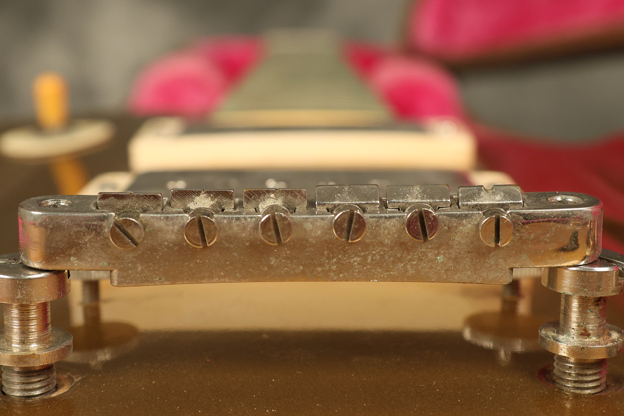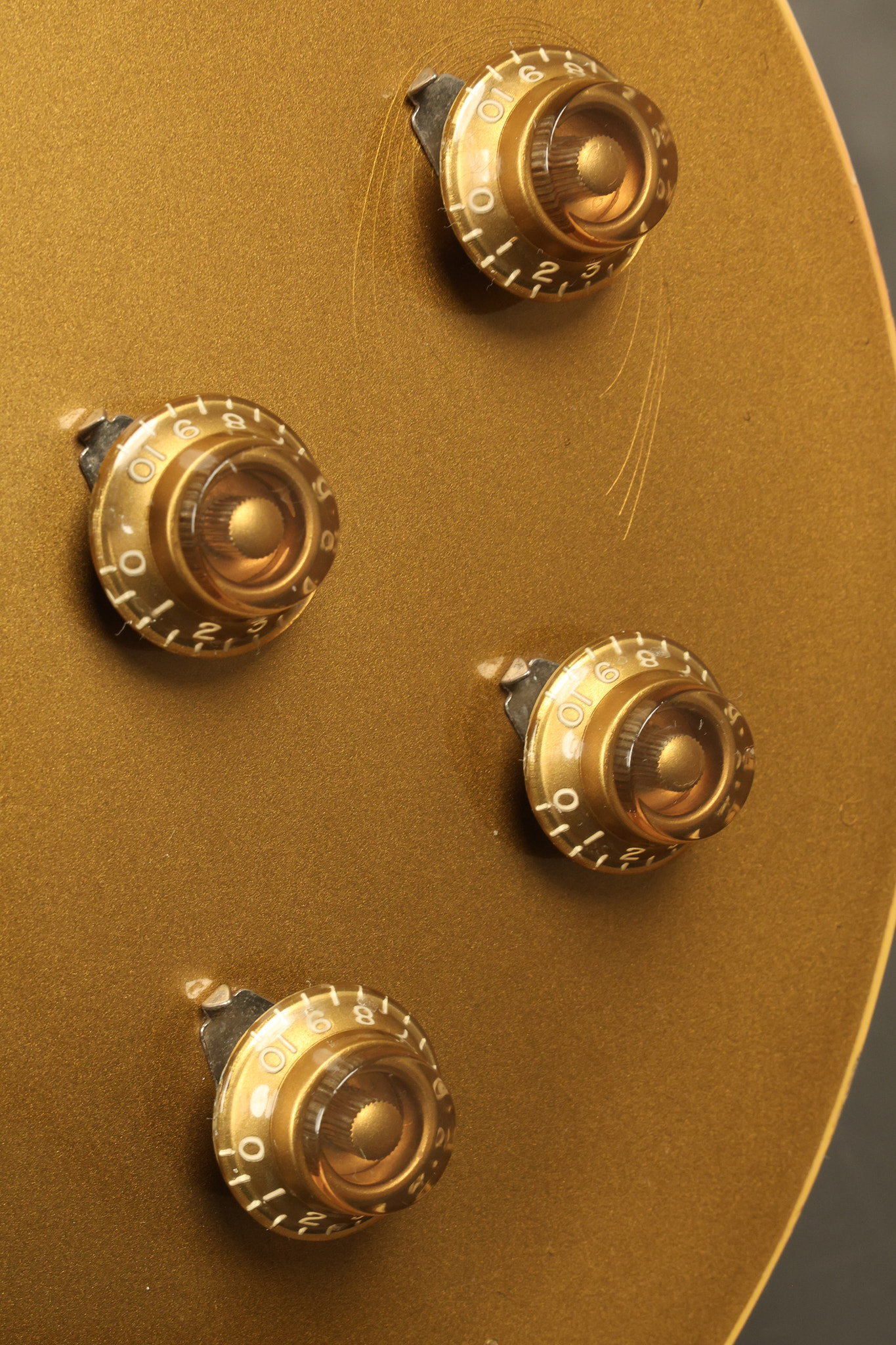 1957 Gibson Les Paul Goldtop with a rare carved top one-piece solid mahogany body in its original Goldtop finish. It has a great playing neck with great frets. It's all original and 100% complete along with its original hardshell case and Les Paul HANG TAG. It's in EXCELLENT condition with minor nicks + dings, very light belt buckle wear on the back of the body, a few minor finish cracks and other minor cosmetic wear including some nicks + dings around the top edges of the headstock that have been touched-up. The guitar itself remains structurally sound with no cracks, breaks or repairs. All electronics work and sound great with its original set of early PAF pickups. The cover for the neck position pickup is removable as the inside edge is not attached to the solder. All solder in the control cavities remain original and untampered with.