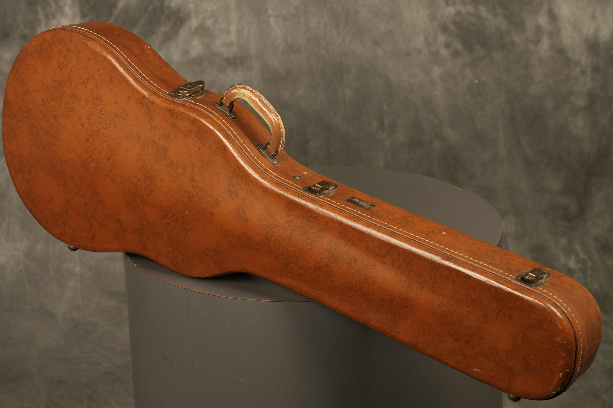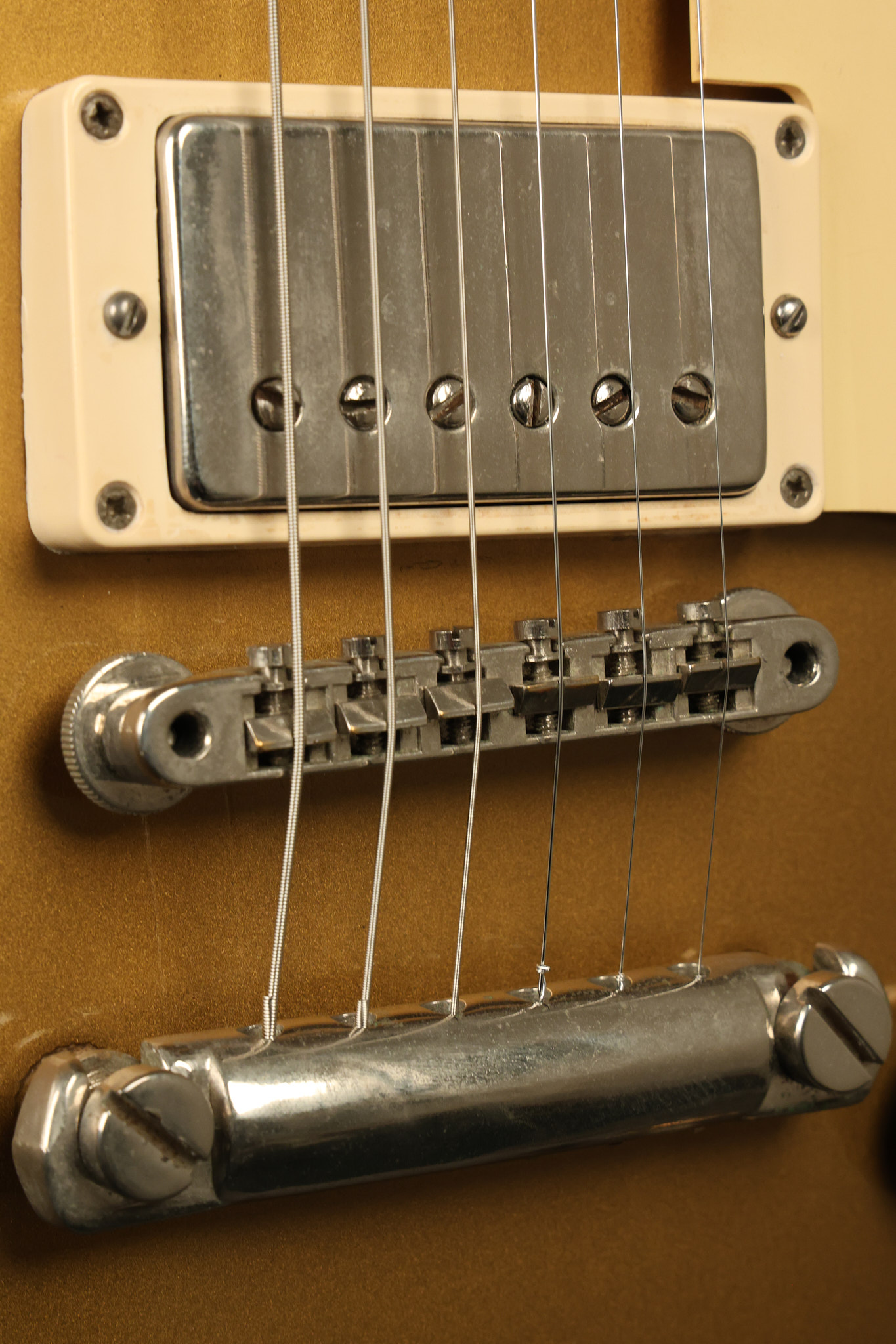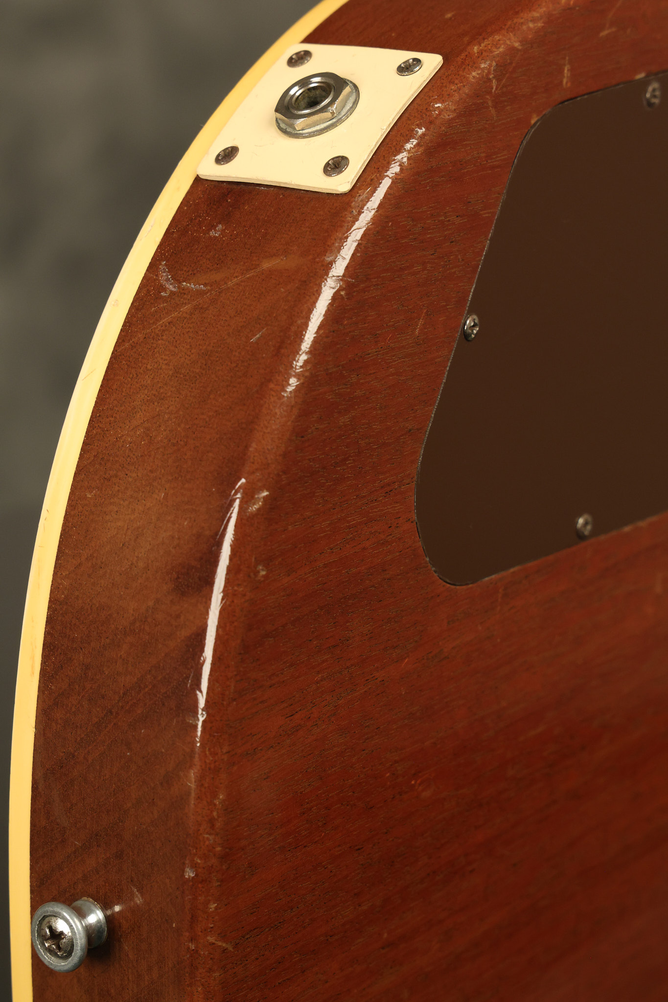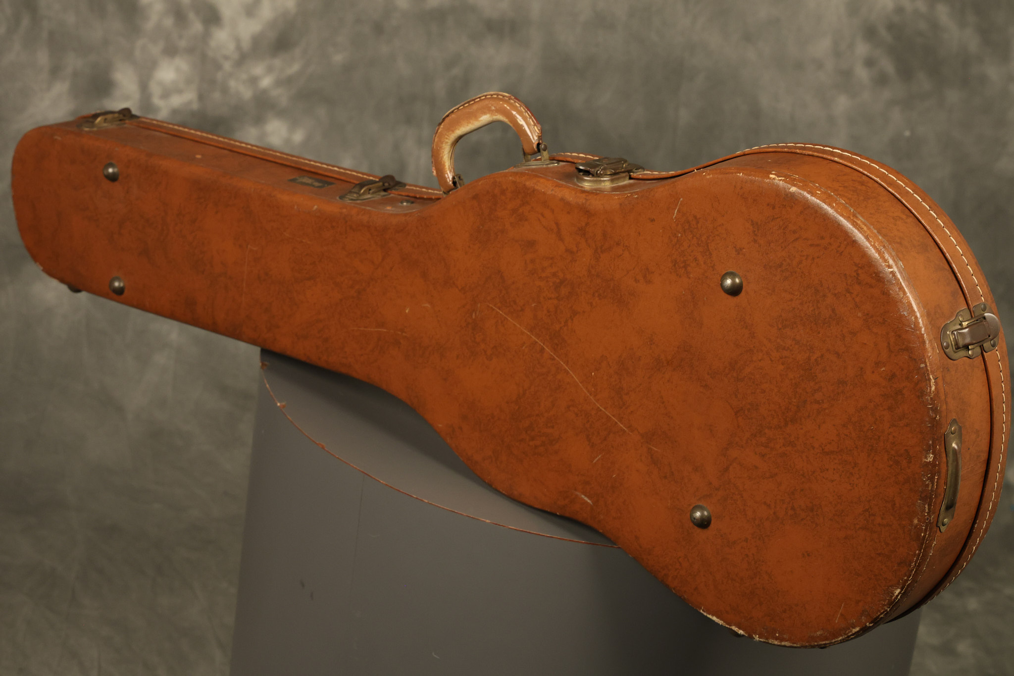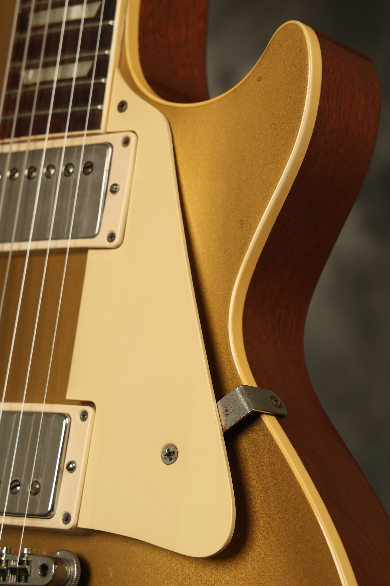 1957 Gibson Les Paul Goldtop with a rare carved top one-piece solid mahogany body in its original Goldtop finish. It has a great playing neck with great frets. It's all original and 100% complete along with its original hardshell case and Les Paul HANG TAG. It's in EXCELLENT condition with minor nicks + dings, very light belt buckle wear on the back of the body, a few minor finish cracks and other minor cosmetic wear including some nicks + dings around the top edges of the headstock that have been touched-up. The guitar itself remains structurally sound with no cracks, breaks or repairs. All electronics work and sound great with its original set of early PAF pickups. The cover for the neck position pickup is removable as the inside edge is not attached to the solder. All solder in the control cavities remain original and untampered with.
