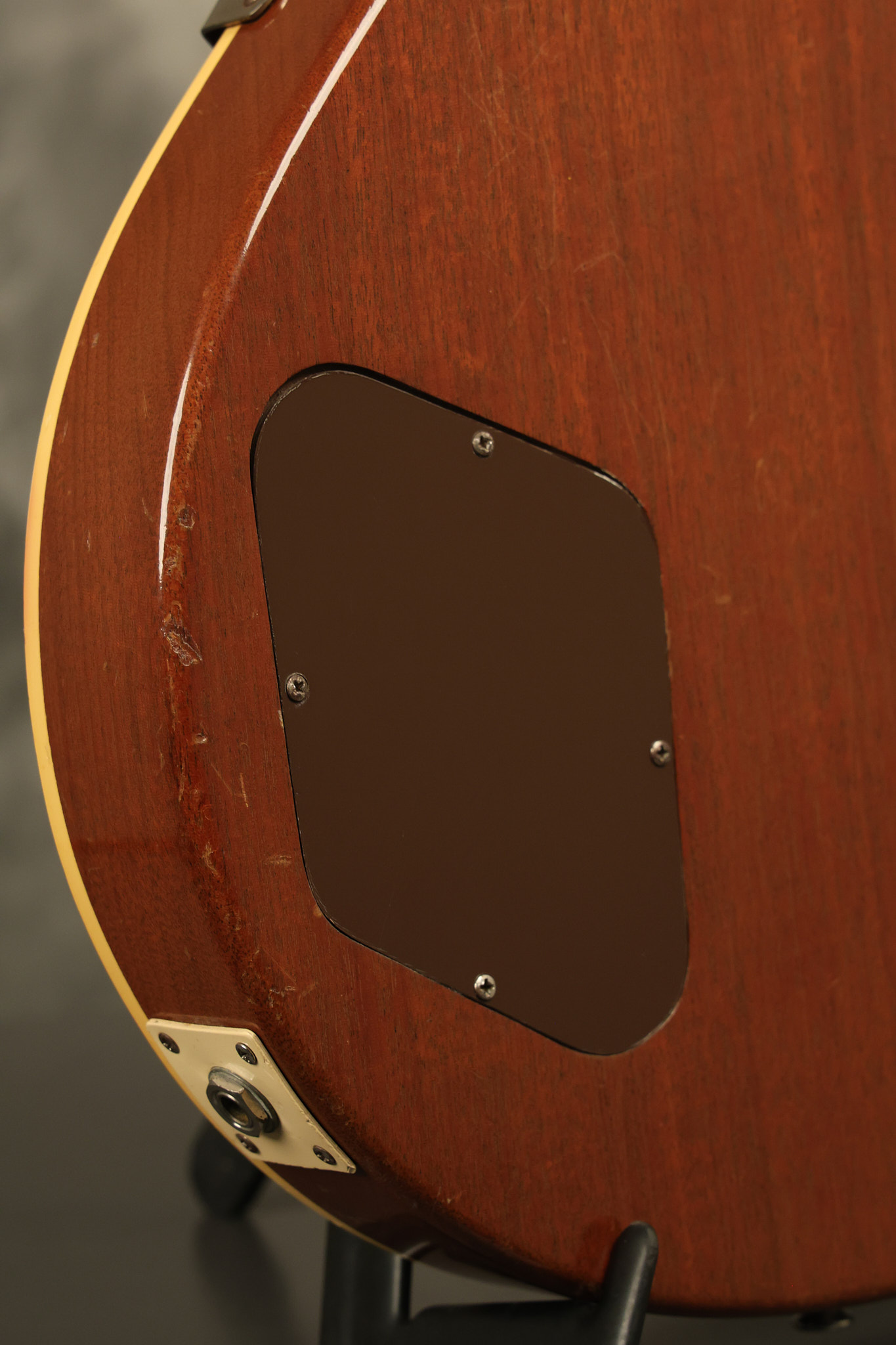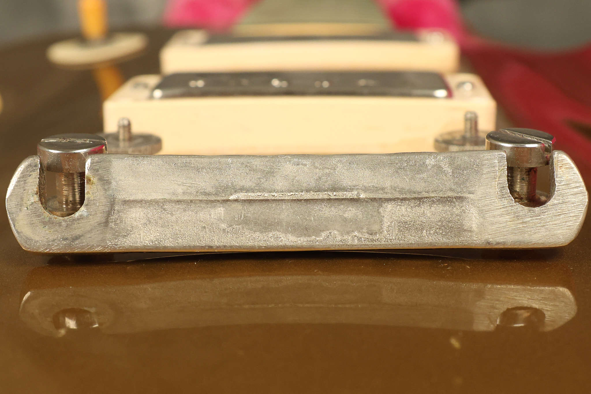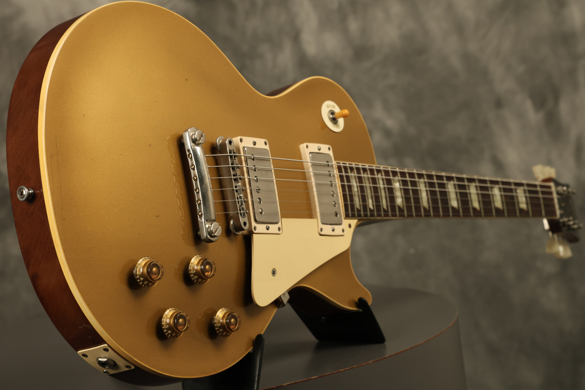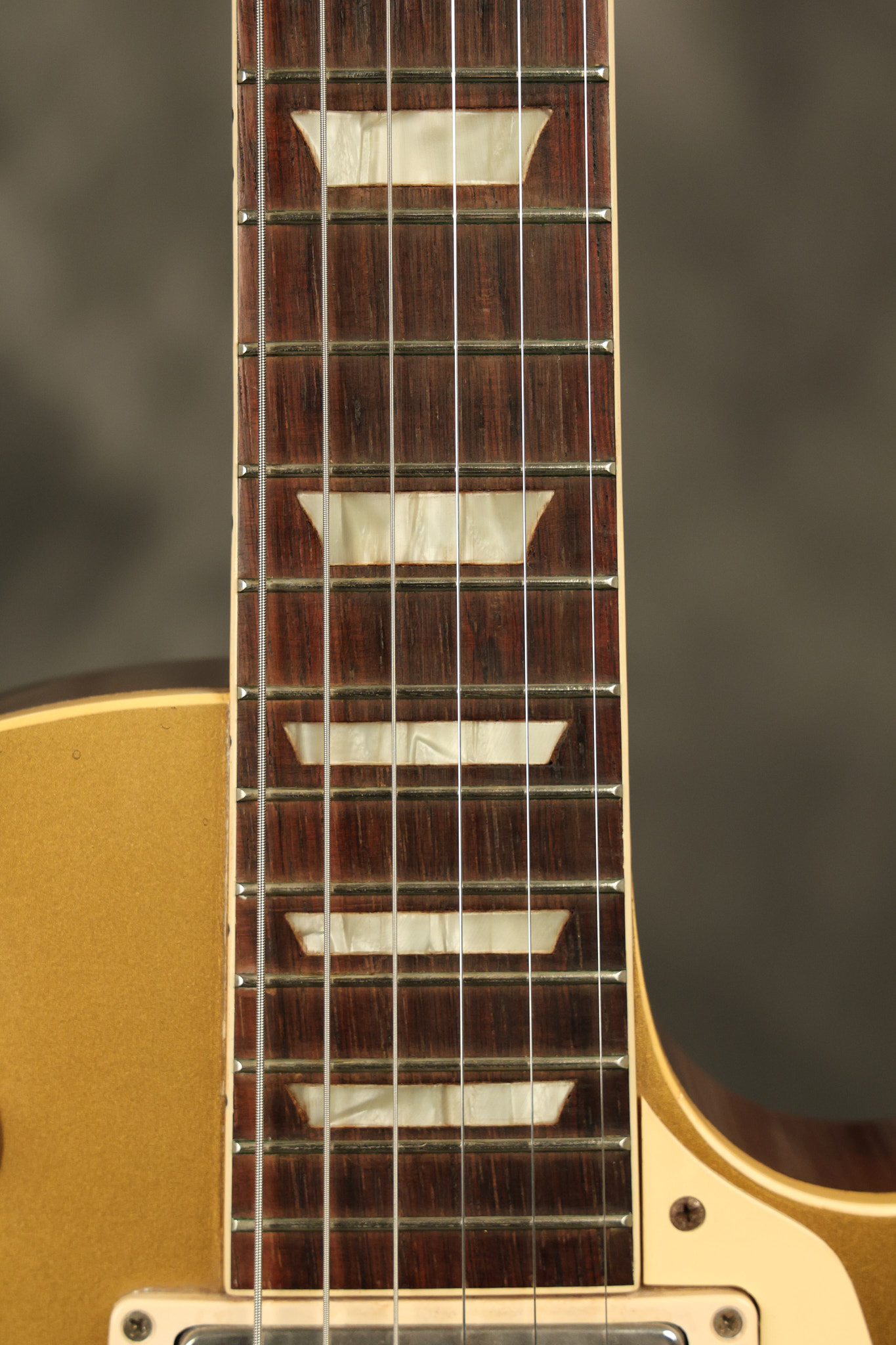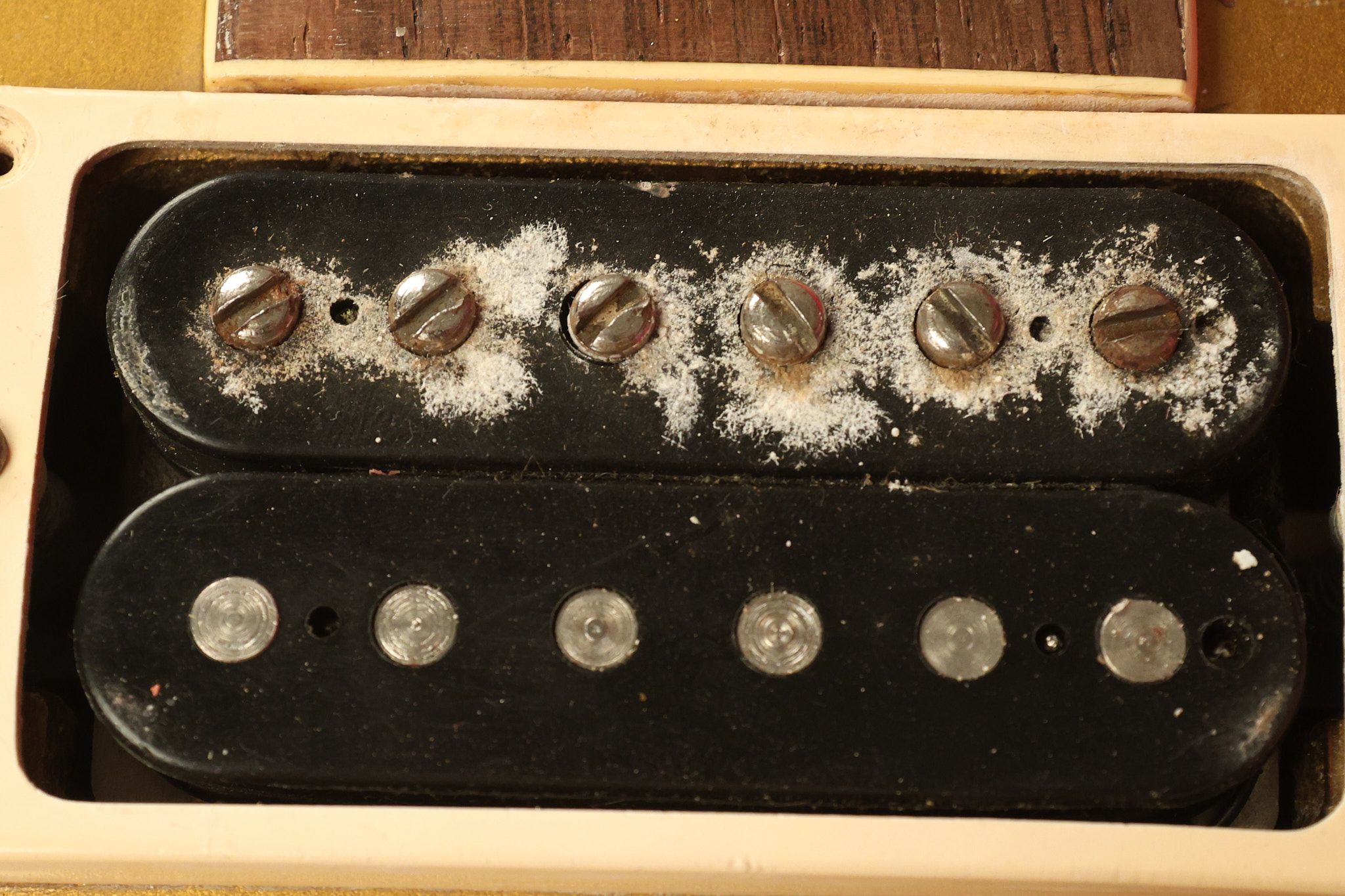 1957 Gibson Les Paul Goldtop with a rare carved top one-piece solid mahogany body in its original Goldtop finish. It has a great playing neck with great frets. It's all original and 100% complete along with its original hardshell case and Les Paul HANG TAG. It's in EXCELLENT condition with minor nicks + dings, very light belt buckle wear on the back of the body, a few minor finish cracks and other minor cosmetic wear including some nicks + dings around the top edges of the headstock that have been touched-up. The guitar itself remains structurally sound with no cracks, breaks or repairs. All electronics work and sound great with its original set of early PAF pickups. The cover for the neck position pickup is removable as the inside edge is not attached to the solder. All solder in the control cavities remain original and untampered with.
