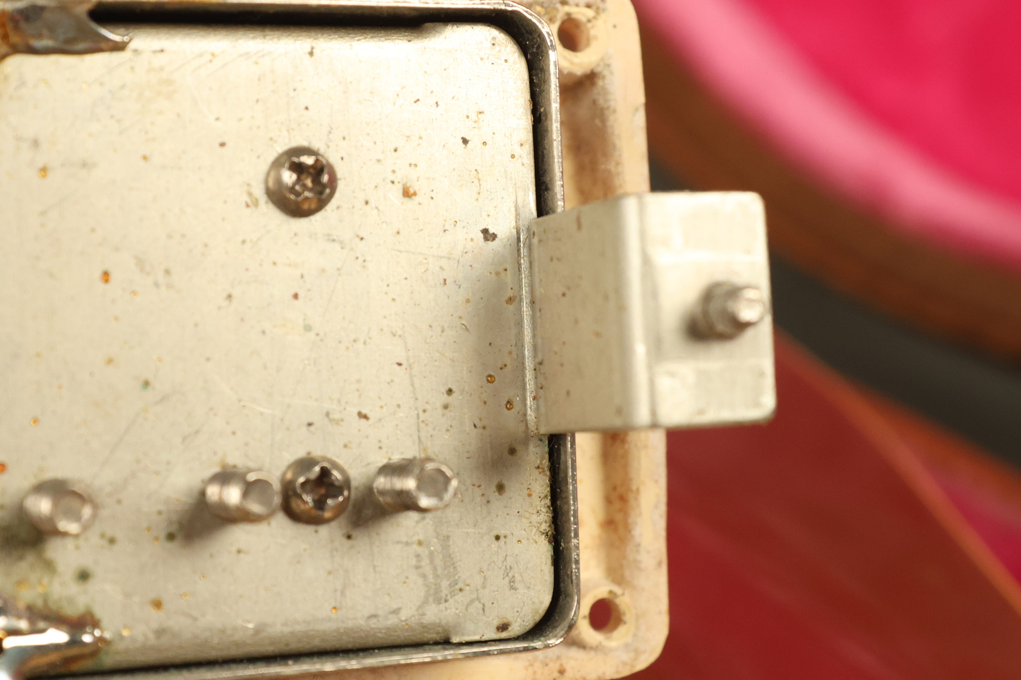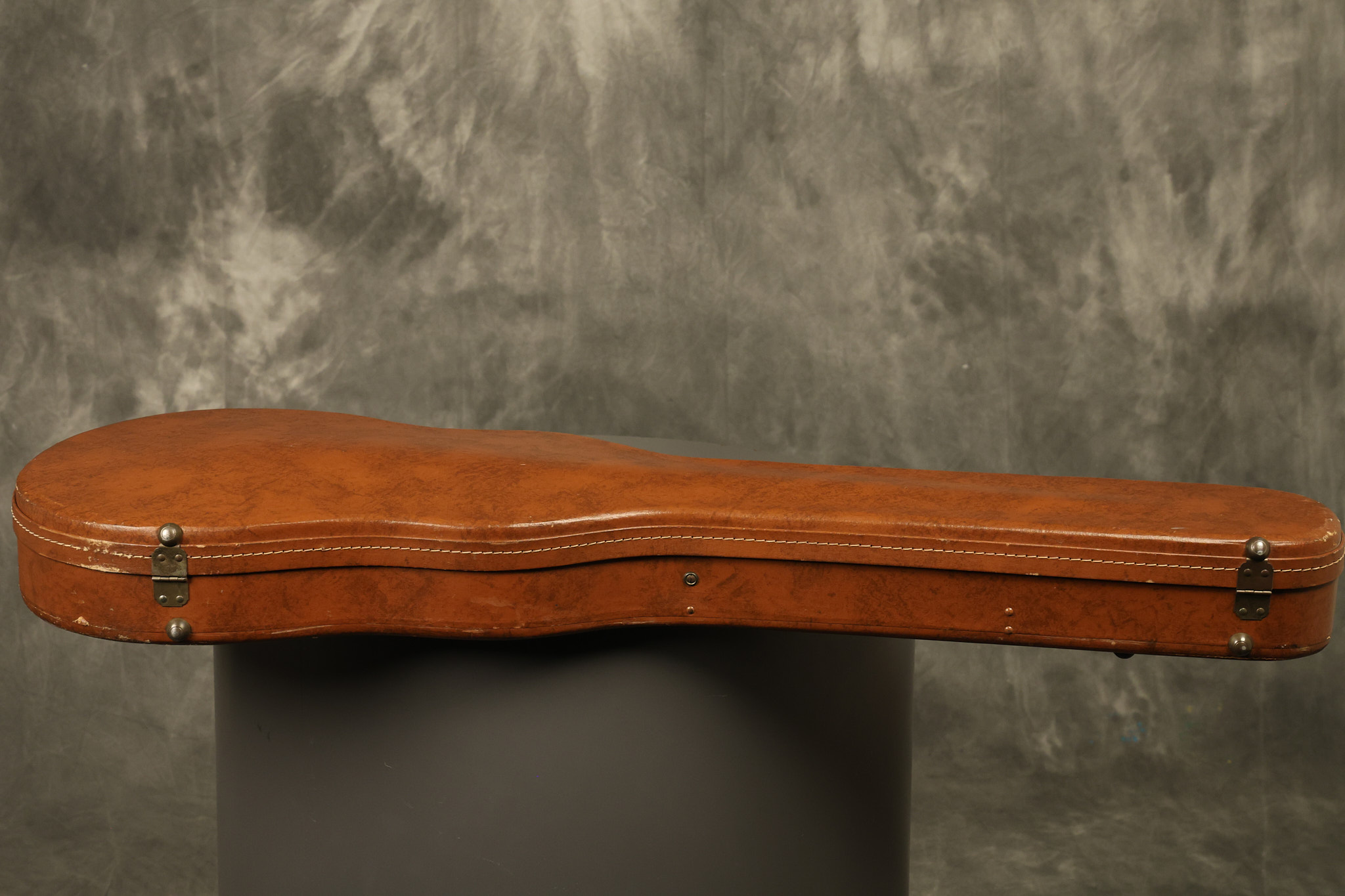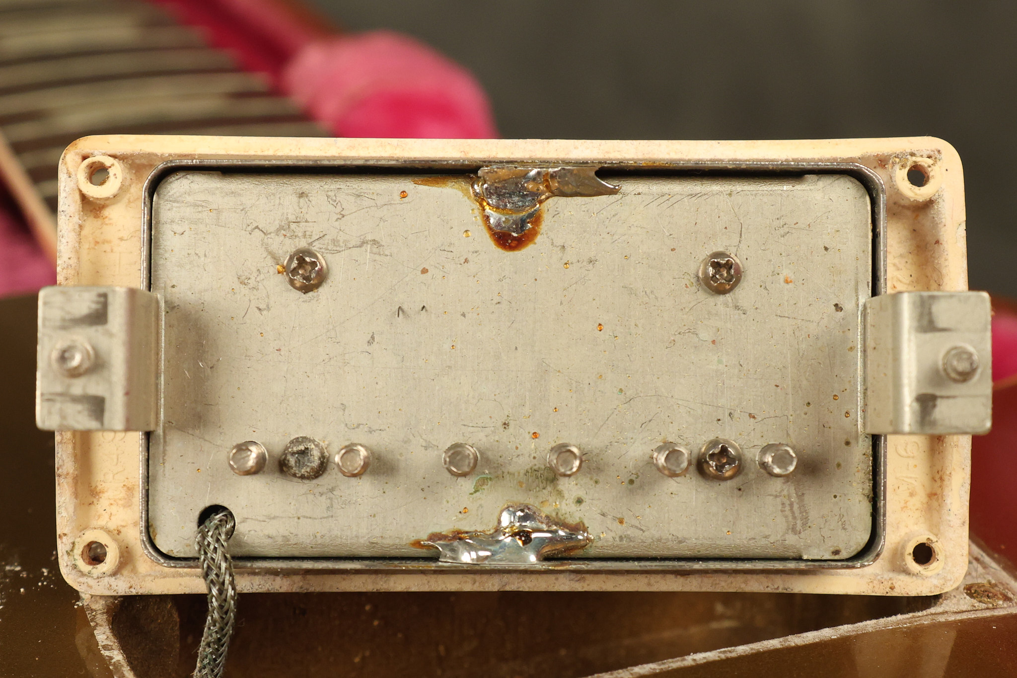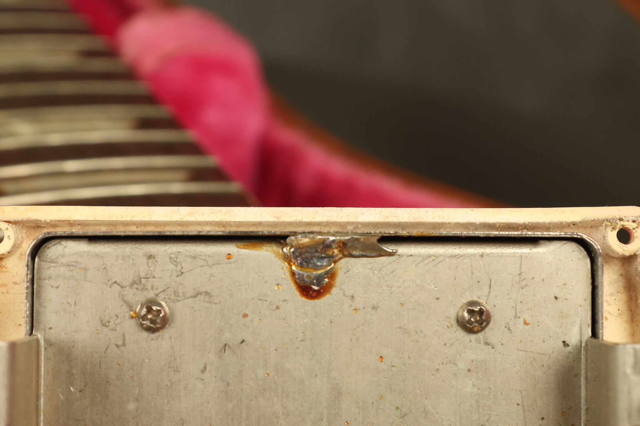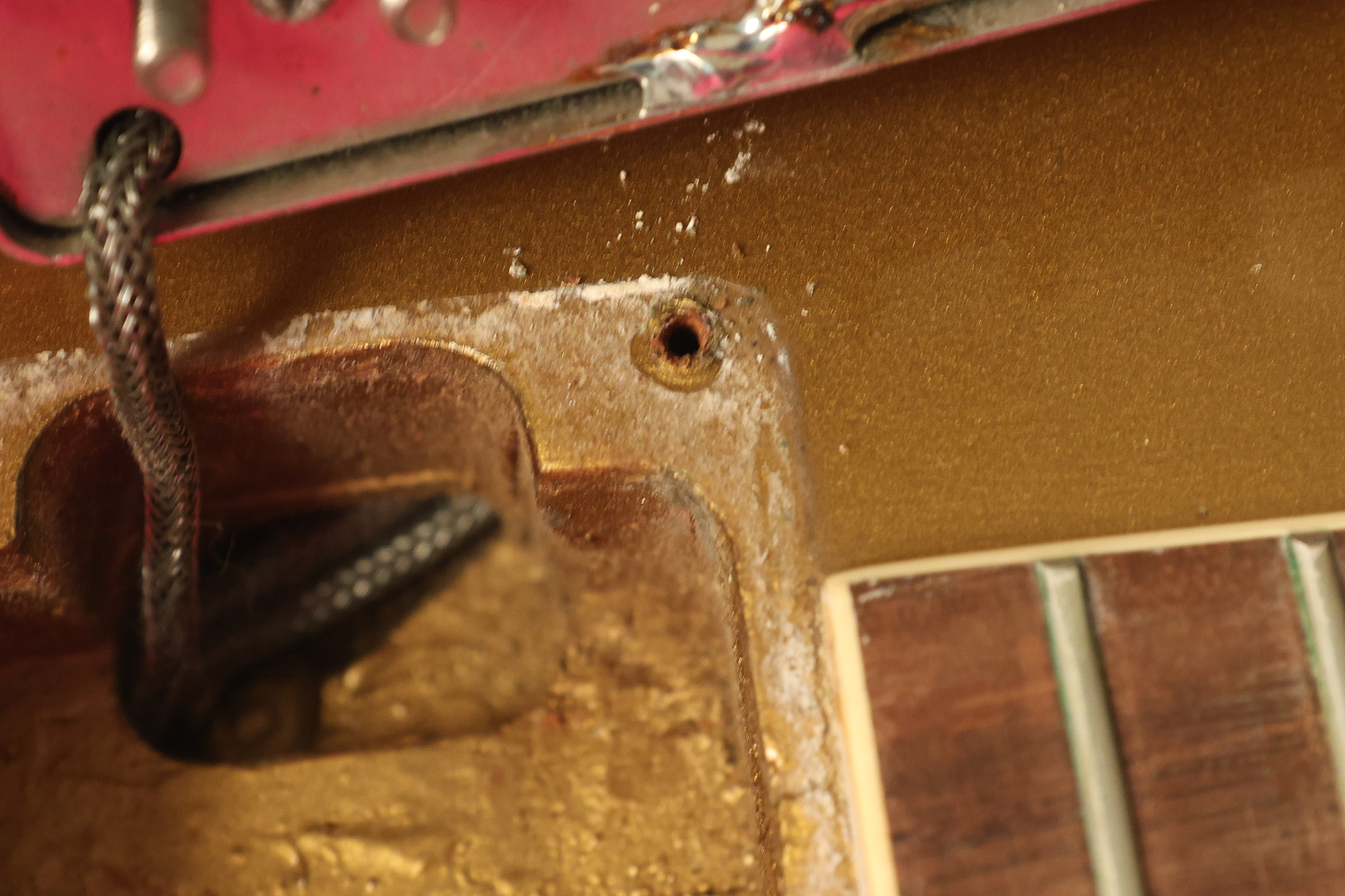 1957 Gibson Les Paul Goldtop with a rare carved top one-piece solid mahogany body in its original Goldtop finish. It has a great playing neck with great frets. It's all original and 100% complete along with its original hardshell case and Les Paul HANG TAG. It's in EXCELLENT condition with minor nicks + dings, very light belt buckle wear on the back of the body, a few minor finish cracks and other minor cosmetic wear including some nicks + dings around the top edges of the headstock that have been touched-up. The guitar itself remains structurally sound with no cracks, breaks or repairs. All electronics work and sound great with its original set of early PAF pickups. The cover for the neck position pickup is removable as the inside edge is not attached to the solder. All solder in the control cavities remain original and untampered with.