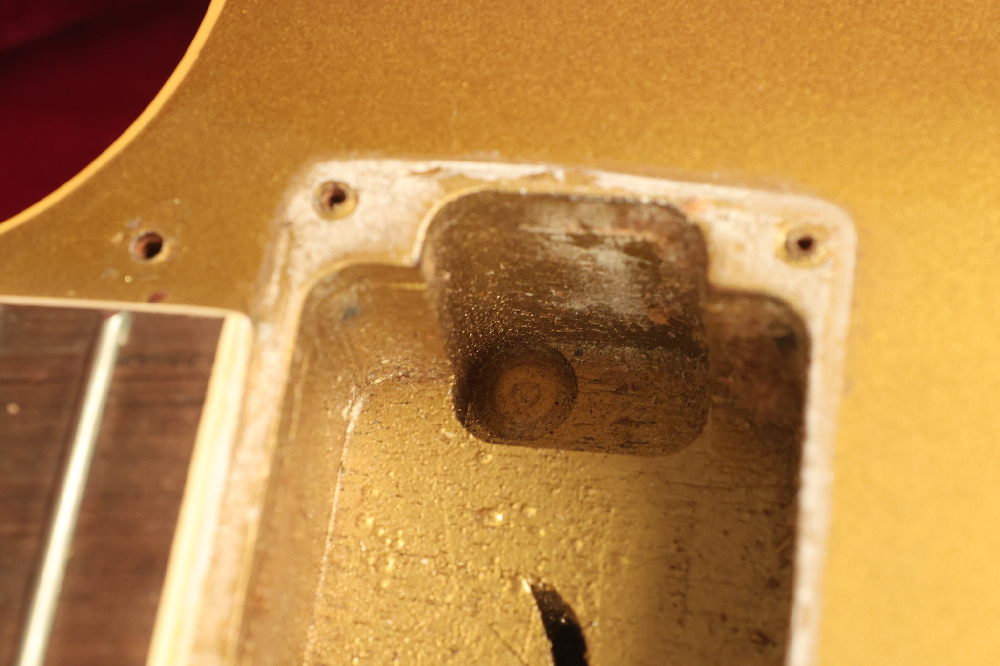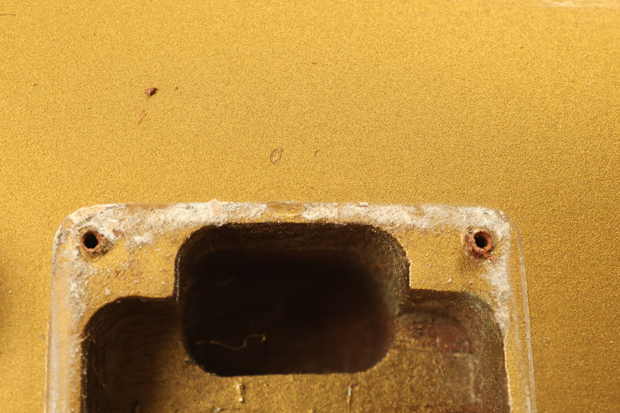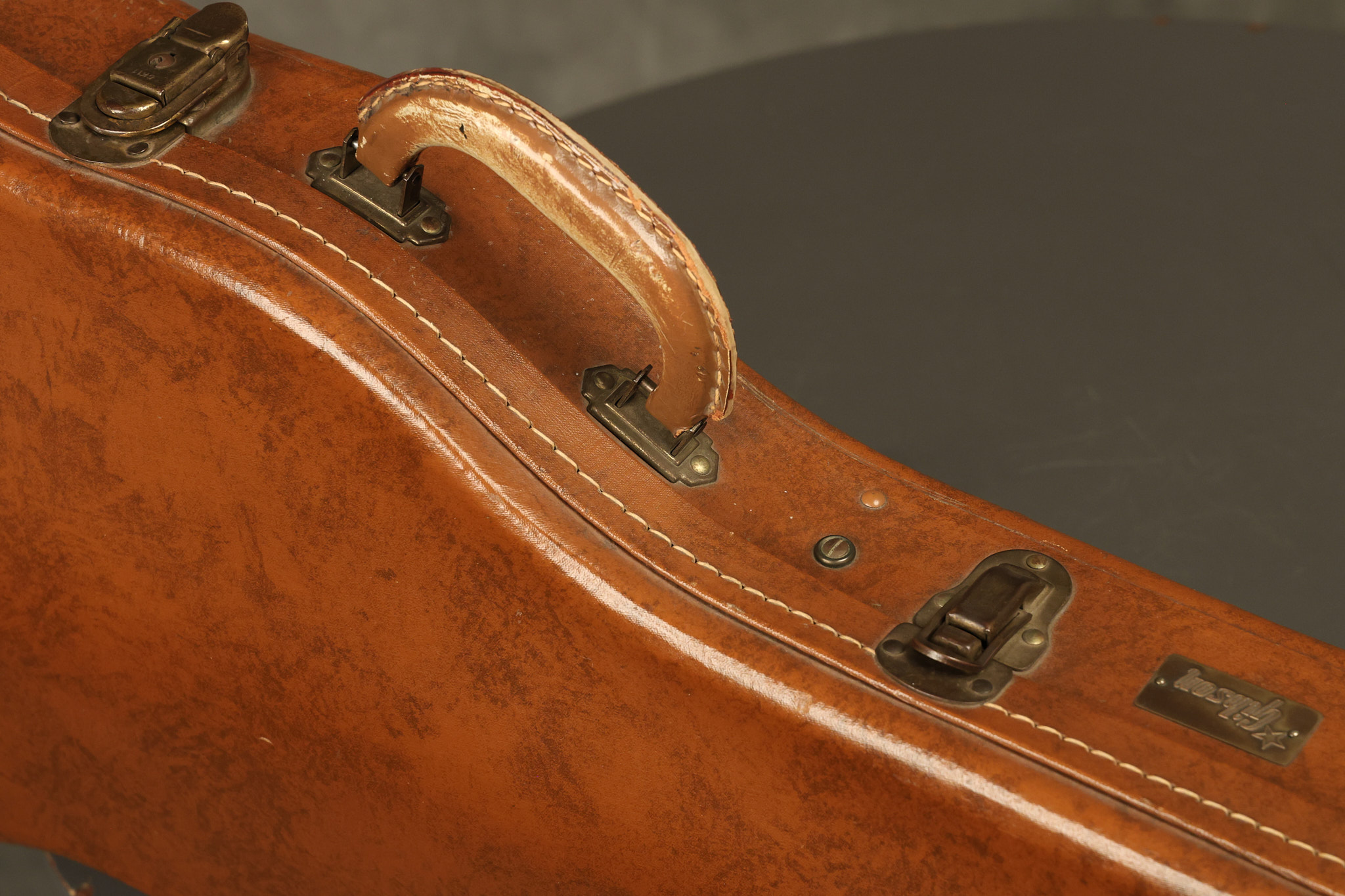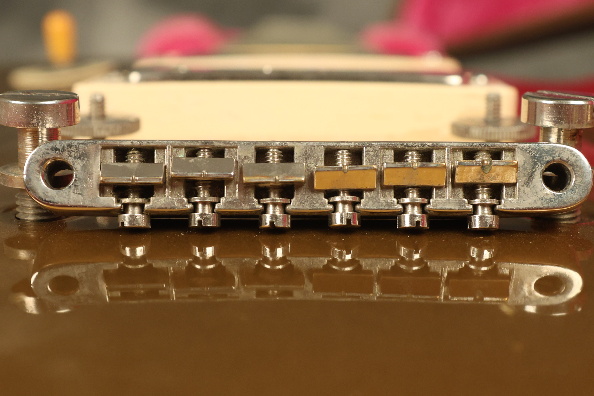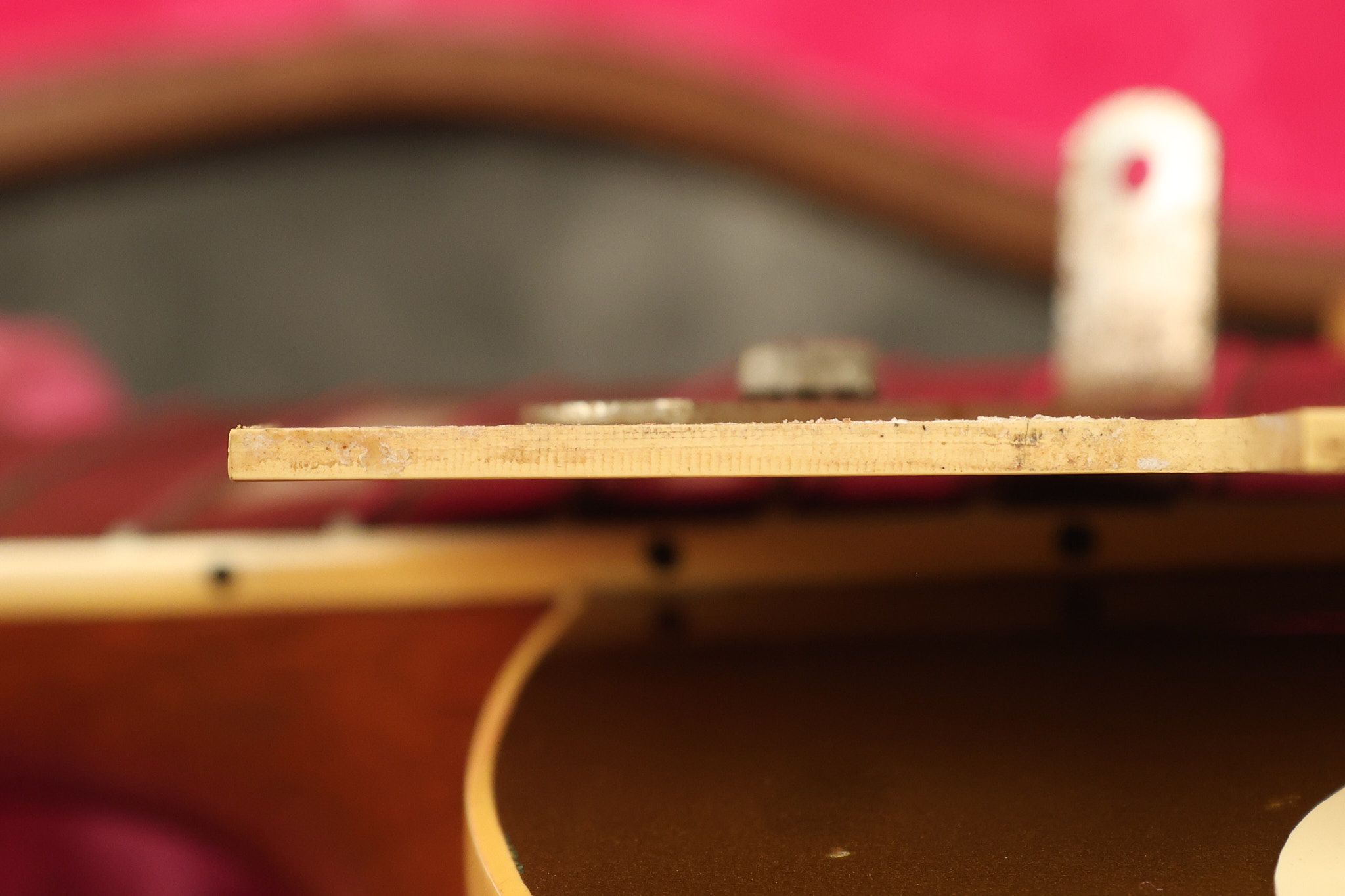 1957 Gibson Les Paul Goldtop with a rare carved top one-piece solid mahogany body in its original Goldtop finish. It has a great playing neck with great frets. It's all original and 100% complete along with its original hardshell case and Les Paul HANG TAG. It's in EXCELLENT condition with minor nicks + dings, very light belt buckle wear on the back of the body, a few minor finish cracks and other minor cosmetic wear including some nicks + dings around the top edges of the headstock that have been touched-up. The guitar itself remains structurally sound with no cracks, breaks or repairs. All electronics work and sound great with its original set of early PAF pickups. The cover for the neck position pickup is removable as the inside edge is not attached to the solder. All solder in the control cavities remain original and untampered with.