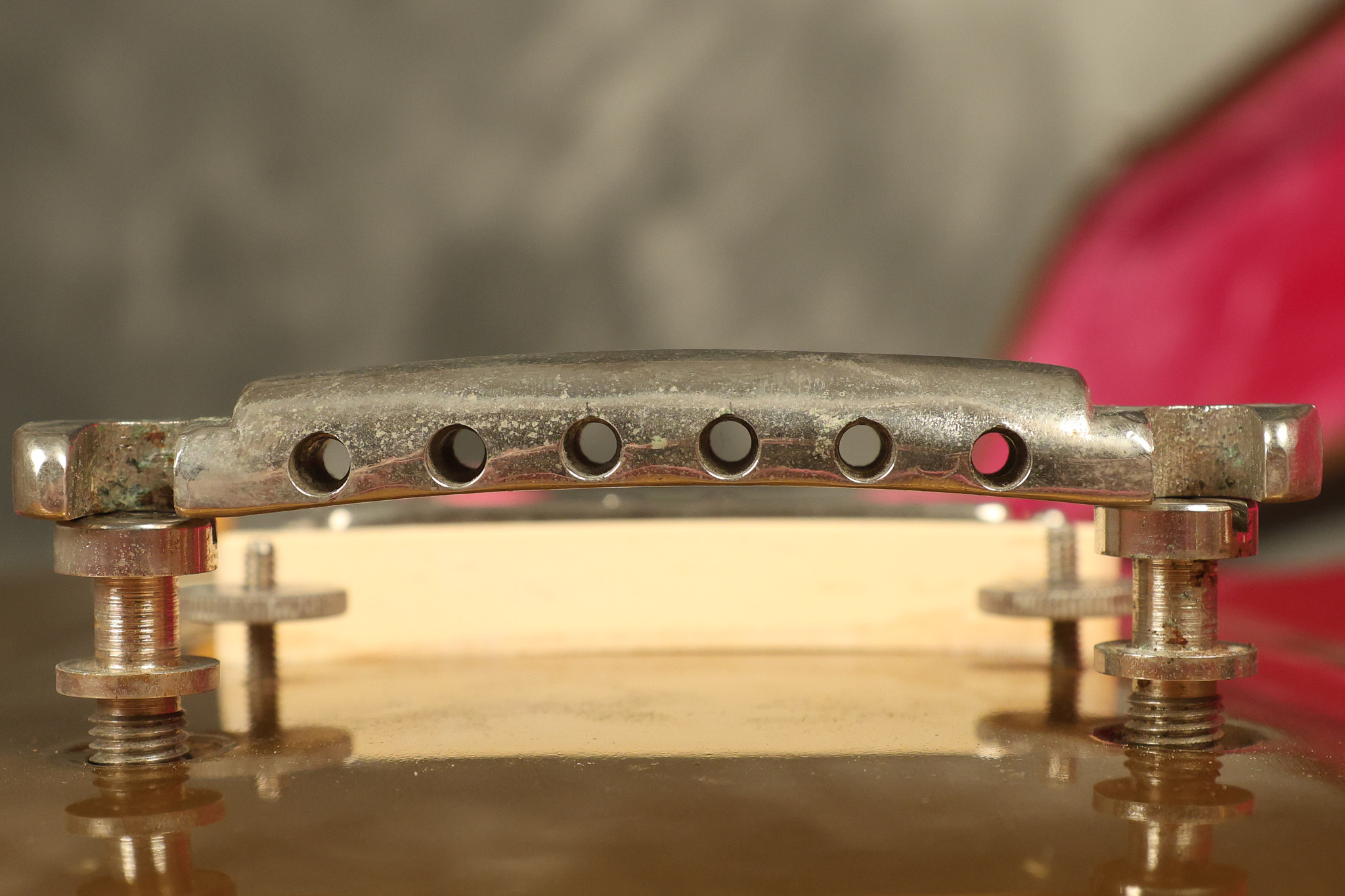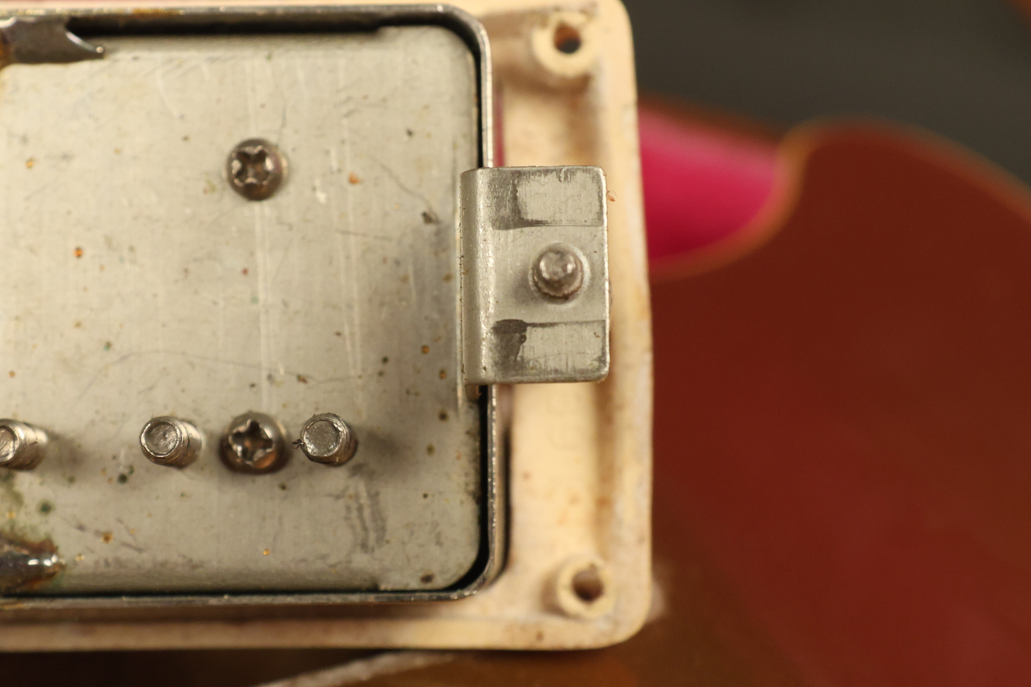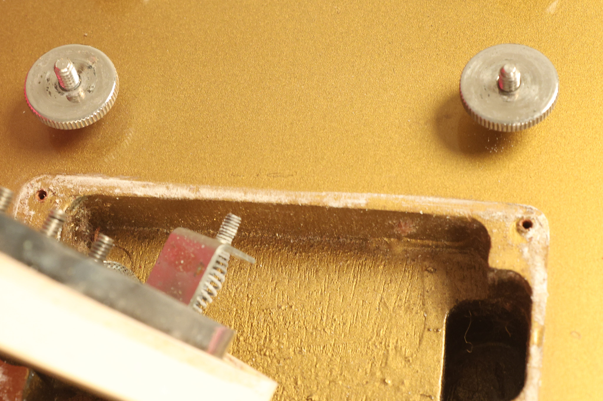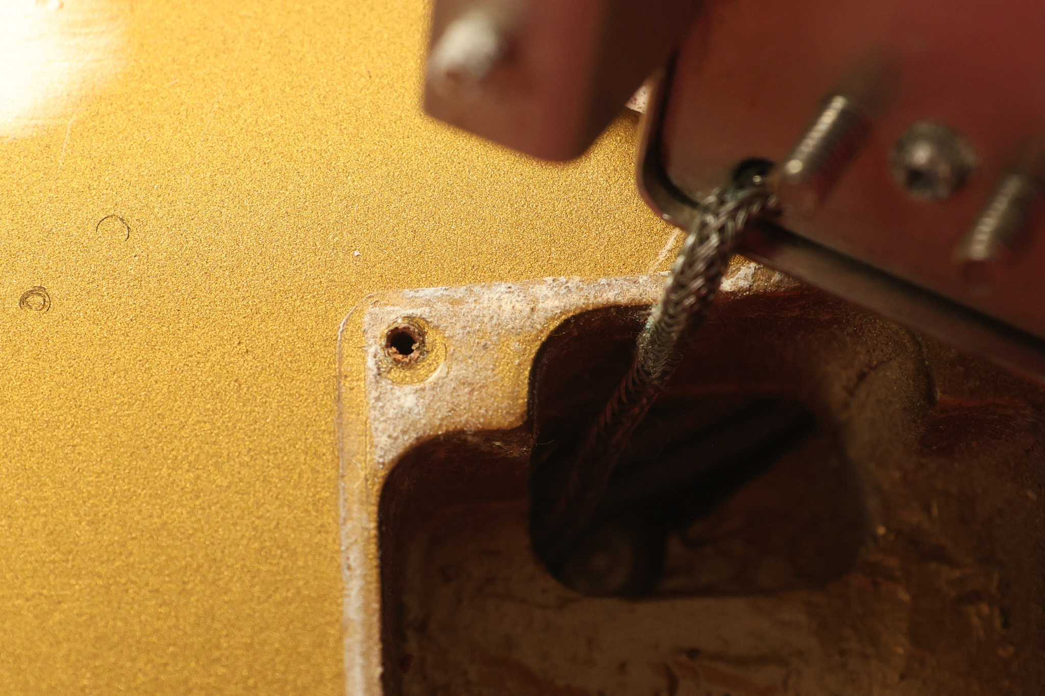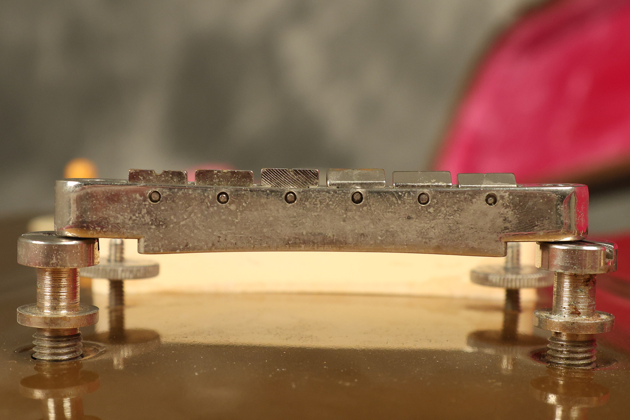 1957 Gibson Les Paul Goldtop with a rare carved top one-piece solid mahogany body in its original Goldtop finish. It has a great playing neck with great frets. It's all original and 100% complete along with its original hardshell case and Les Paul HANG TAG. It's in EXCELLENT condition with minor nicks + dings, very light belt buckle wear on the back of the body, a few minor finish cracks and other minor cosmetic wear including some nicks + dings around the top edges of the headstock that have been touched-up. The guitar itself remains structurally sound with no cracks, breaks or repairs. All electronics work and sound great with its original set of early PAF pickups. The cover for the neck position pickup is removable as the inside edge is not attached to the solder. All solder in the control cavities remain original and untampered with.