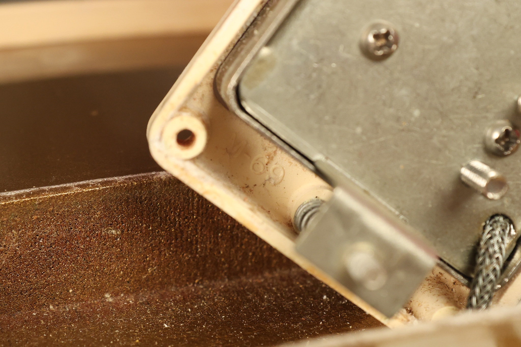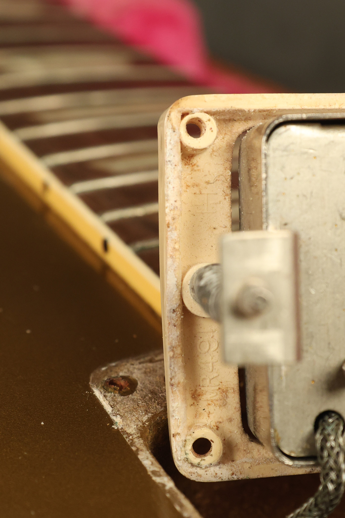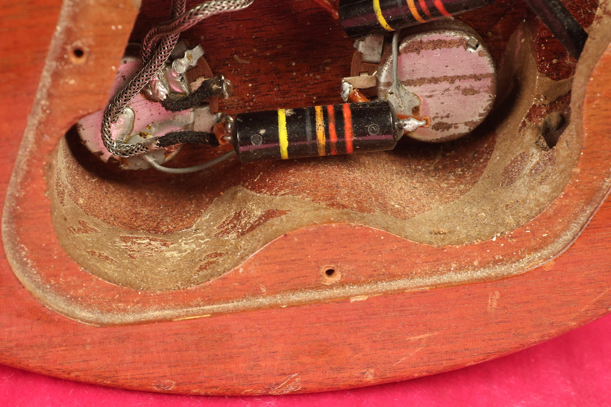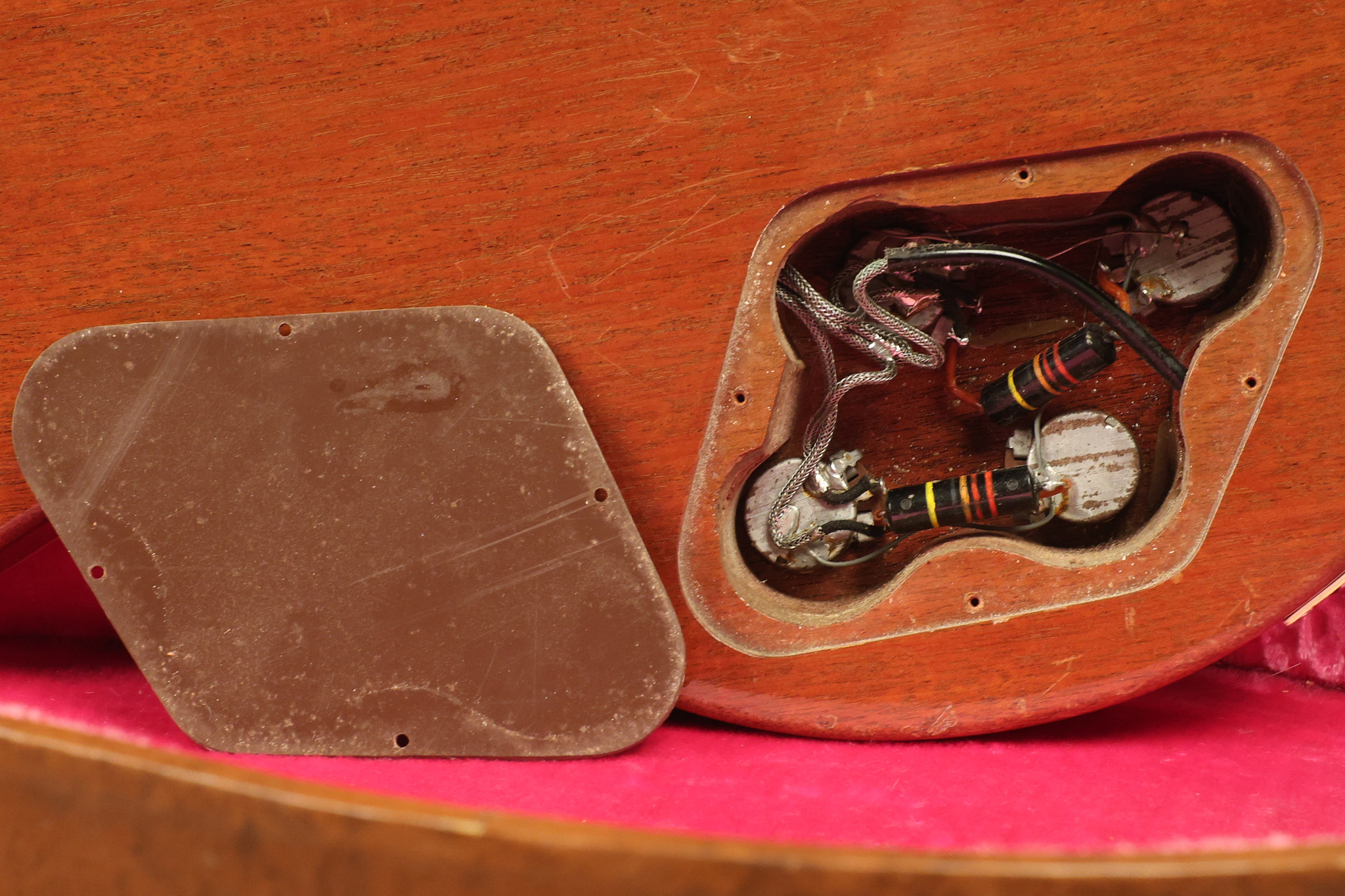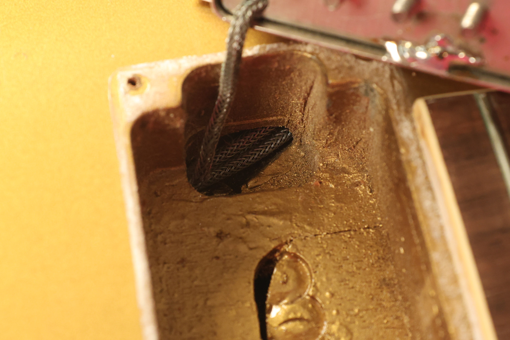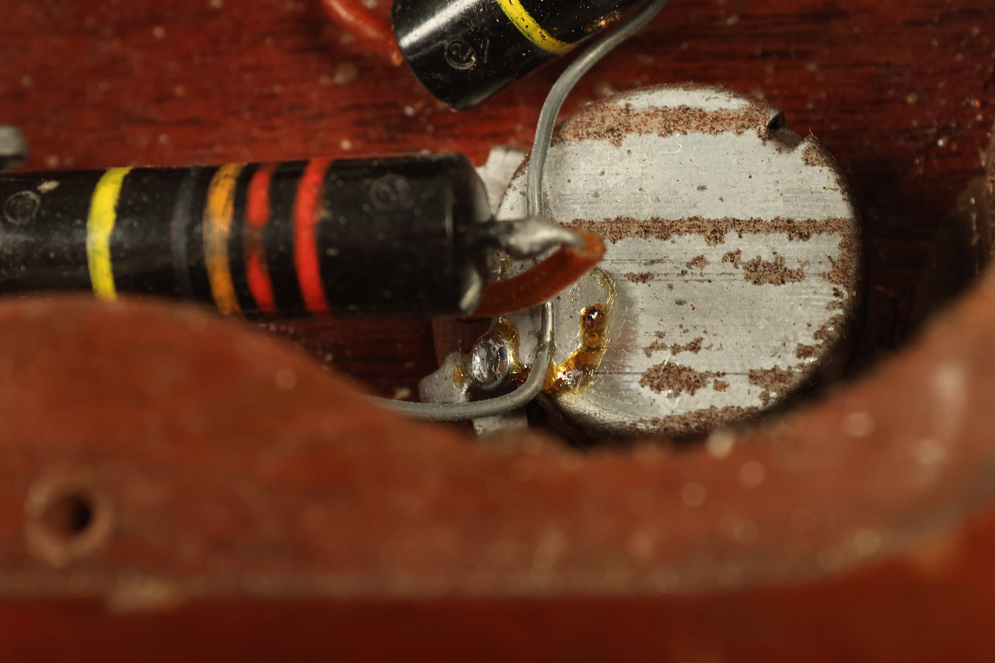 1957 Gibson Les Paul Goldtop with a rare carved top one-piece solid mahogany body in its original Goldtop finish. It has a great playing neck with great frets. It's all original and 100% complete along with its original hardshell case and Les Paul HANG TAG. It's in EXCELLENT condition with minor nicks + dings, very light belt buckle wear on the back of the body, a few minor finish cracks and other minor cosmetic wear including some nicks + dings around the top edges of the headstock that have been touched-up. The guitar itself remains structurally sound with no cracks, breaks or repairs. All electronics work and sound great with its original set of early PAF pickups. The cover for the neck position pickup is removable as the inside edge is not attached to the solder. All solder in the control cavities remain original and untampered with.