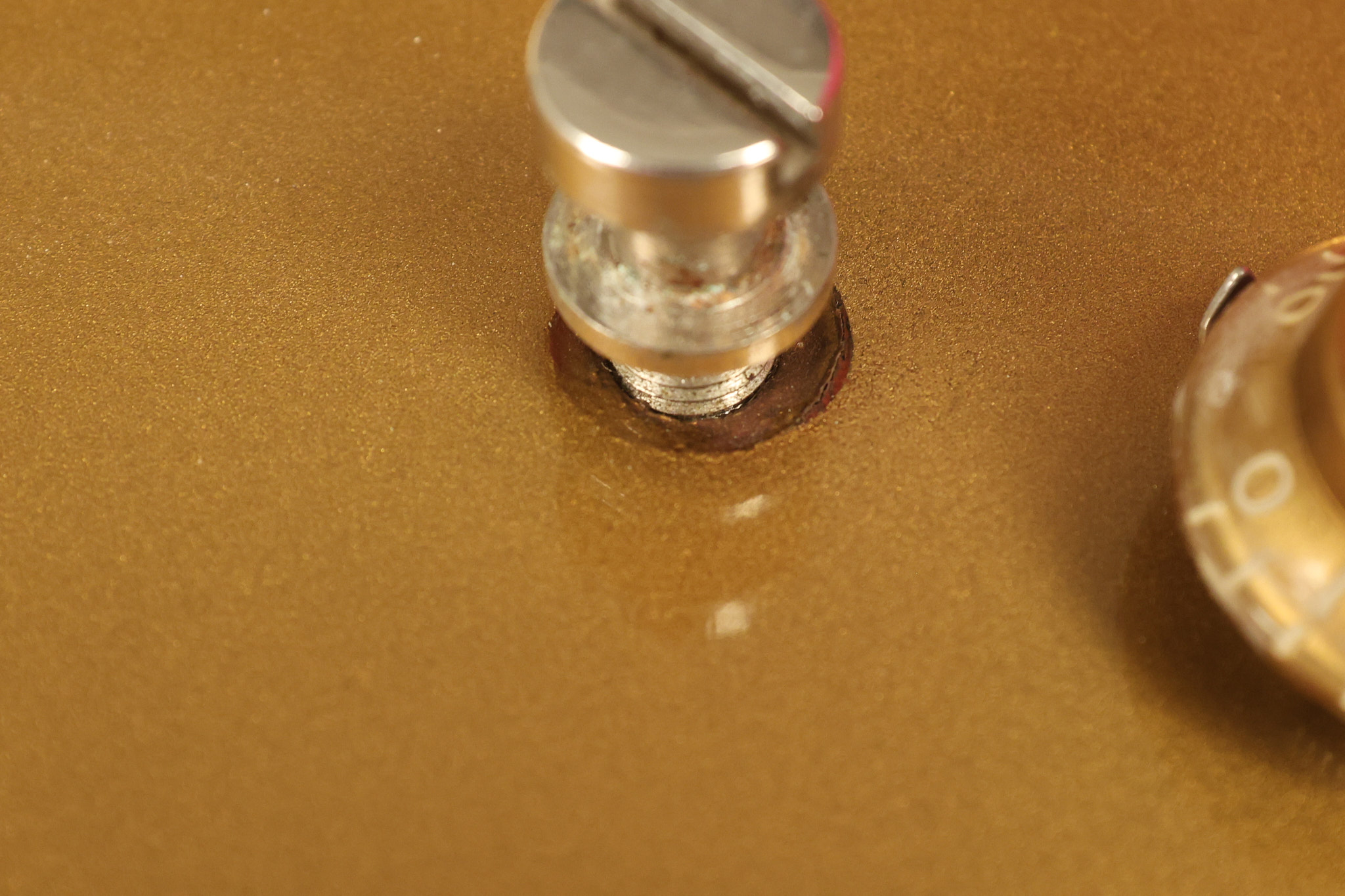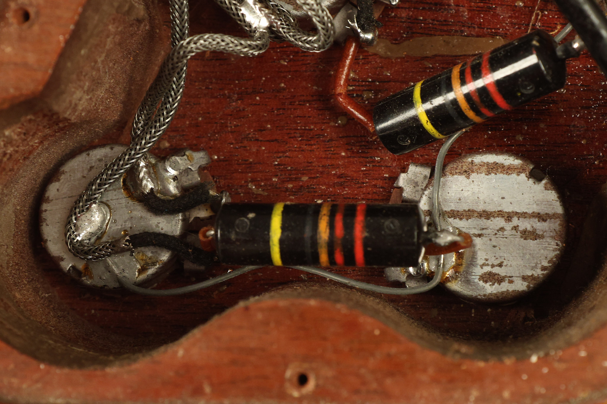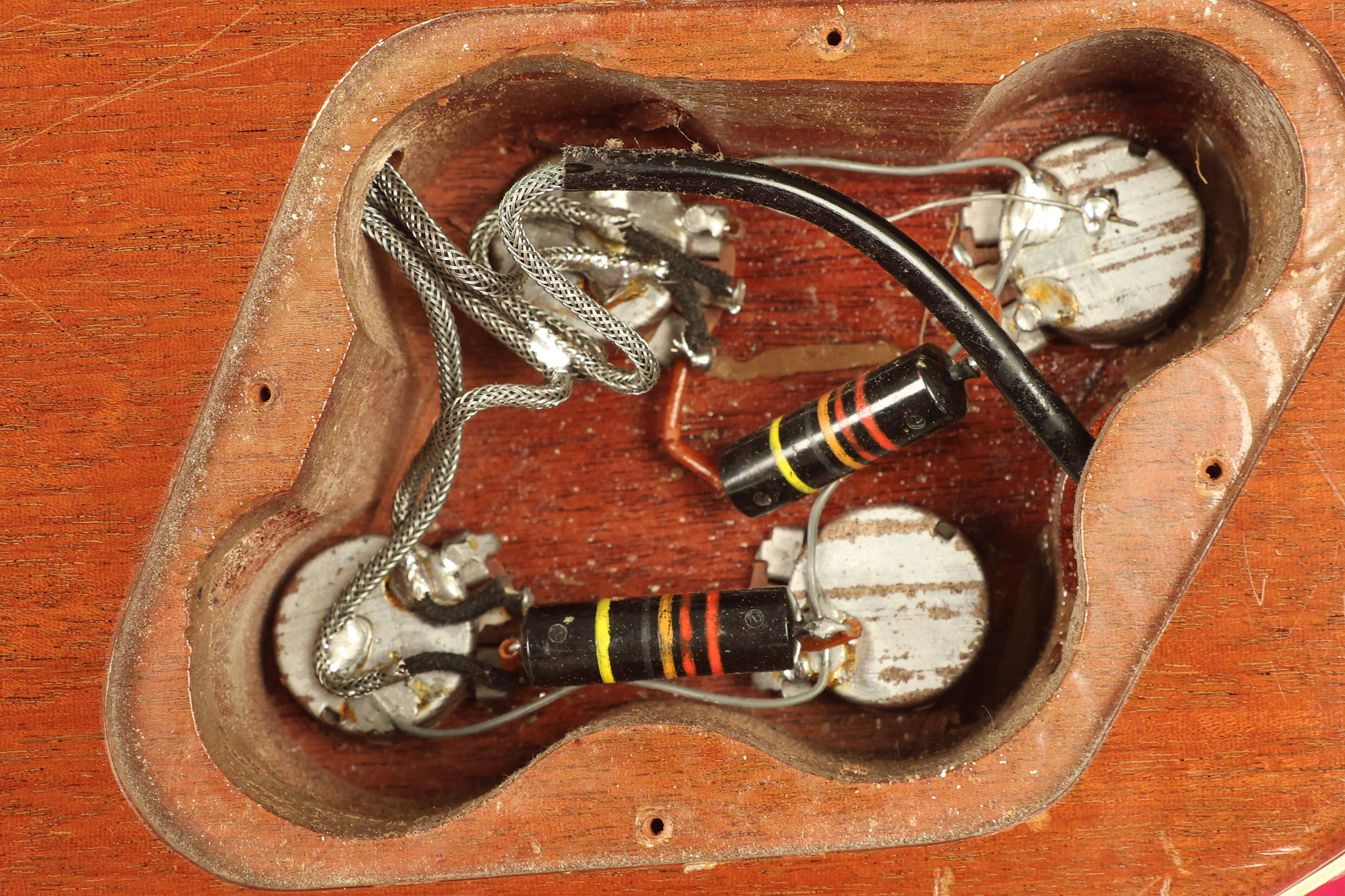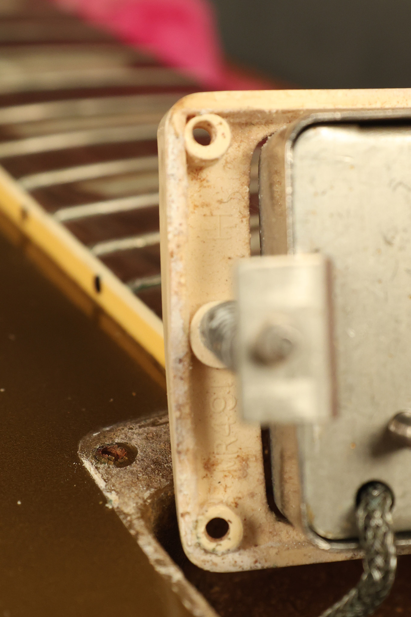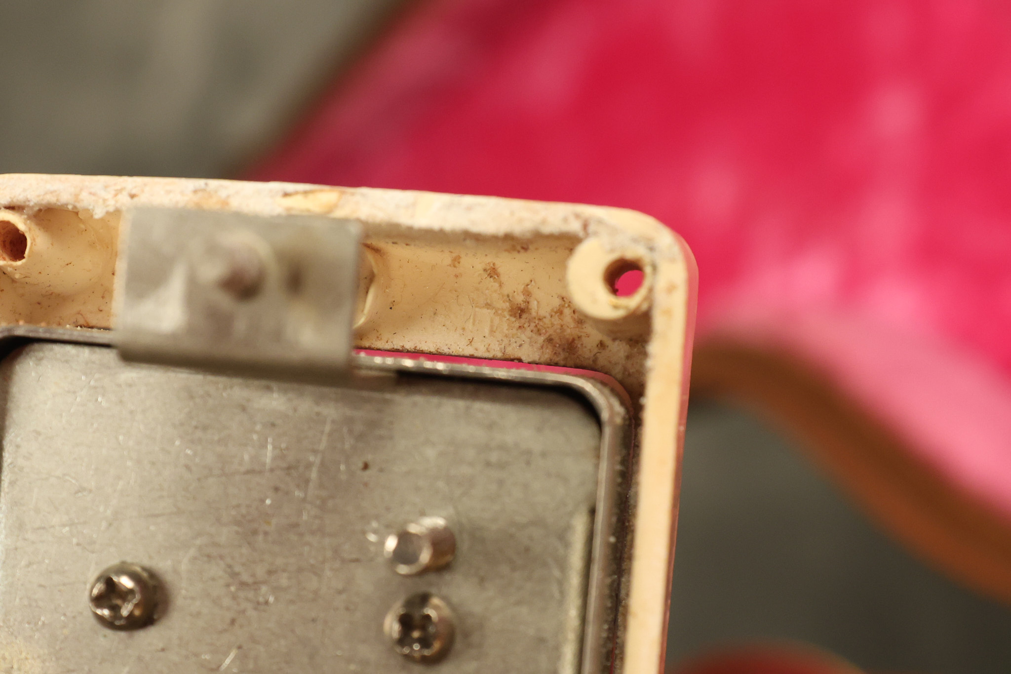 1957 Gibson Les Paul Goldtop with a rare carved top one-piece solid mahogany body in its original Goldtop finish. It has a great playing neck with great frets. It's all original and 100% complete along with its original hardshell case and Les Paul HANG TAG. It's in EXCELLENT condition with minor nicks + dings, very light belt buckle wear on the back of the body, a few minor finish cracks and other minor cosmetic wear including some nicks + dings around the top edges of the headstock that have been touched-up. The guitar itself remains structurally sound with no cracks, breaks or repairs. All electronics work and sound great with its original set of early PAF pickups. The cover for the neck position pickup is removable as the inside edge is not attached to the solder. All solder in the control cavities remain original and untampered with.