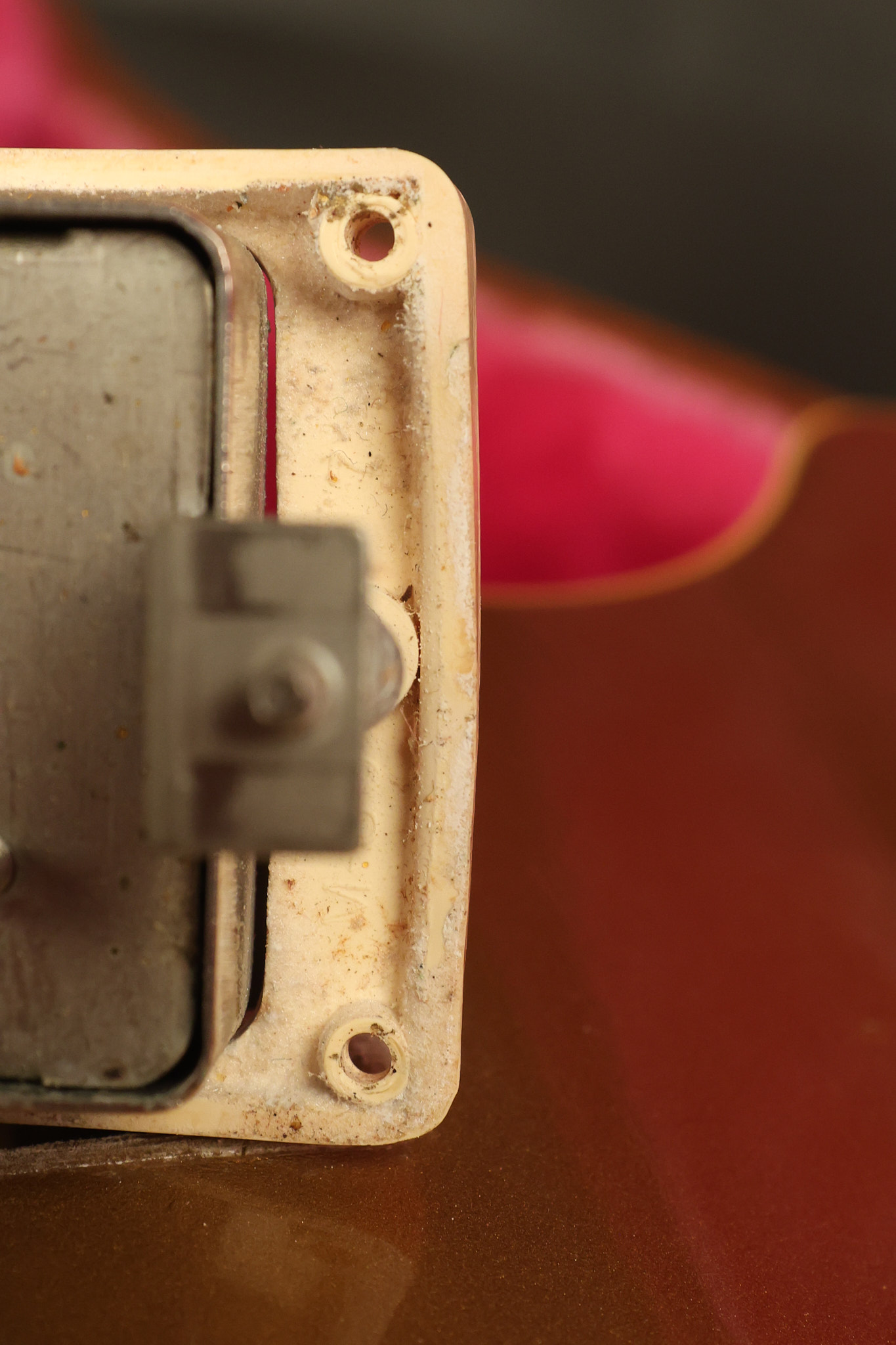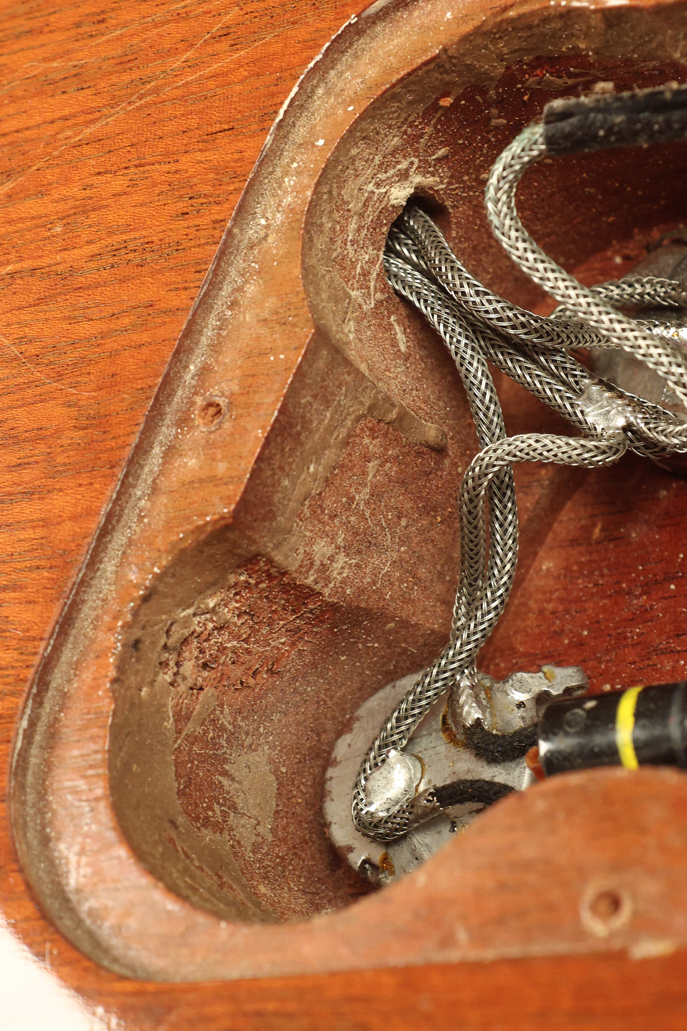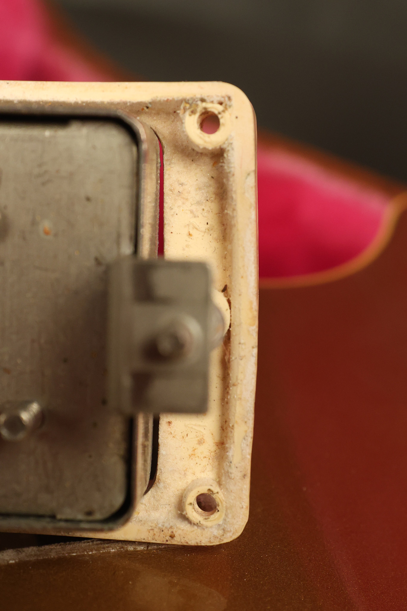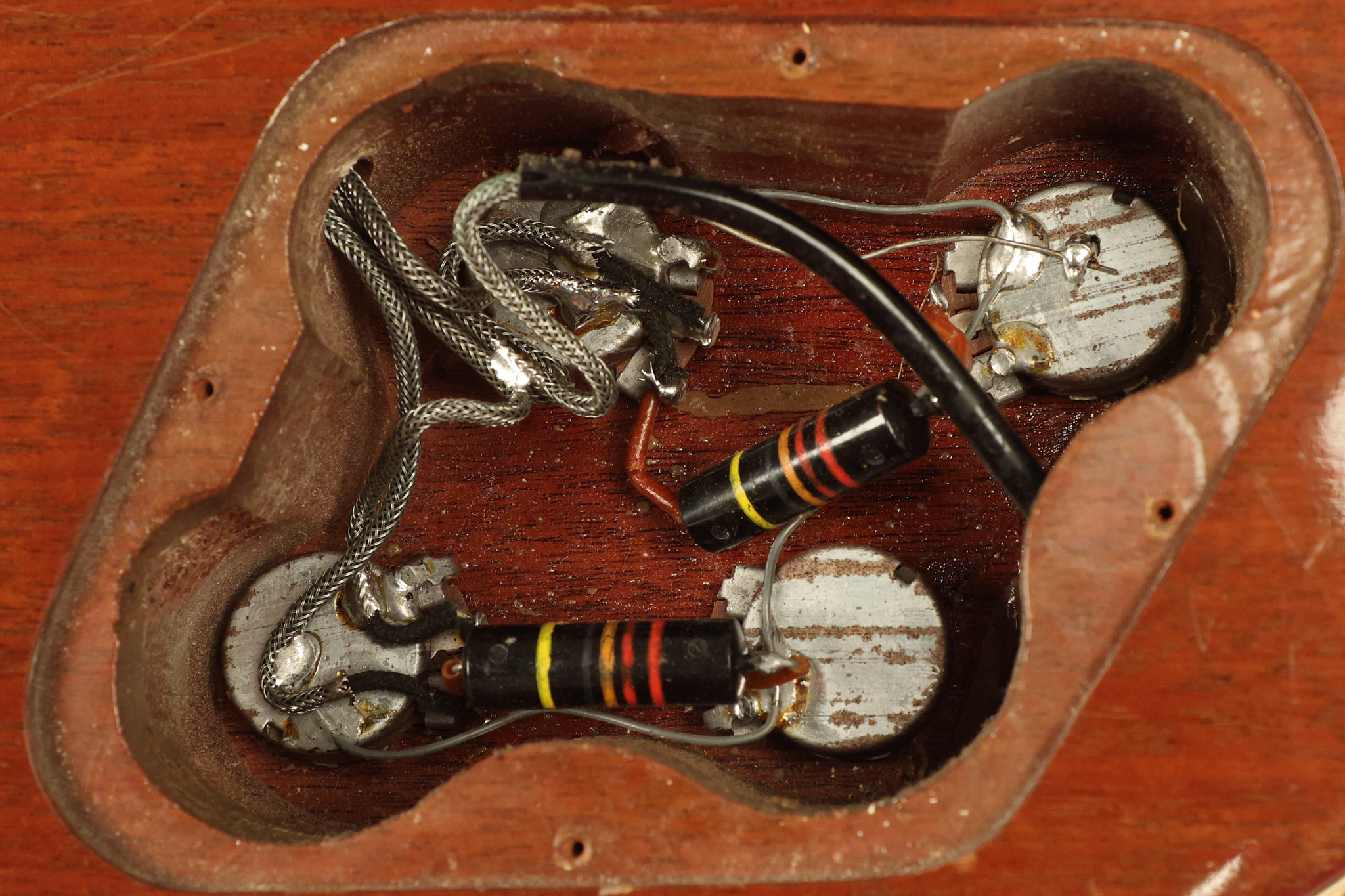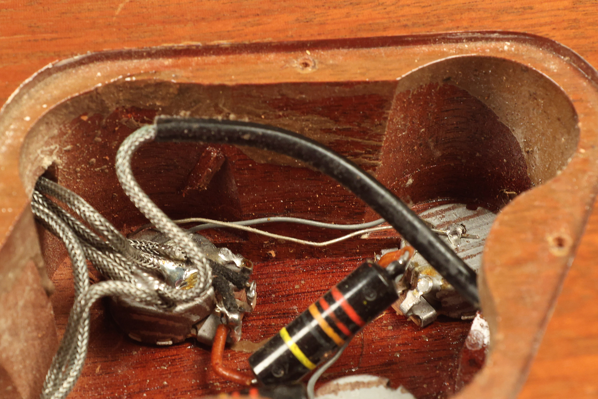1957 Gibson Les Paul Goldtop with a rare carved top one-piece solid mahogany body in its original Goldtop finish. It has a great playing neck with great frets. It's all original and 100% complete along with its original hardshell case and Les Paul HANG TAG. It's in EXCELLENT condition with minor nicks + dings, very light belt buckle wear on the back of the body, a few minor finish cracks and other minor cosmetic wear including some nicks + dings around the top edges of the headstock that have been touched-up. The guitar itself remains structurally sound with no cracks, breaks or repairs. All electronics work and sound great with its original set of early PAF pickups. The cover for the neck position pickup is removable as the inside edge is not attached to the solder. All solder in the control cavities remain original and untampered with.
