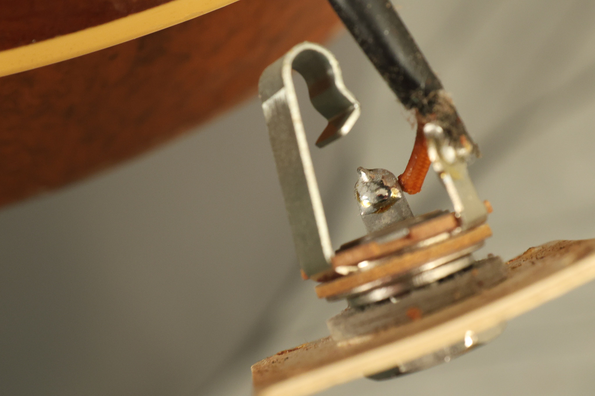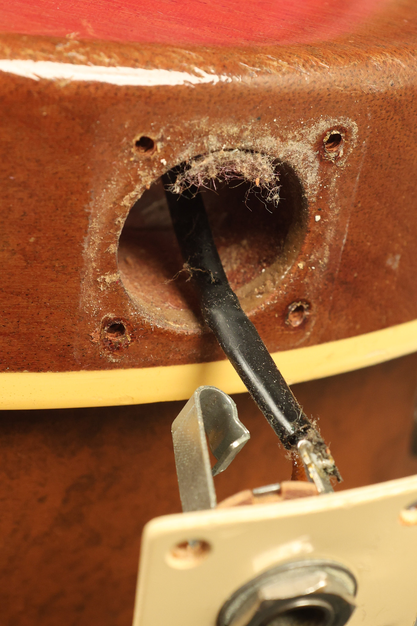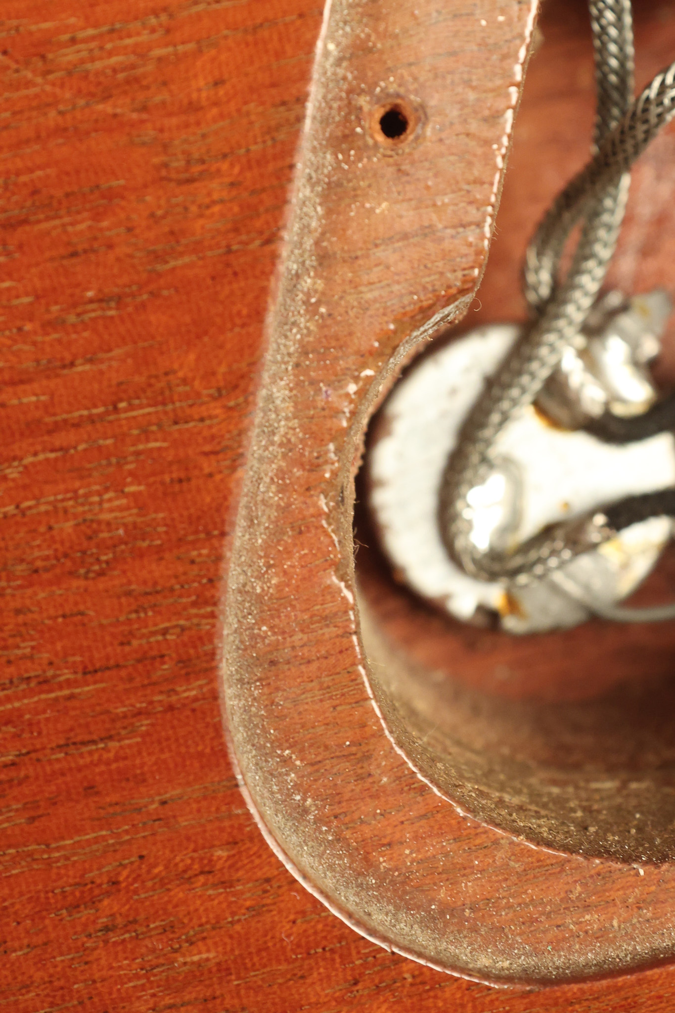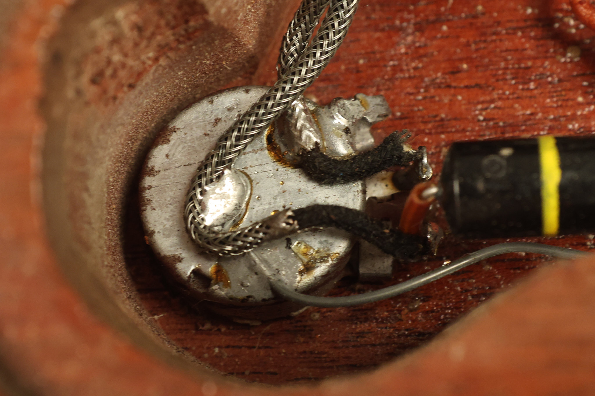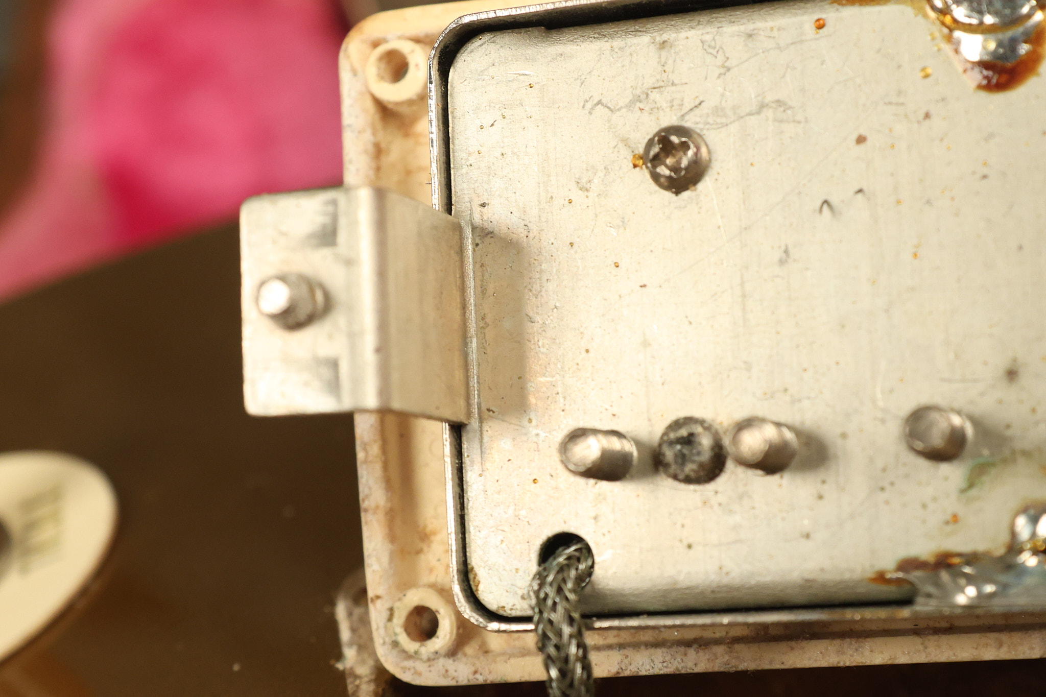 1957 Gibson Les Paul Goldtop with a rare carved top one-piece solid mahogany body in its original Goldtop finish. It has a great playing neck with great frets. It's all original and 100% complete along with its original hardshell case and Les Paul HANG TAG. It's in EXCELLENT condition with minor nicks + dings, very light belt buckle wear on the back of the body, a few minor finish cracks and other minor cosmetic wear including some nicks + dings around the top edges of the headstock that have been touched-up. The guitar itself remains structurally sound with no cracks, breaks or repairs. All electronics work and sound great with its original set of early PAF pickups. The cover for the neck position pickup is removable as the inside edge is not attached to the solder. All solder in the control cavities remain original and untampered with.