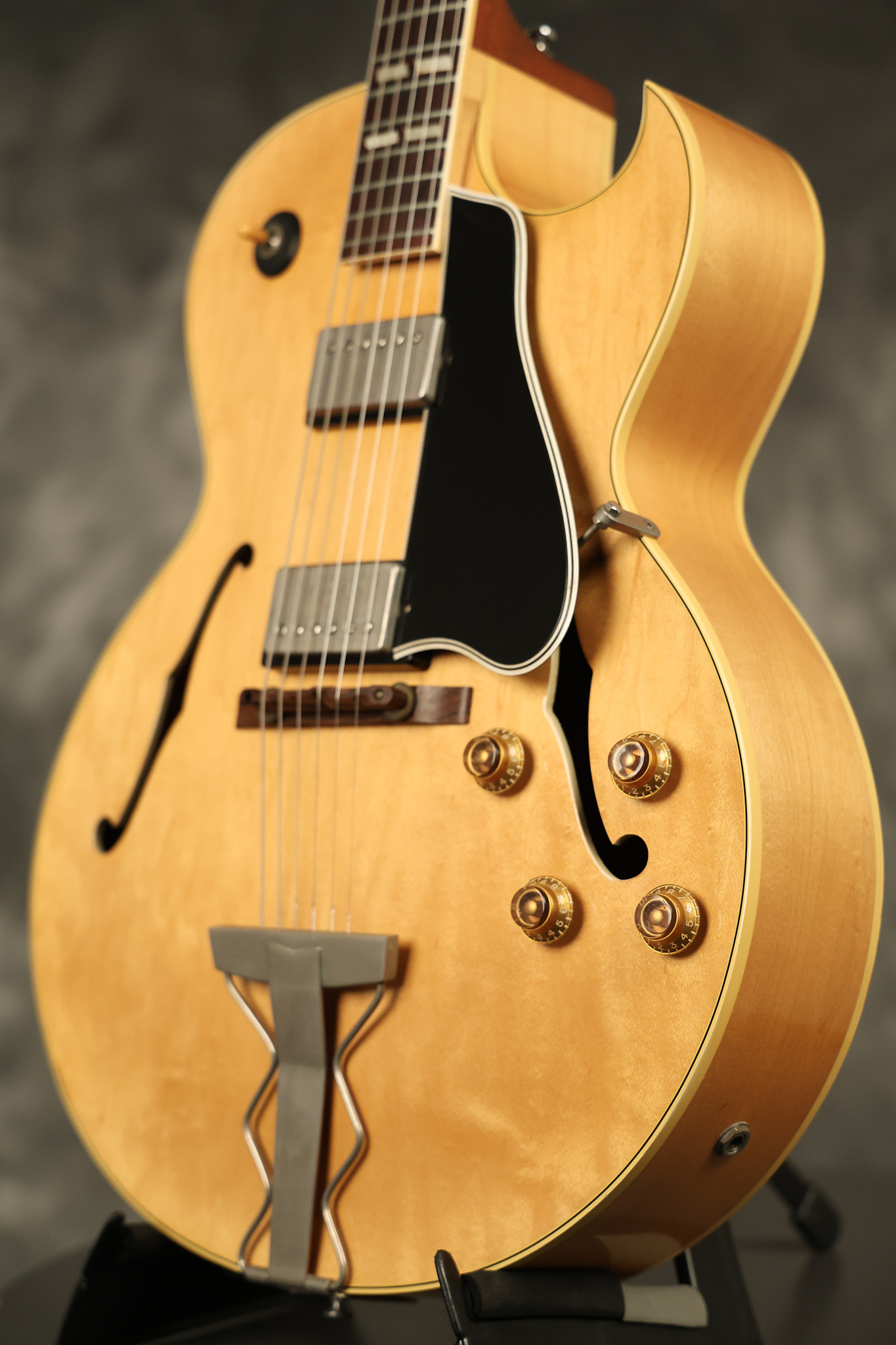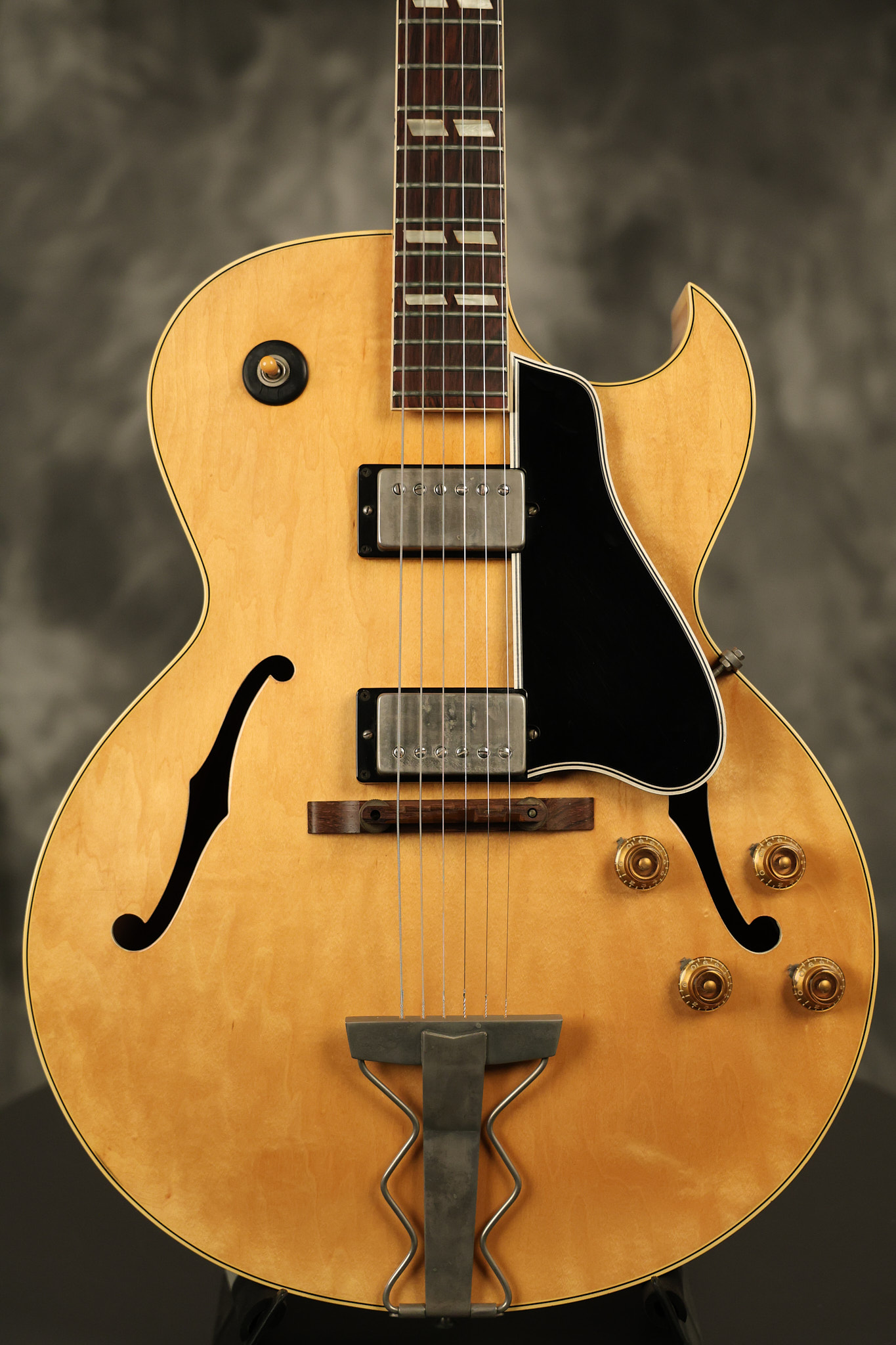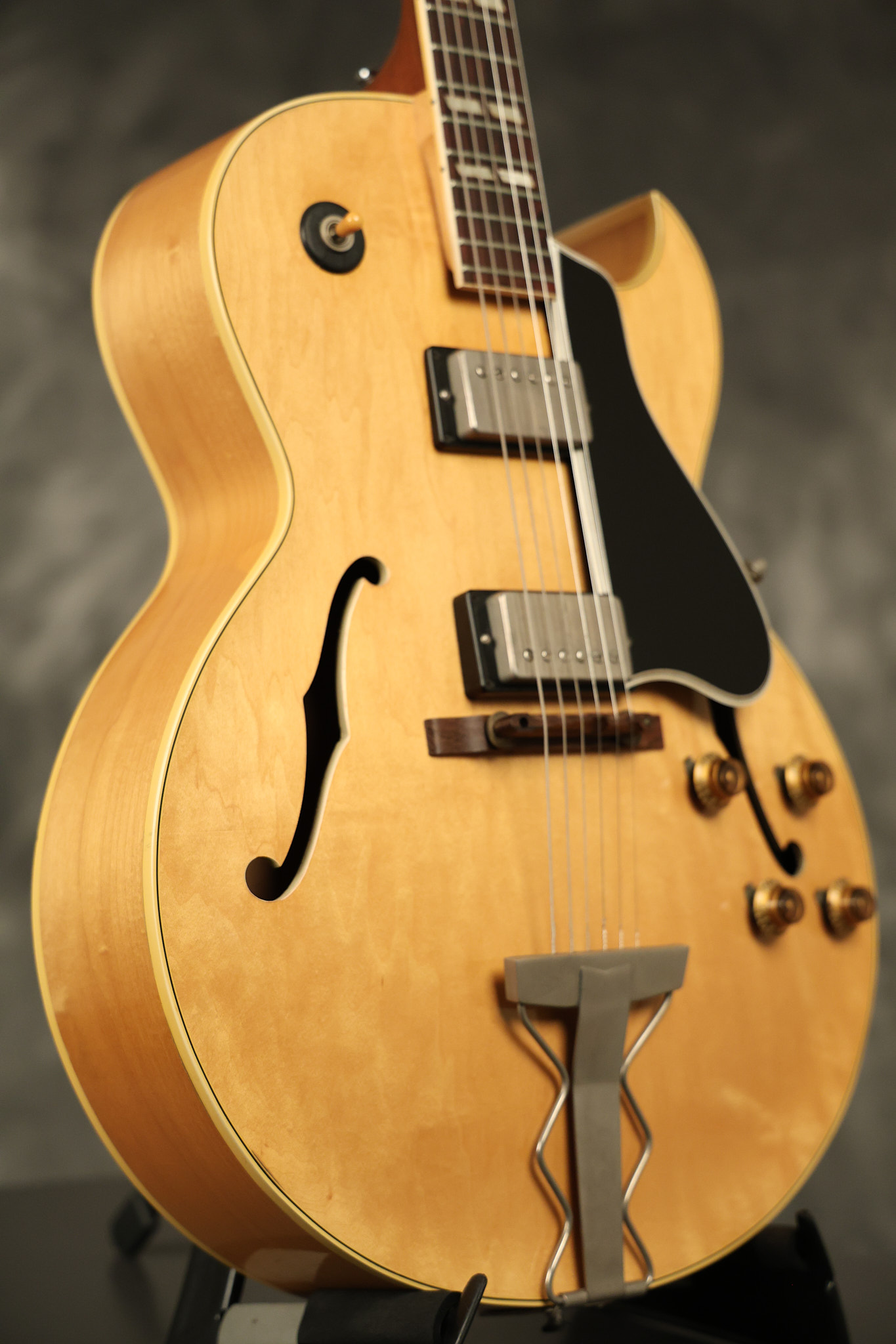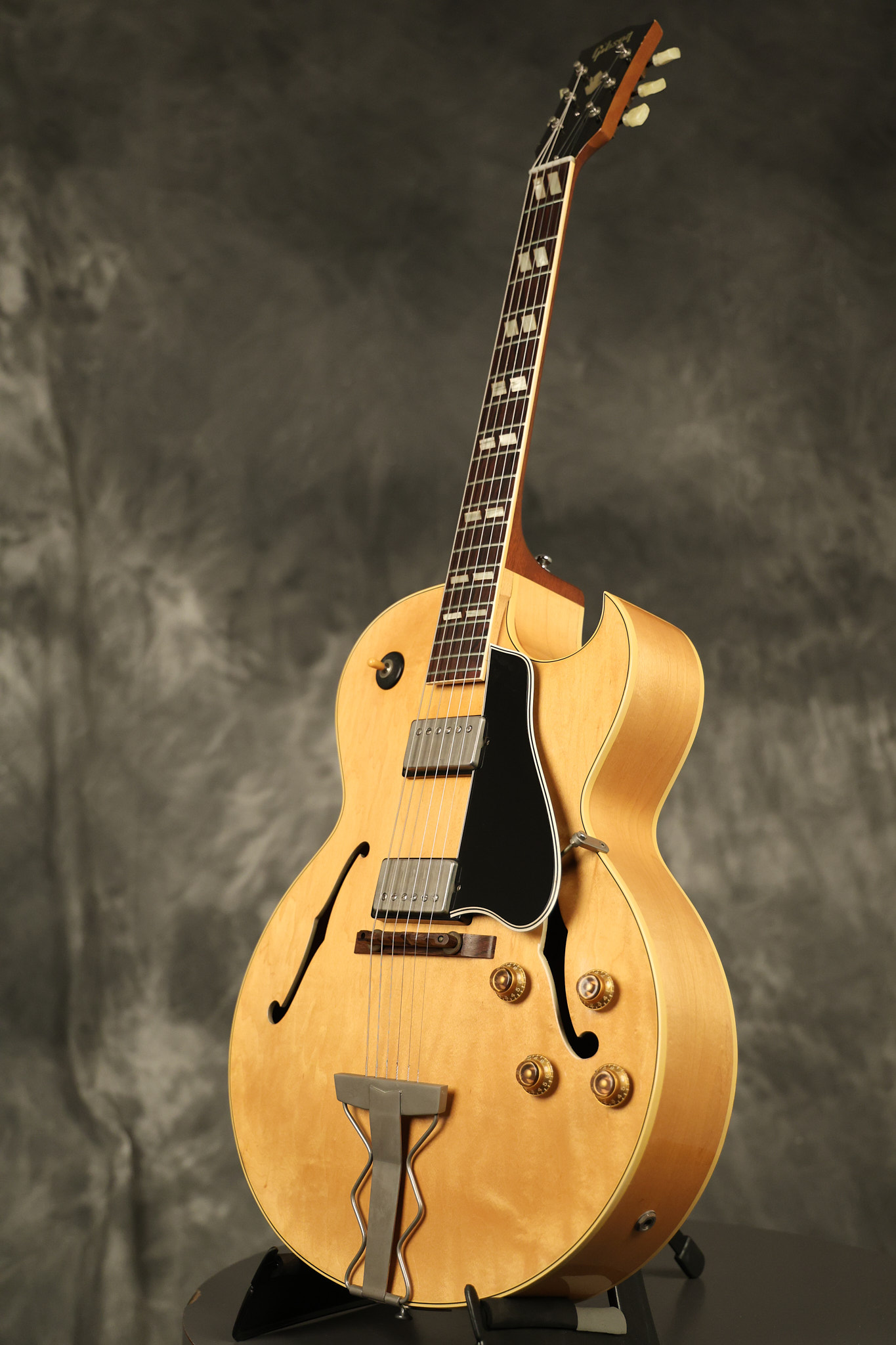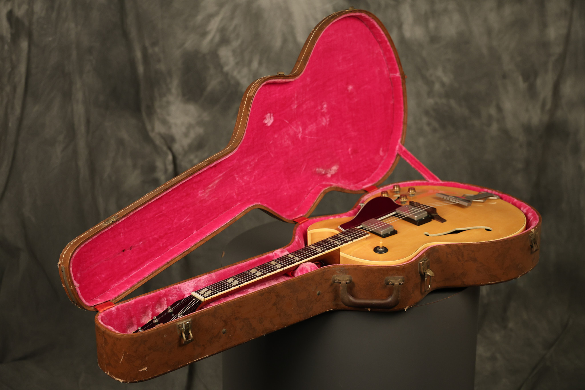 1959 Gibson ES-175 in its original Blonde/Natural finish. It has a great playing neck with great frets. It's all original with the exception of the added upper strap button and newer reproduction tuning buttons. It's also 100% complete along with its original hardshell case. It's in very good condition with some very minor nicks + dings and other minor cosmetic wear. There is some finish cracking along the seams of the top edge binding on the bass side lower bout of the body. The short finish cracks appear to be from binding shrinkage. There is also some slight binding shrinkage on the top edge of the cutaway on the body. The guitar itself remains structurally sound with no cracks, breaks or repairs. All electronics work and sound great.
