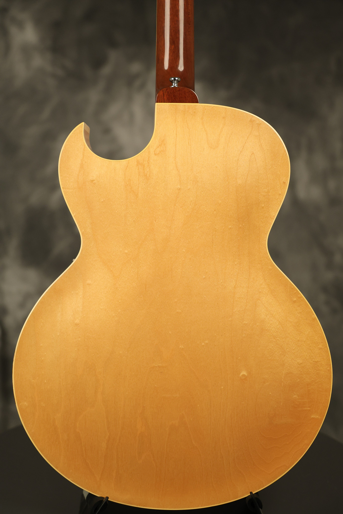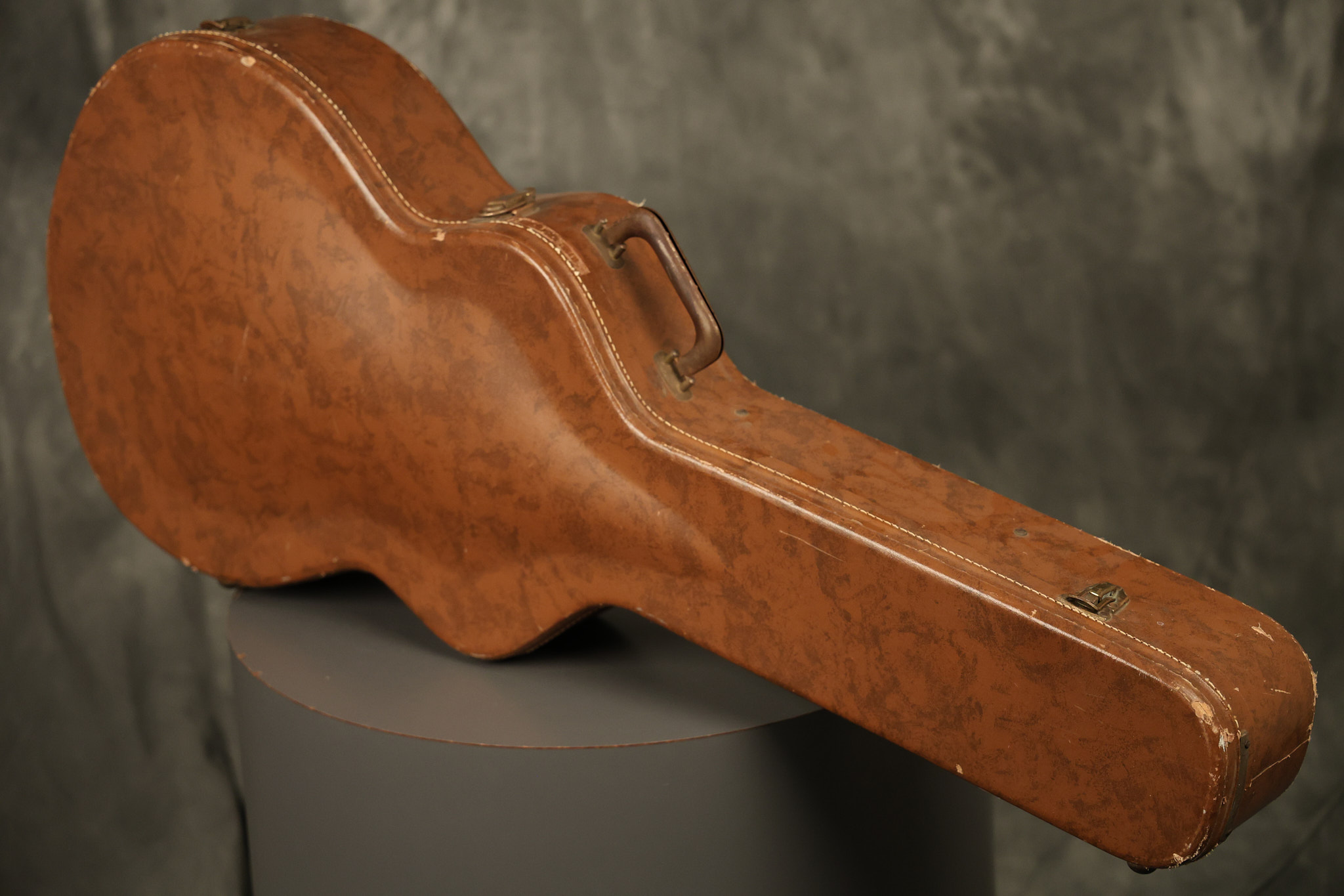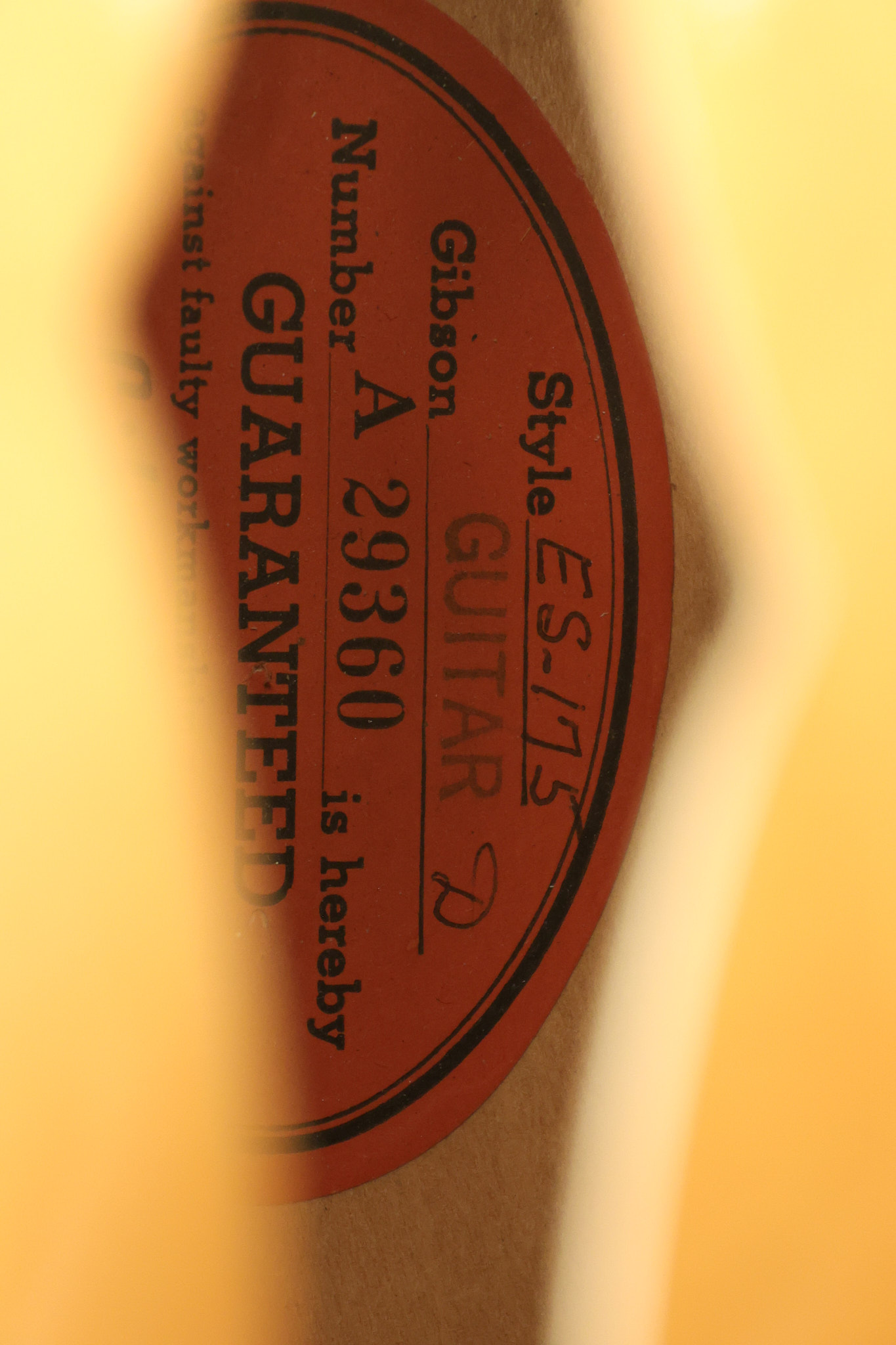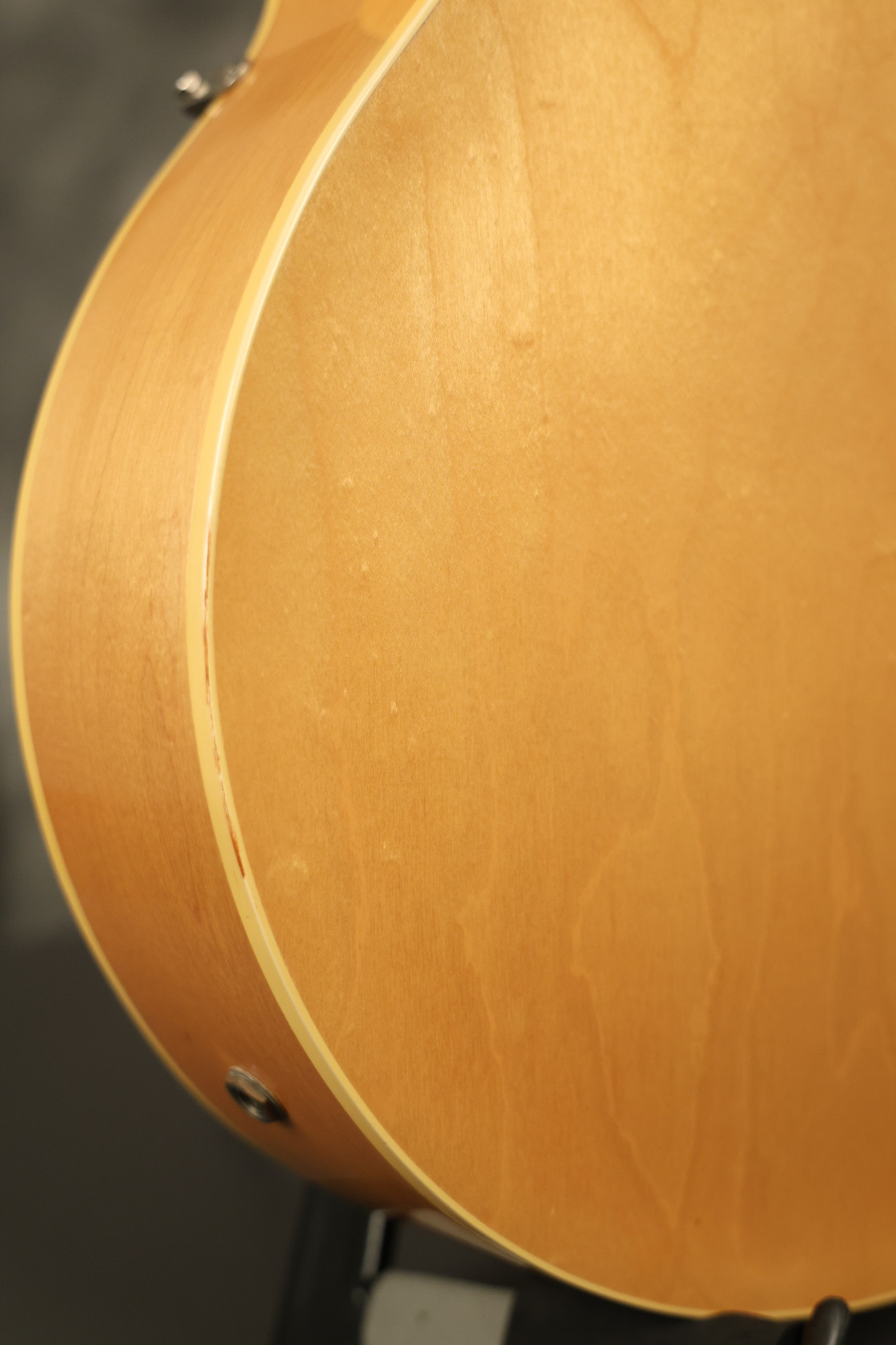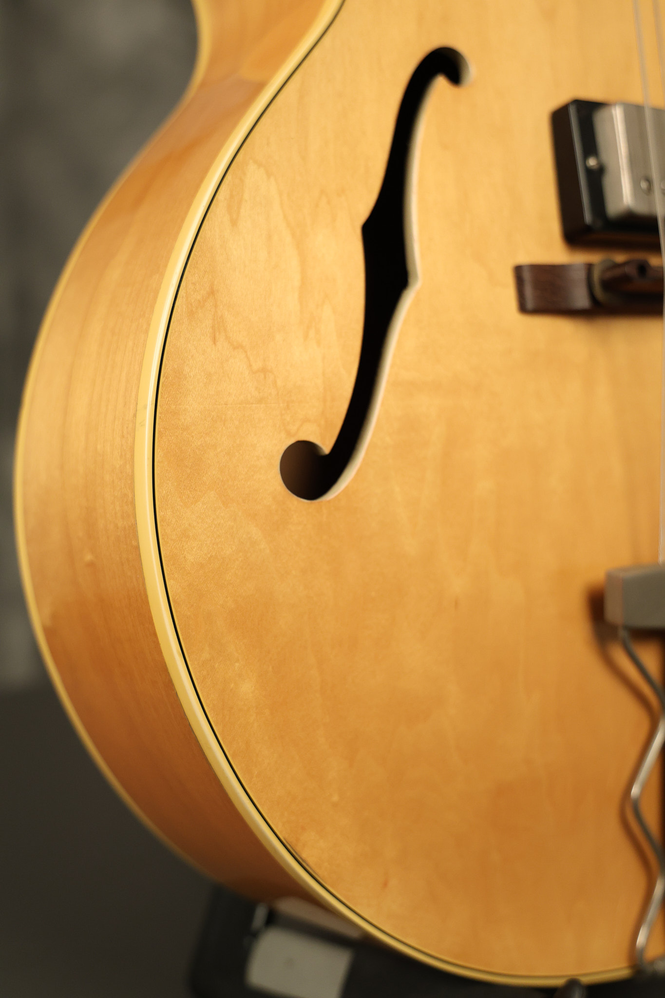 1959 Gibson ES-175 in its original Blonde/Natural finish. It has a great playing neck with great frets. It's all original with the exception of the added upper strap button and newer reproduction tuning buttons. It's also 100% complete along with its original hardshell case. It's in very good condition with some very minor nicks + dings and other minor cosmetic wear. There is some finish cracking along the seams of the top edge binding on the bass side lower bout of the body. The short finish cracks appear to be from binding shrinkage. There is also some slight binding shrinkage on the top edge of the cutaway on the body. The guitar itself remains structurally sound with no cracks, breaks or repairs. All electronics work and sound great.