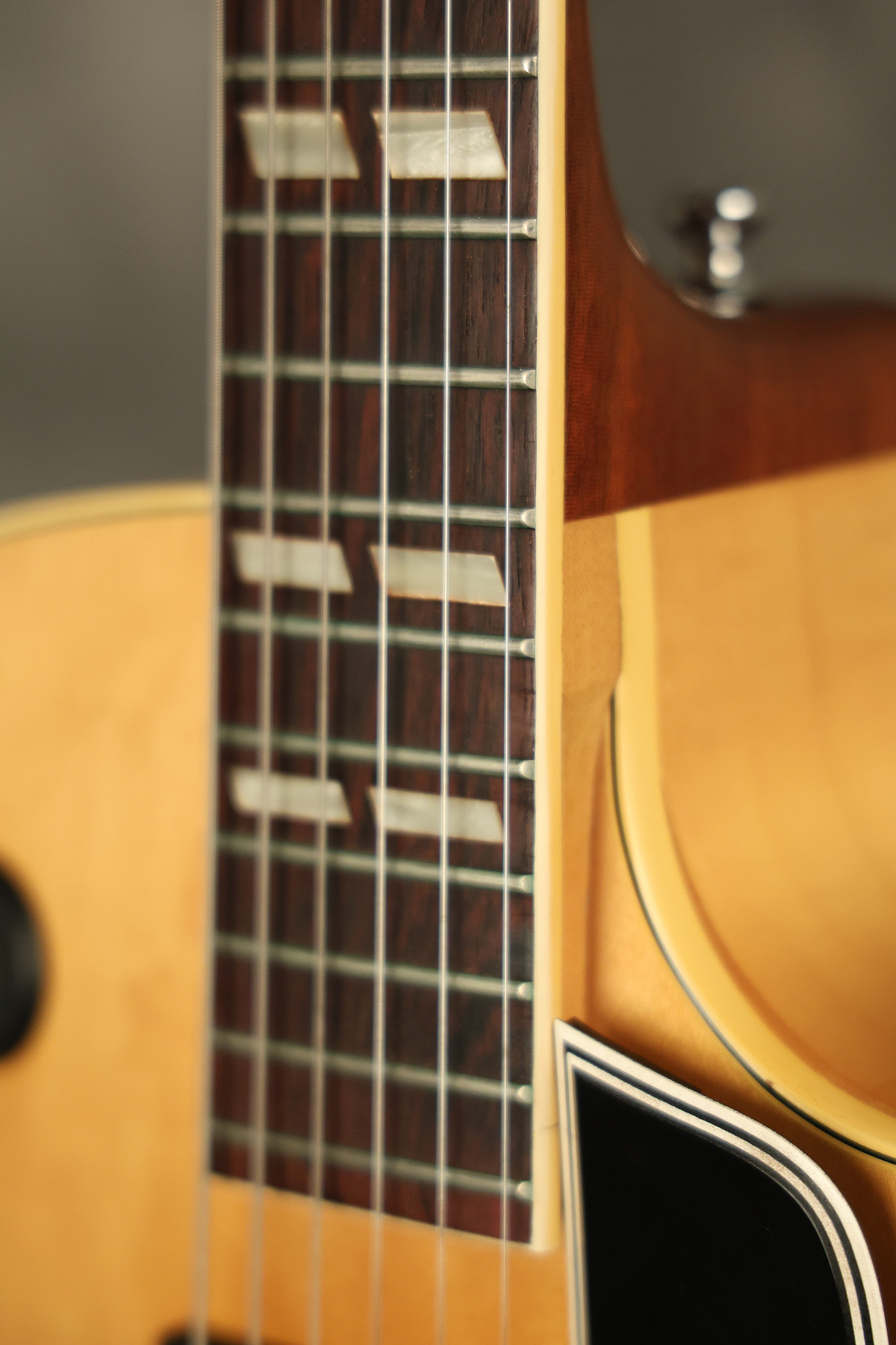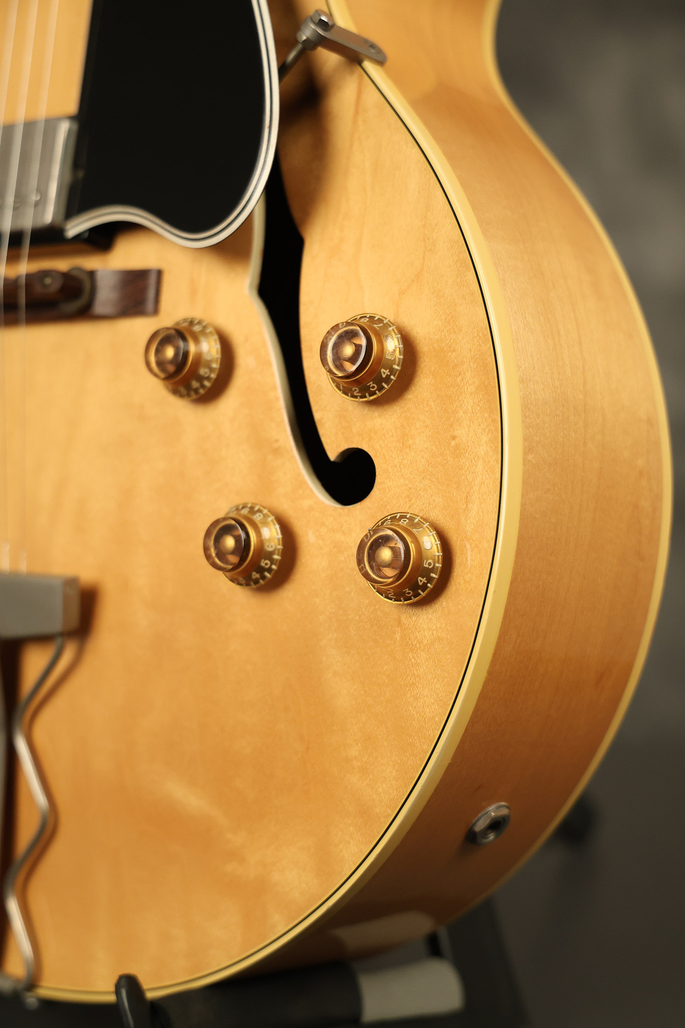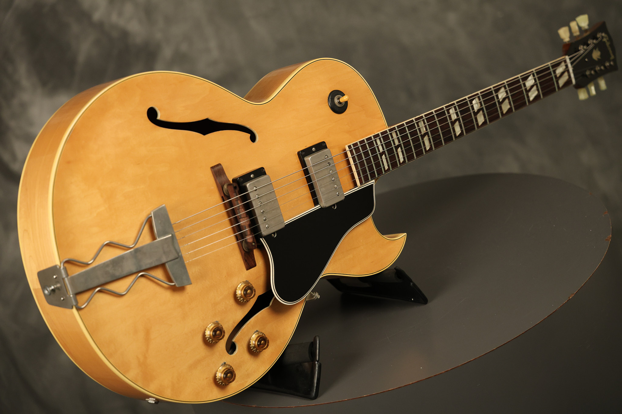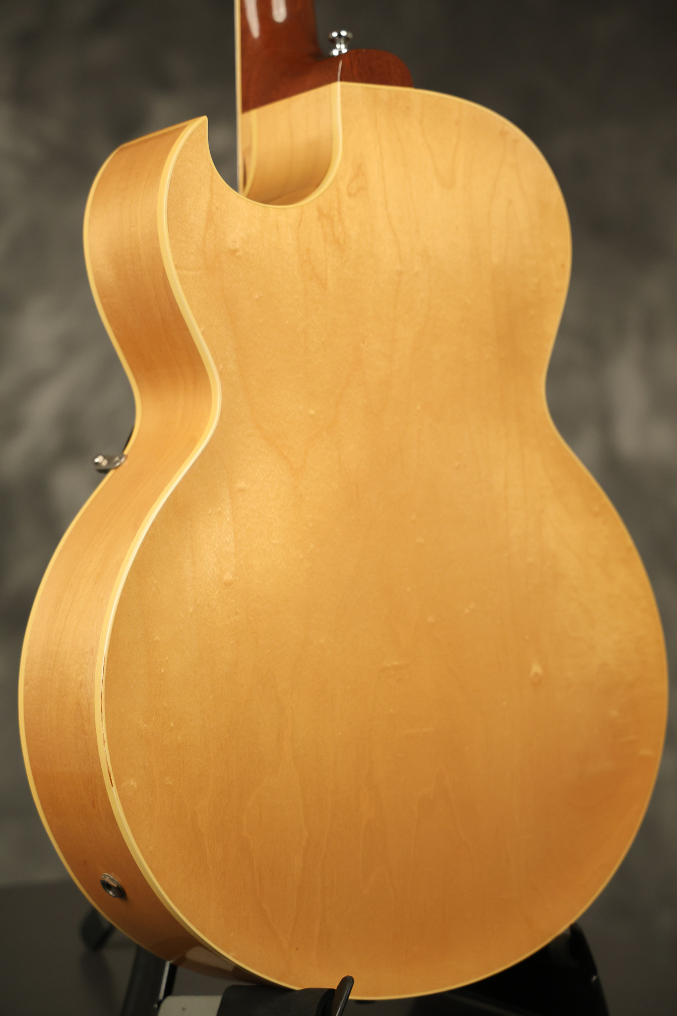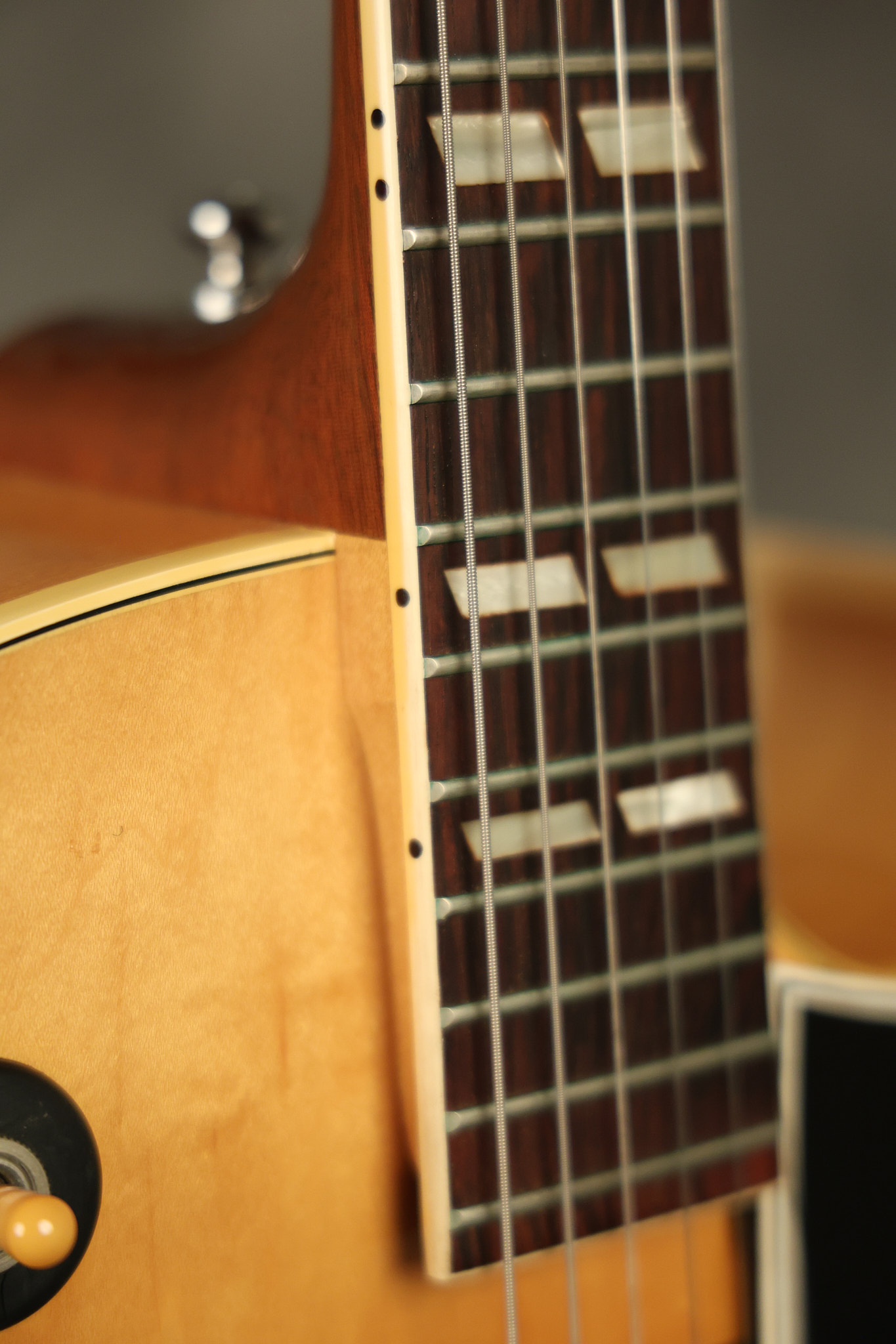 1959 Gibson ES-175 in its original Blonde/Natural finish. It has a great playing neck with great frets. It's all original with the exception of the added upper strap button and newer reproduction tuning buttons. It's also 100% complete along with its original hardshell case. It's in very good condition with some very minor nicks + dings and other minor cosmetic wear. There is some finish cracking along the seams of the top edge binding on the bass side lower bout of the body. The short finish cracks appear to be from binding shrinkage. There is also some slight binding shrinkage on the top edge of the cutaway on the body. The guitar itself remains structurally sound with no cracks, breaks or repairs. All electronics work and sound great.