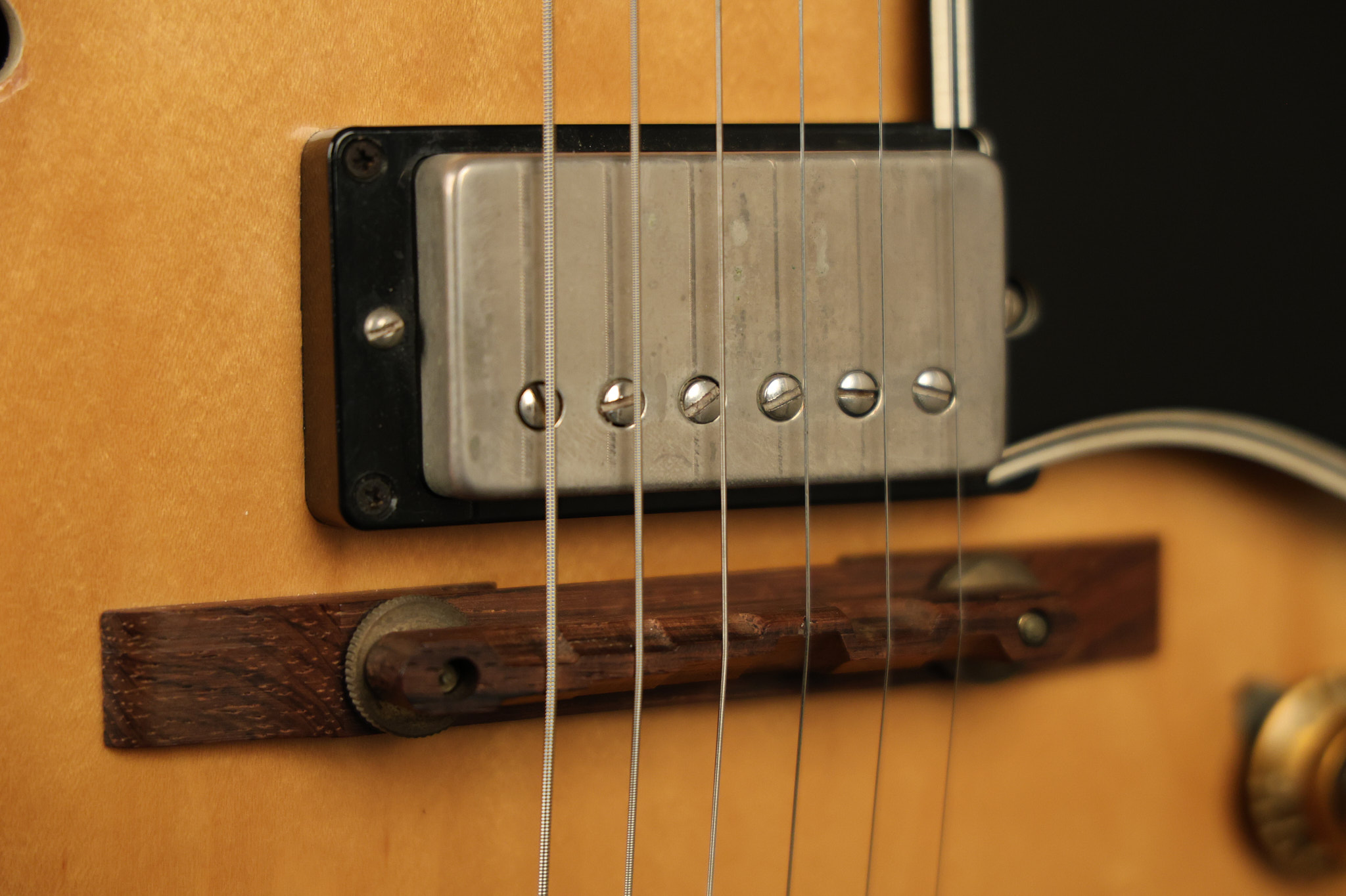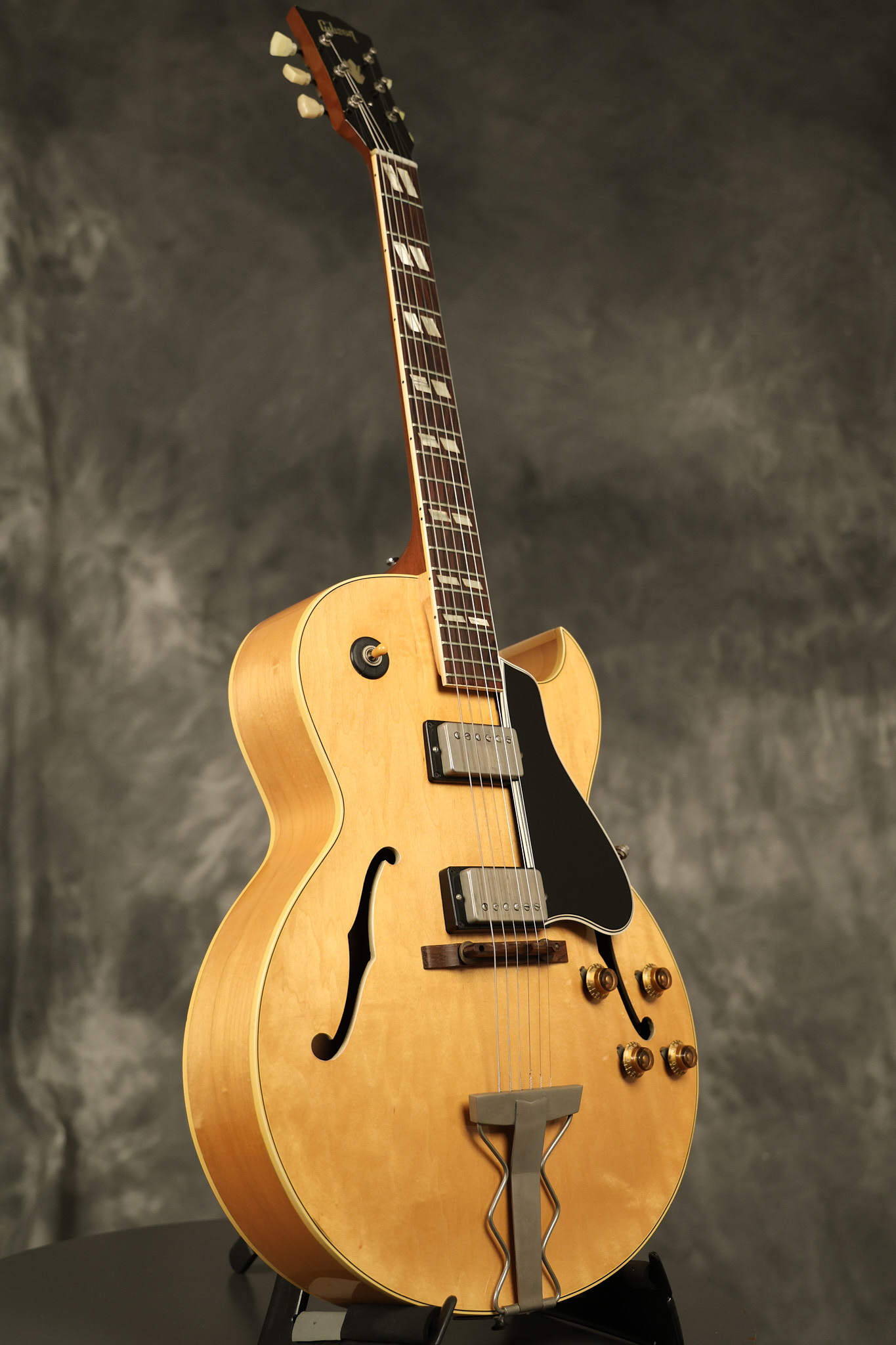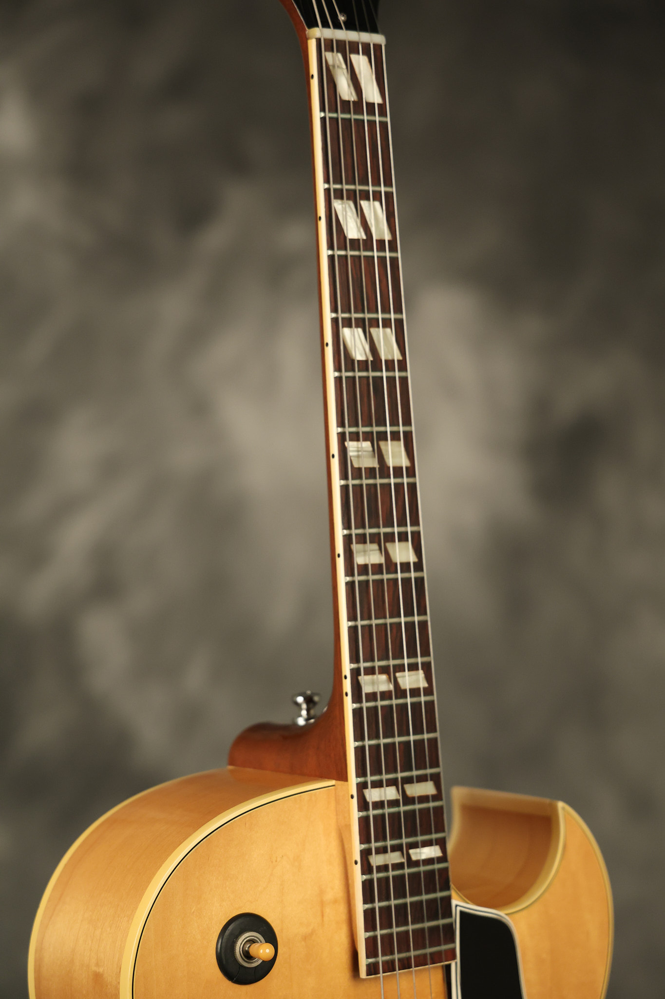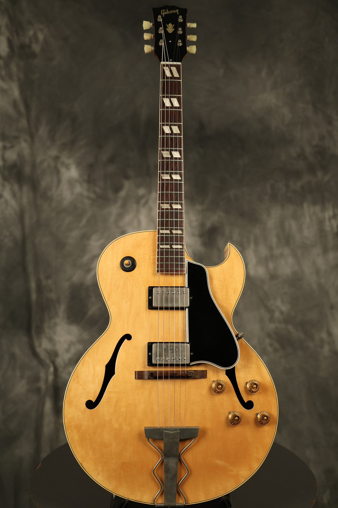 1959 Gibson ES-175 in its original Blonde/Natural finish. It has a great playing neck with great frets. It's all original with the exception of the added upper strap button and newer reproduction tuning buttons. It's also 100% complete along with its original hardshell case. It's in very good condition with some very minor nicks + dings and other minor cosmetic wear. There is some finish cracking along the seams of the top edge binding on the bass side lower bout of the body. The short finish cracks appear to be from binding shrinkage. There is also some slight binding shrinkage on the top edge of the cutaway on the body. The guitar itself remains structurally sound with no cracks, breaks or repairs. All electronics work and sound great.