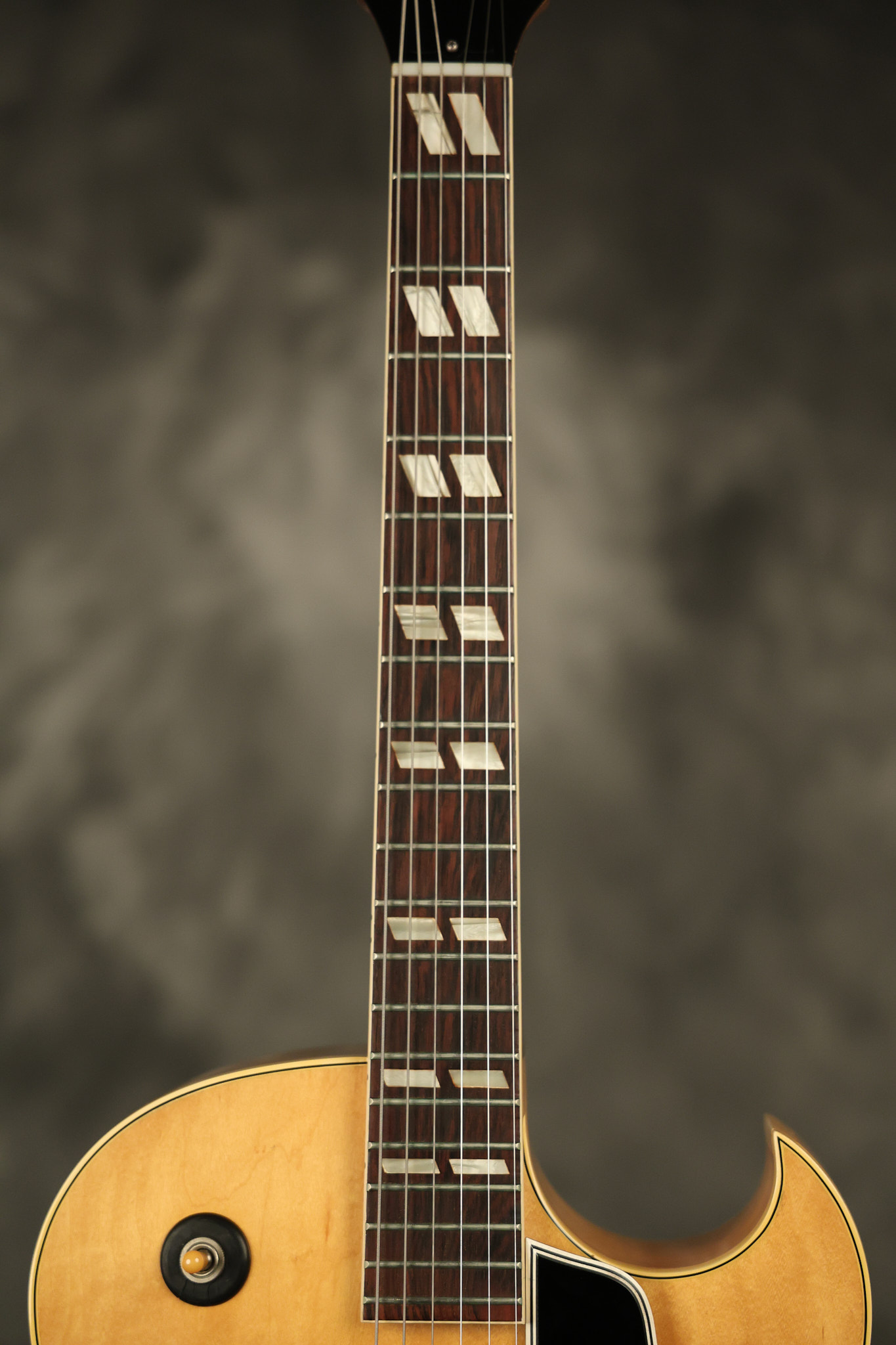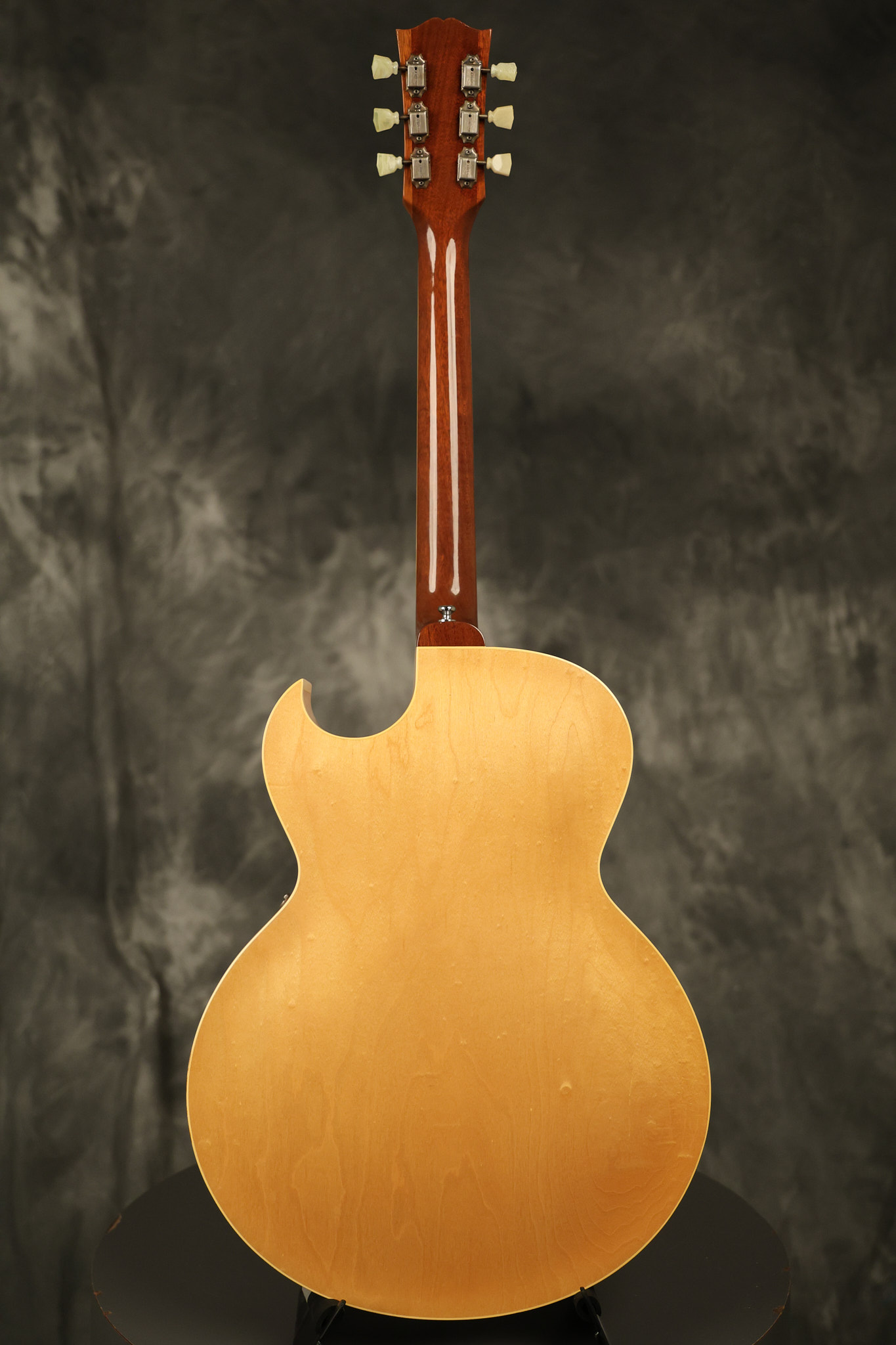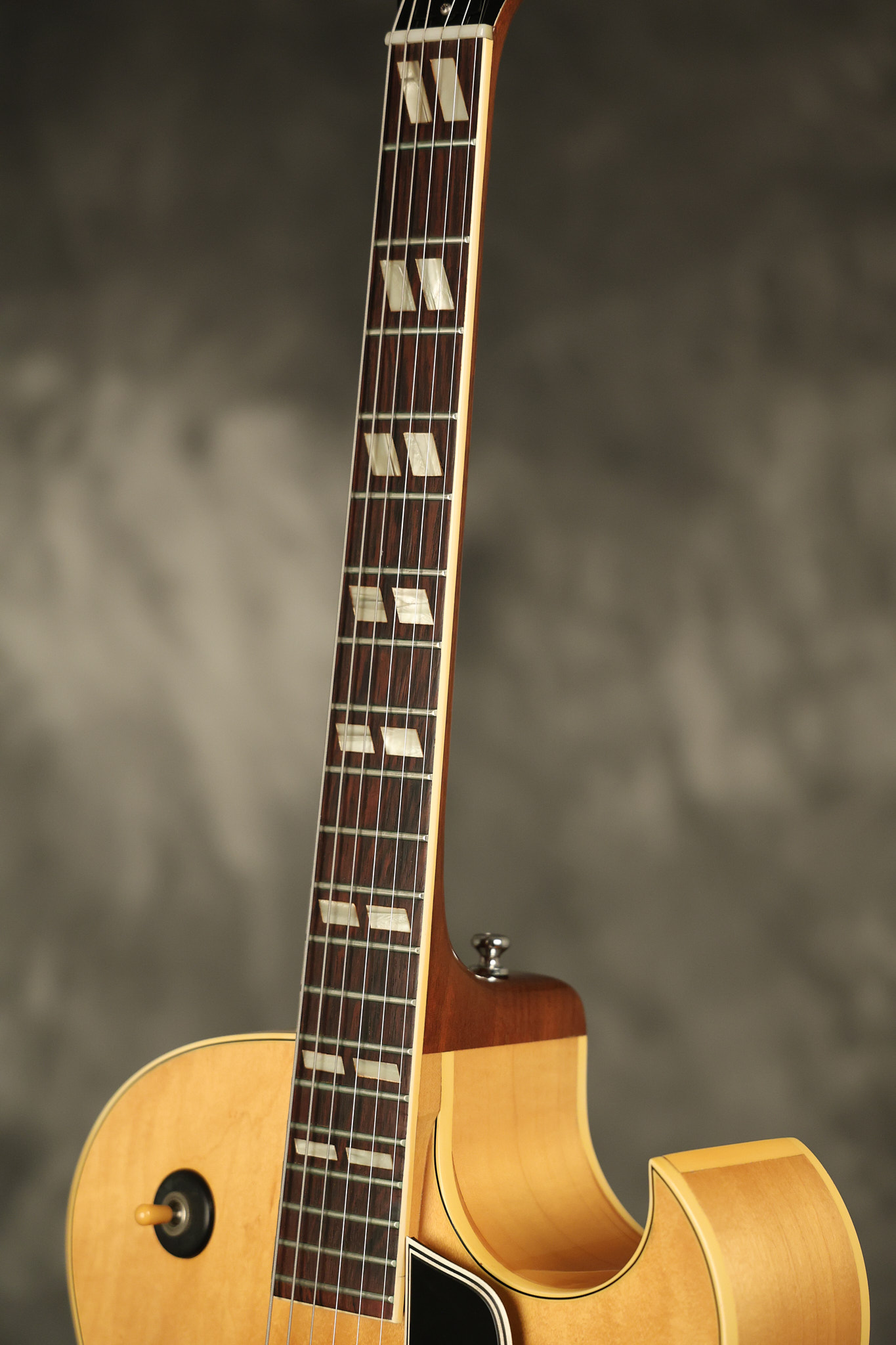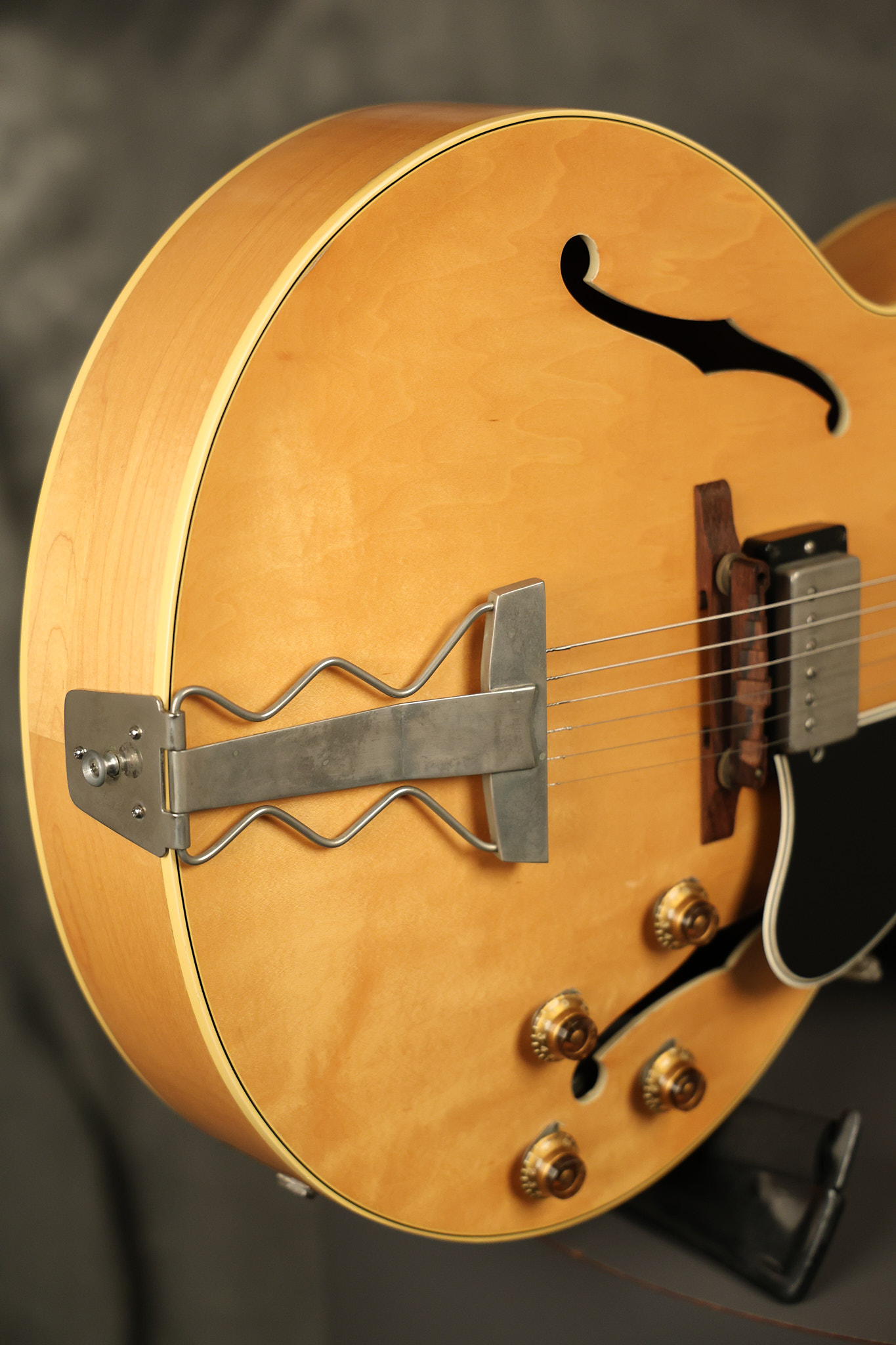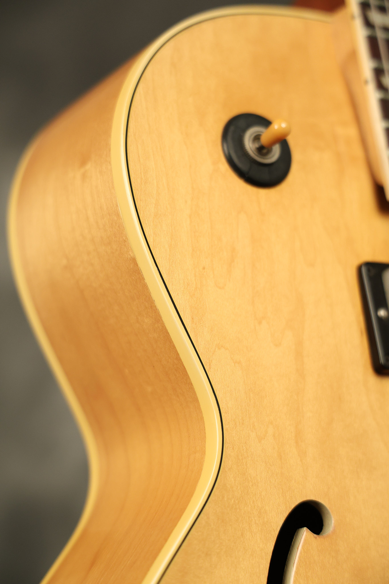 1959 Gibson ES-175 in its original Blonde/Natural finish. It has a great playing neck with great frets. It's all original with the exception of the added upper strap button and newer reproduction tuning buttons. It's also 100% complete along with its original hardshell case. It's in very good condition with some very minor nicks + dings and other minor cosmetic wear. There is some finish cracking along the seams of the top edge binding on the bass side lower bout of the body. The short finish cracks appear to be from binding shrinkage. There is also some slight binding shrinkage on the top edge of the cutaway on the body. The guitar itself remains structurally sound with no cracks, breaks or repairs. All electronics work and sound great.