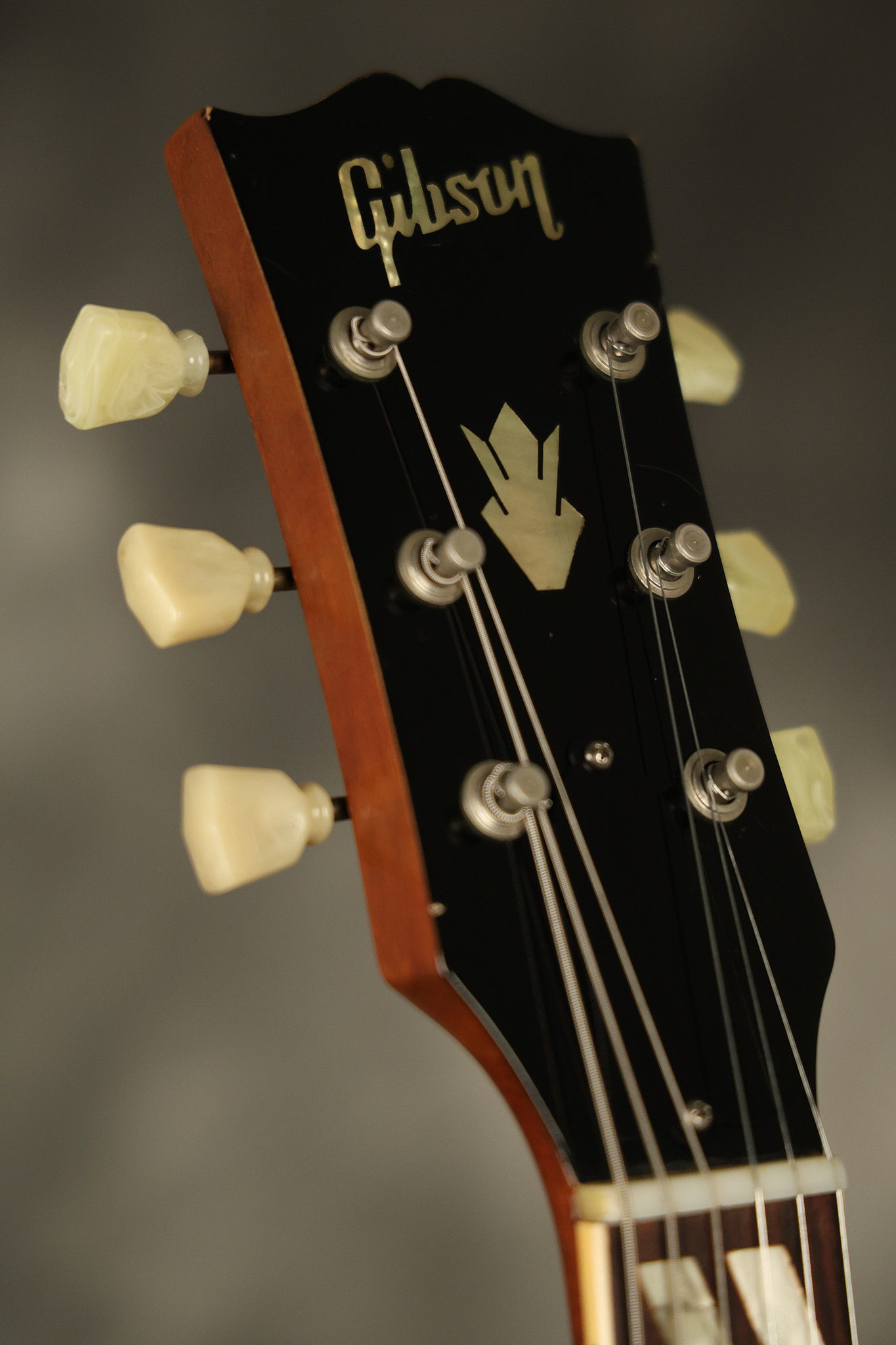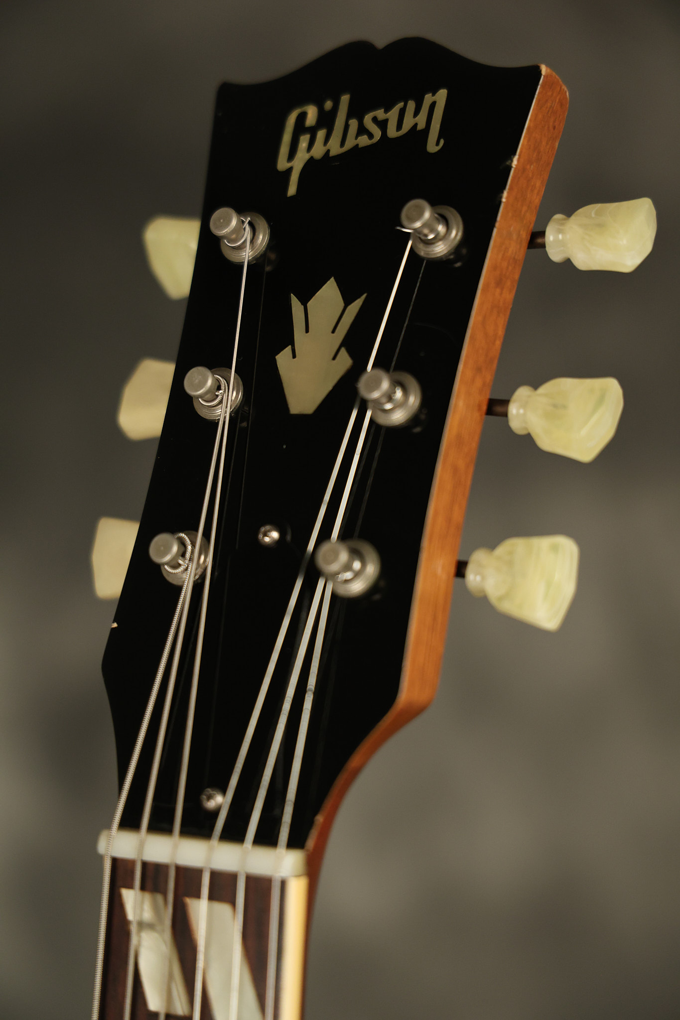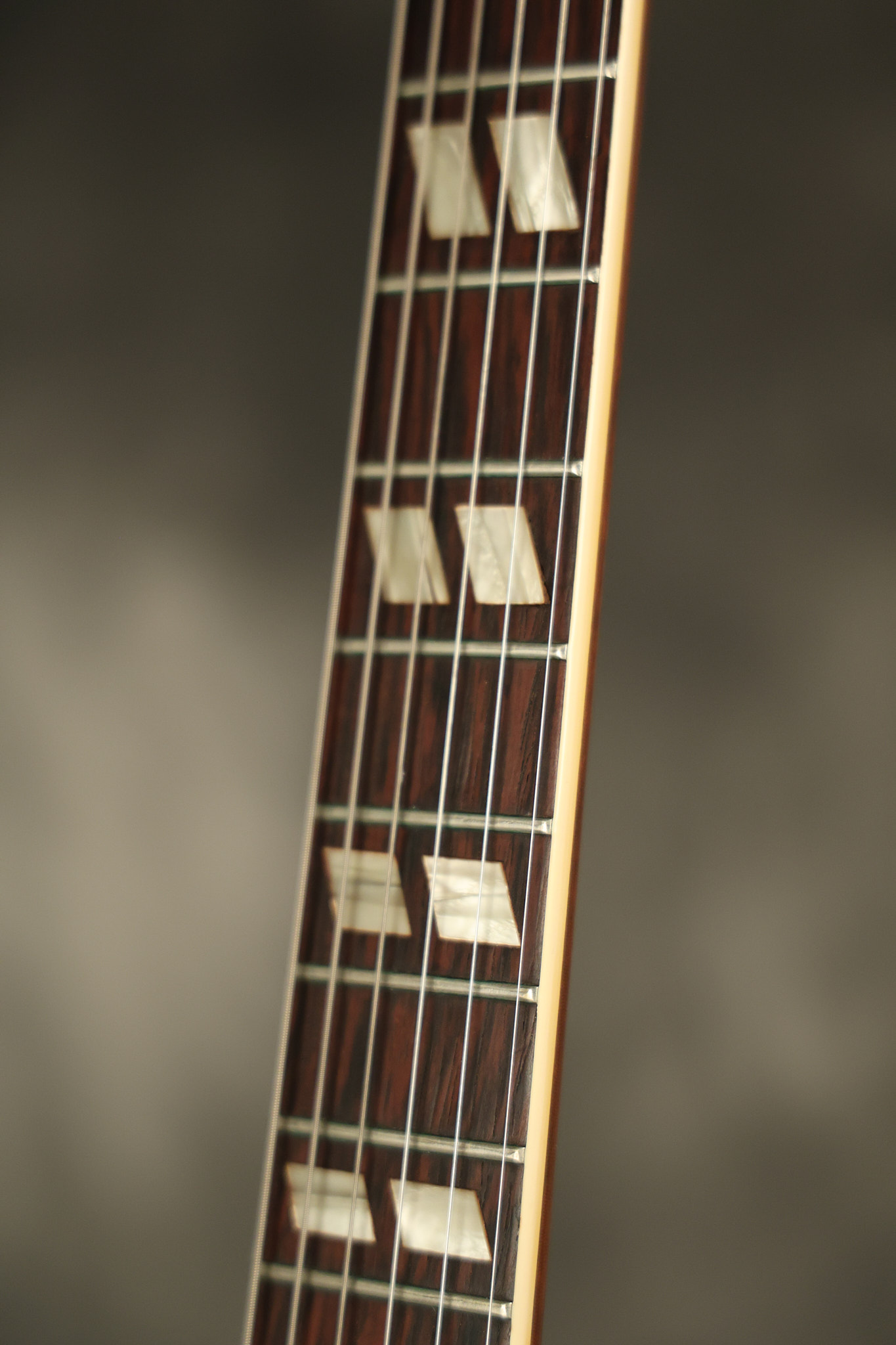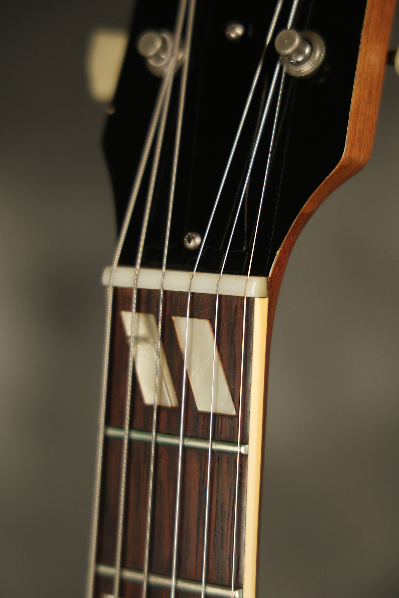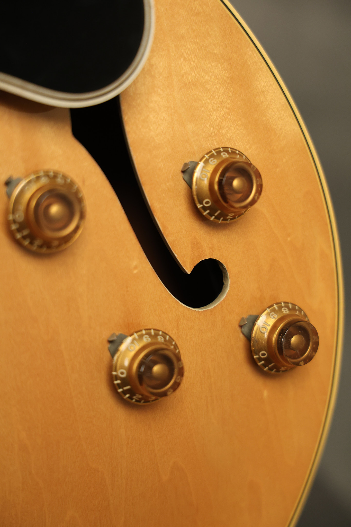 1959 Gibson ES-175 in its original Blonde/Natural finish. It has a great playing neck with great frets. It's all original with the exception of the added upper strap button and newer reproduction tuning buttons. It's also 100% complete along with its original hardshell case. It's in very good condition with some very minor nicks + dings and other minor cosmetic wear. There is some finish cracking along the seams of the top edge binding on the bass side lower bout of the body. The short finish cracks appear to be from binding shrinkage. There is also some slight binding shrinkage on the top edge of the cutaway on the body. The guitar itself remains structurally sound with no cracks, breaks or repairs. All electronics work and sound great.