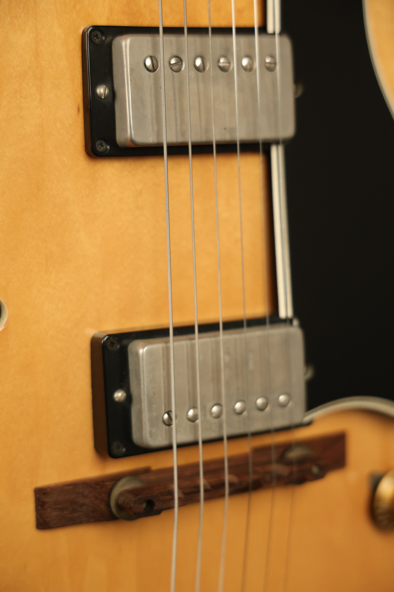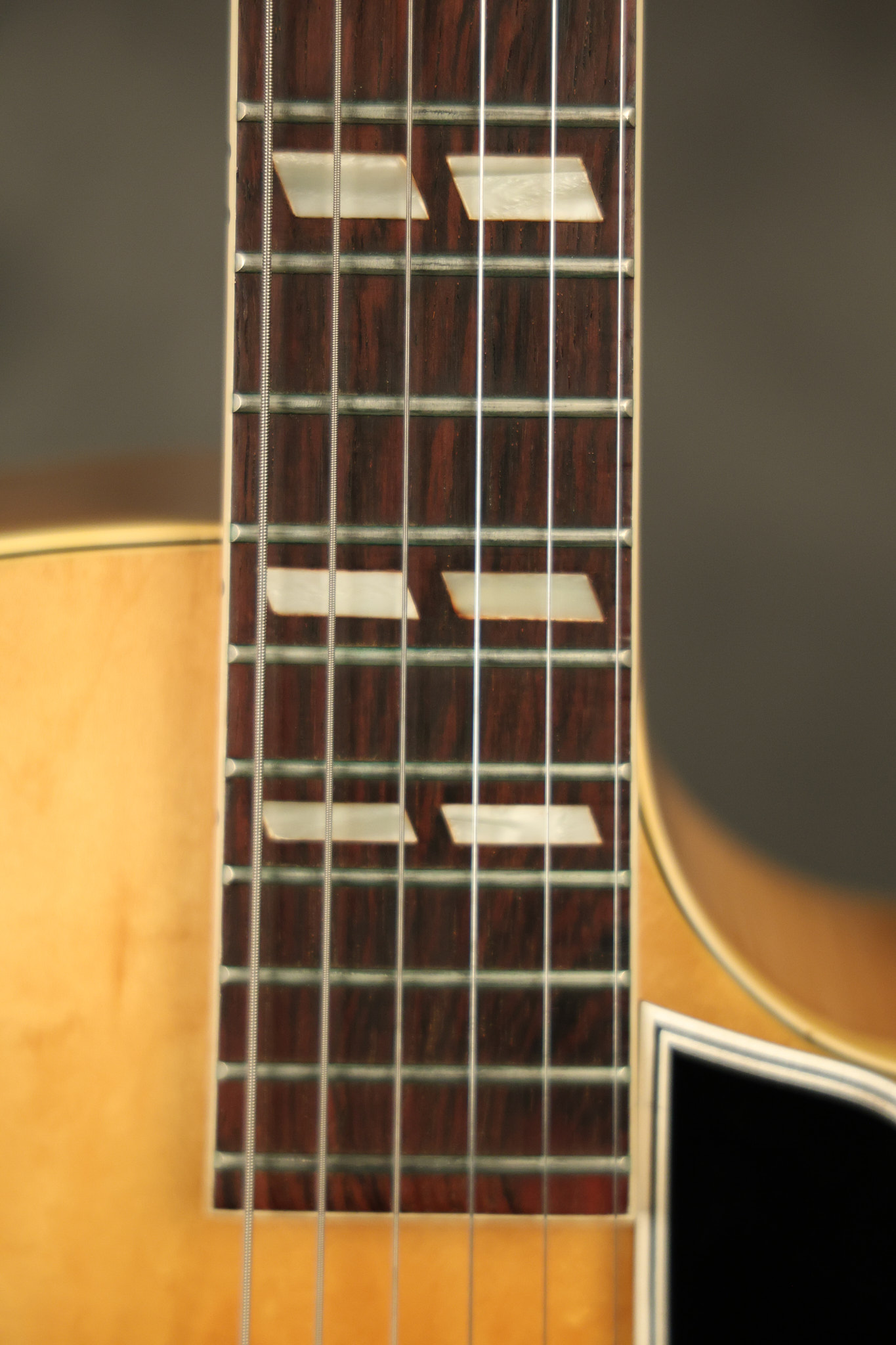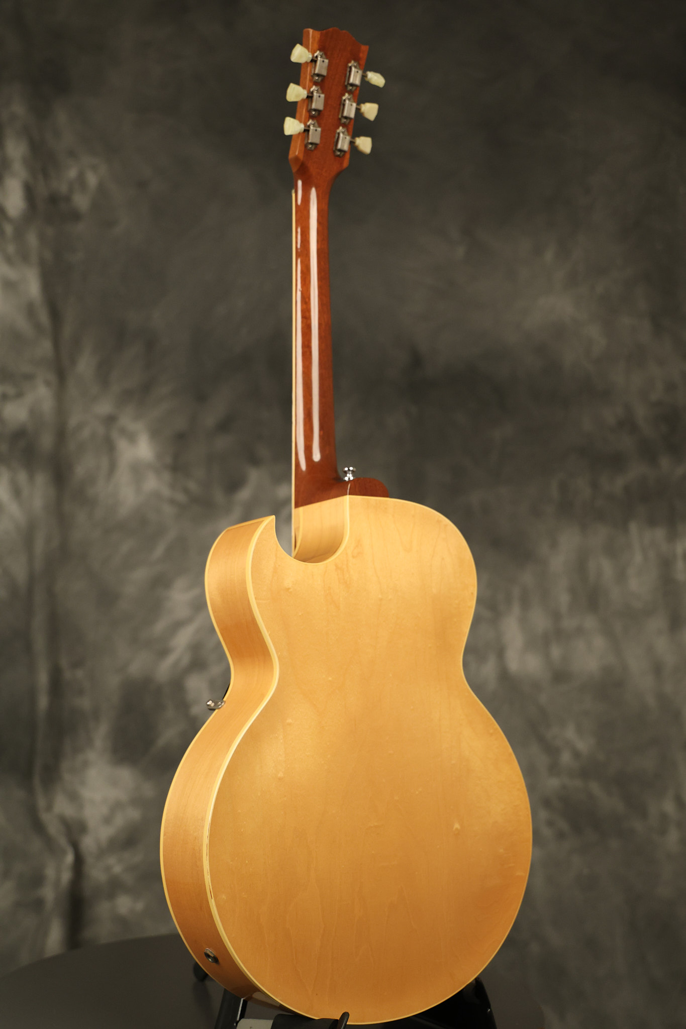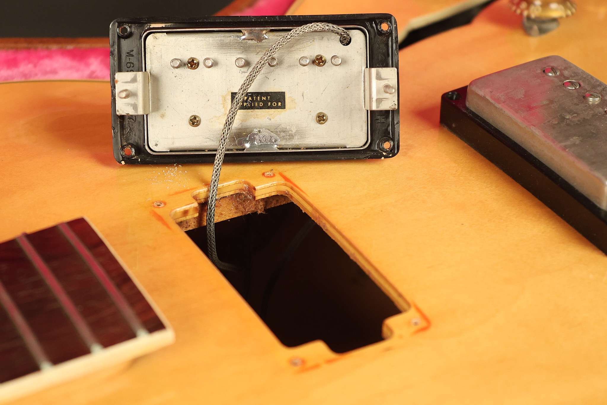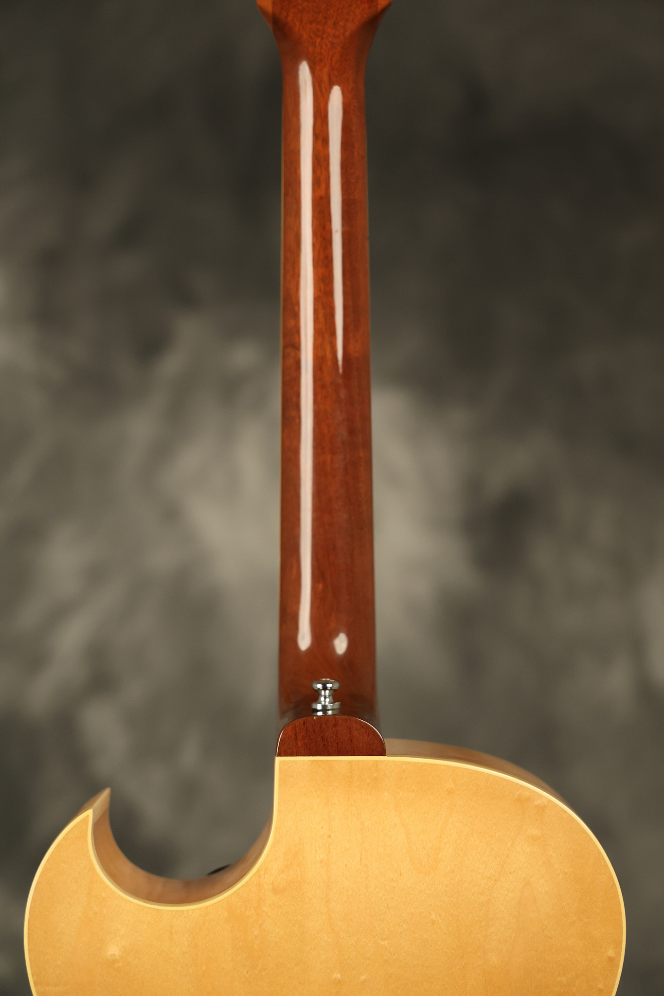 1959 Gibson ES-175 in its original Blonde/Natural finish. It has a great playing neck with great frets. It's all original with the exception of the added upper strap button and newer reproduction tuning buttons. It's also 100% complete along with its original hardshell case. It's in very good condition with some very minor nicks + dings and other minor cosmetic wear. There is some finish cracking along the seams of the top edge binding on the bass side lower bout of the body. The short finish cracks appear to be from binding shrinkage. There is also some slight binding shrinkage on the top edge of the cutaway on the body. The guitar itself remains structurally sound with no cracks, breaks or repairs. All electronics work and sound great.