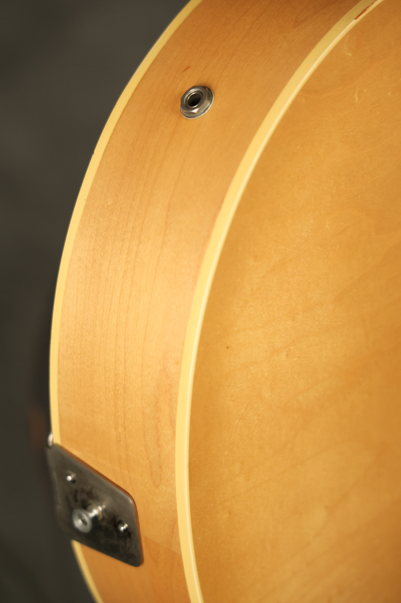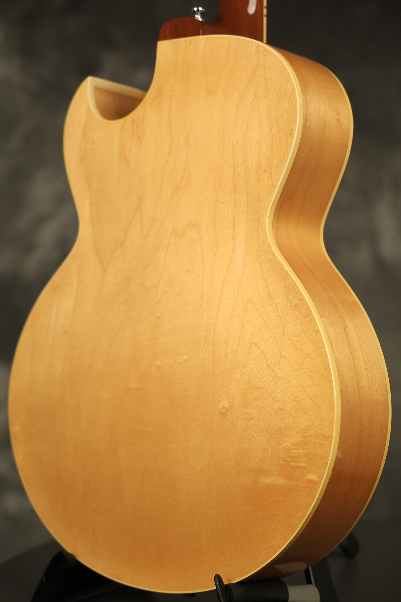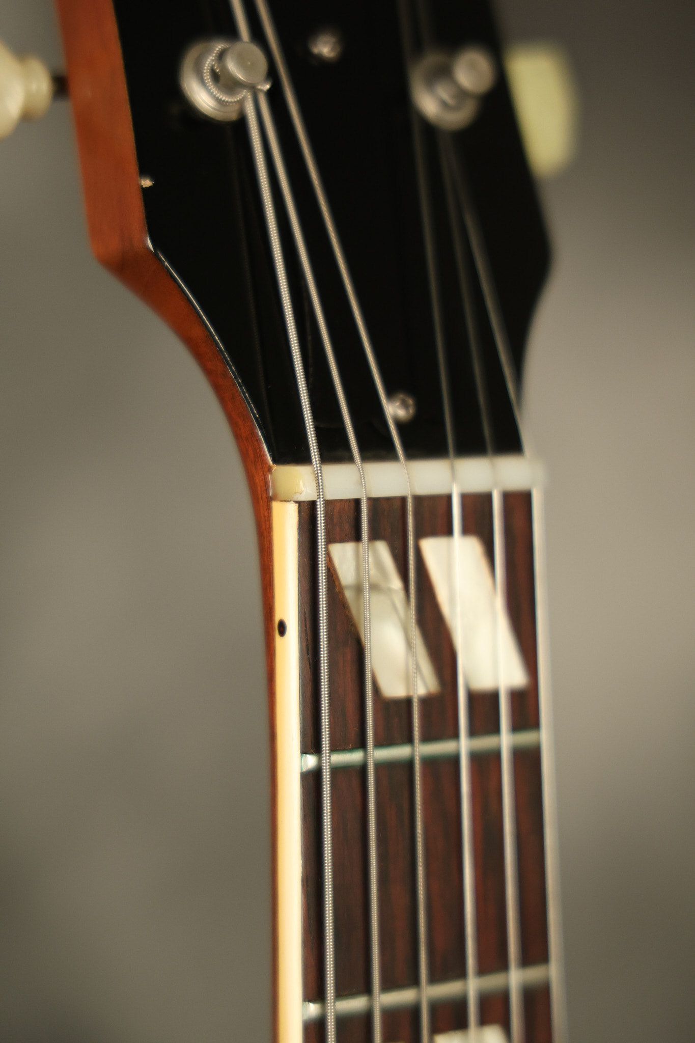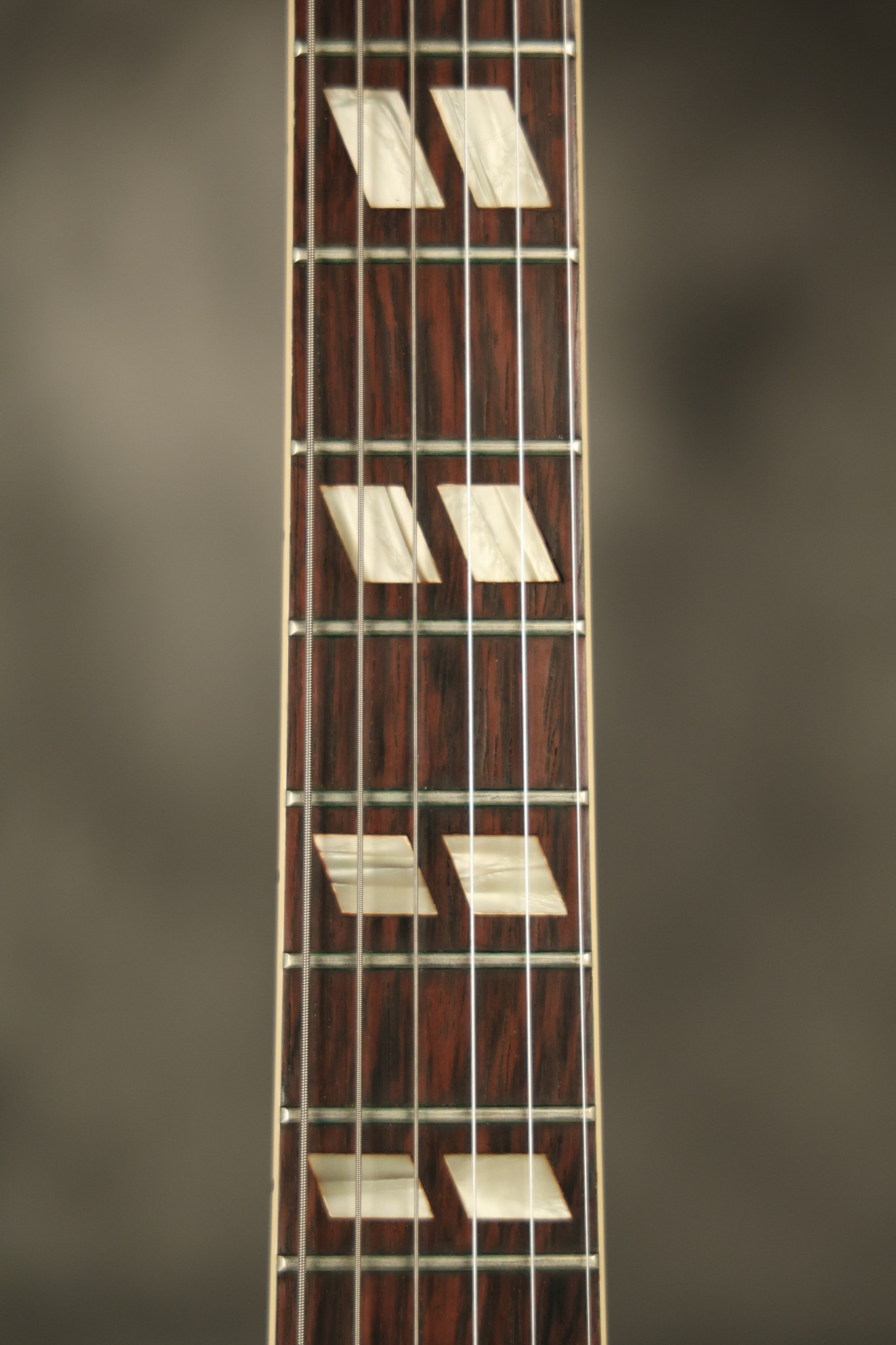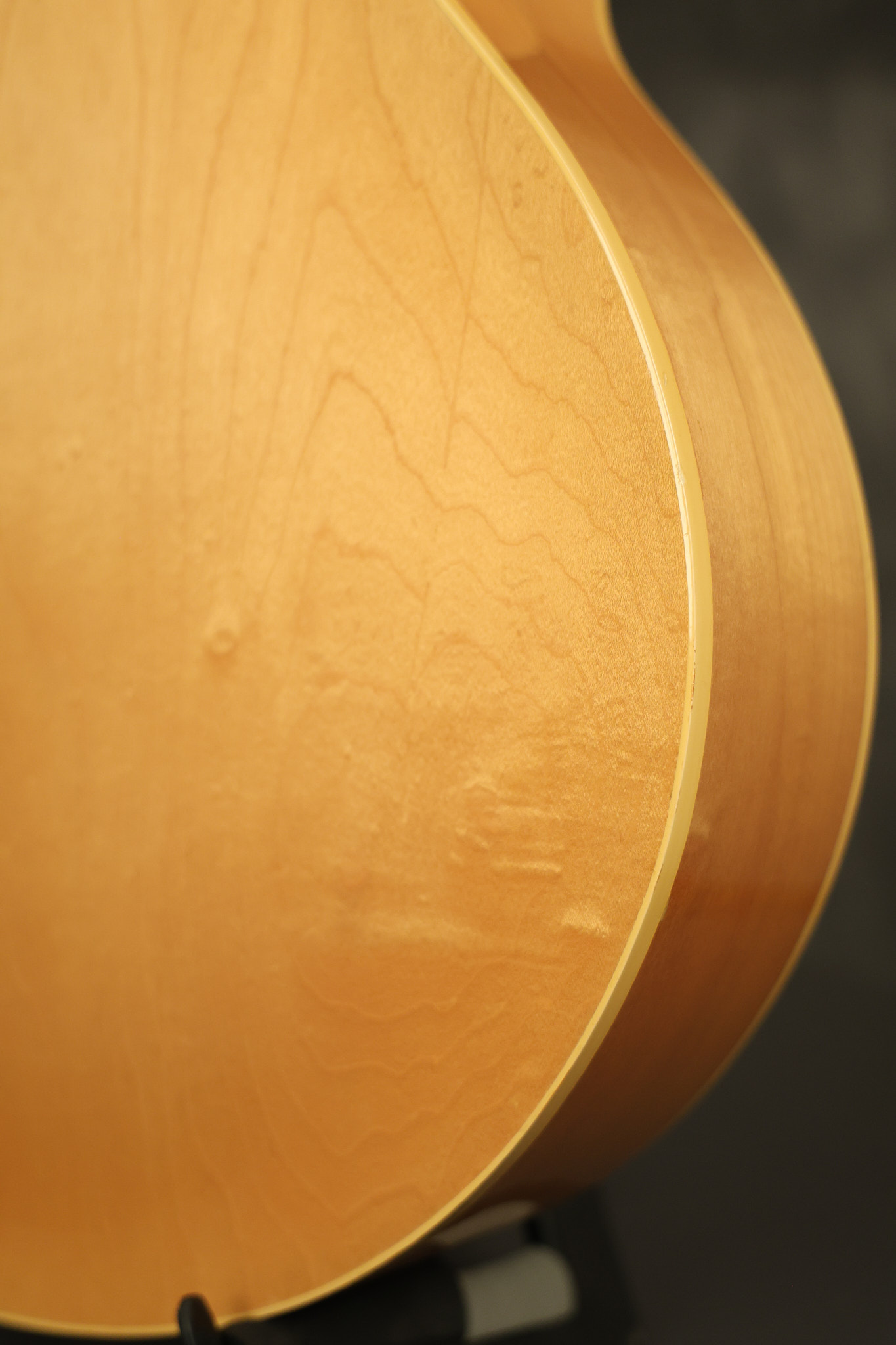 1959 Gibson ES-175 in its original Blonde/Natural finish. It has a great playing neck with great frets. It's all original with the exception of the added upper strap button and newer reproduction tuning buttons. It's also 100% complete along with its original hardshell case. It's in very good condition with some very minor nicks + dings and other minor cosmetic wear. There is some finish cracking along the seams of the top edge binding on the bass side lower bout of the body. The short finish cracks appear to be from binding shrinkage. There is also some slight binding shrinkage on the top edge of the cutaway on the body. The guitar itself remains structurally sound with no cracks, breaks or repairs. All electronics work and sound great.