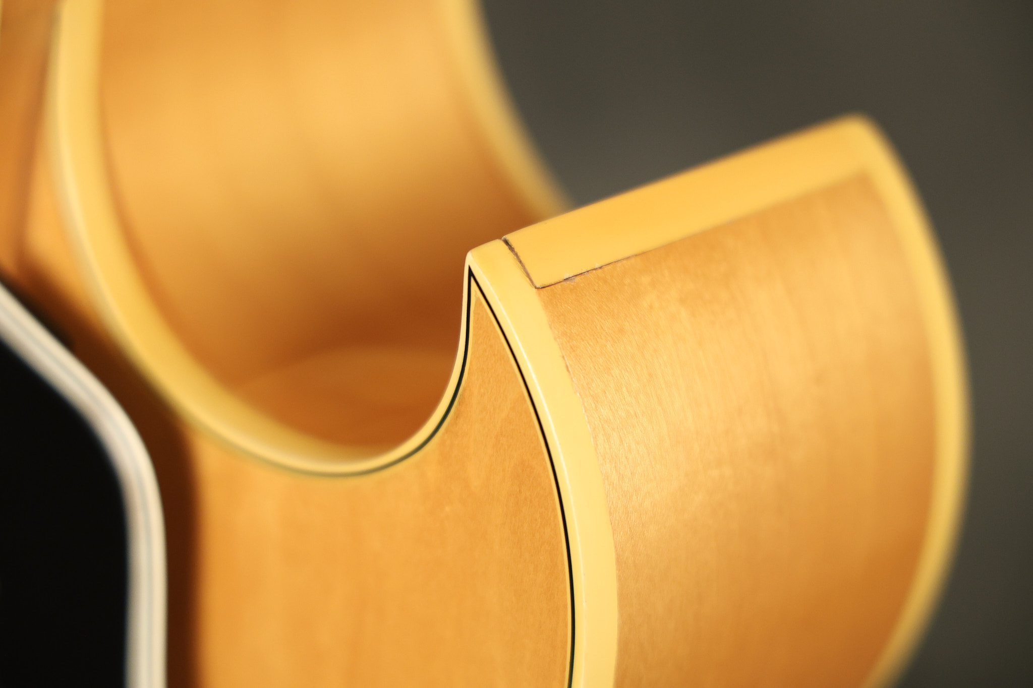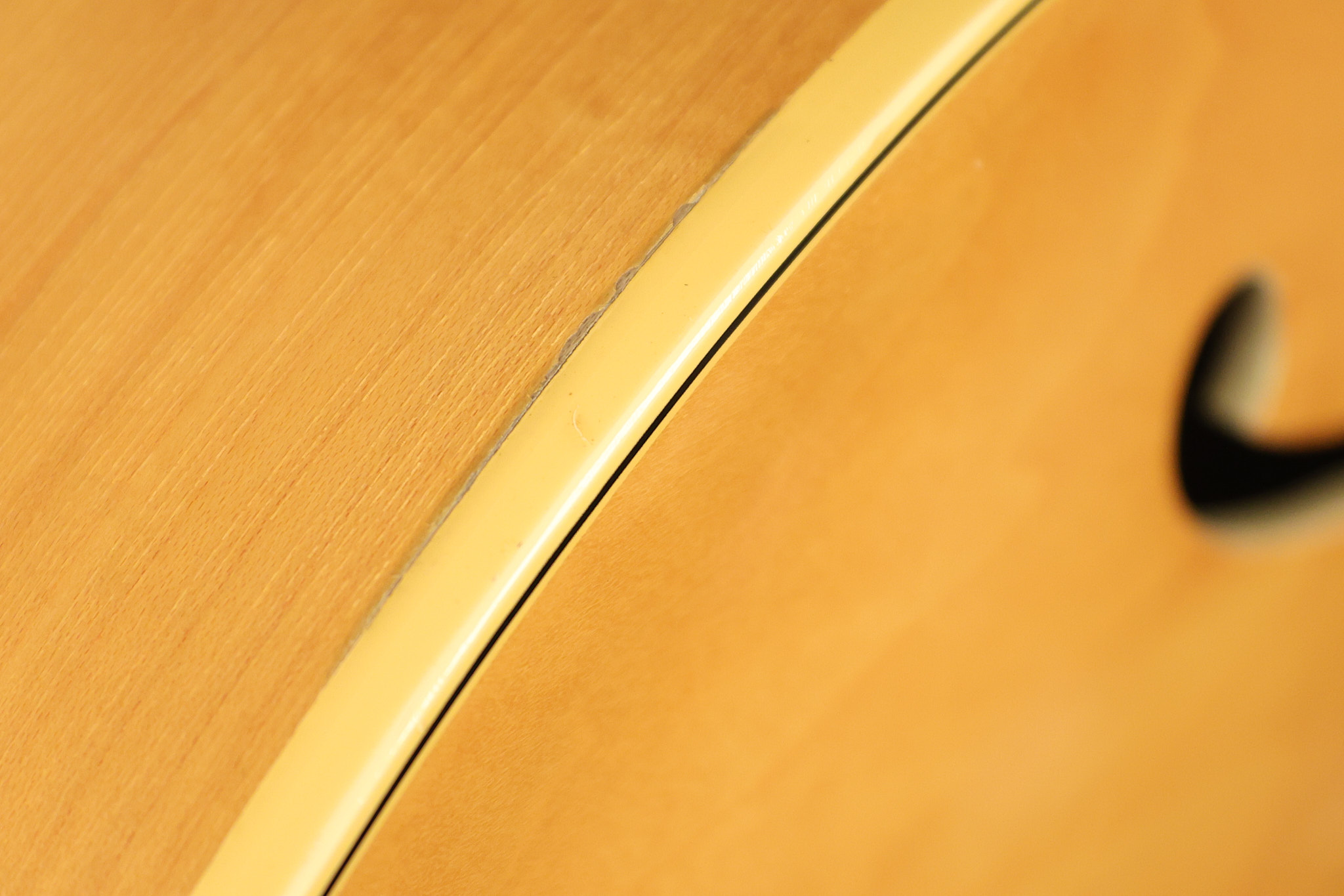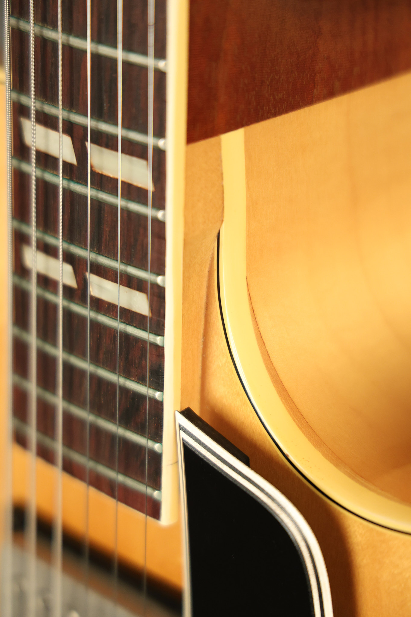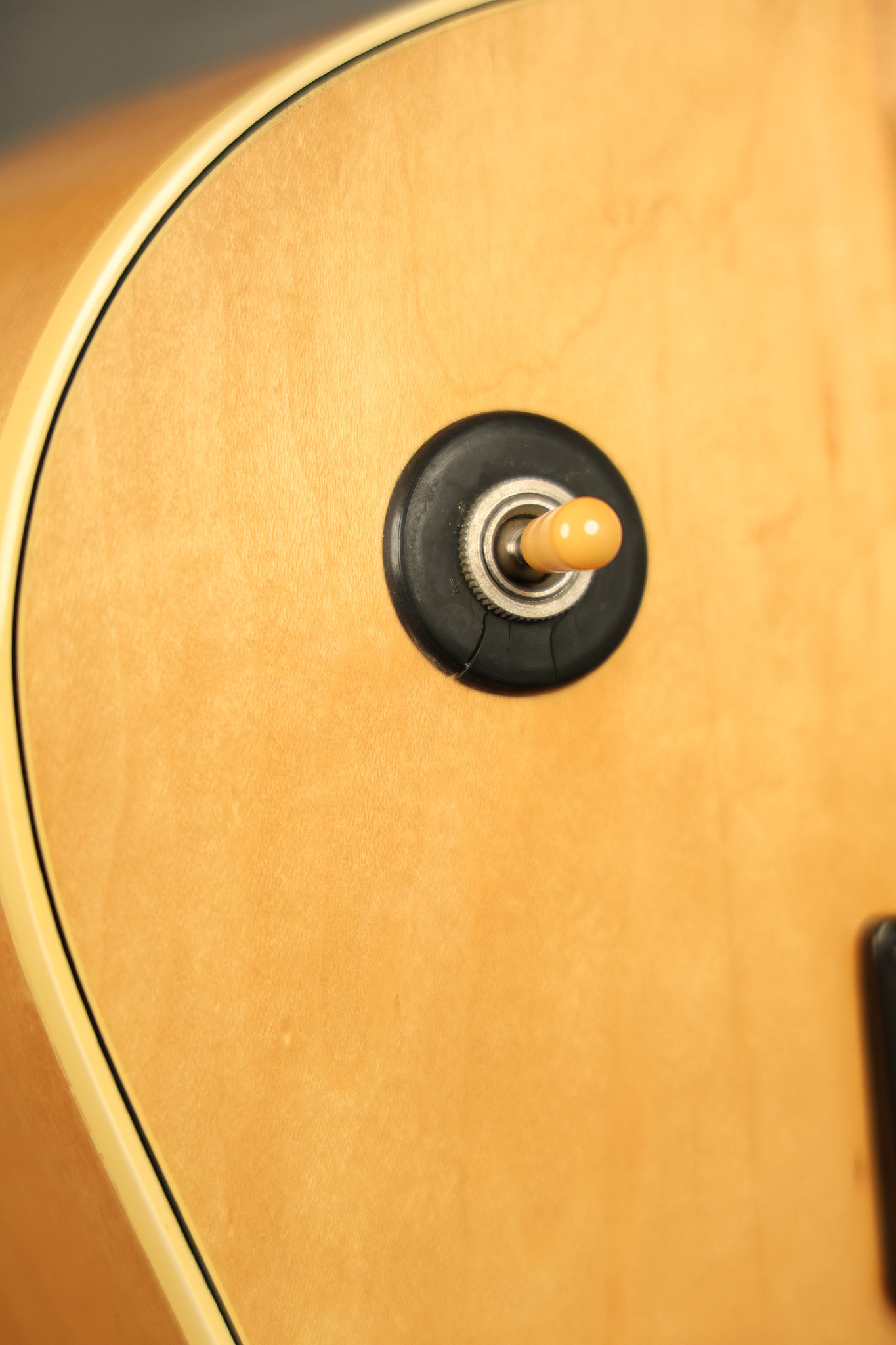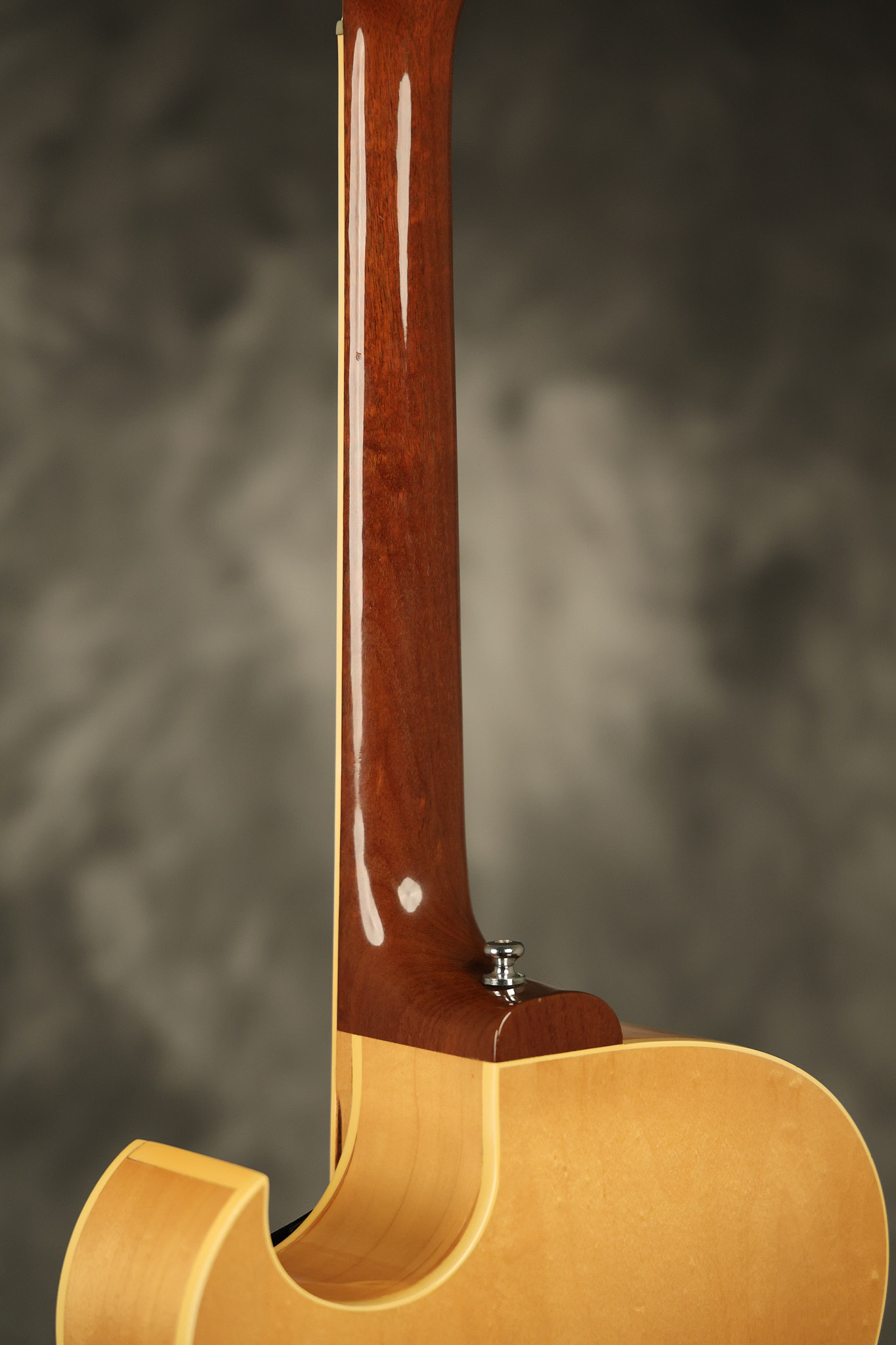 1959 Gibson ES-175 in its original Blonde/Natural finish. It has a great playing neck with great frets. It's all original with the exception of the added upper strap button and newer reproduction tuning buttons. It's also 100% complete along with its original hardshell case. It's in very good condition with some very minor nicks + dings and other minor cosmetic wear. There is some finish cracking along the seams of the top edge binding on the bass side lower bout of the body. The short finish cracks appear to be from binding shrinkage. There is also some slight binding shrinkage on the top edge of the cutaway on the body. The guitar itself remains structurally sound with no cracks, breaks or repairs. All electronics work and sound great.