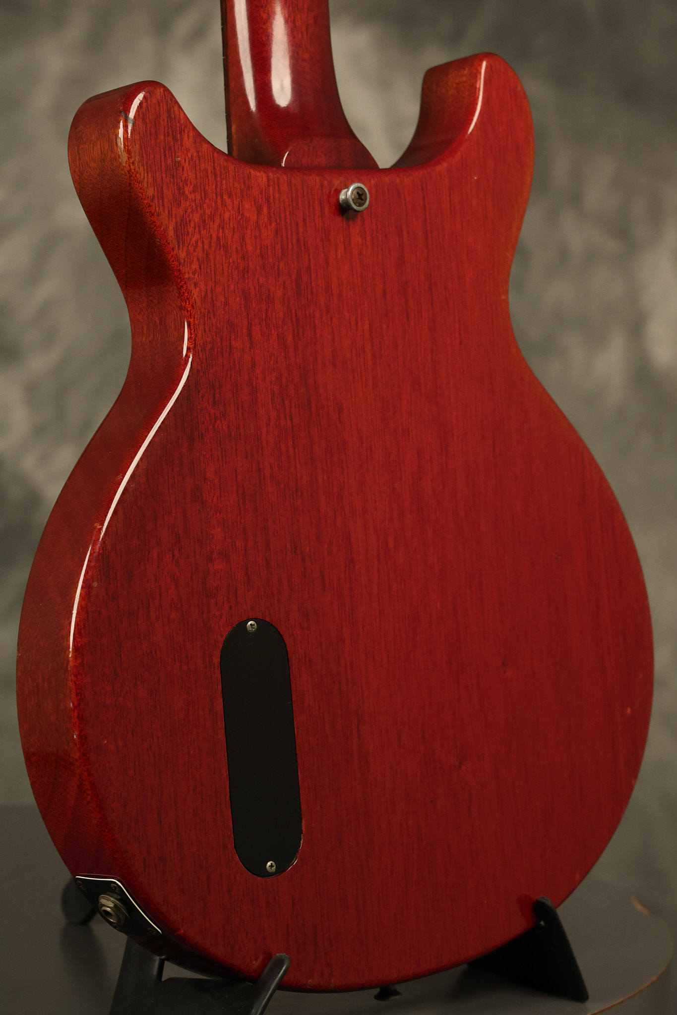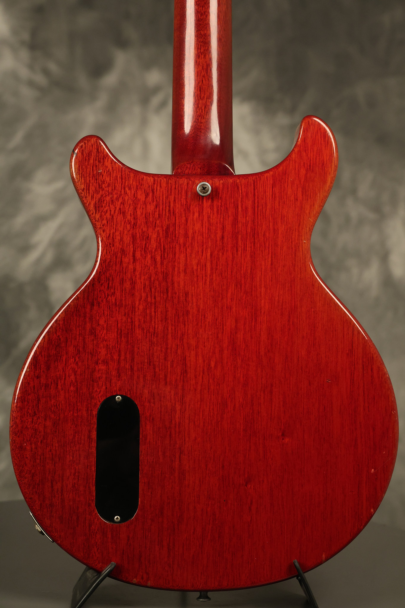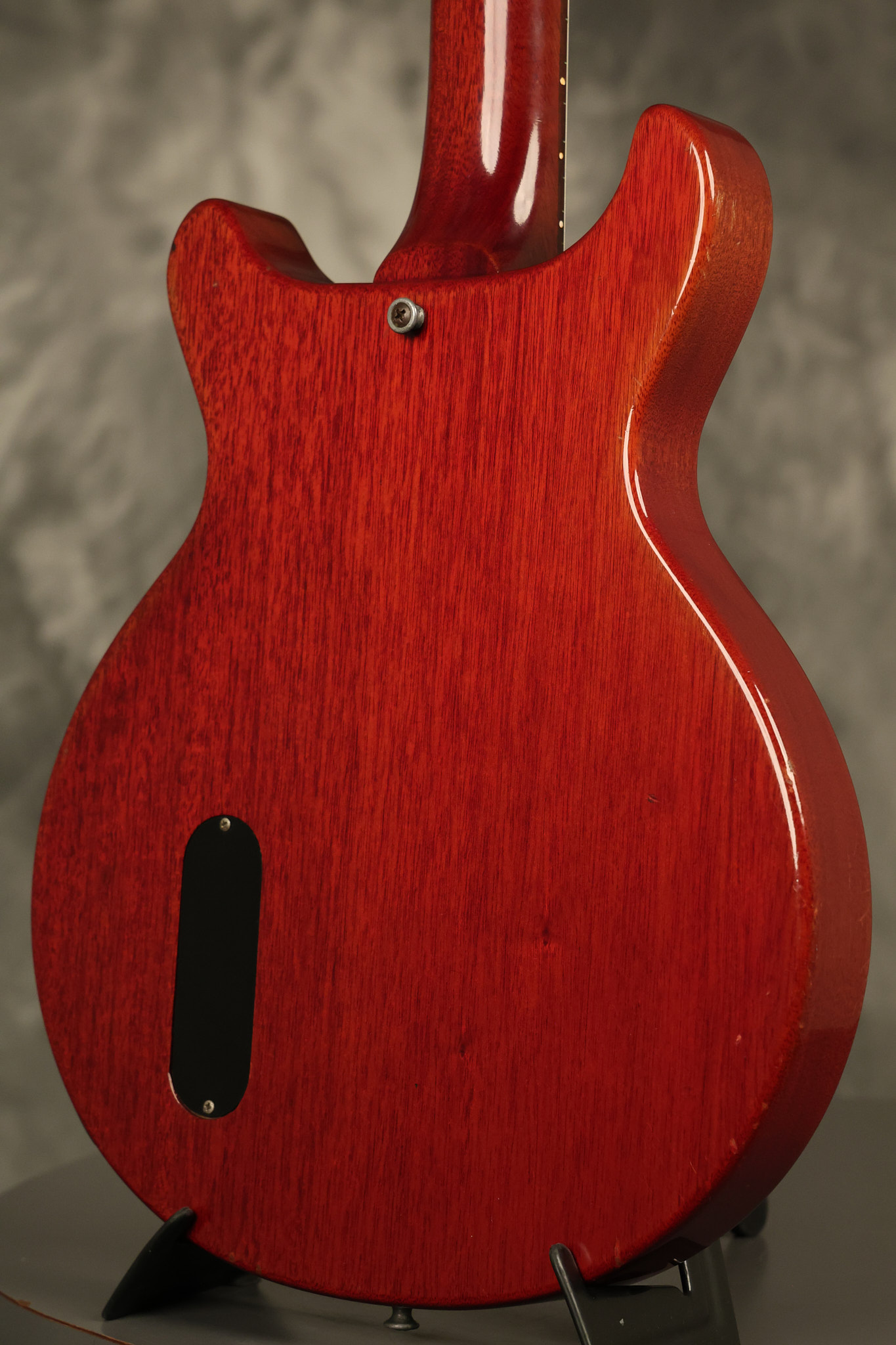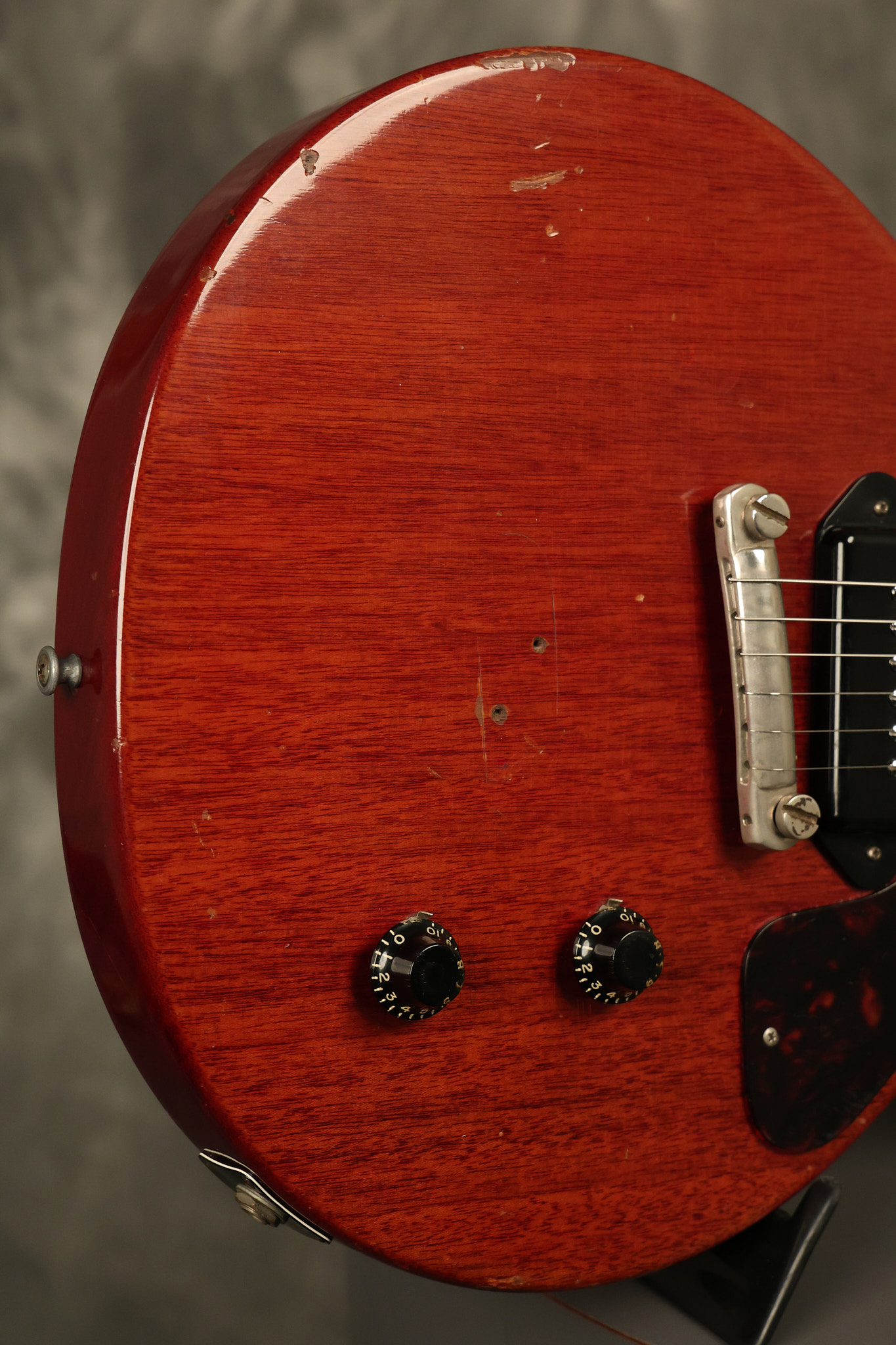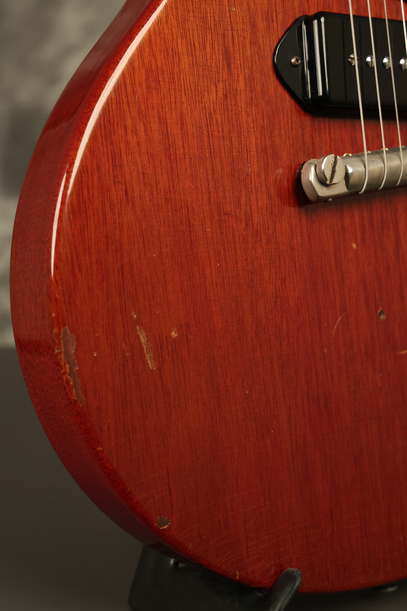 1959 Gibson double-cut Les Paul Junior in its original Cherry finish. It has a great playing neck with great frets. It's all original and includes a later Gibson hardshell case. There are some extra screw holes on the top of the body where something was secured at one time. There are nicks + dings, a small chip out of the top corner of the headstock, a small chip out of the top edge of the pickup cavity, minor finish checking and other cosmetic wear. The guitar itself remains structurally sound. All electronics work and sound great.