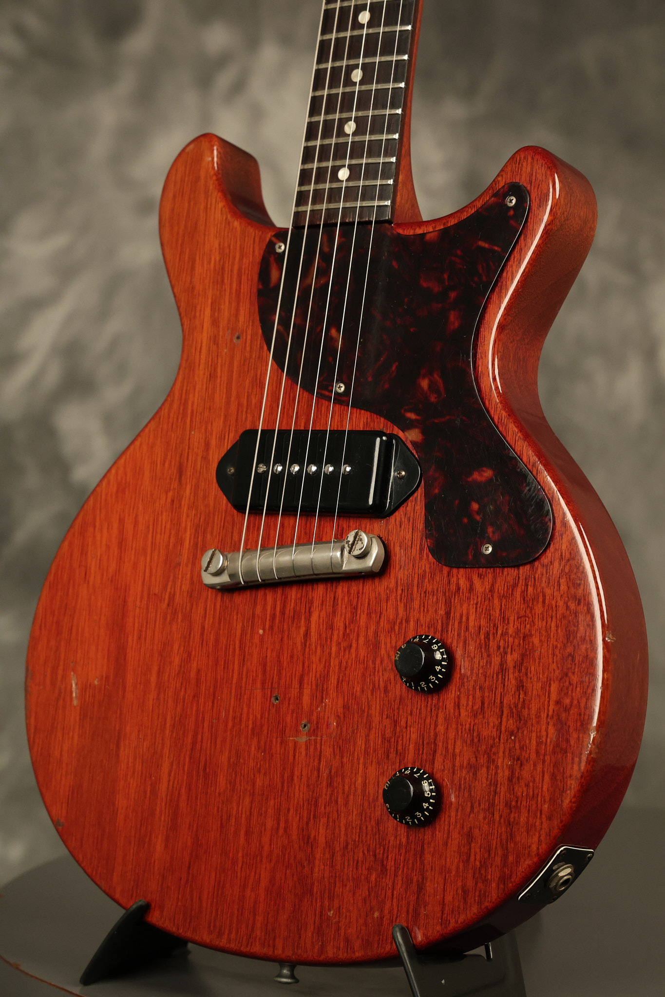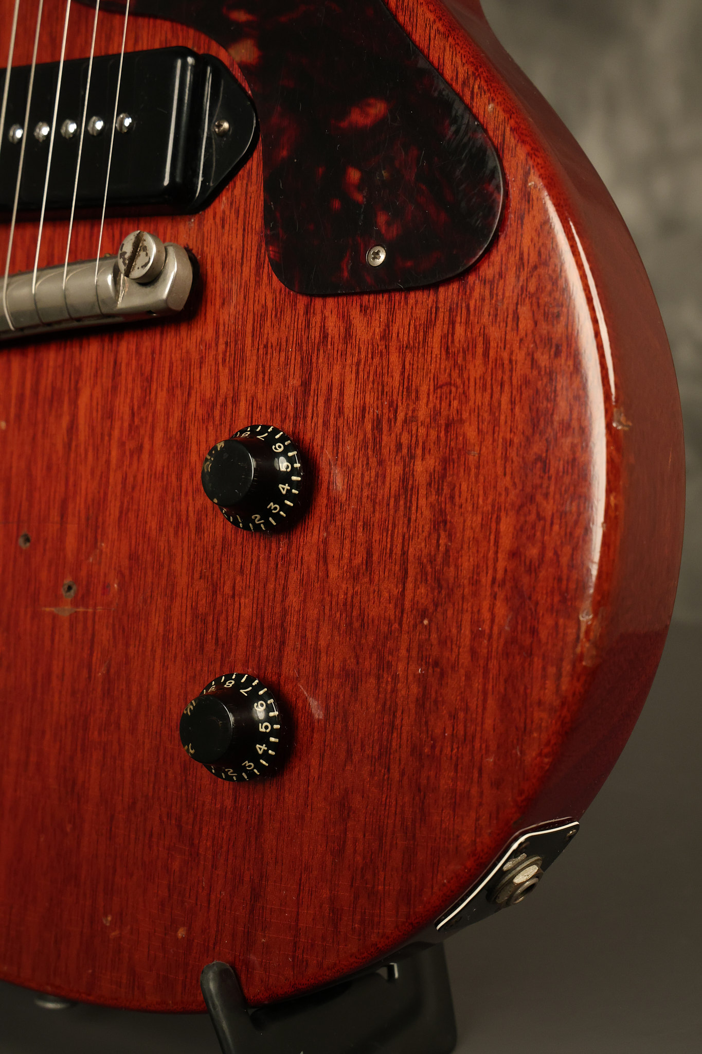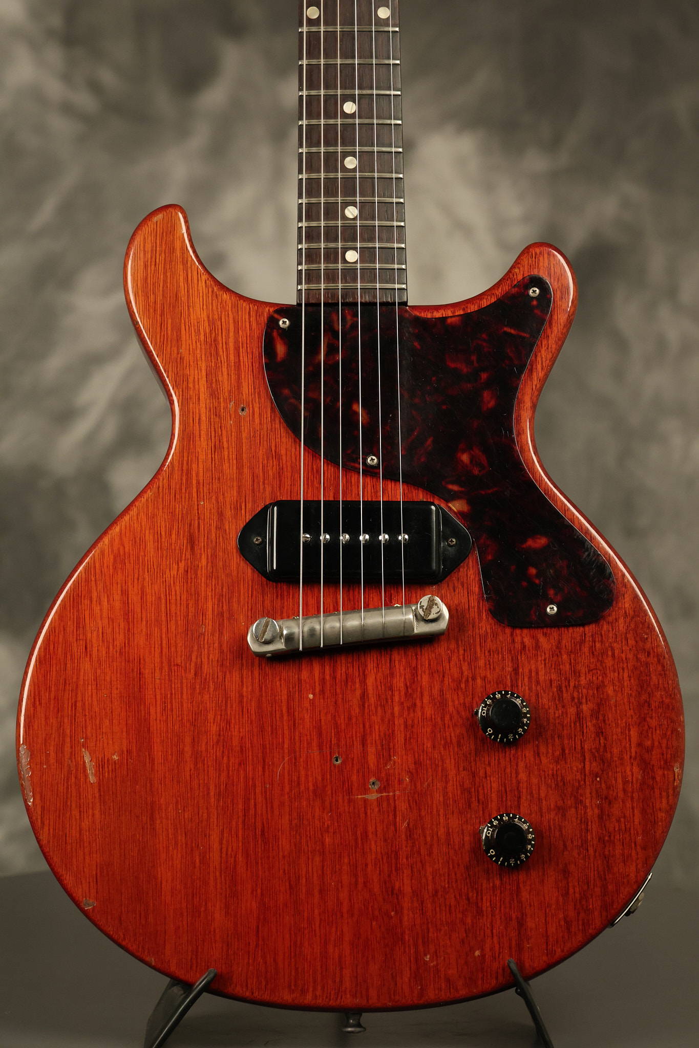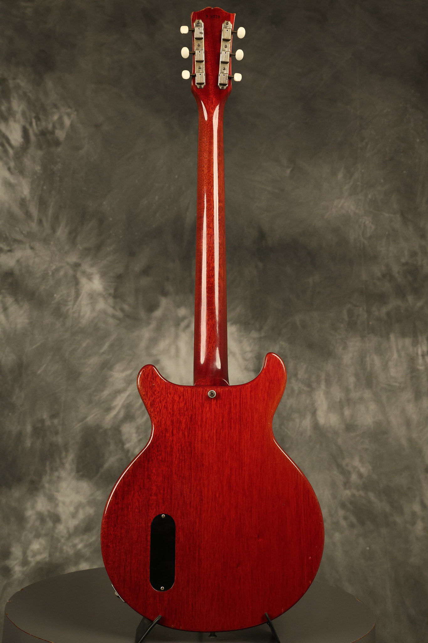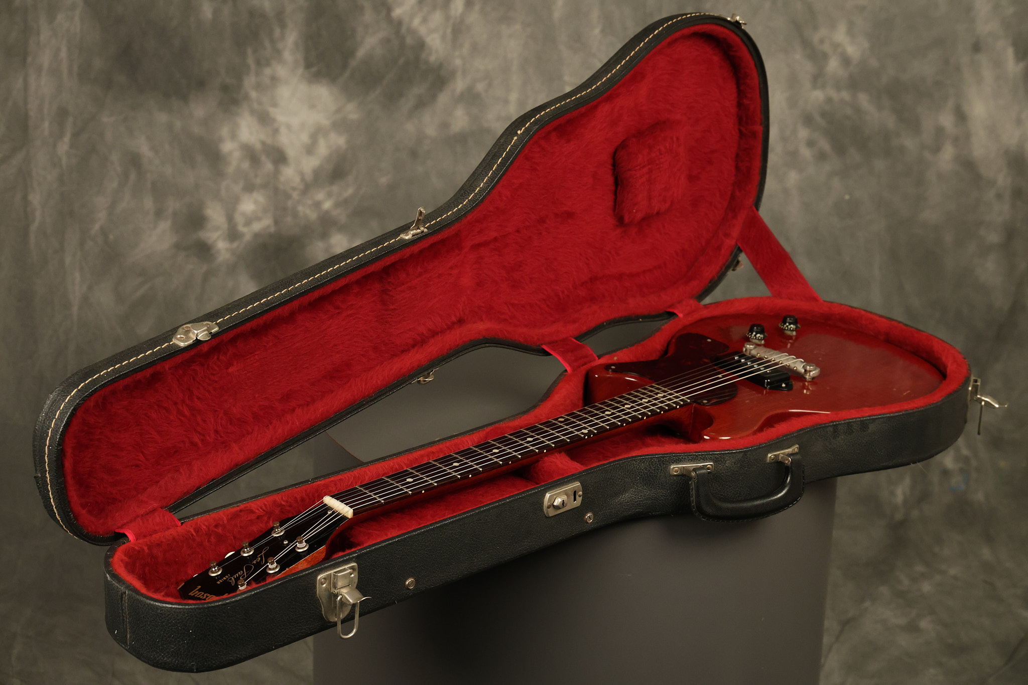 1959 Gibson double-cut Les Paul Junior in its original Cherry finish. It has a great playing neck with great frets. It's all original and includes a later Gibson hardshell case. There are some extra screw holes on the top of the body where something was secured at one time. There are nicks + dings, a small chip out of the top corner of the headstock, a small chip out of the top edge of the pickup cavity, minor finish checking and other cosmetic wear. The guitar itself remains structurally sound. All electronics work and sound great.